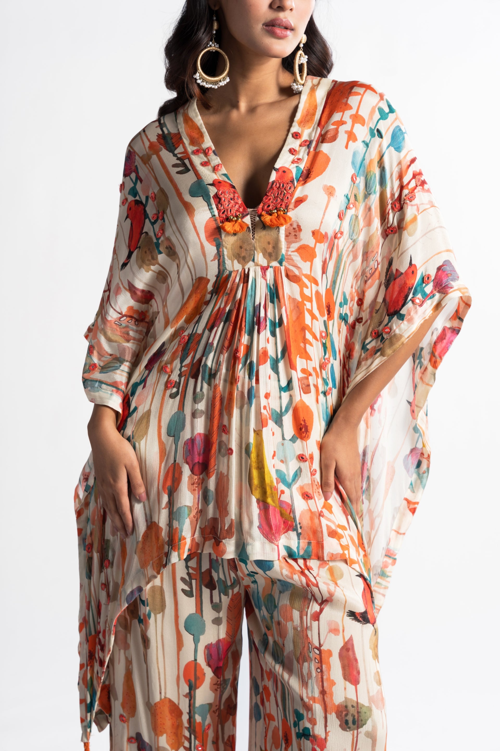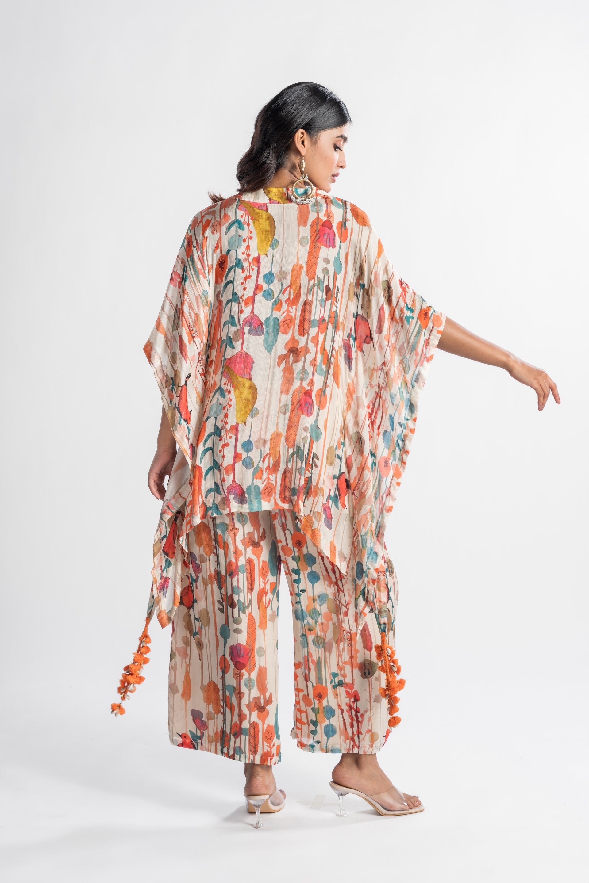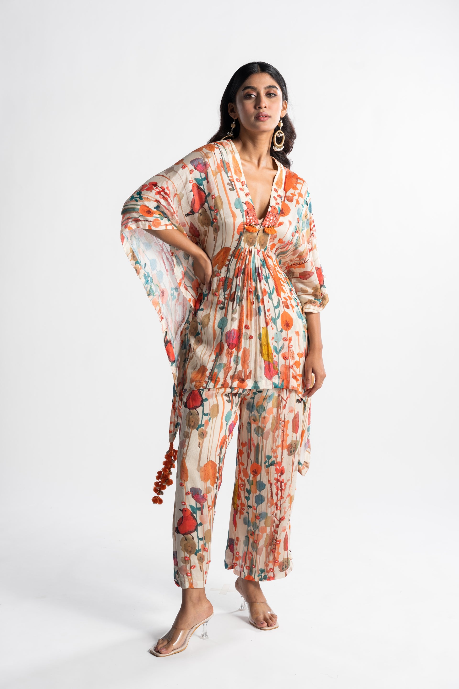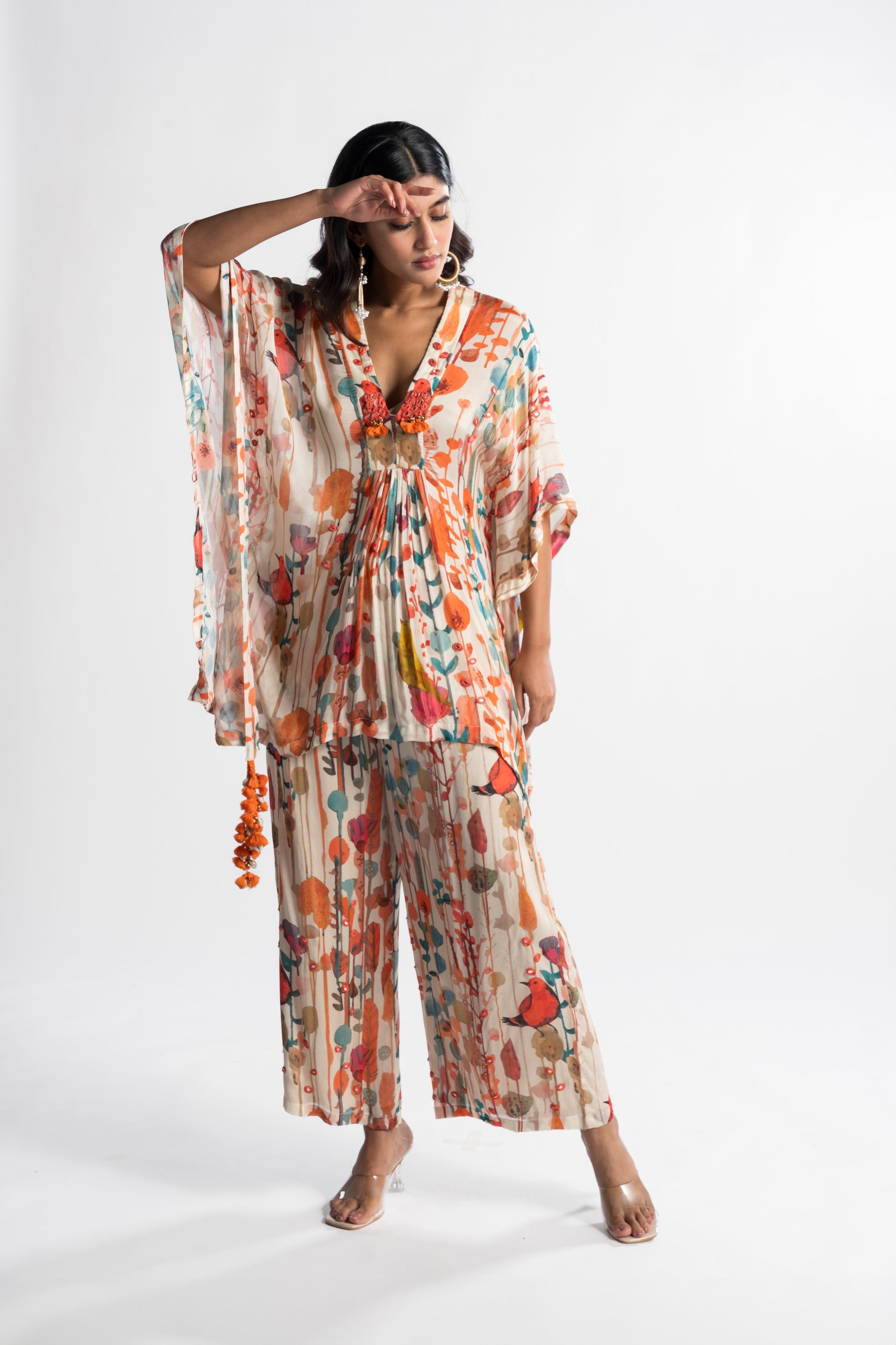 The Aldona Kaftan Set features a colorful floral printed chiffon kaftan top with playful tassels and tie details. Paired with wide-legged pants, this ensemble blends comfort with effortless style, perfect for laid-back, boho-inspired moments.
