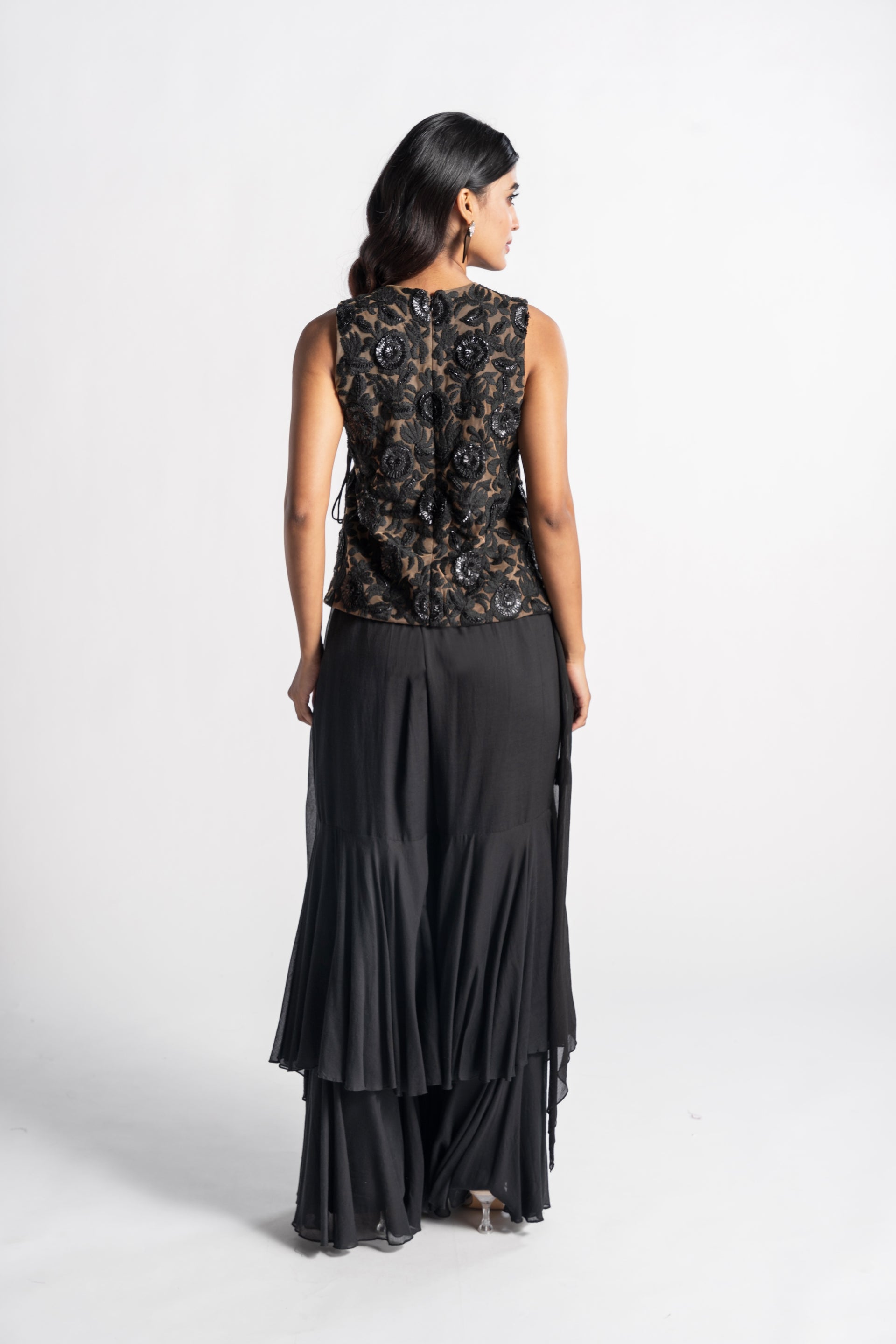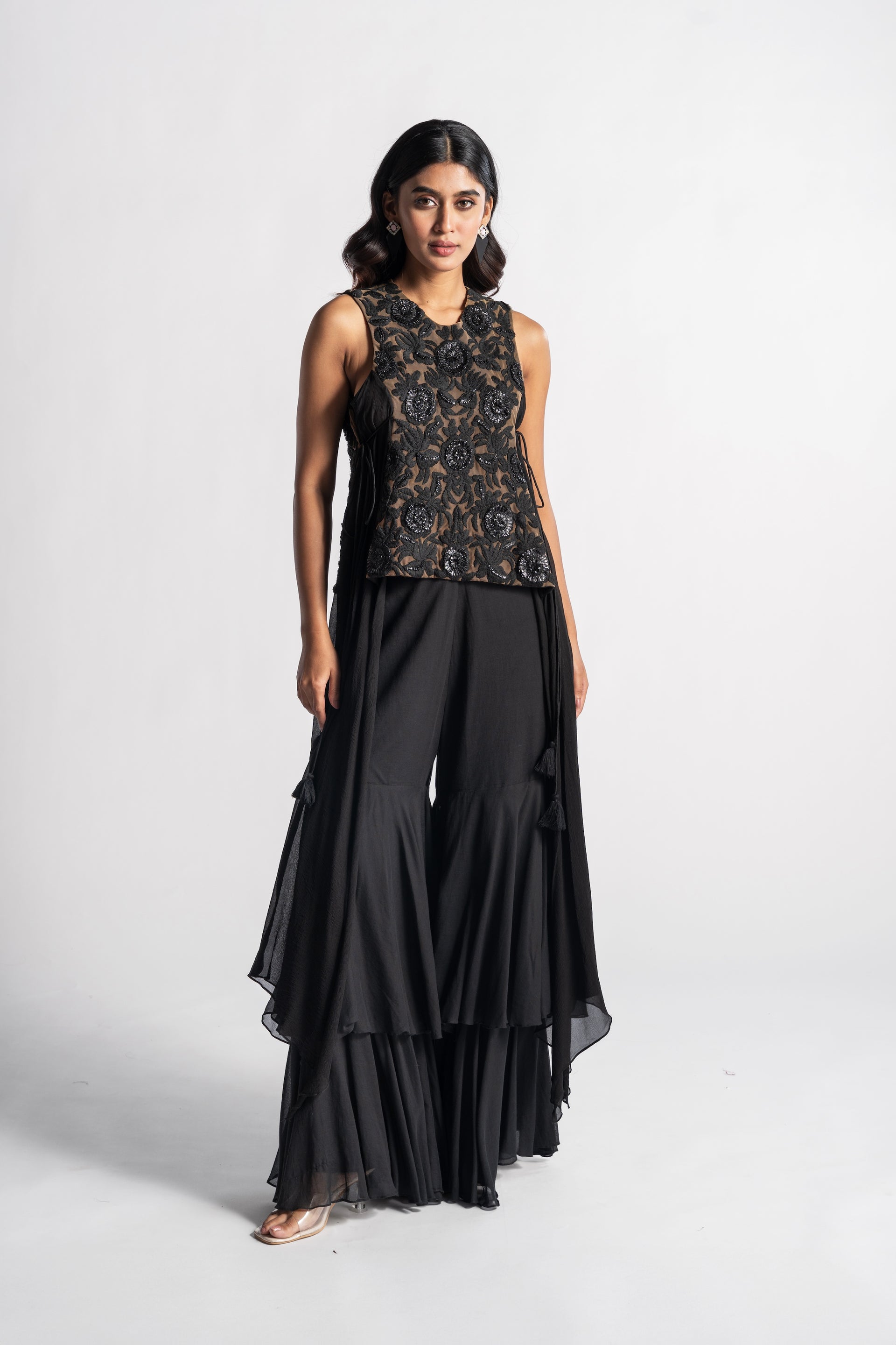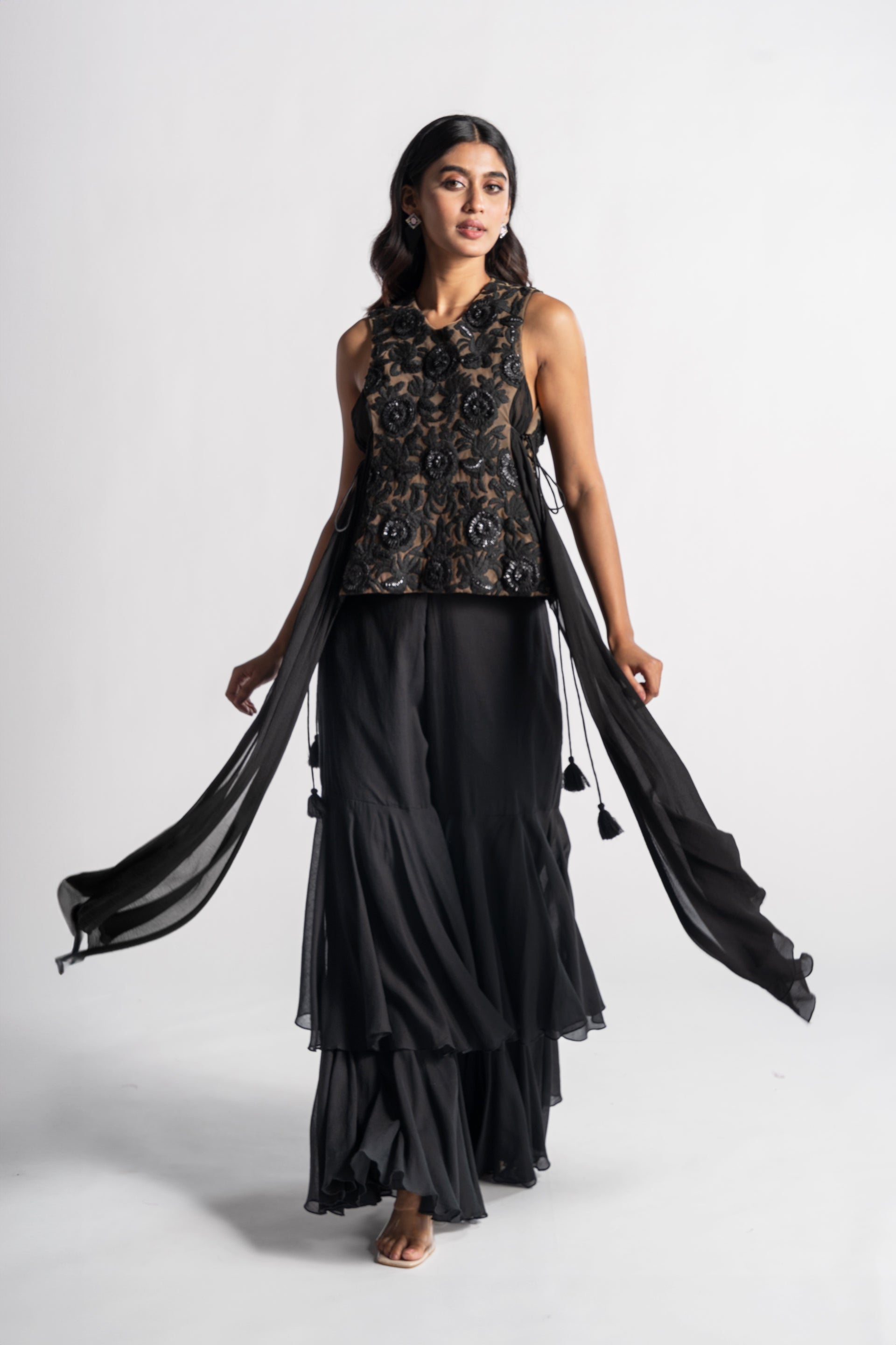 The Amaari Top with Layered Sharara features tone-on-tone floral detailing and playful tie-up tassels. Paired with a black layered sharara, this ensemble balances traditional charm with modern chic.