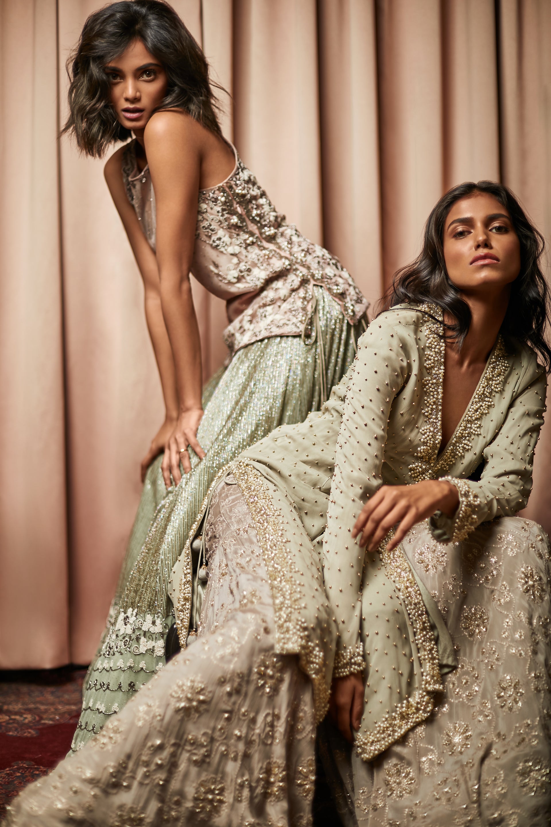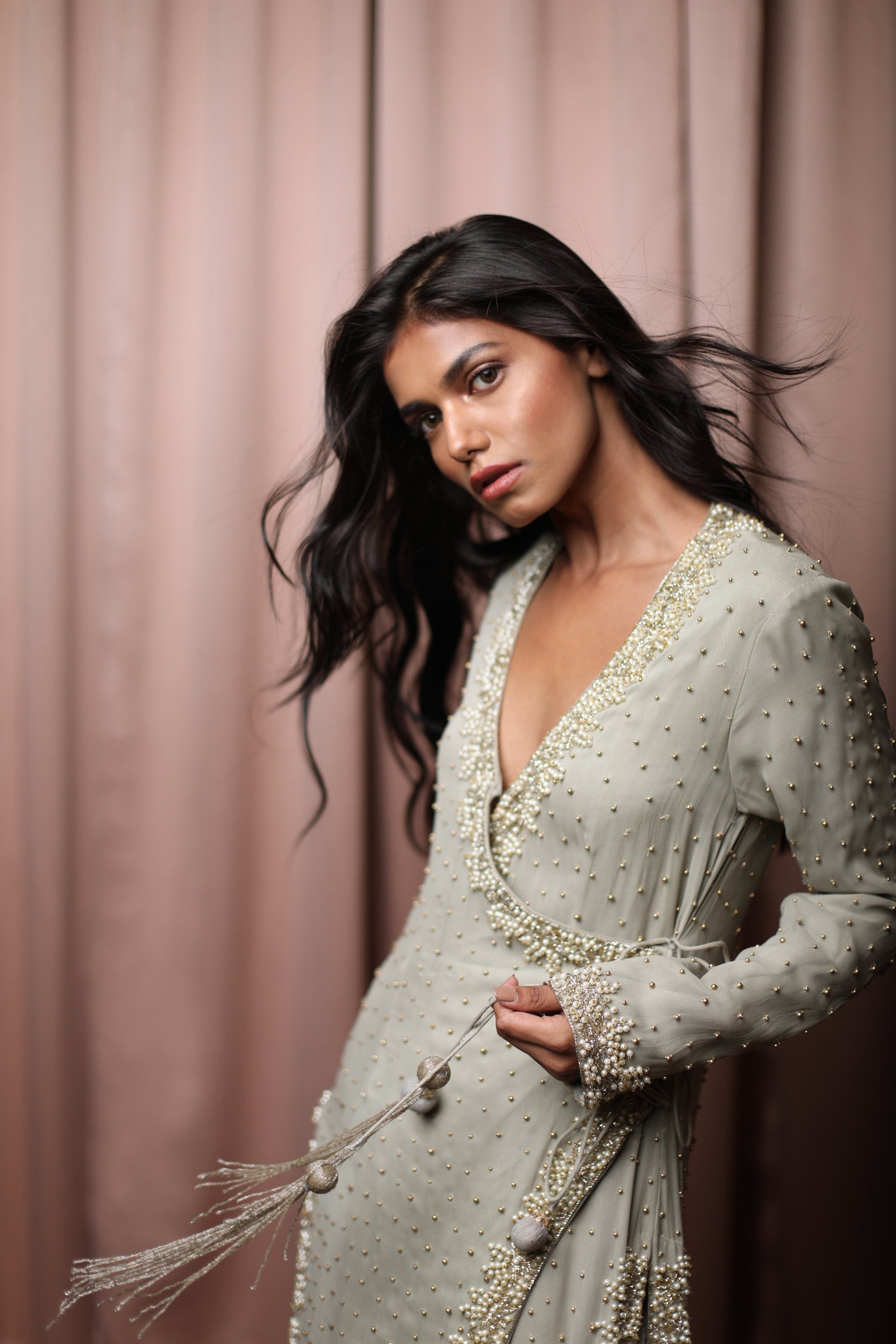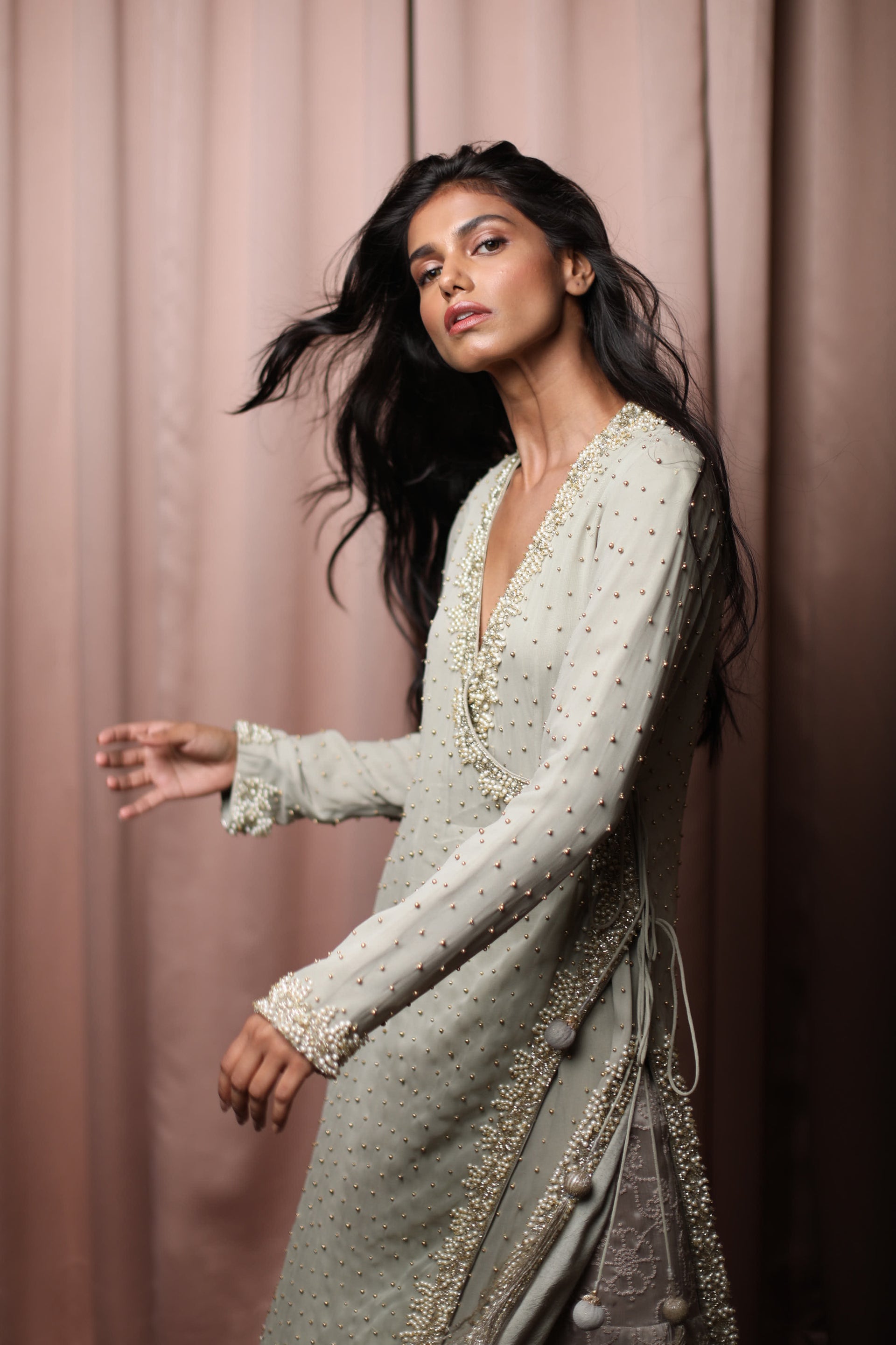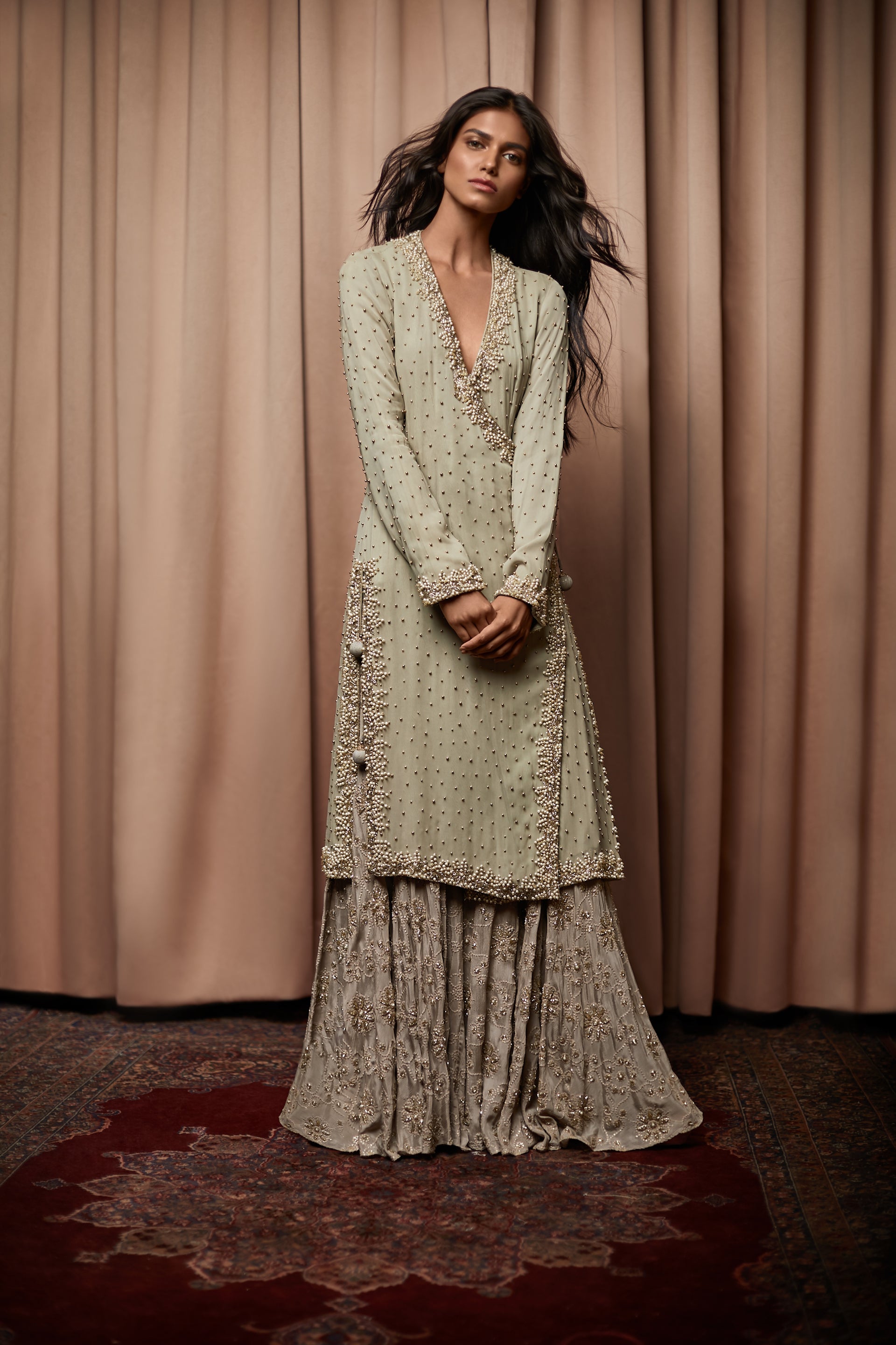 Grey overlap kurta and sharara featuring katdana and pearl embroidery. A classic attire that takes you back to the 70s and give you the old world experience.