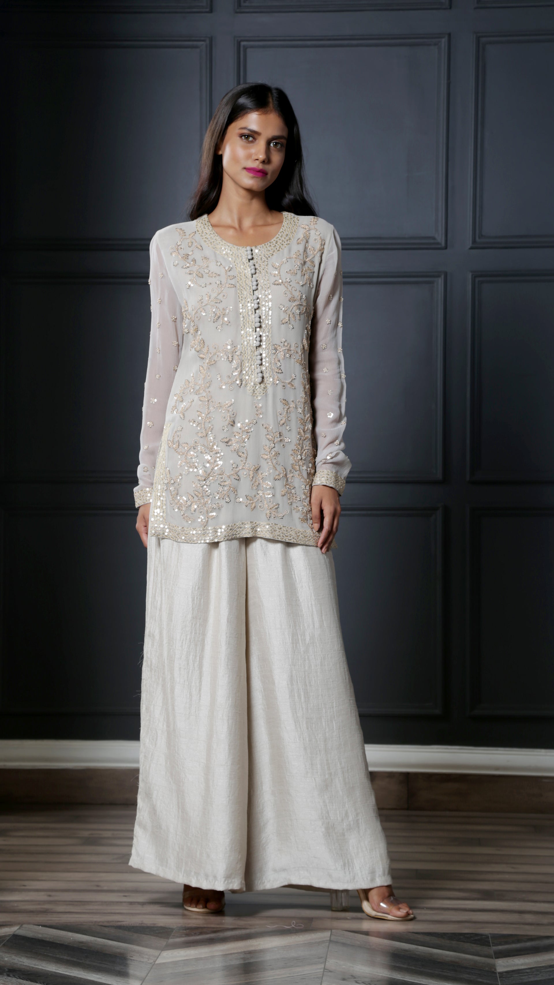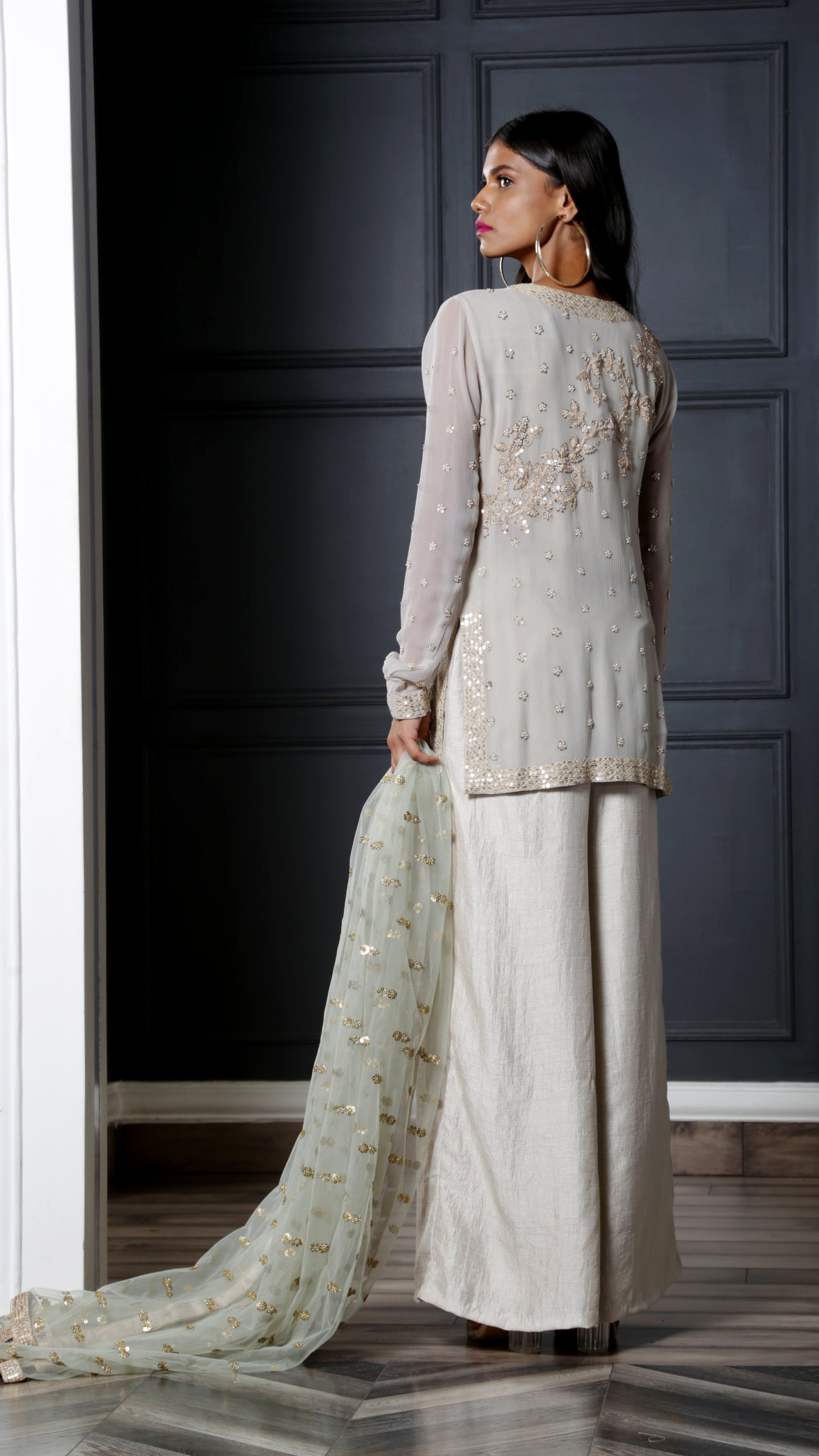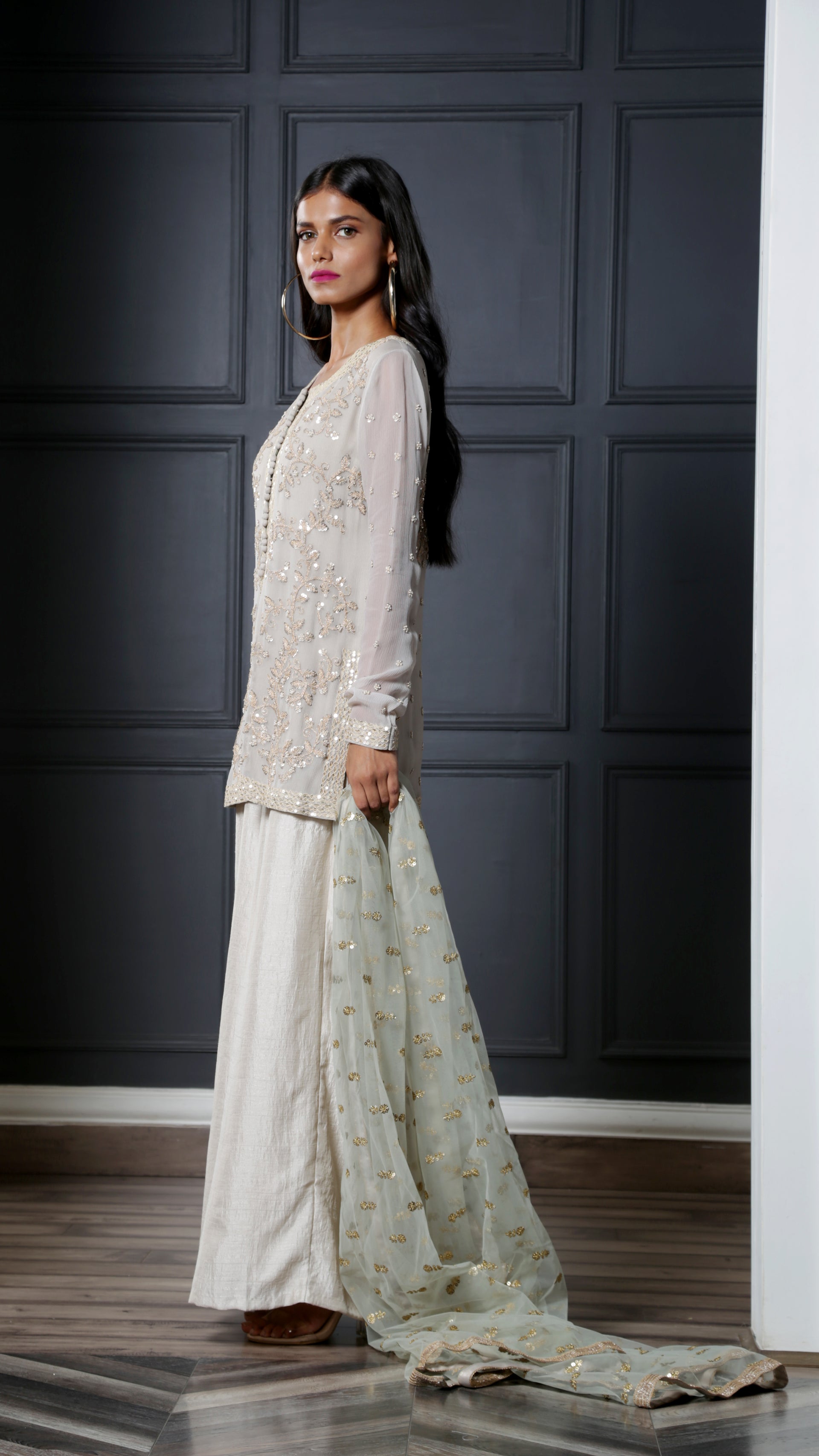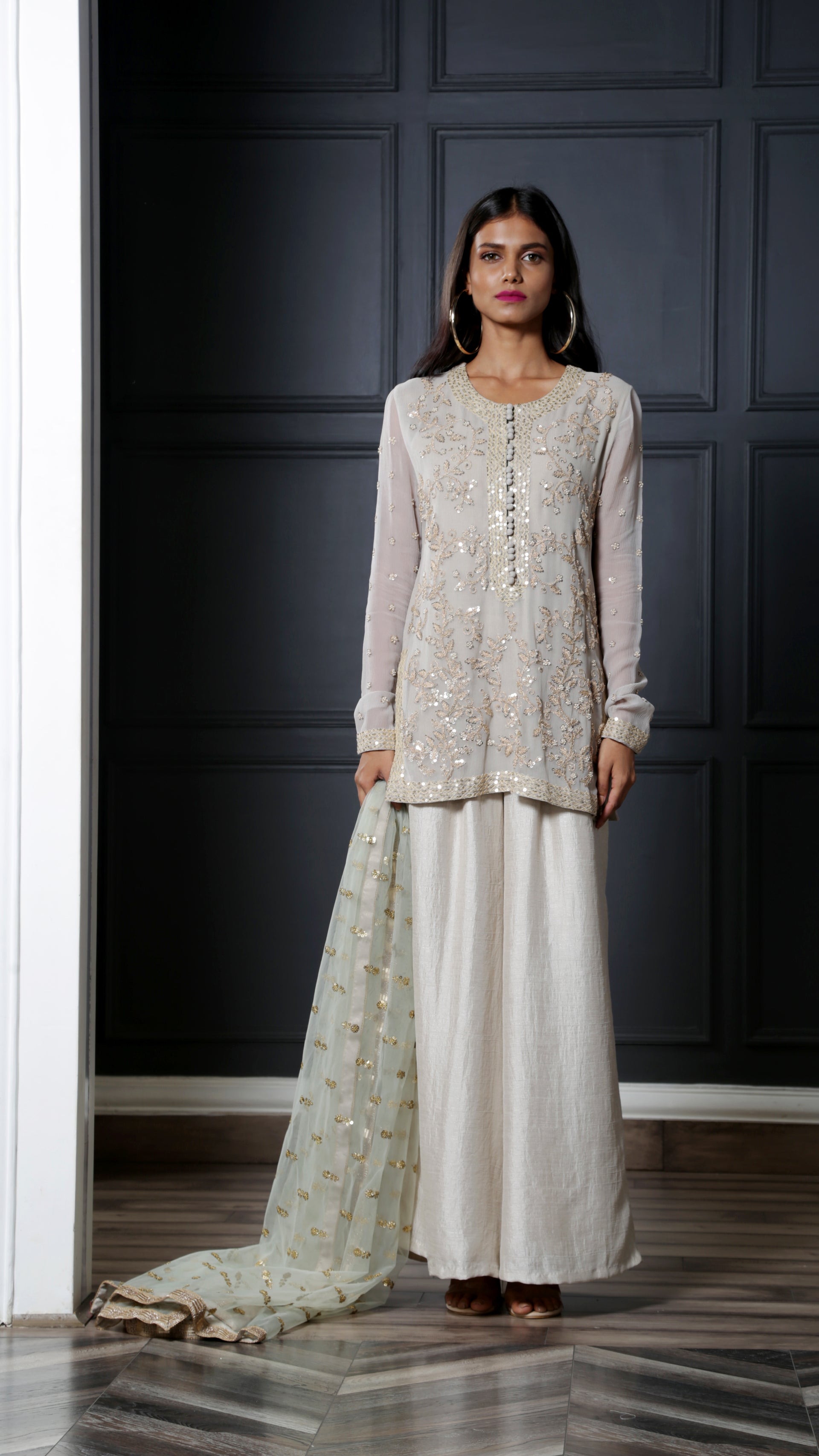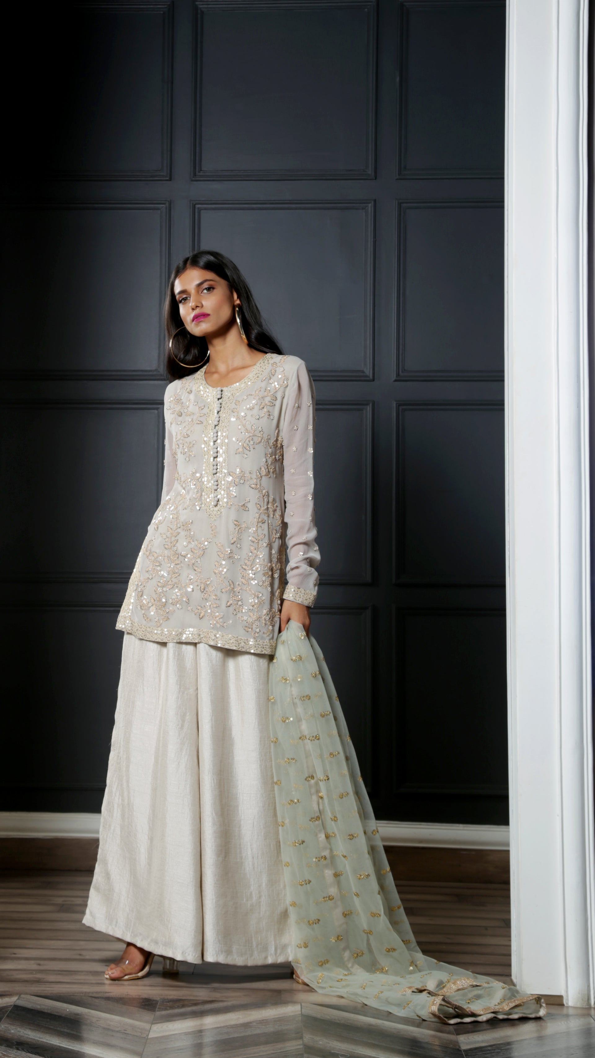Bohemian free spirited kurta featuring intricate embroidery and an elegant button patti detailing on the neck. Paired with palazzo pants and an embroidered sequins dupatta.
