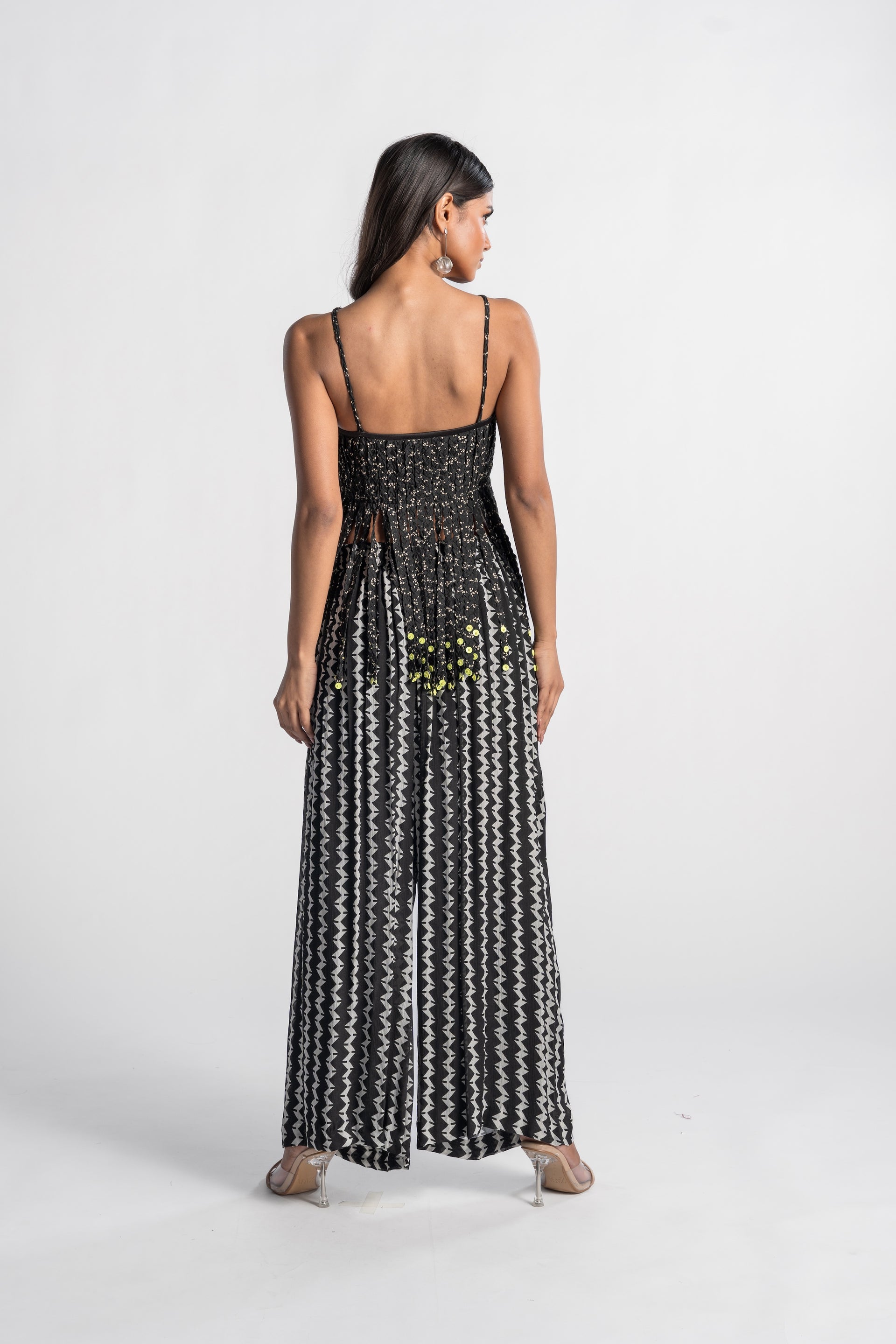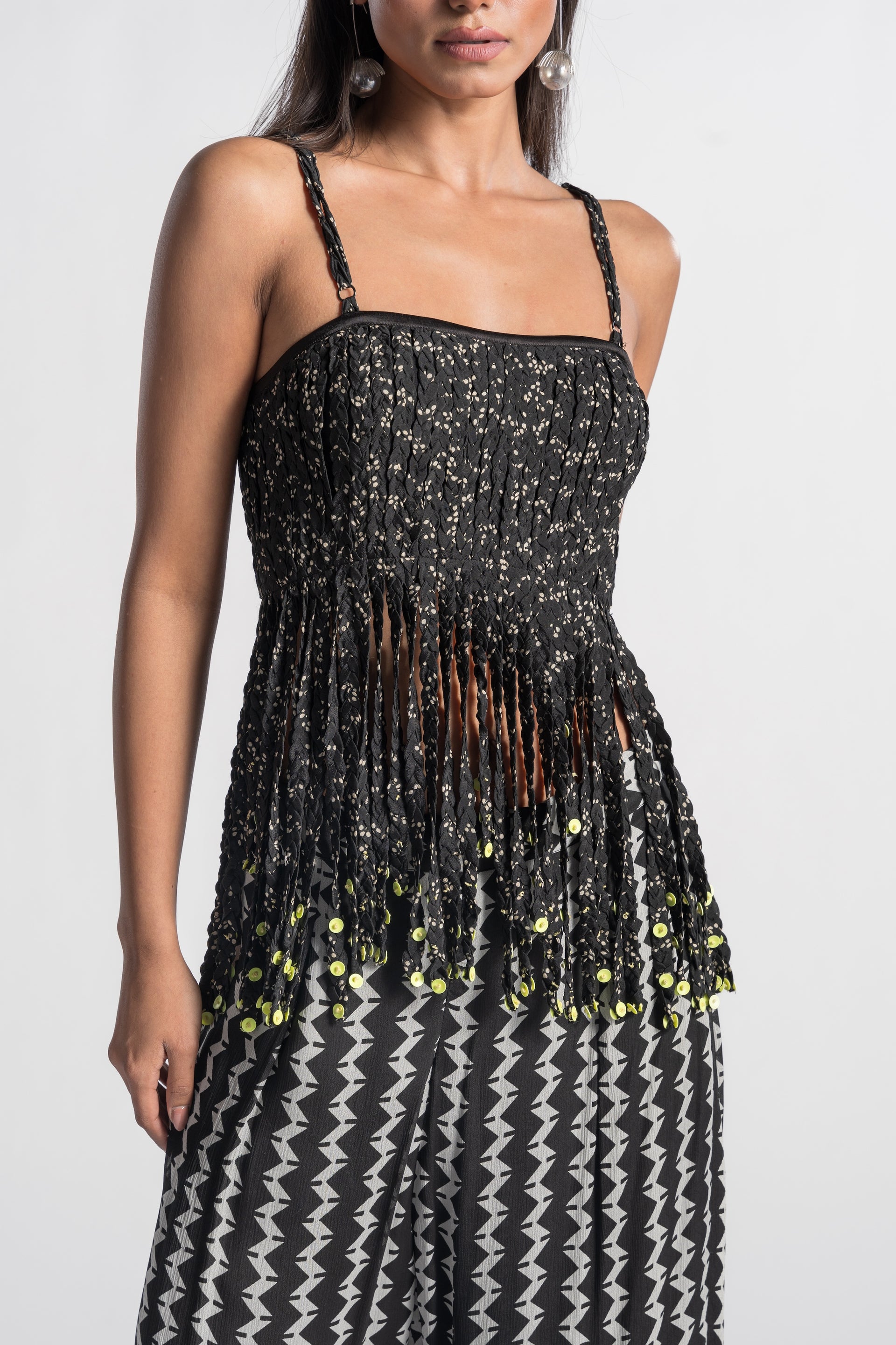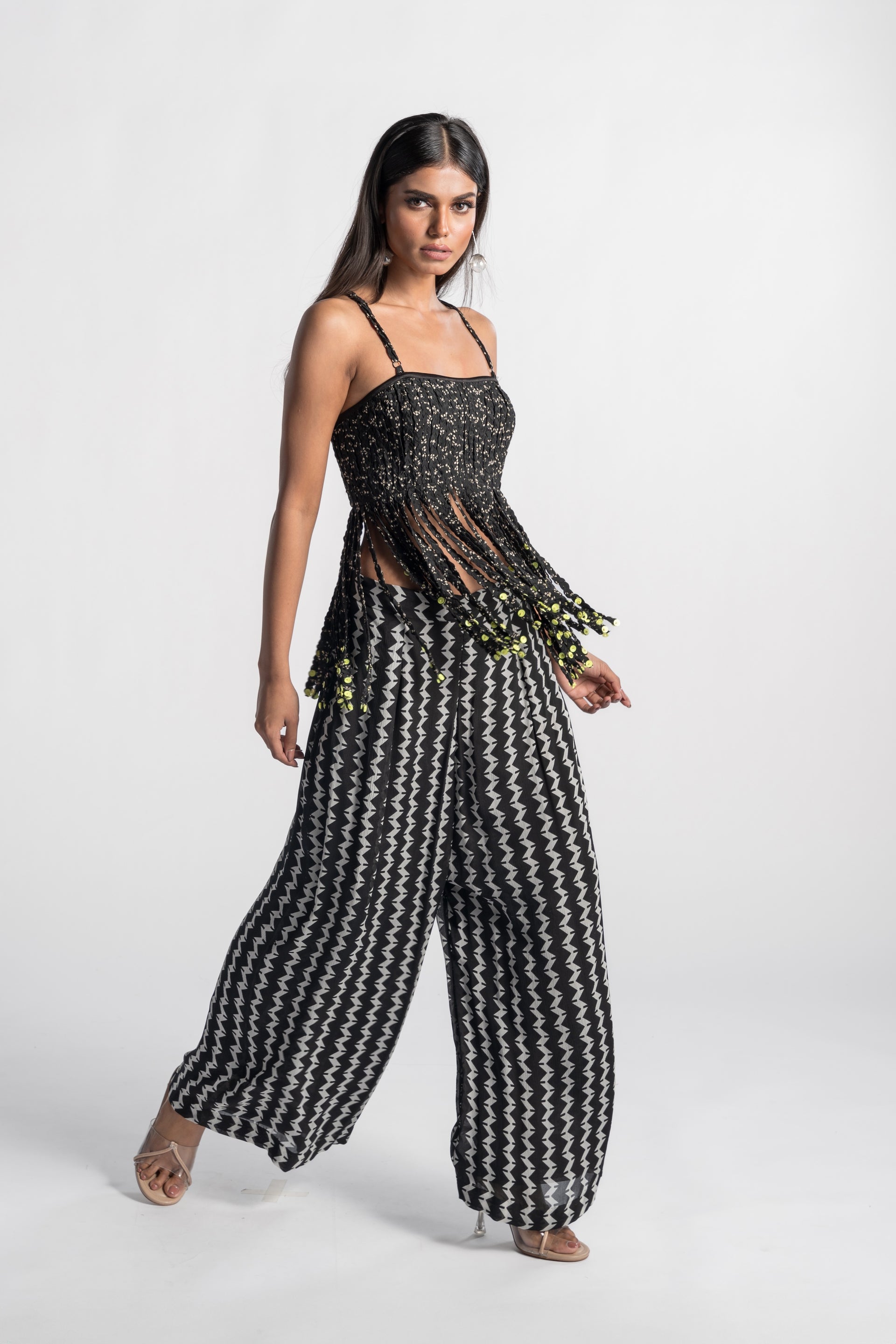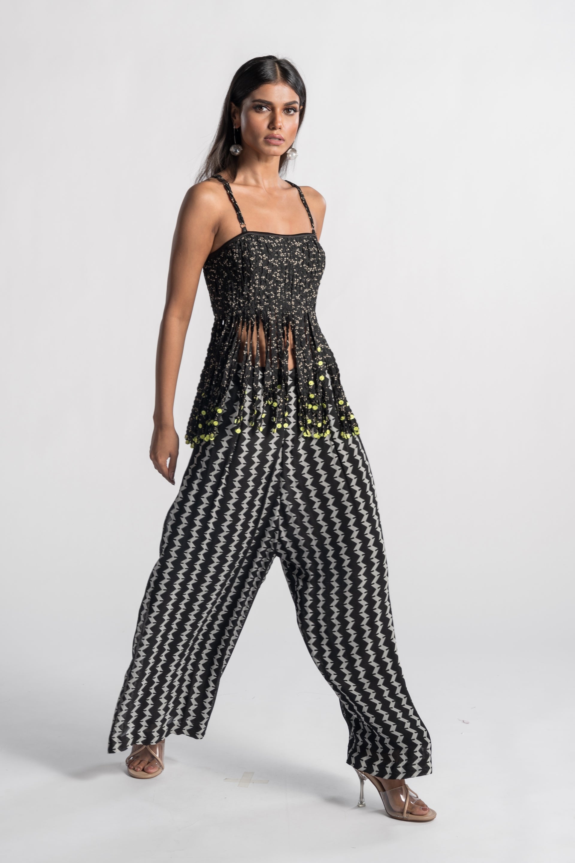 The Anjuna Tassel Top and Pants feature neon beading and playful tassel detailing on the top, paired with geometric printed pants. This bohemian ensemble brings vibrant energy and eclectic charm to any look.