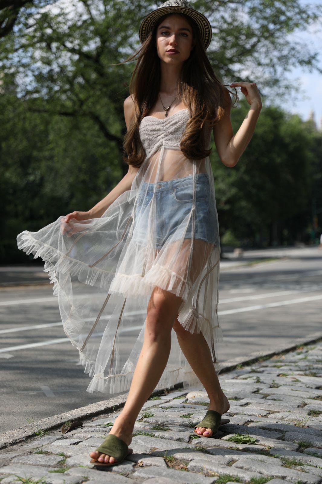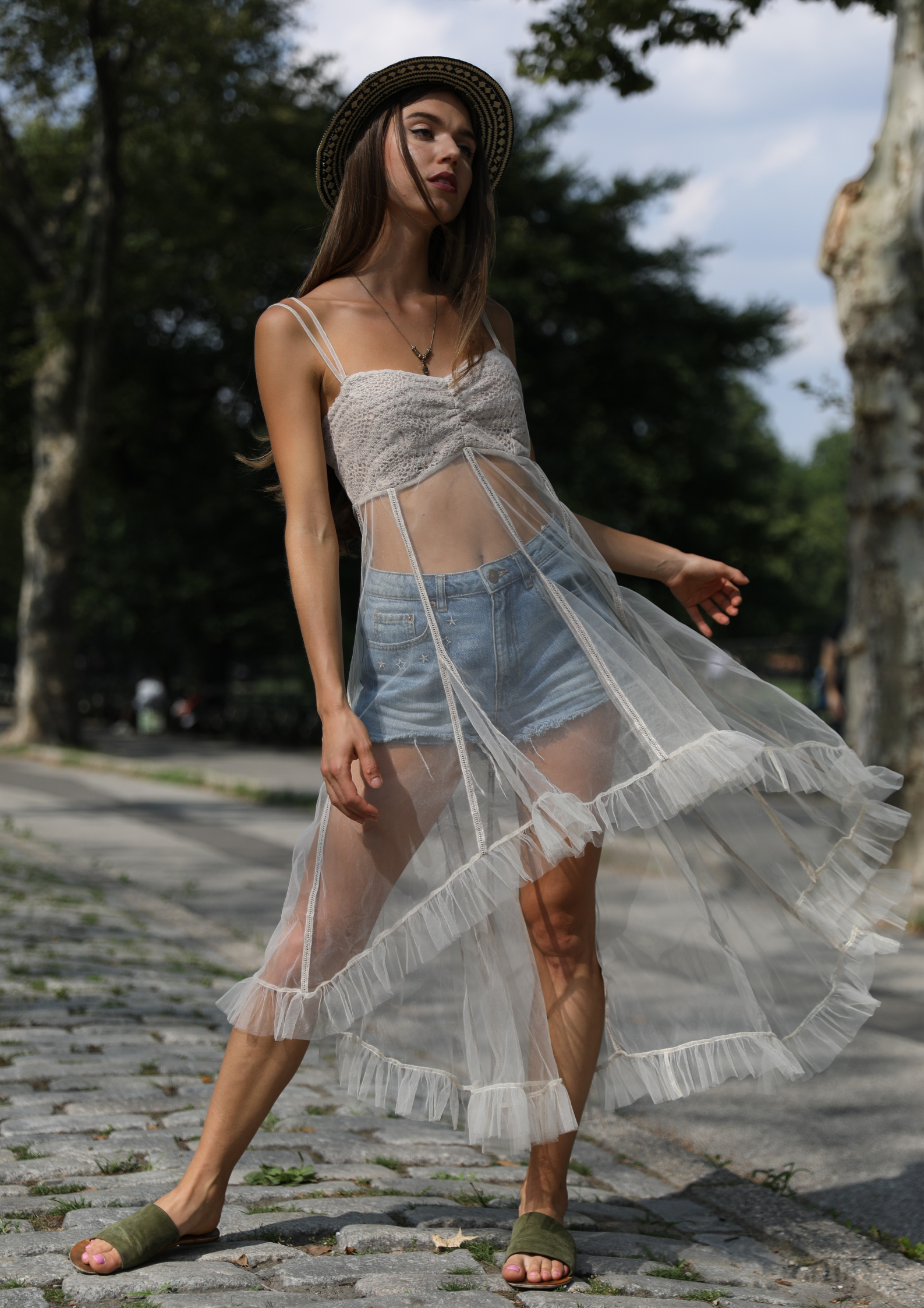 Grey colored crochet bandeau attached with long tunic in tulle with pleated edges and color blocked design. It is crafted with high low hemline. This is a must-have for your closet.