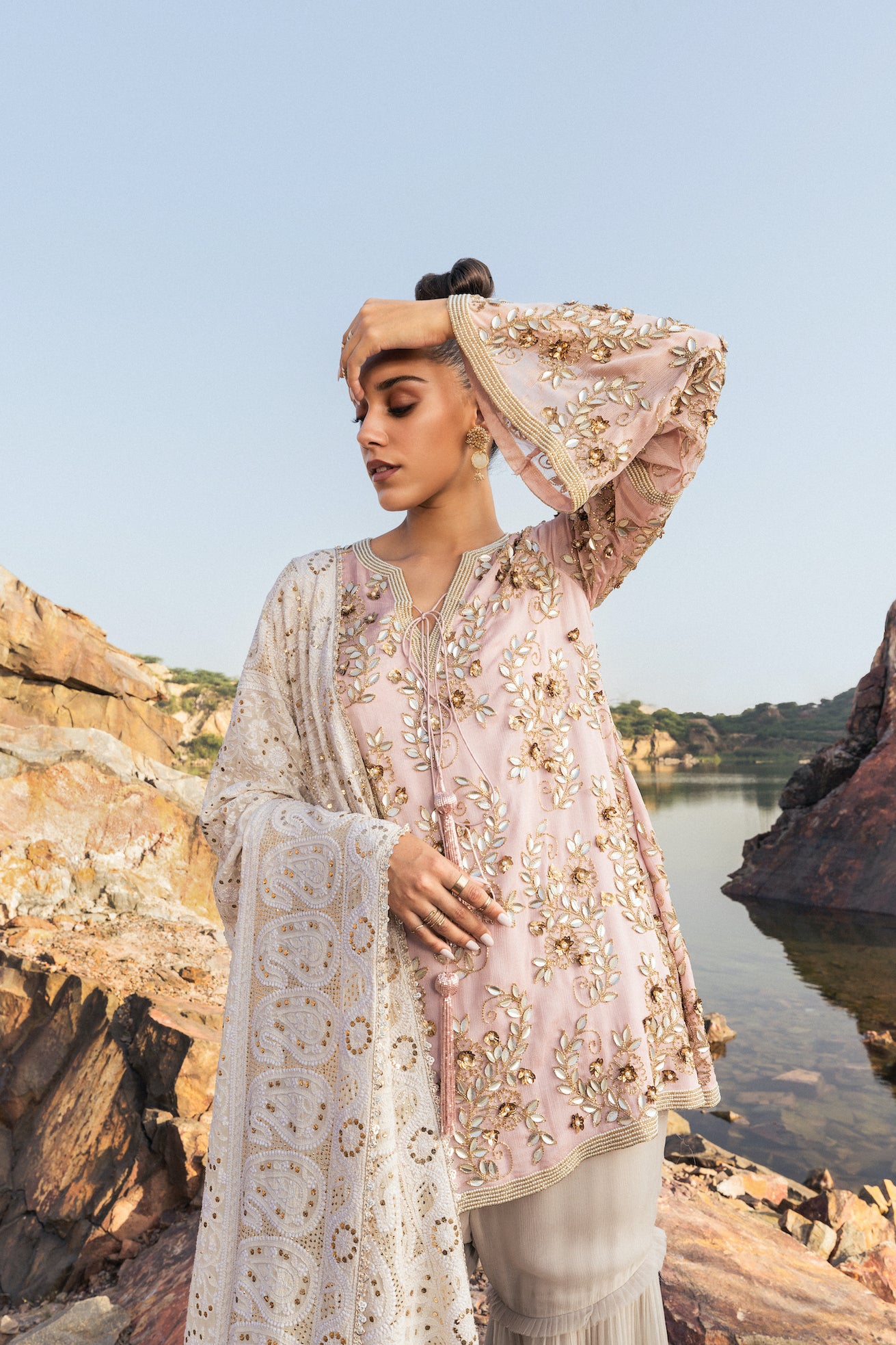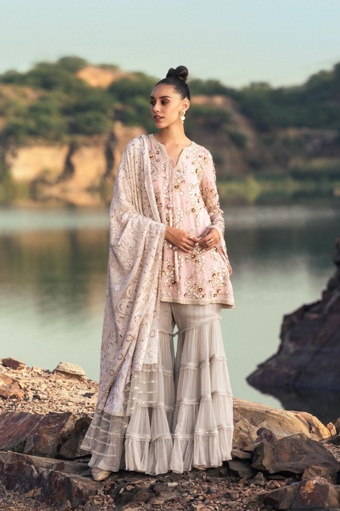 Make a style statement with this Blush Pink Kurta and Sharara Set. Crafted from luxurious georgette fabric, this sharara set is highlighted with sequins floral embroidery and is paired with an ivory chikankari dupatta. This set is what we call effortlessly elegant with a modern uptake.