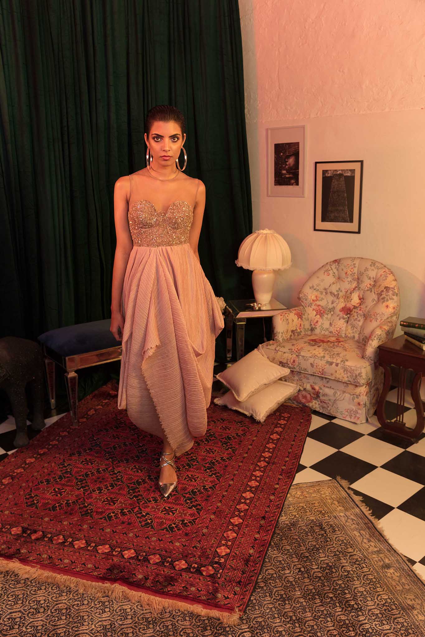 Draped pre-pleated chiffon gown featuring fine sequin detailing on the bodice and a tulle neckline. An edgy outfit for statement makers from our limited collection!