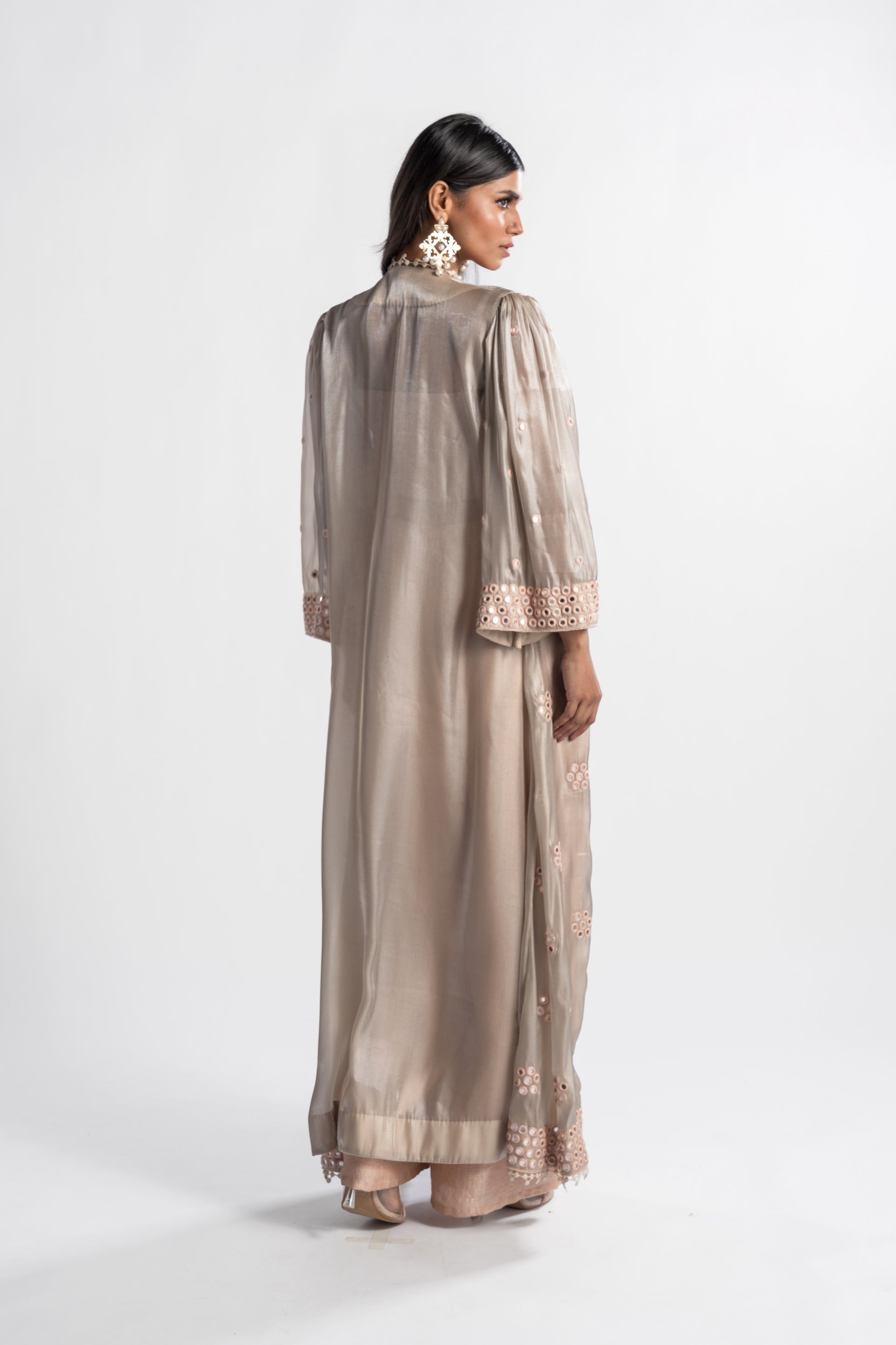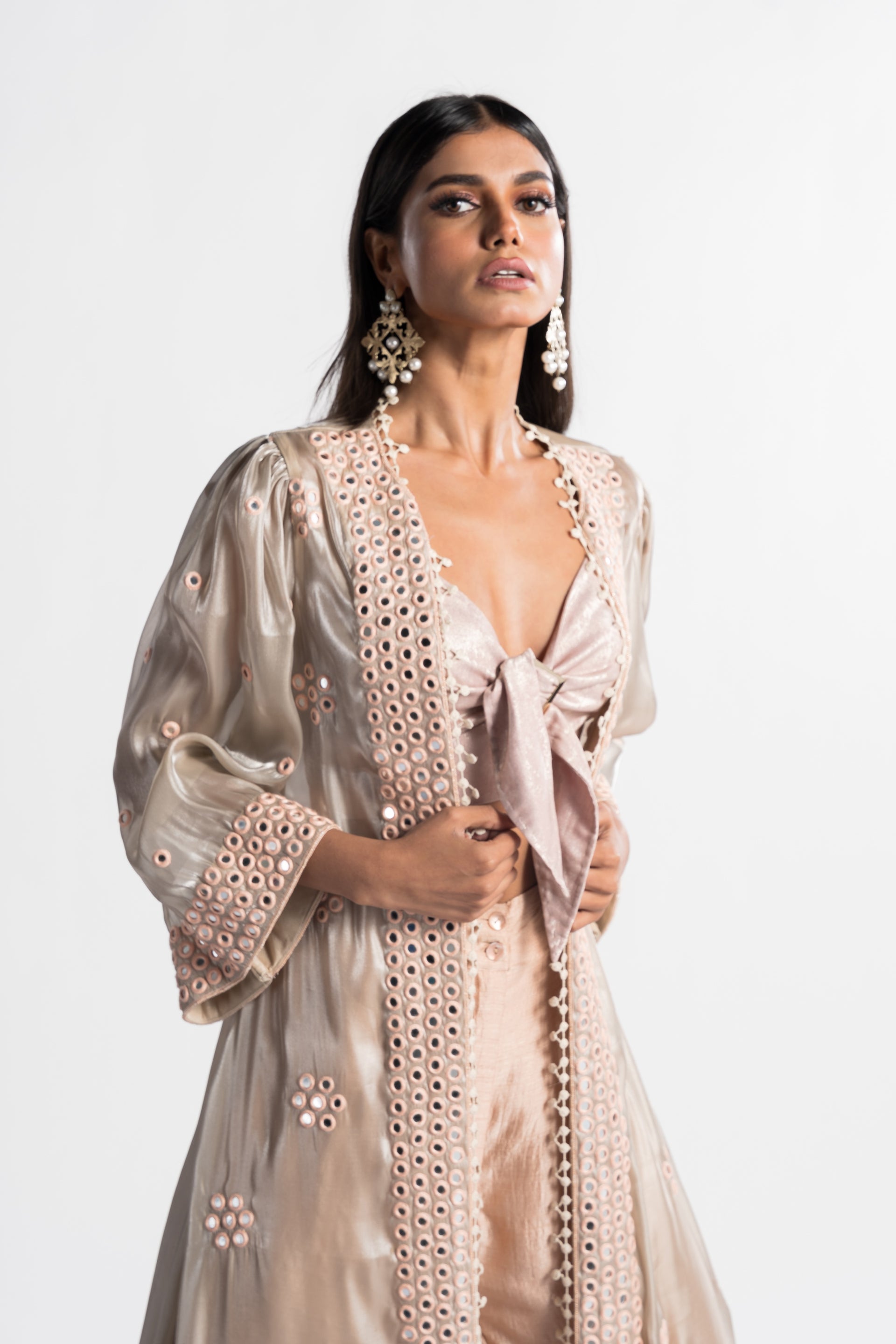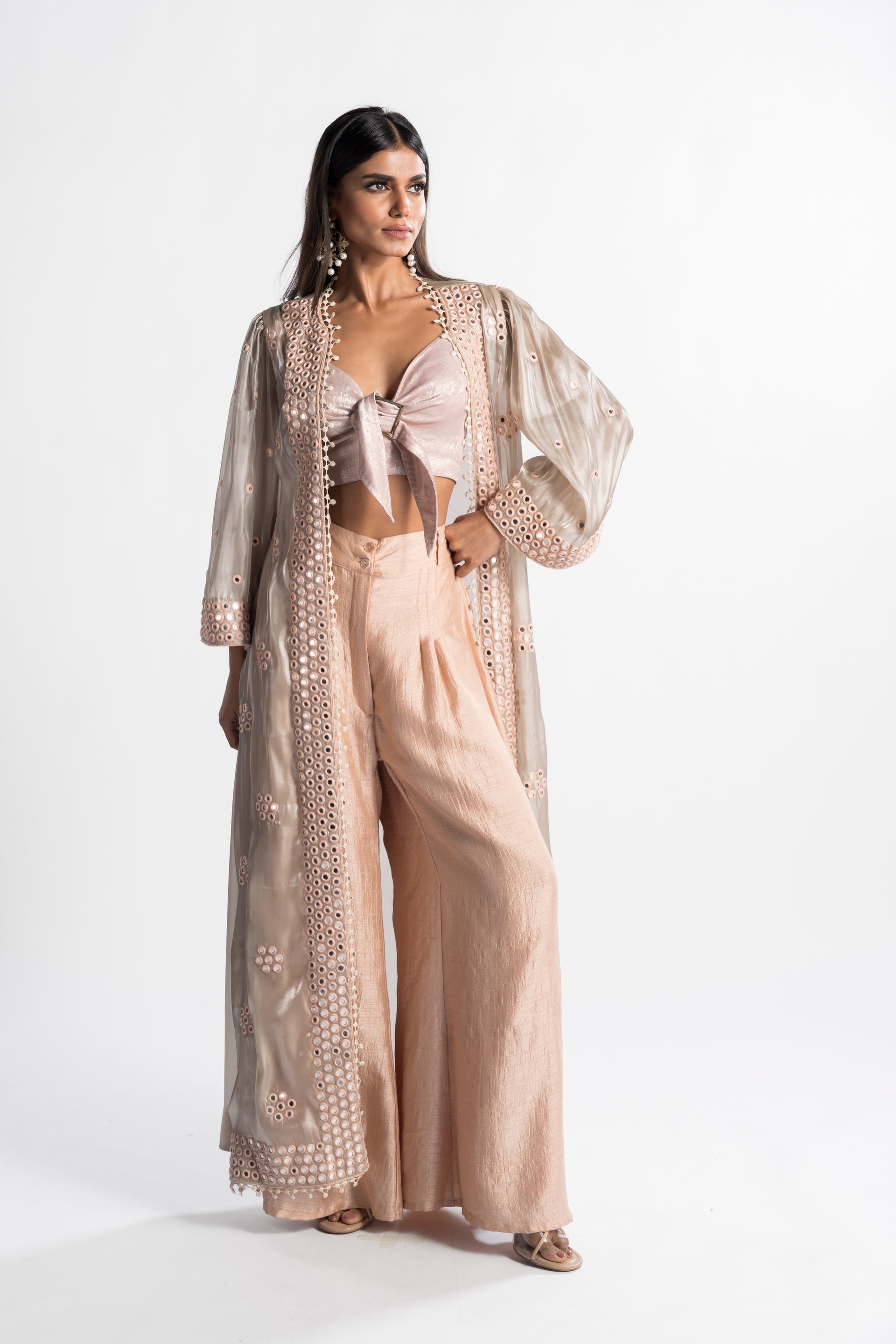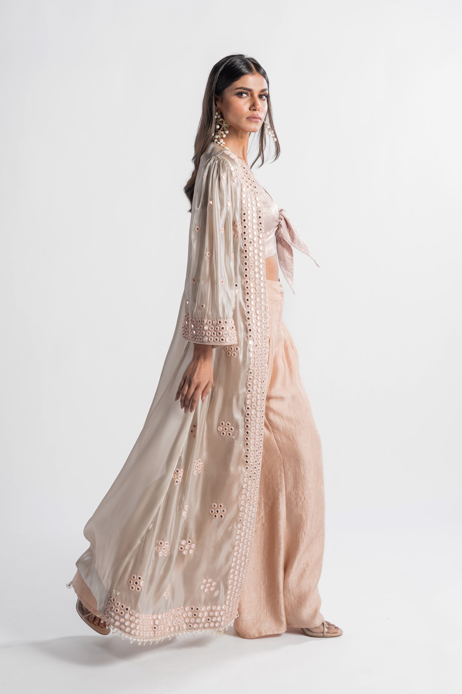 The Chiara Top Blouse with Cape and Pants features a blush pink monotone design, showcasing a sleek blouse with a tie-up neck detail, paired with a flowing cape and peach pants. This ensemble beautifully merges contemporary style with classic charm for a refined and polished appearance.
