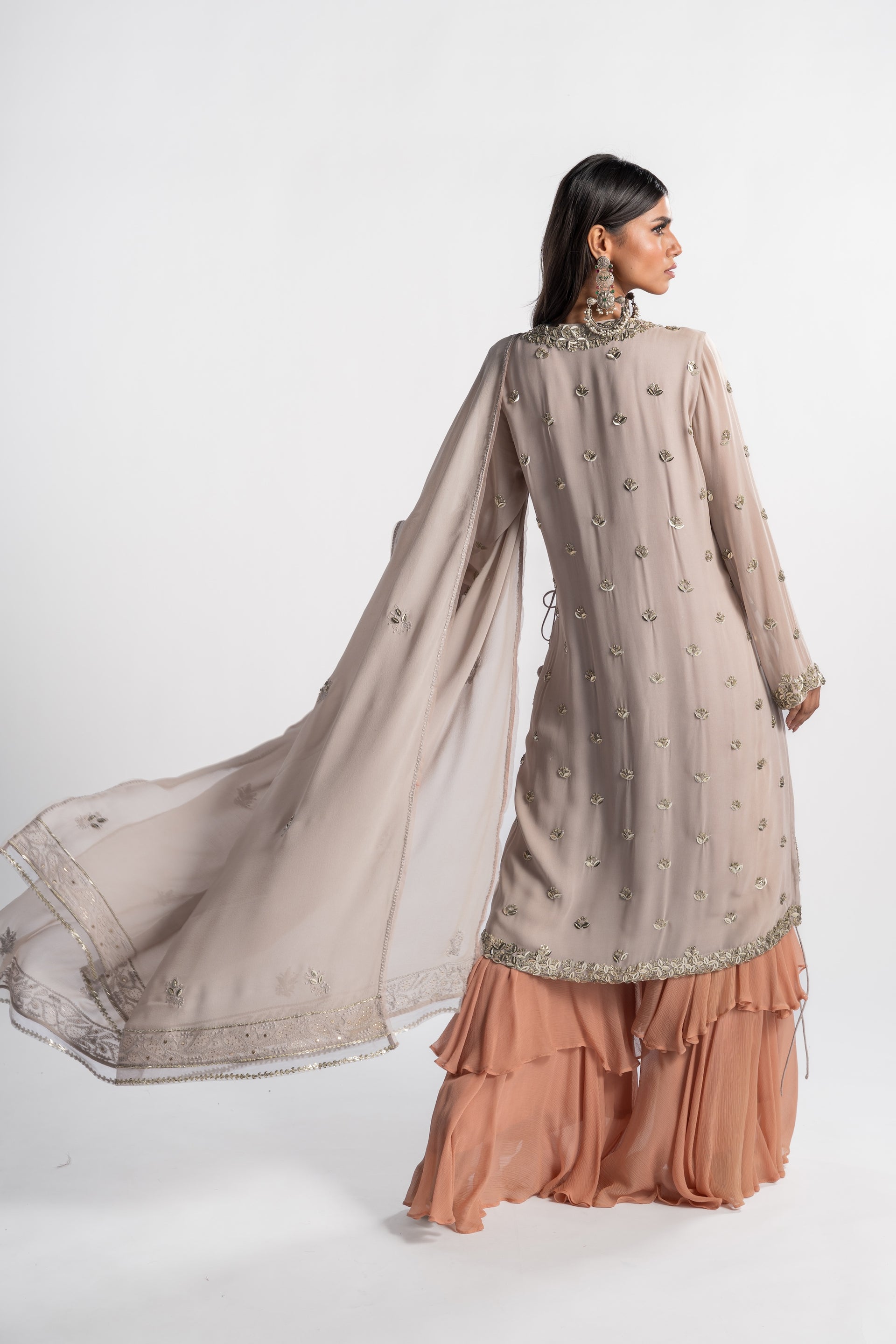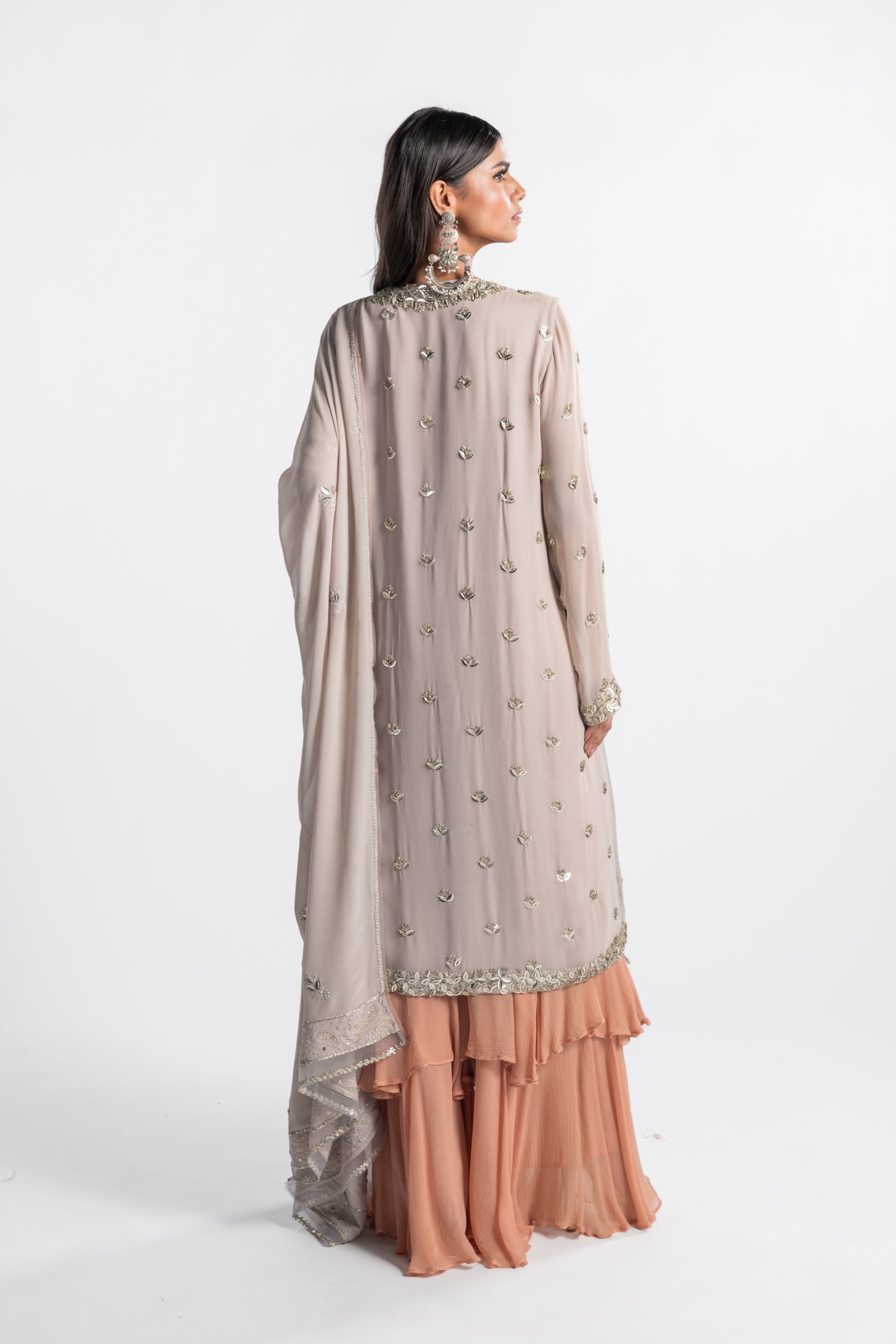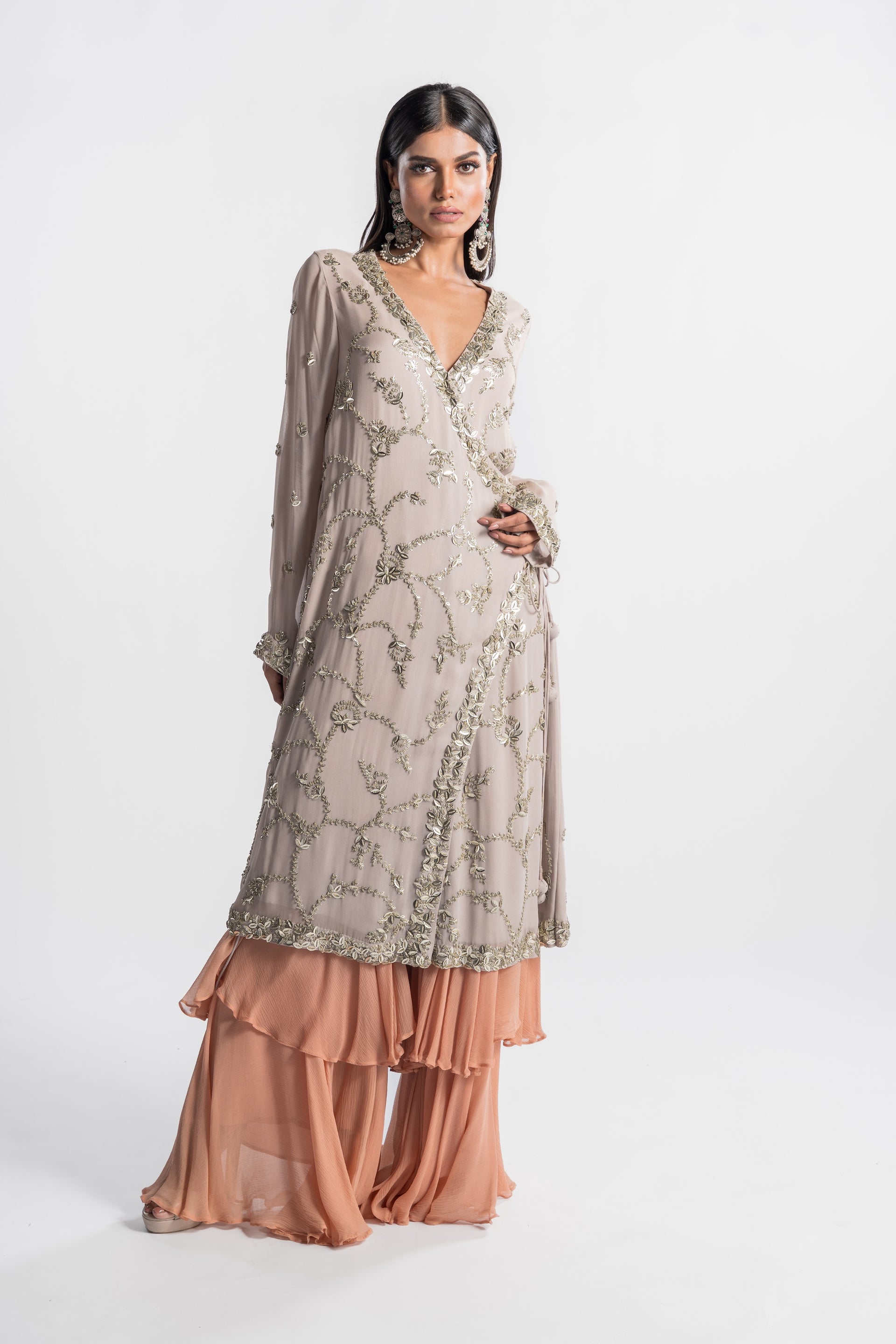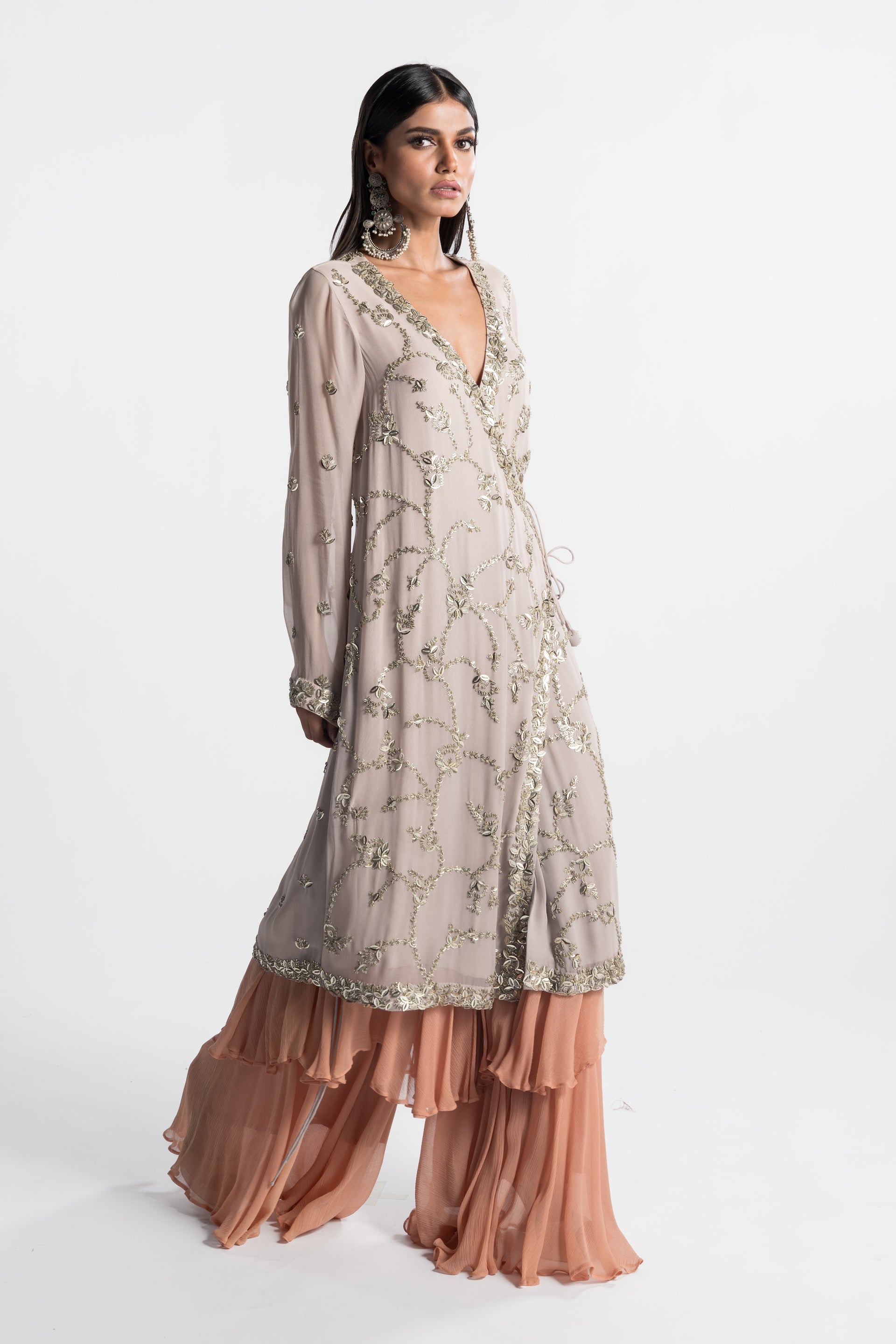 Crafted from premium fabrics, this lilac-grey overlap kurta showcases silver sequin embroidery and pairs seamlessly with contrasting coral tiered sharara pants. A classic addition to your festive collection.
