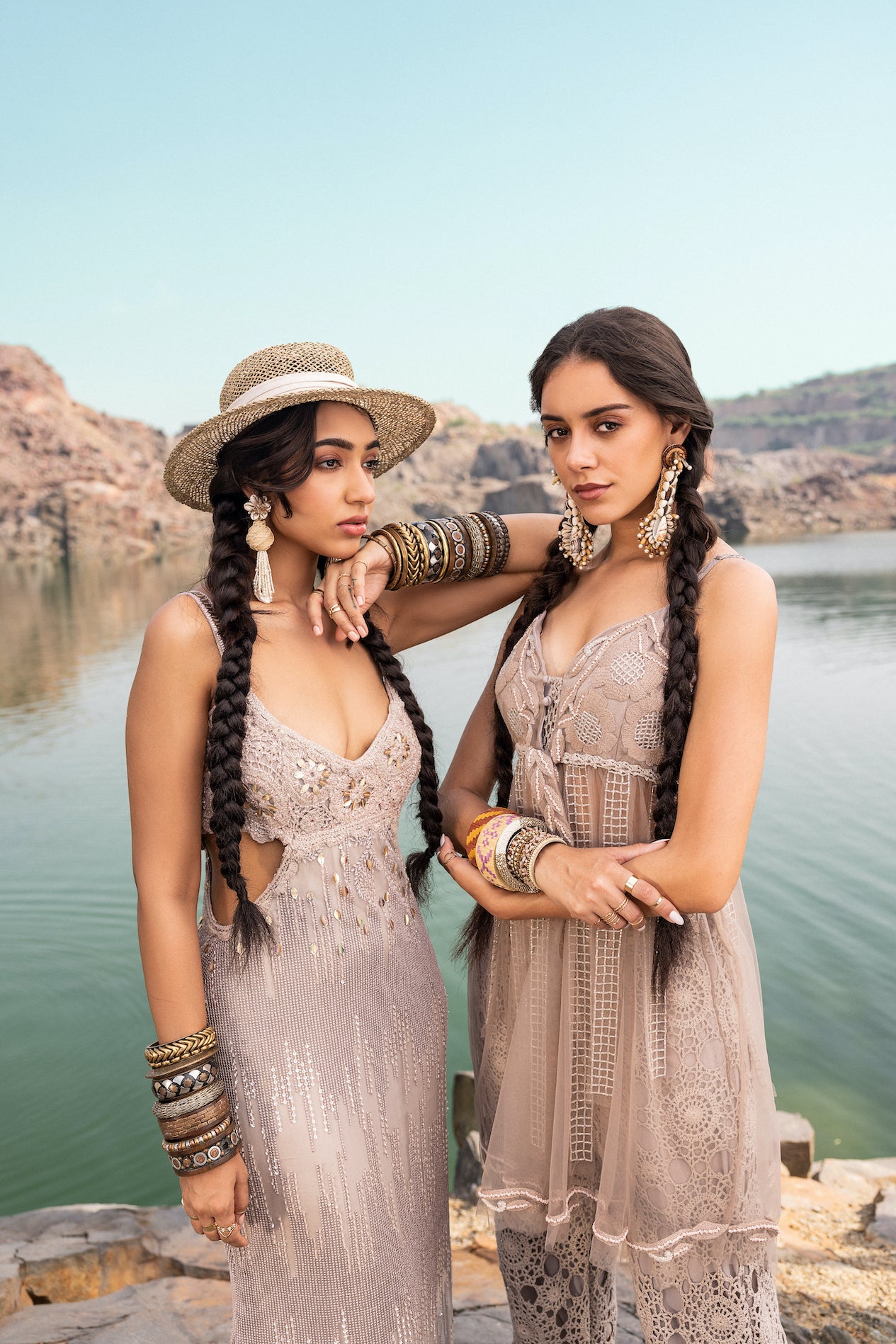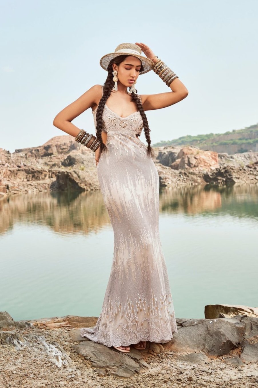 Take your style game up a notch with this nude pink gown. Made with finest materials, this crochet and lace side cutout gown with hand embroidery that exudes dream like sophistication.
