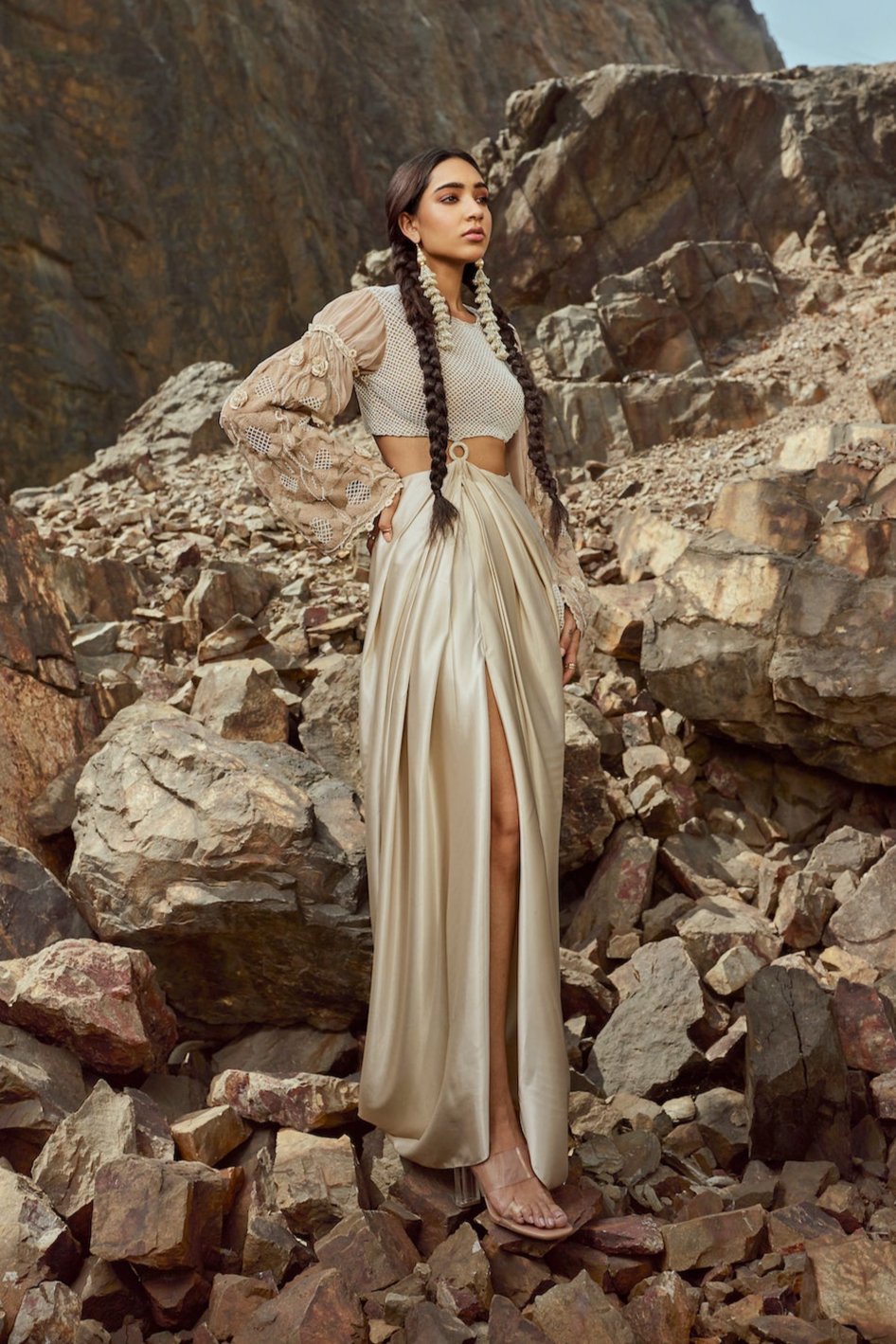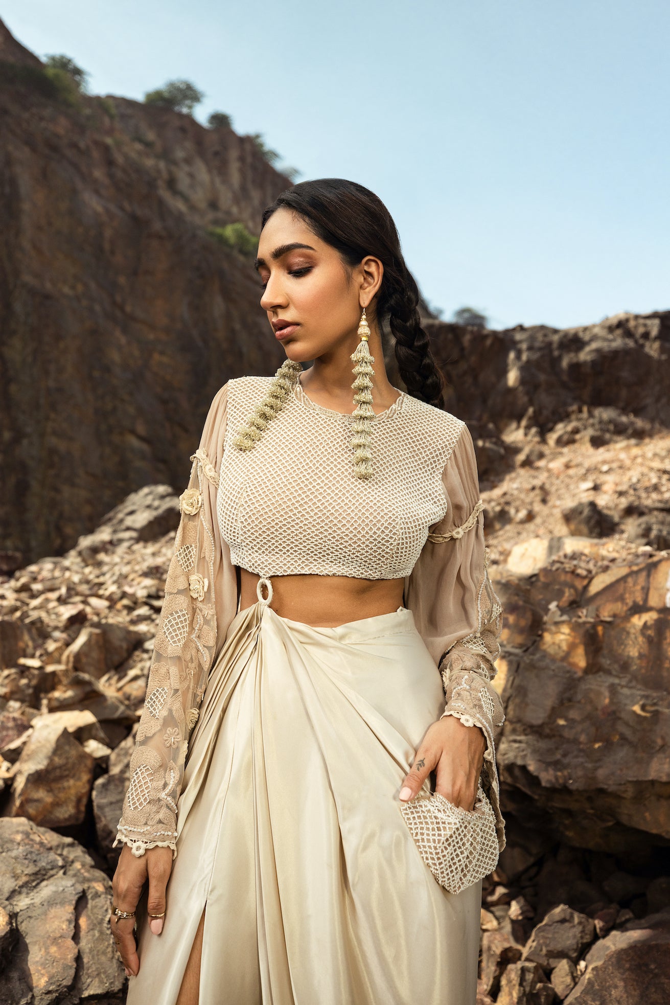 Be all diva-like when you step out in our draped gown. This hand embroidered peasant crop top with bishop sleeves comes with an attached drape skirt and intricate embroidered detailing.
