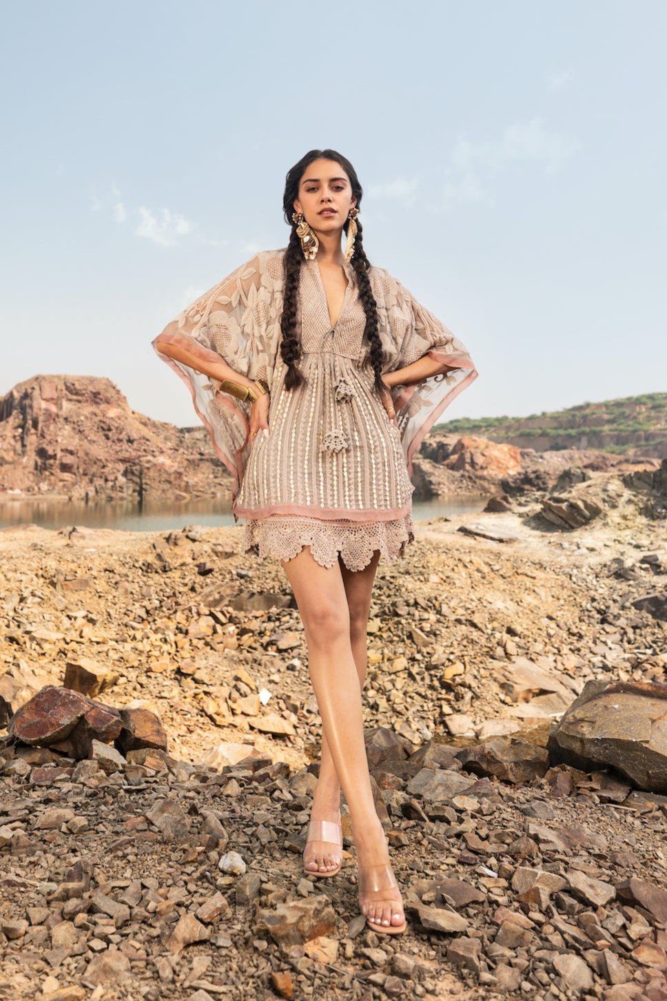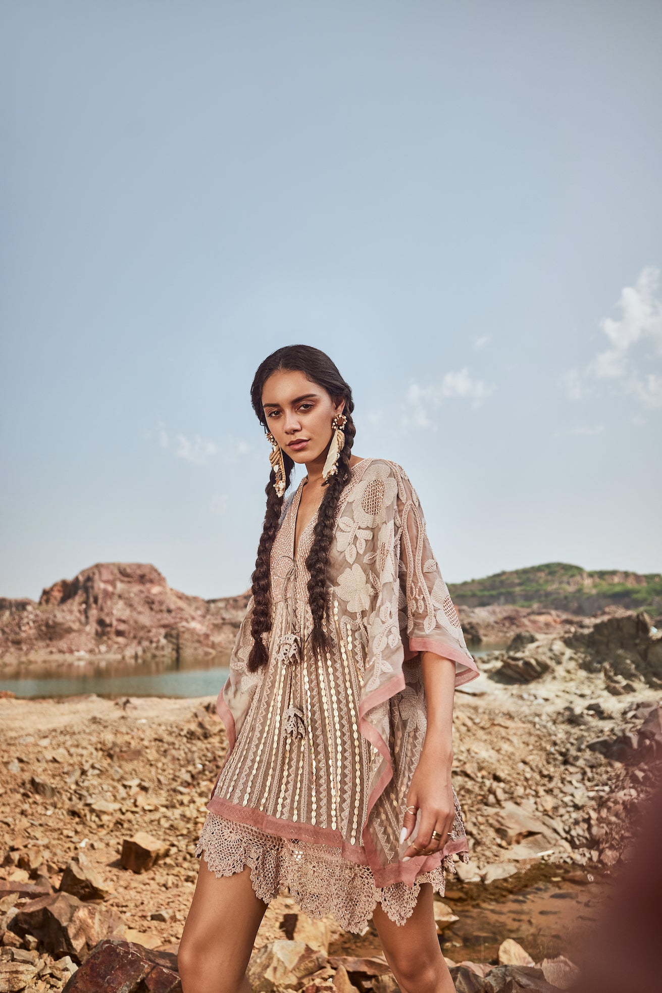 Put together a stylish look effortlessly with this grey & blush kaftaan dress. Crafted with georgette and embellished with sequins and lace detailing, this outfit is both comfortable and boho chic.