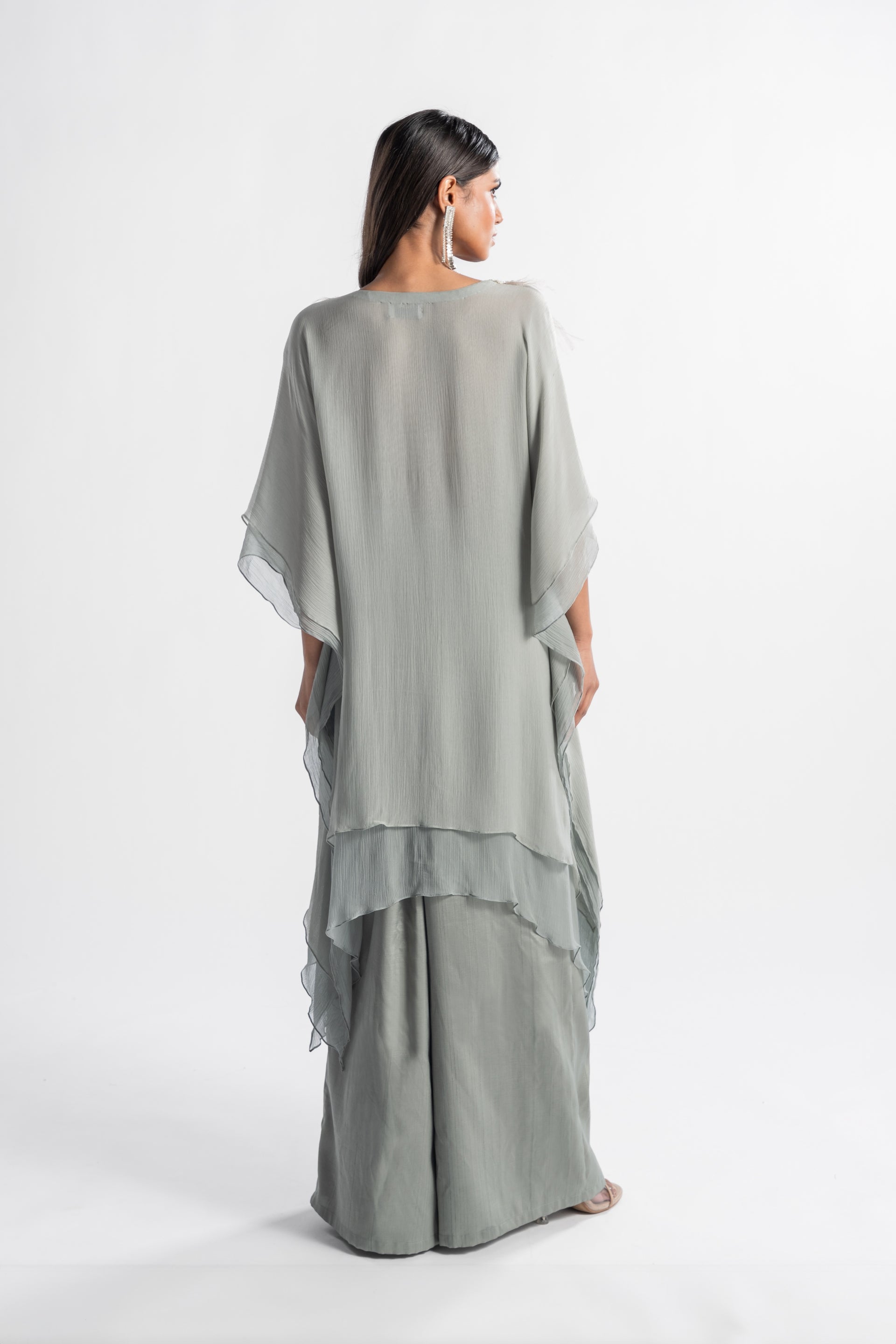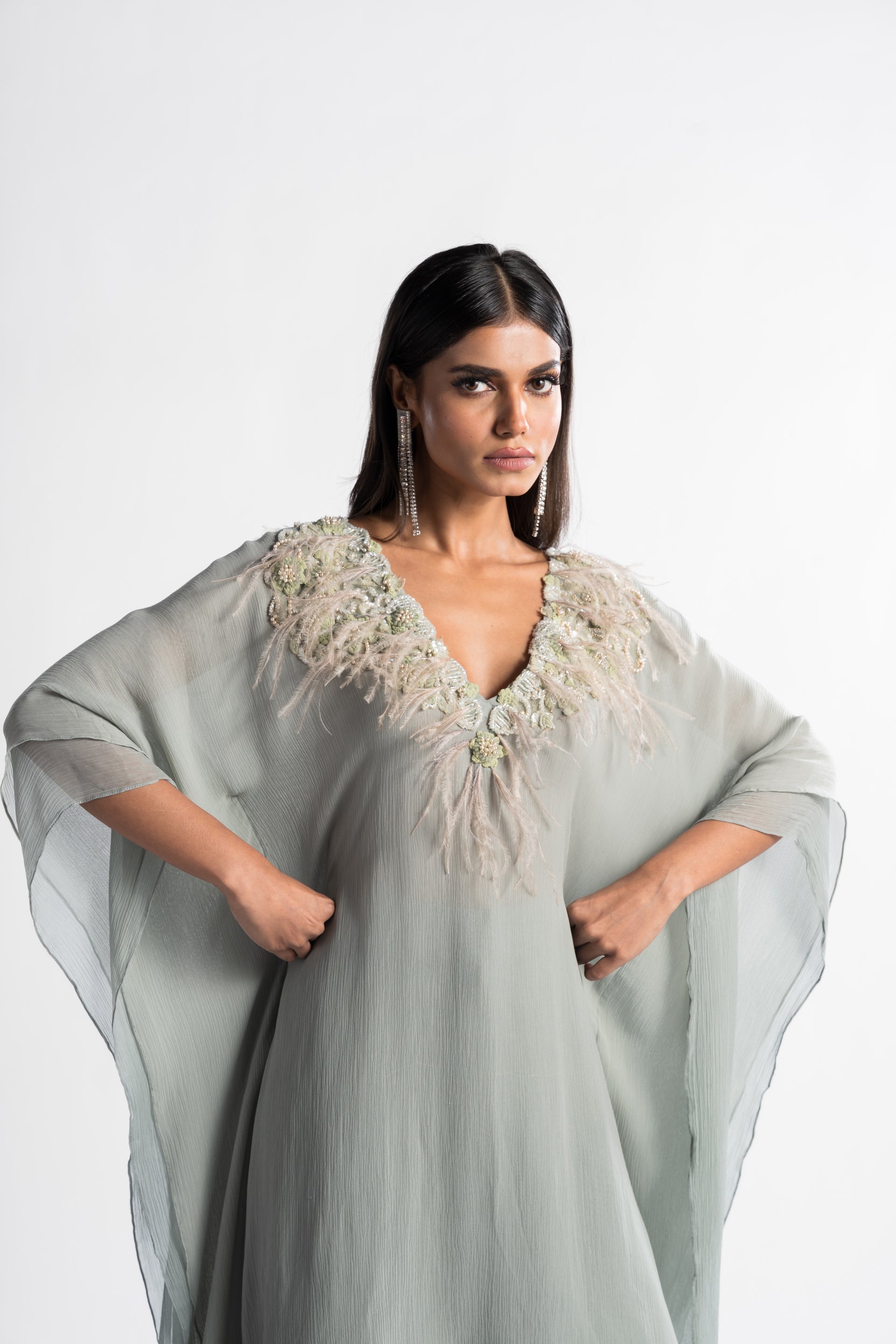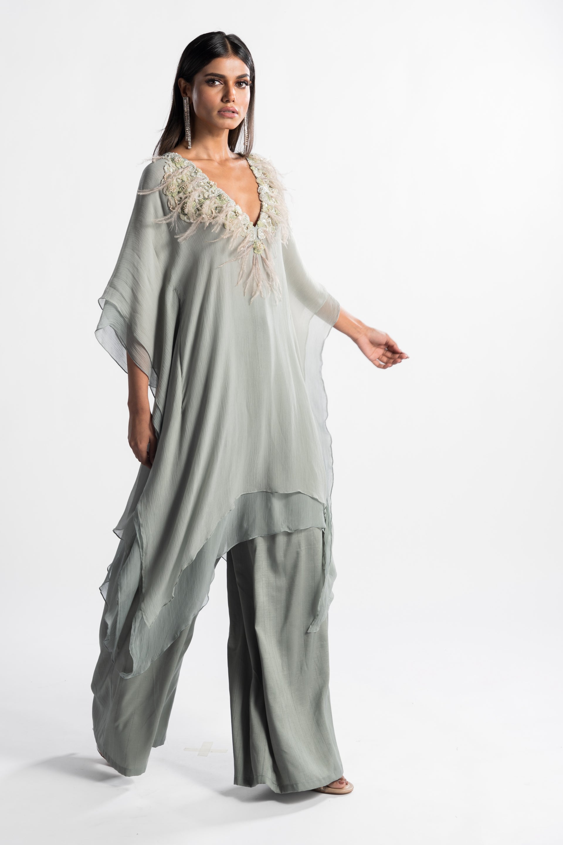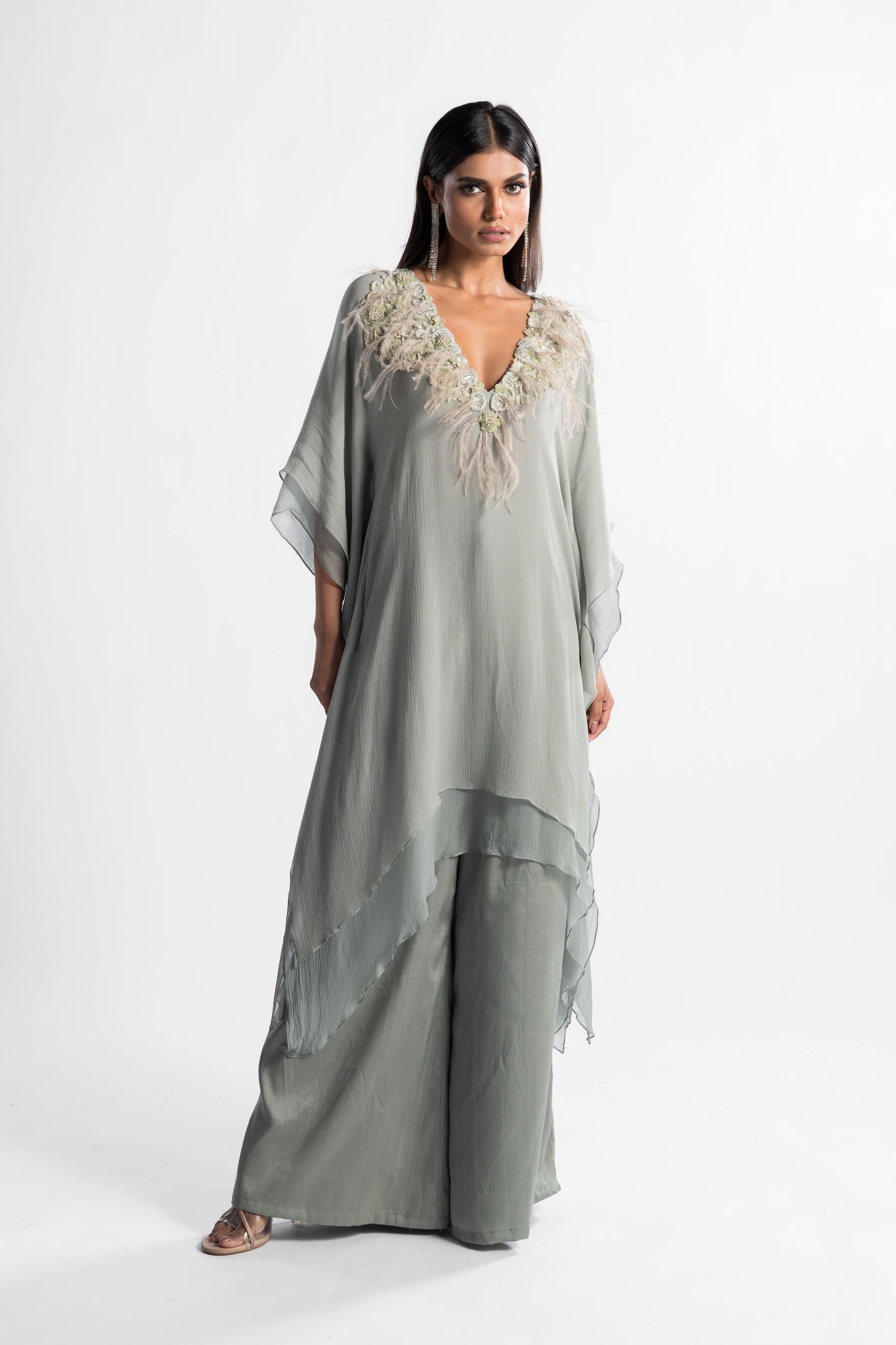 The Élysée Feather Kaftan Set features a flowy chiffon kaftan kurta adorned with delicate embroidery, paired with satin pants for chic comfort. Feather detailing adds a hint of Parisian charm, blending elegance with a relaxed silhouette for a sophisticated yet effortless look.