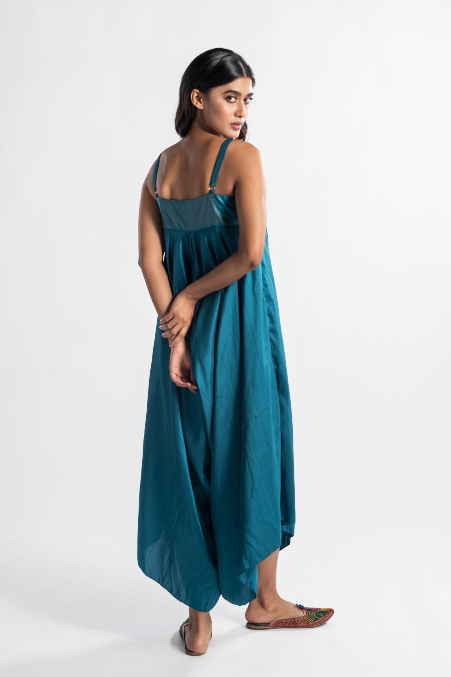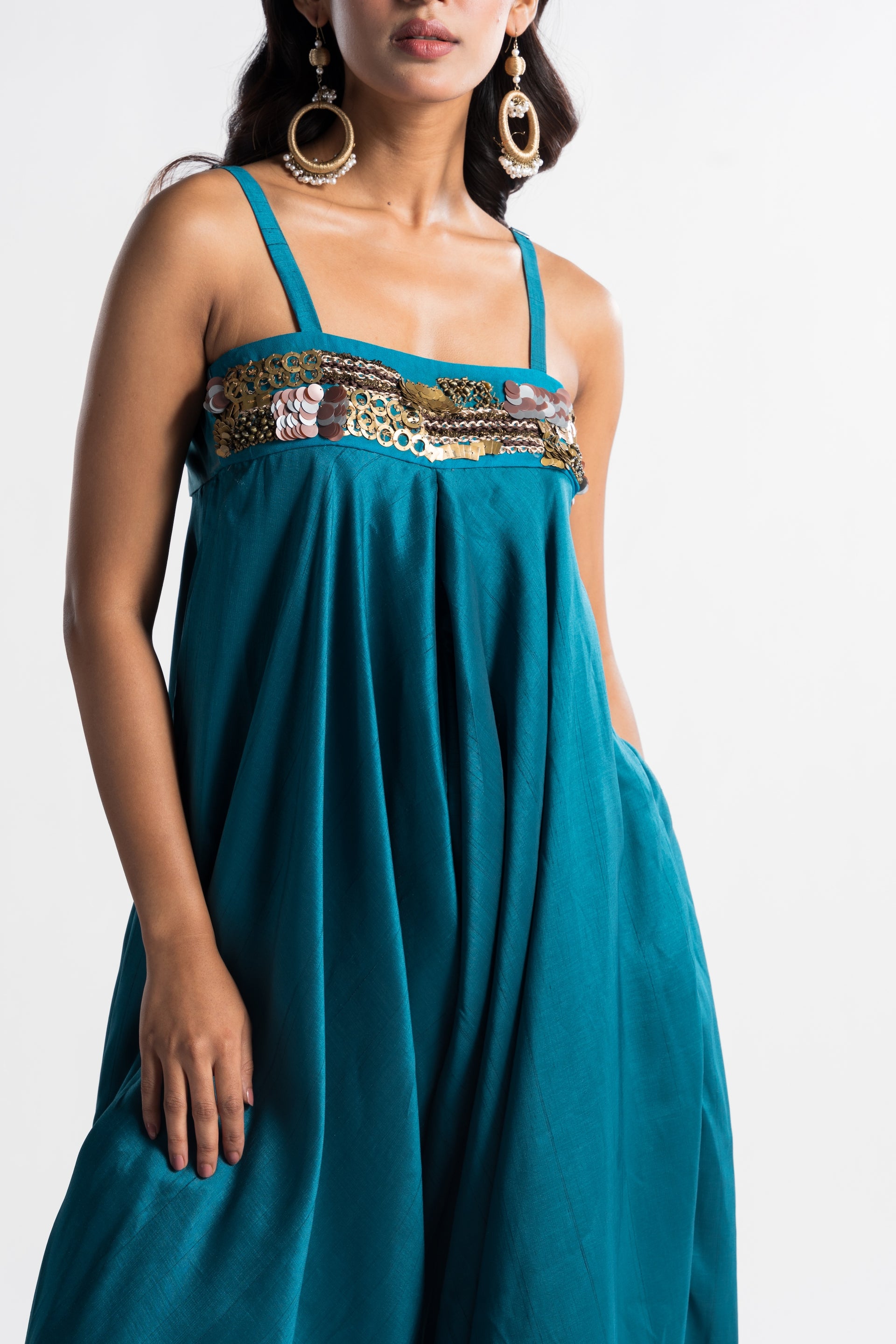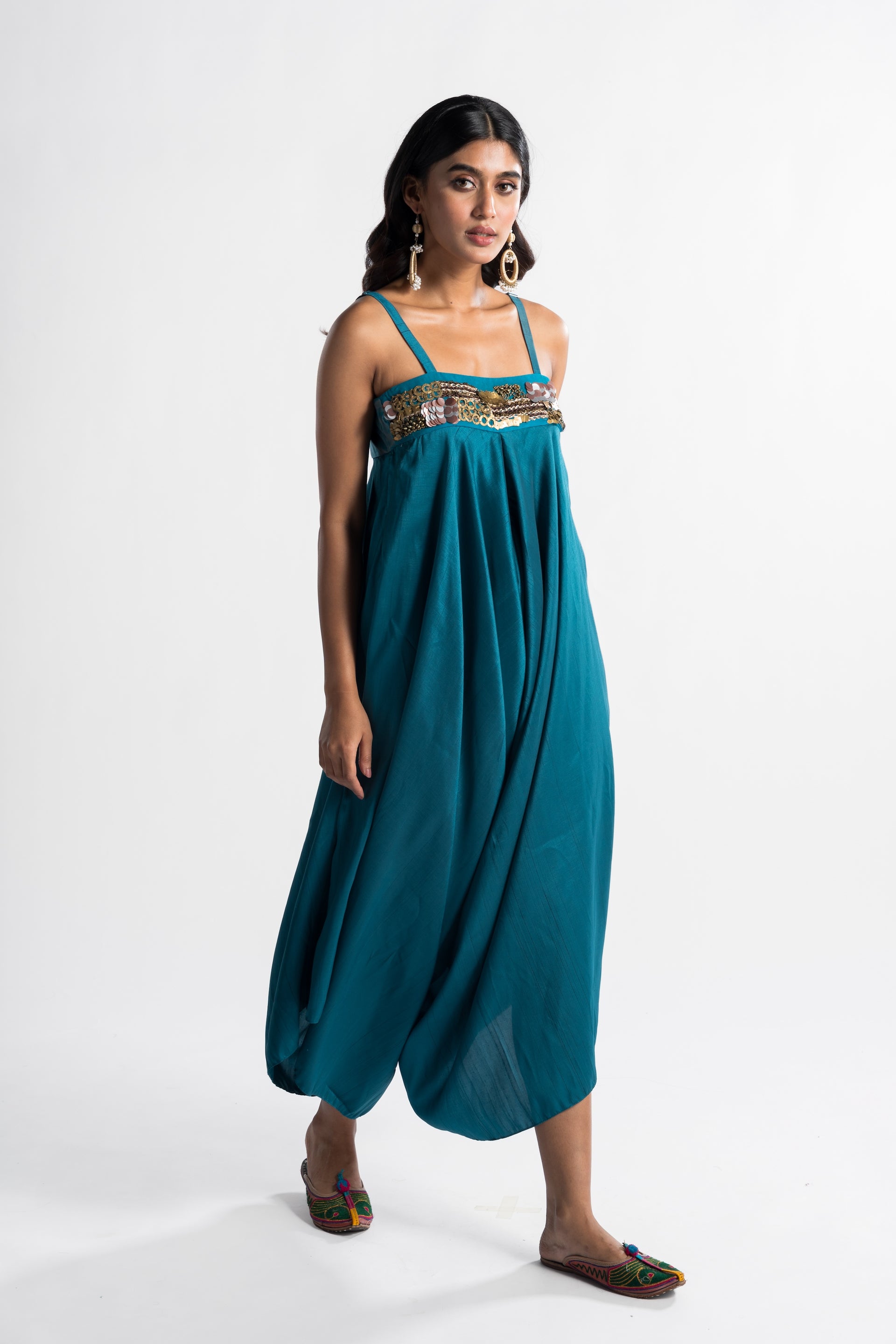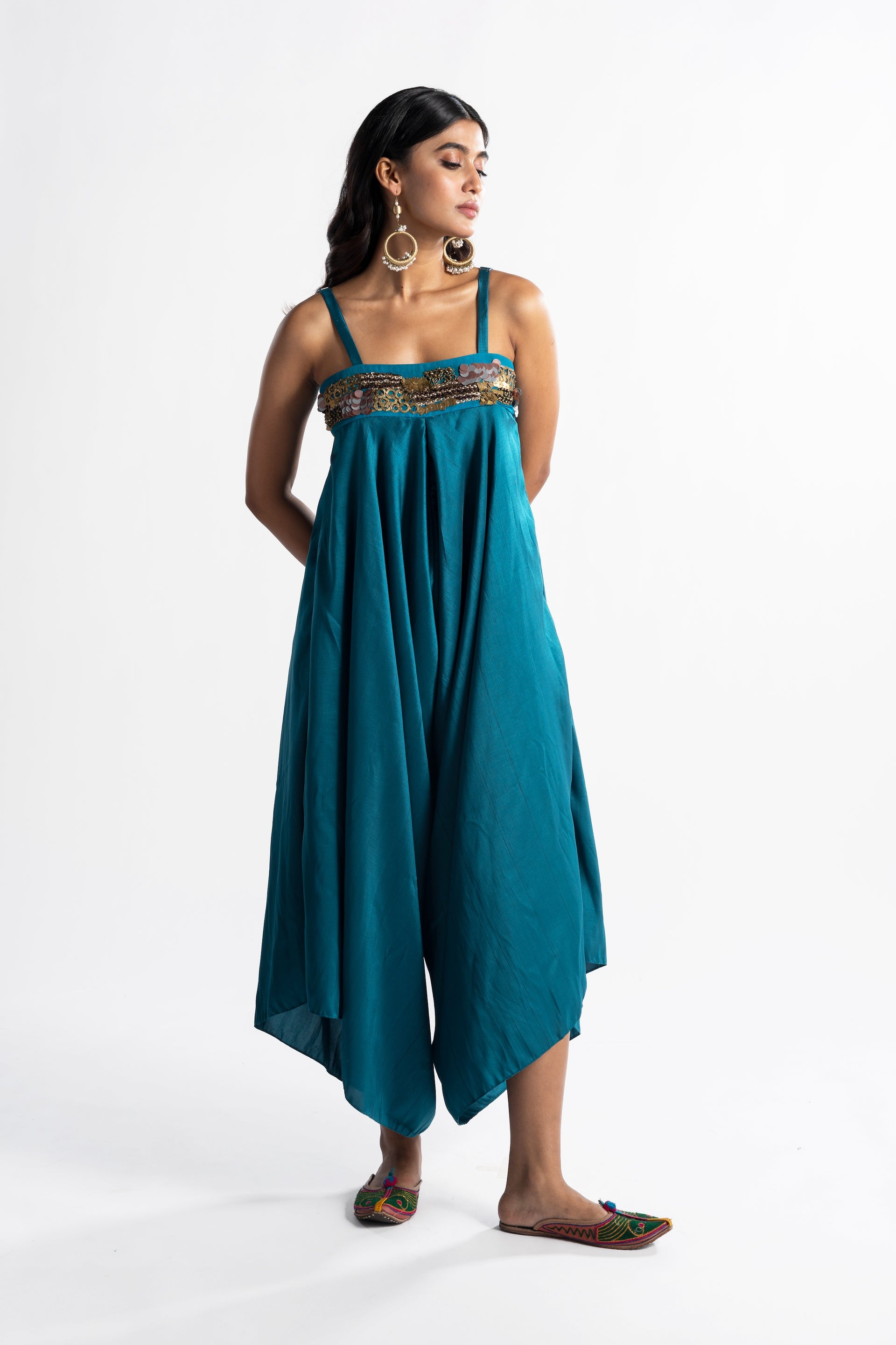 The Ezra Sea Green Jumpsuit features a luxurious silk fabric with a comfortable, easygoing silhouette and a draped design. The beaded neckline adds a refined detail, while the vibrant turquoise hue enhances its bohemian charm.