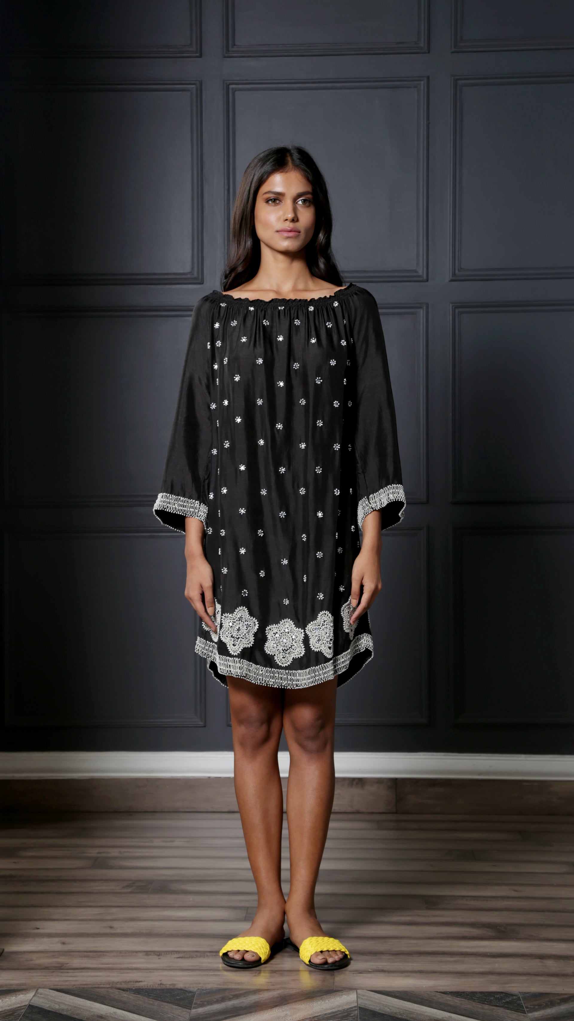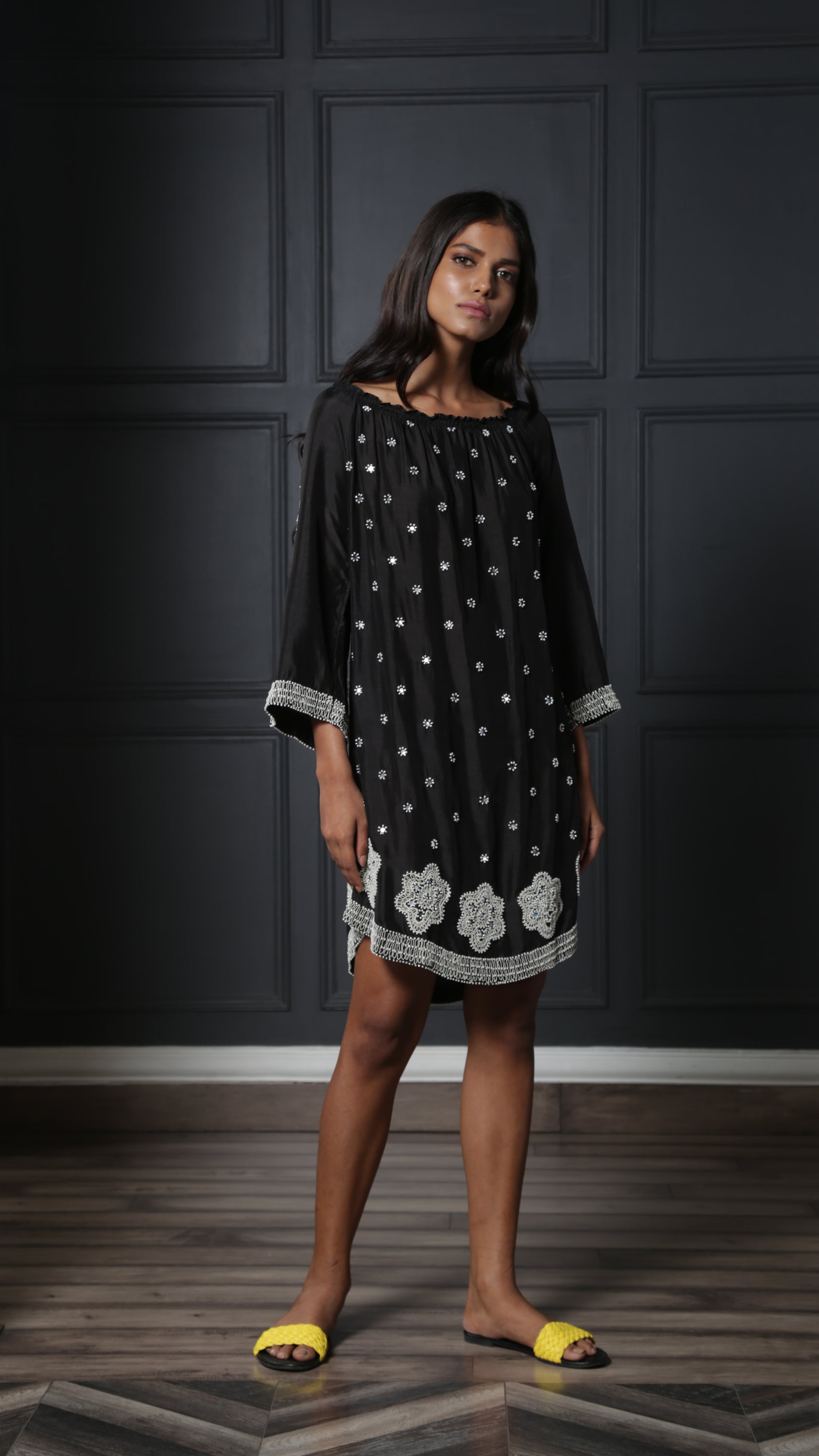 Black off-shoulder dress featuring crochet and mirror work embroidery. A beautiful dress that gives you romantic 60s look and is a perfect pick for your beach party.