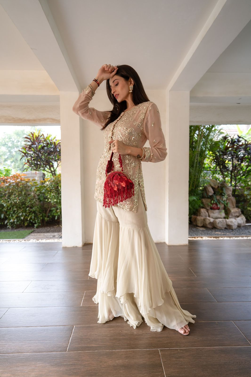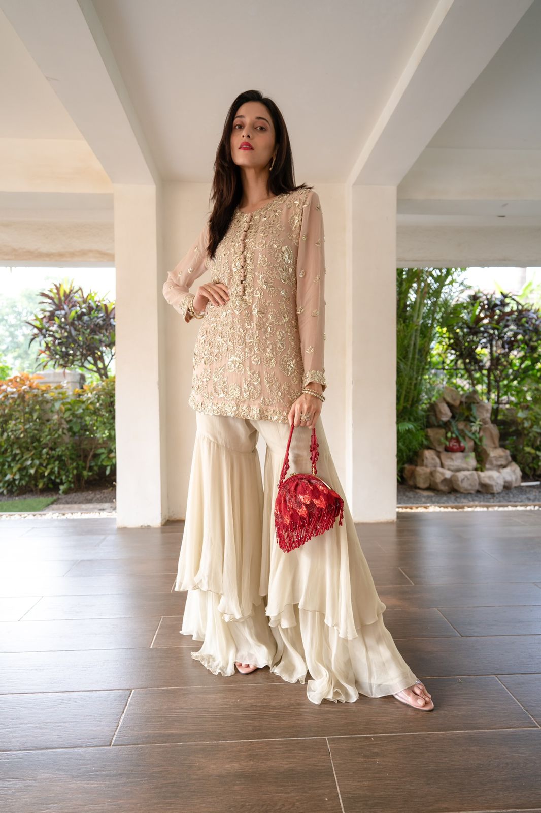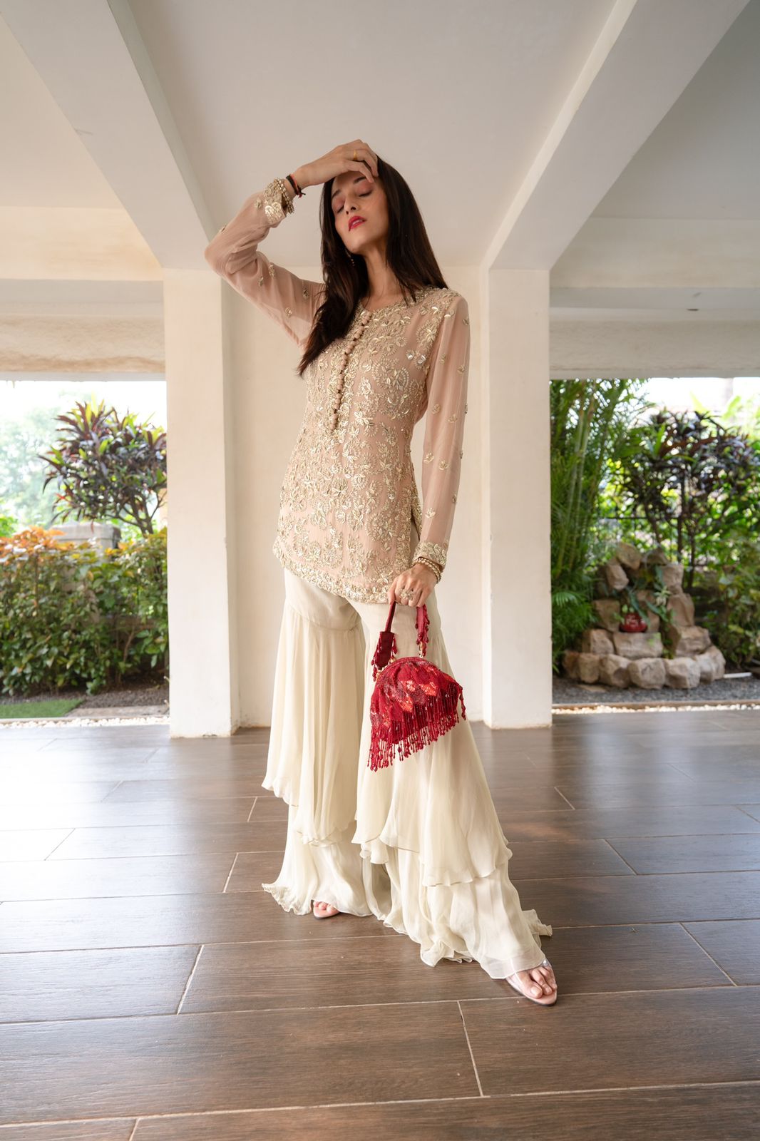 Revamp your wardrobe with something chique and trendy. This beautiful set is crafted with a sequin embroidered nude pink kurta in silk chiffon, paired with layered sharara in beige color.