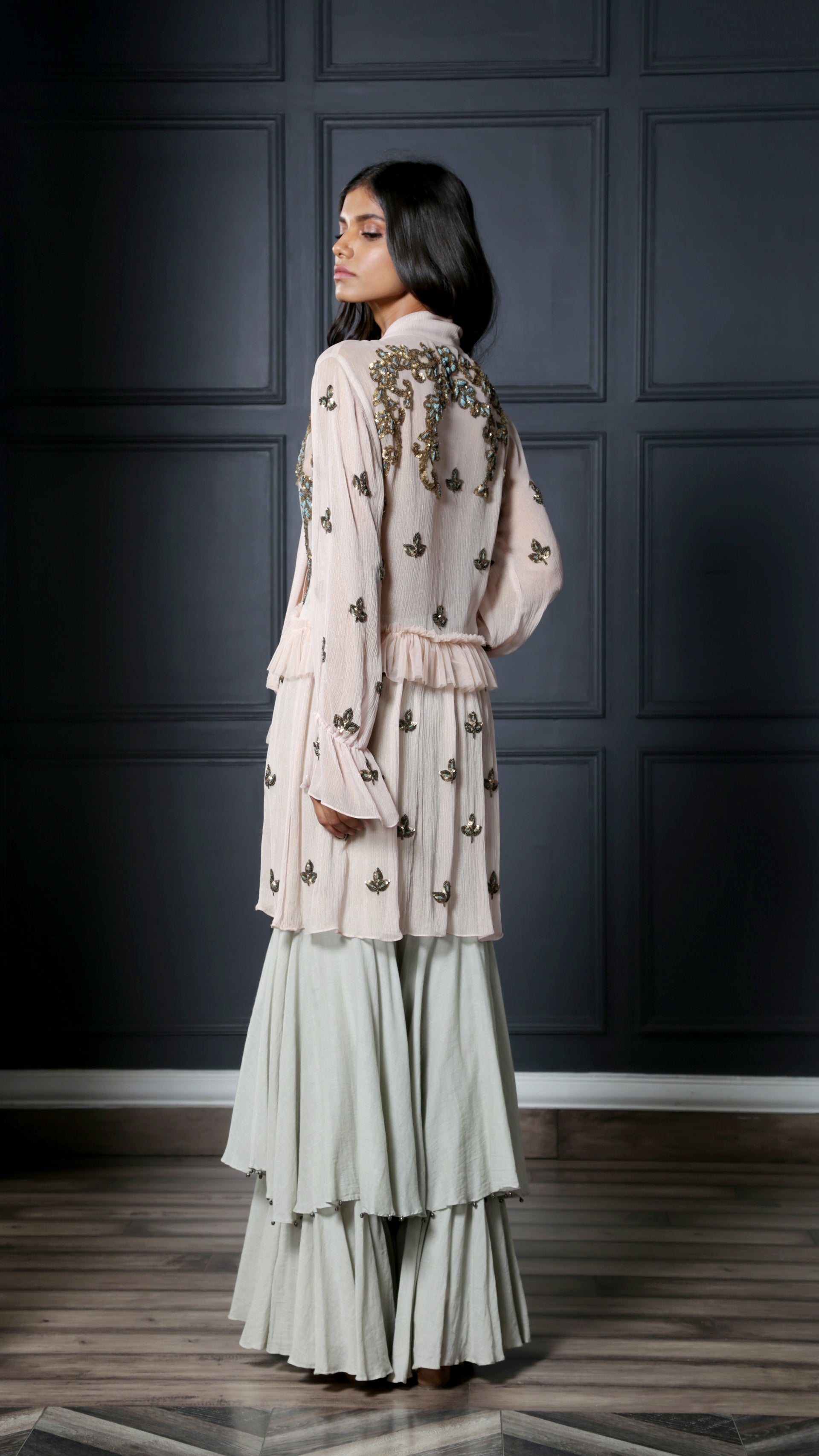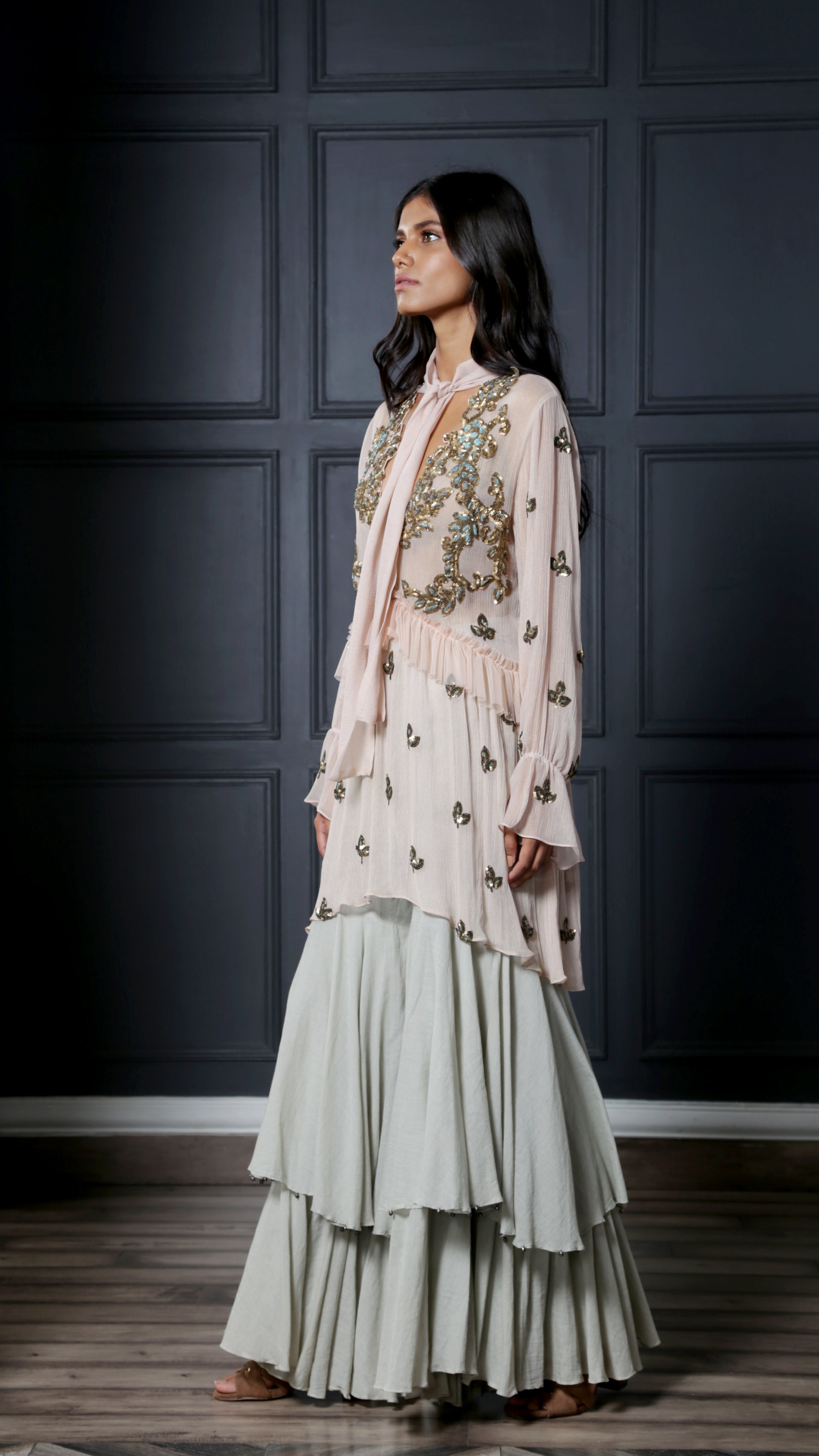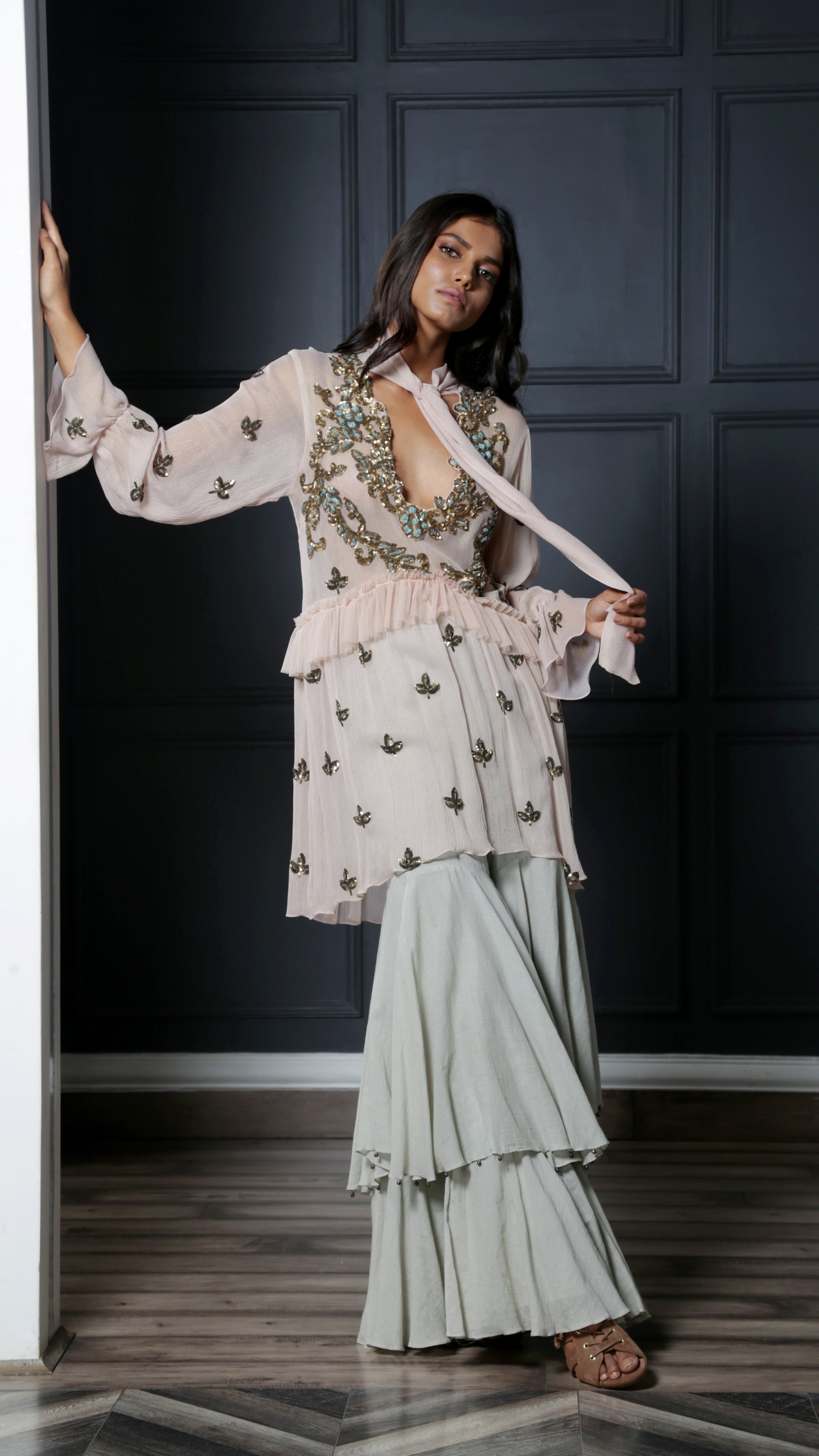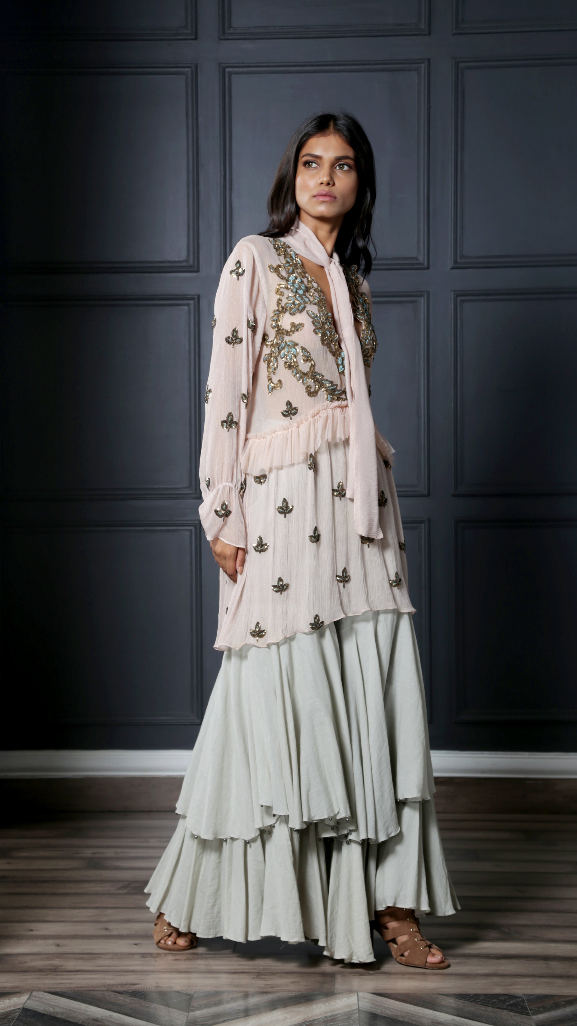 Blush tunic dress featuring an attached neck scarf intricately embroidered with gold and blue sequins and thread work ; paired with mint layered sharara pants to complete the look.