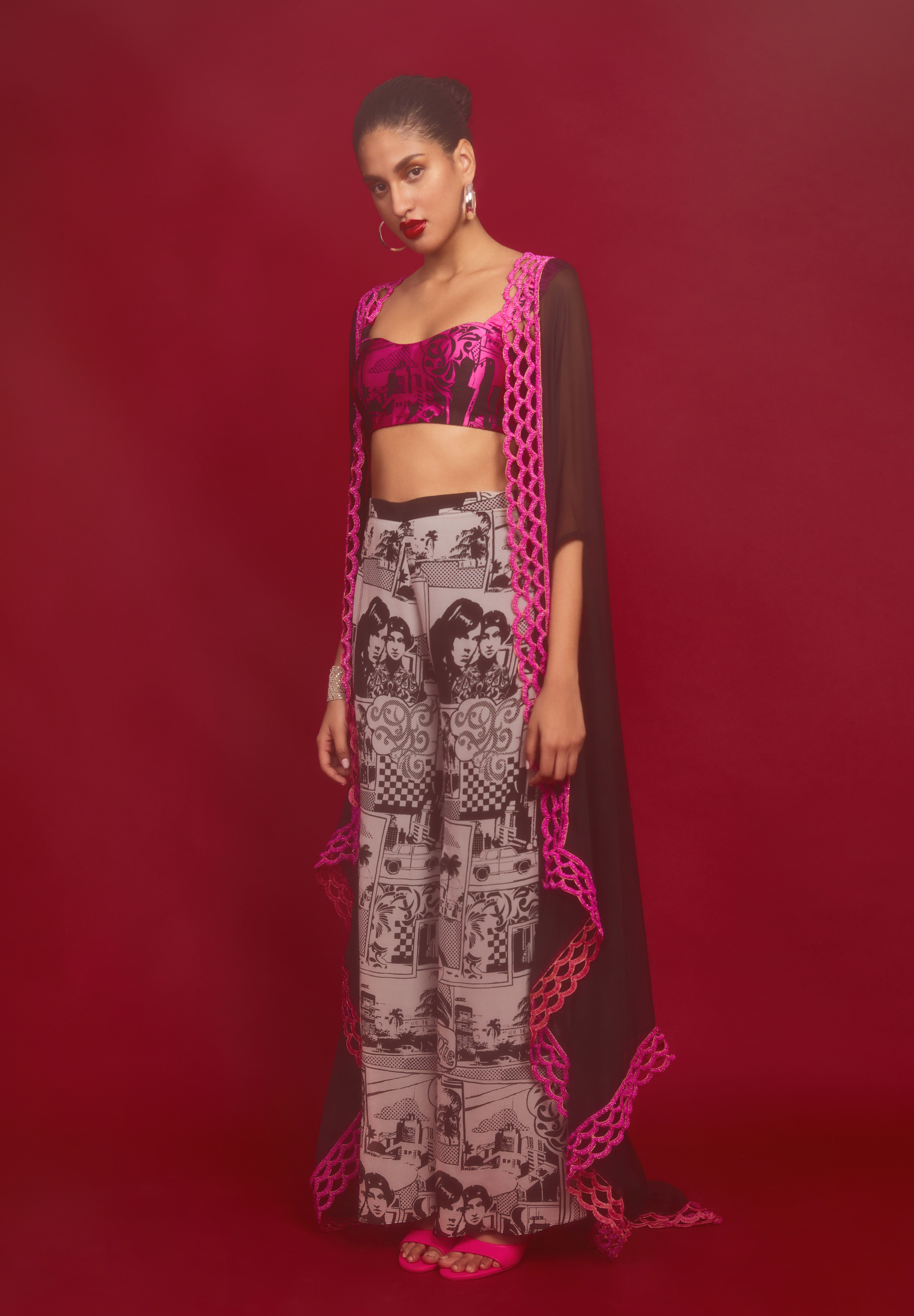 This look features our comic strip printed cropped blouse & printed pants paired with an embellished black cape with a contrasting pink scalloped edge detailing. It is crafted in pure georgette & chiffon.