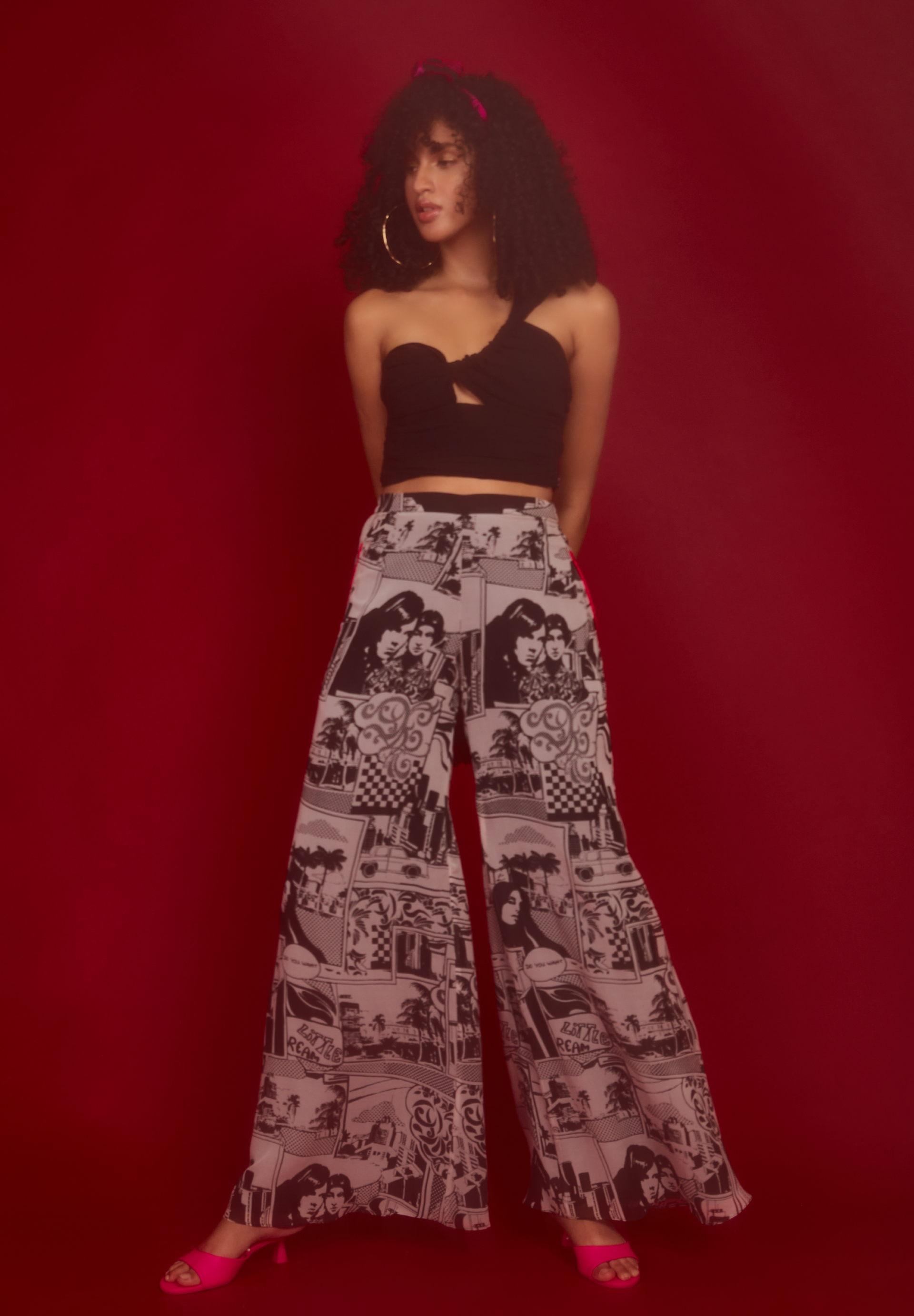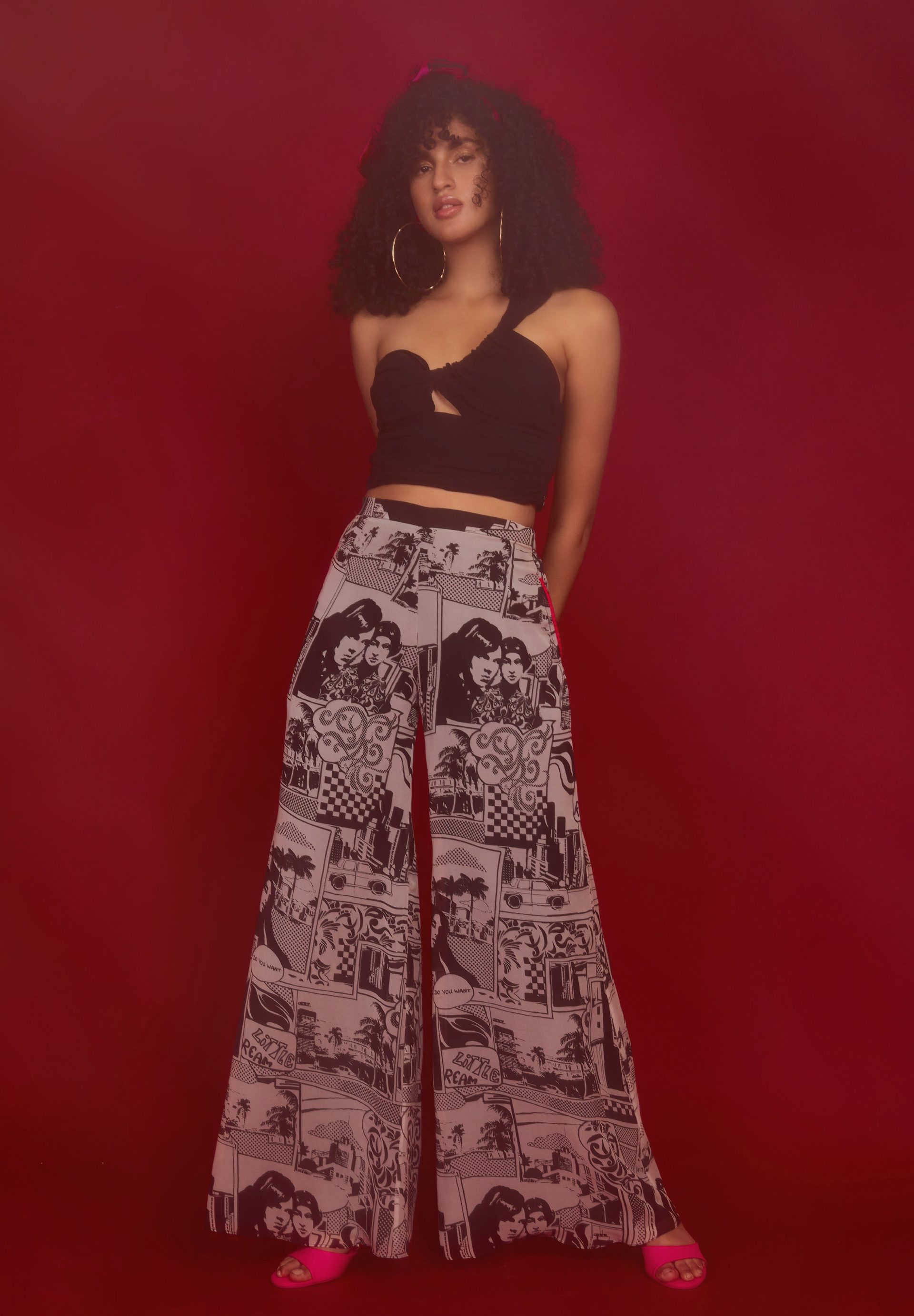 This look features a comic strip printed pants and a one shoulder top. Made from georgette & chiffon, this one is a perfect pick for a night out in funky style!