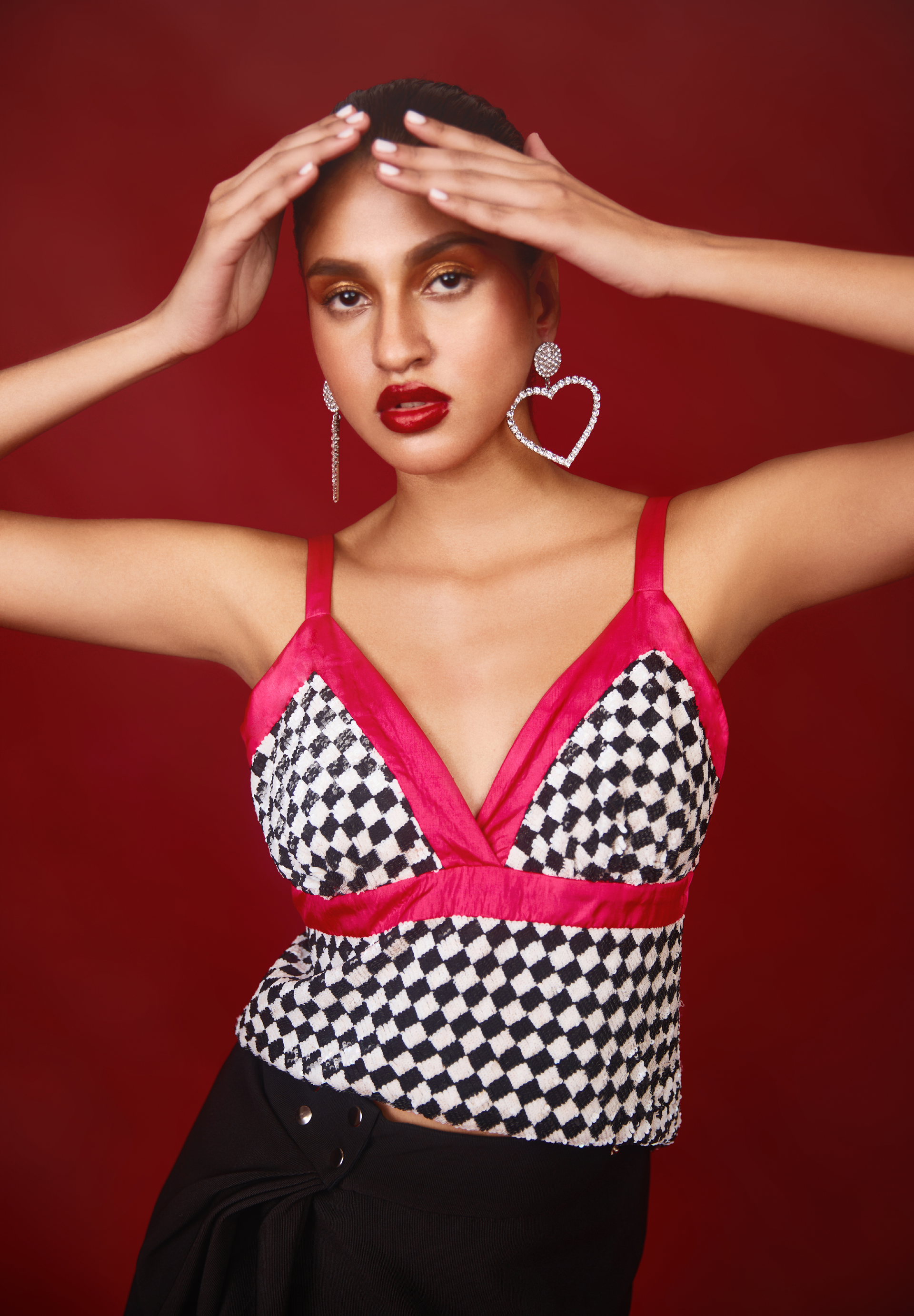 Dazzle in our checkerboard embroidered top paired with a drape skirt. The top is decked with sequin embellishments and is paired with side slit black skirt.