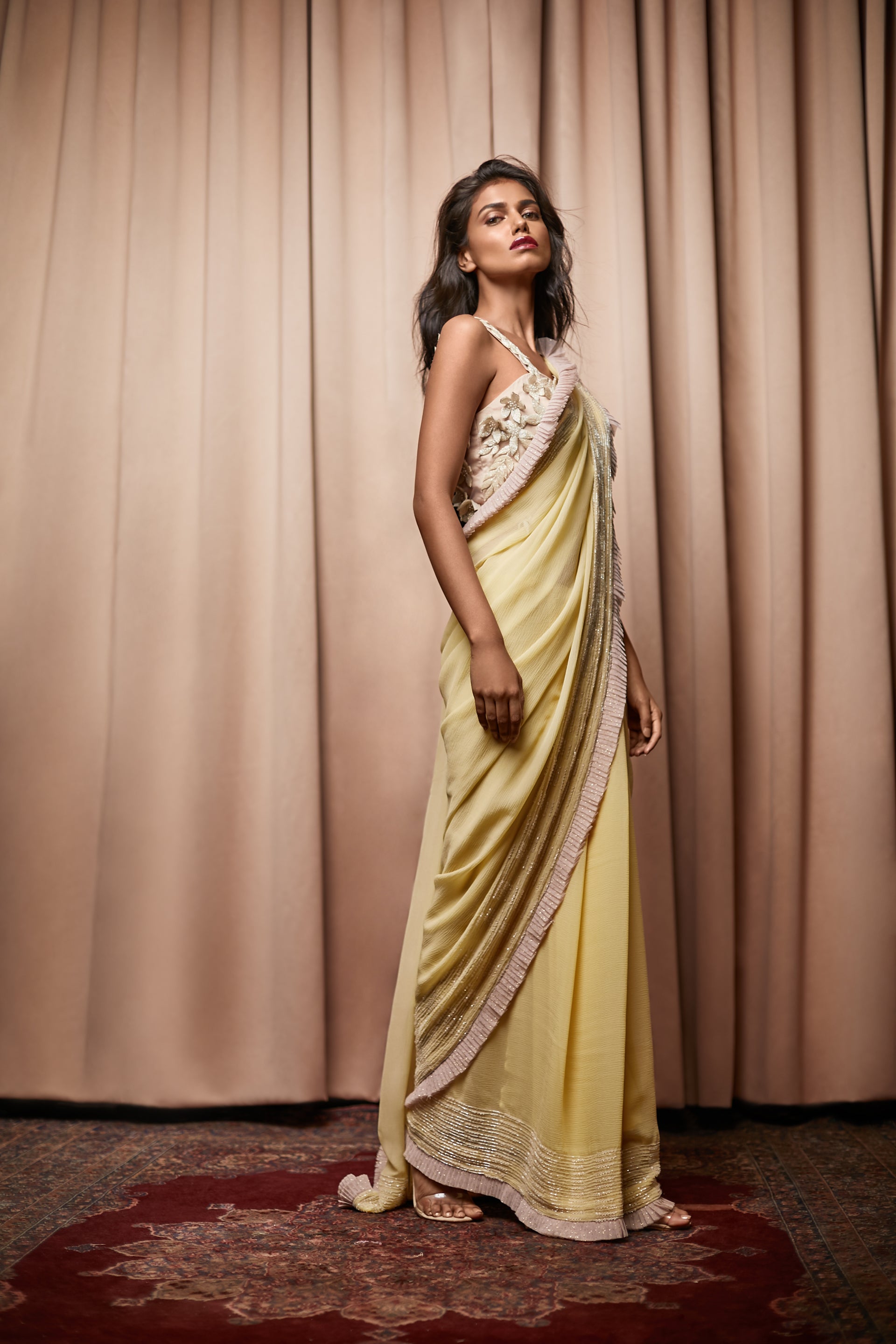 Colour : Saree - Lemon ; Blouse - Powder Pink & Ivory