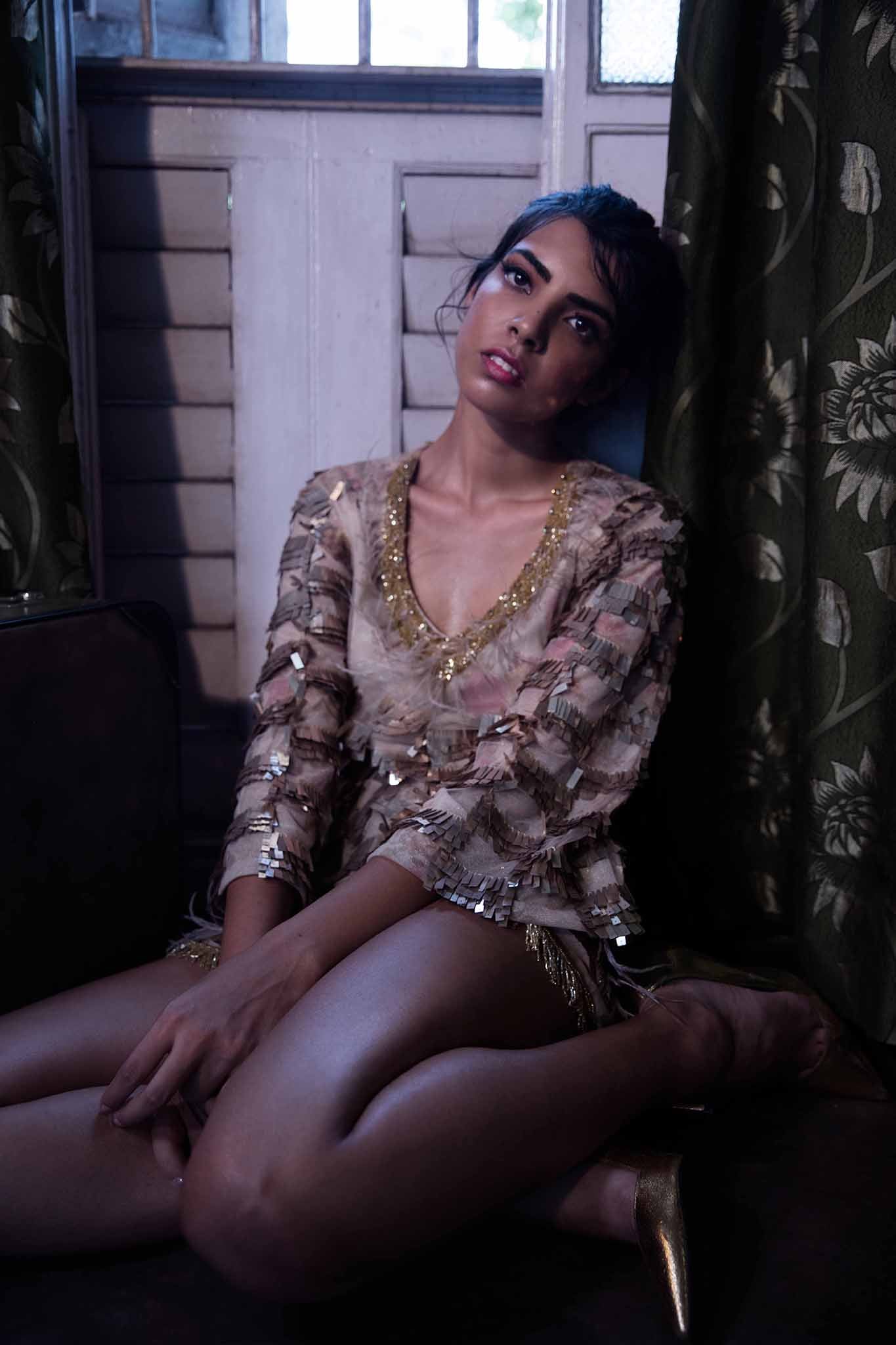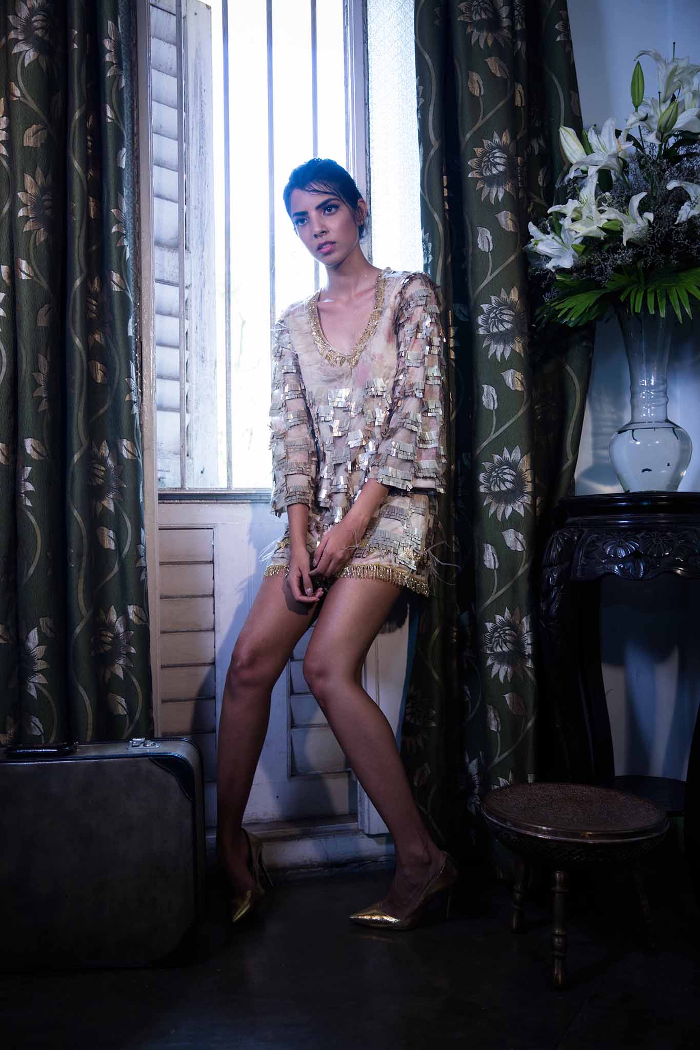 Sequins shift dress featuring gold embroidery, feather detailing on the neck and flared sleeves. A perfect pick for your night out that can also be paired with palazzo pants for an ethnic look.