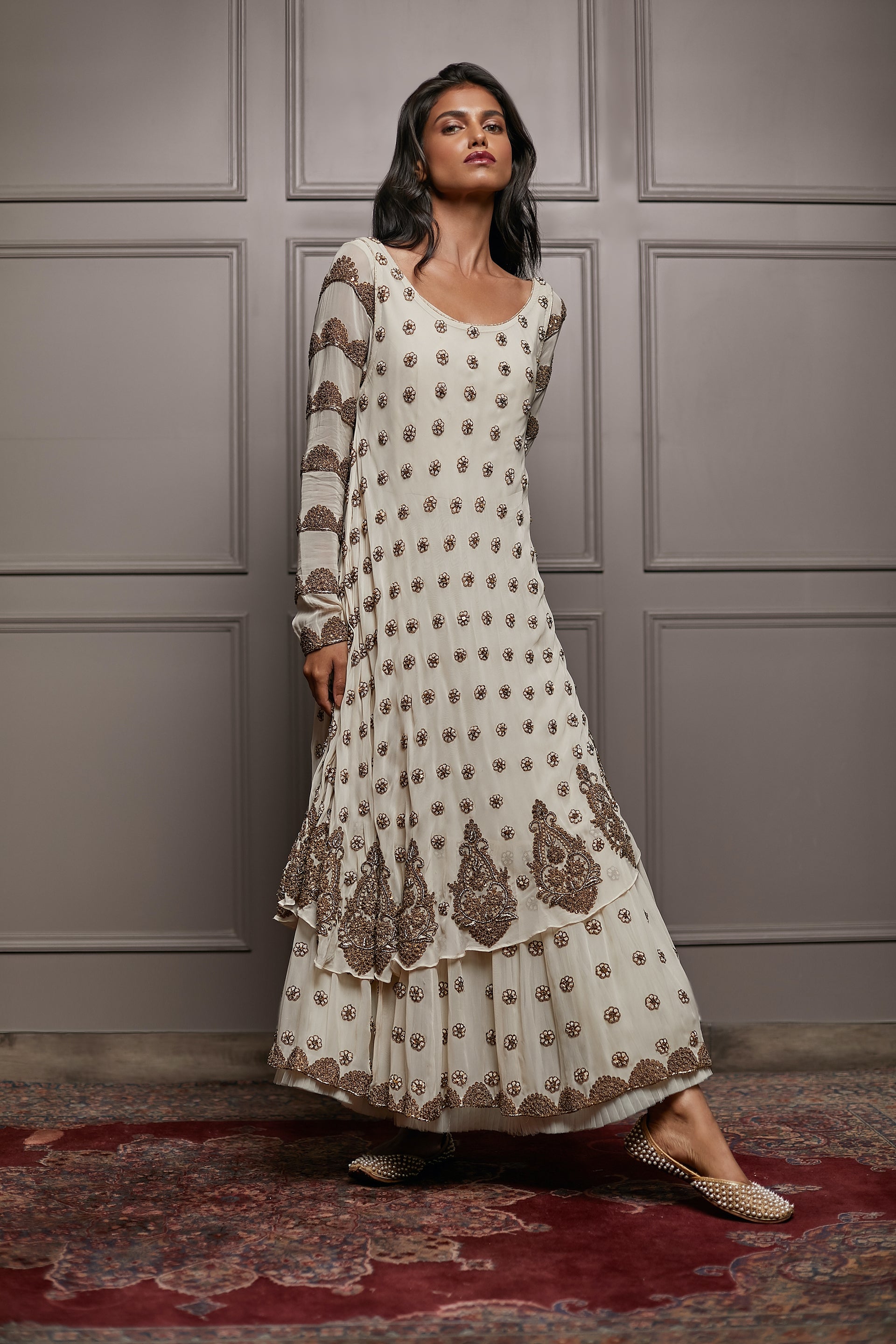 Ivory and antique gold layered kurta with vintage embroidery in antique gold cropped at the ankle. An understated yet edgy look that's perfect for the day and evening functions!