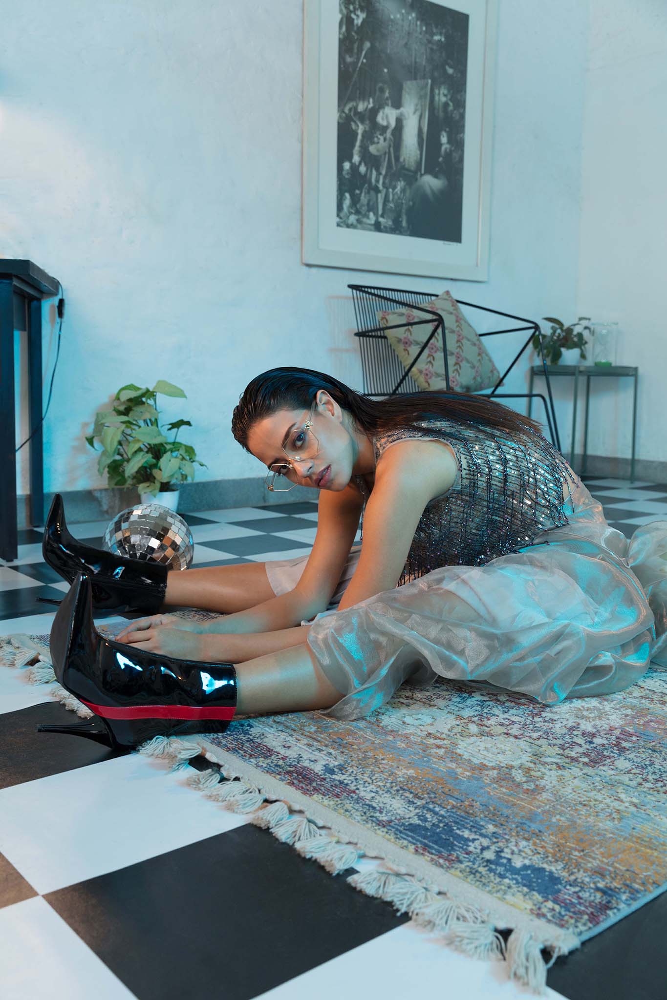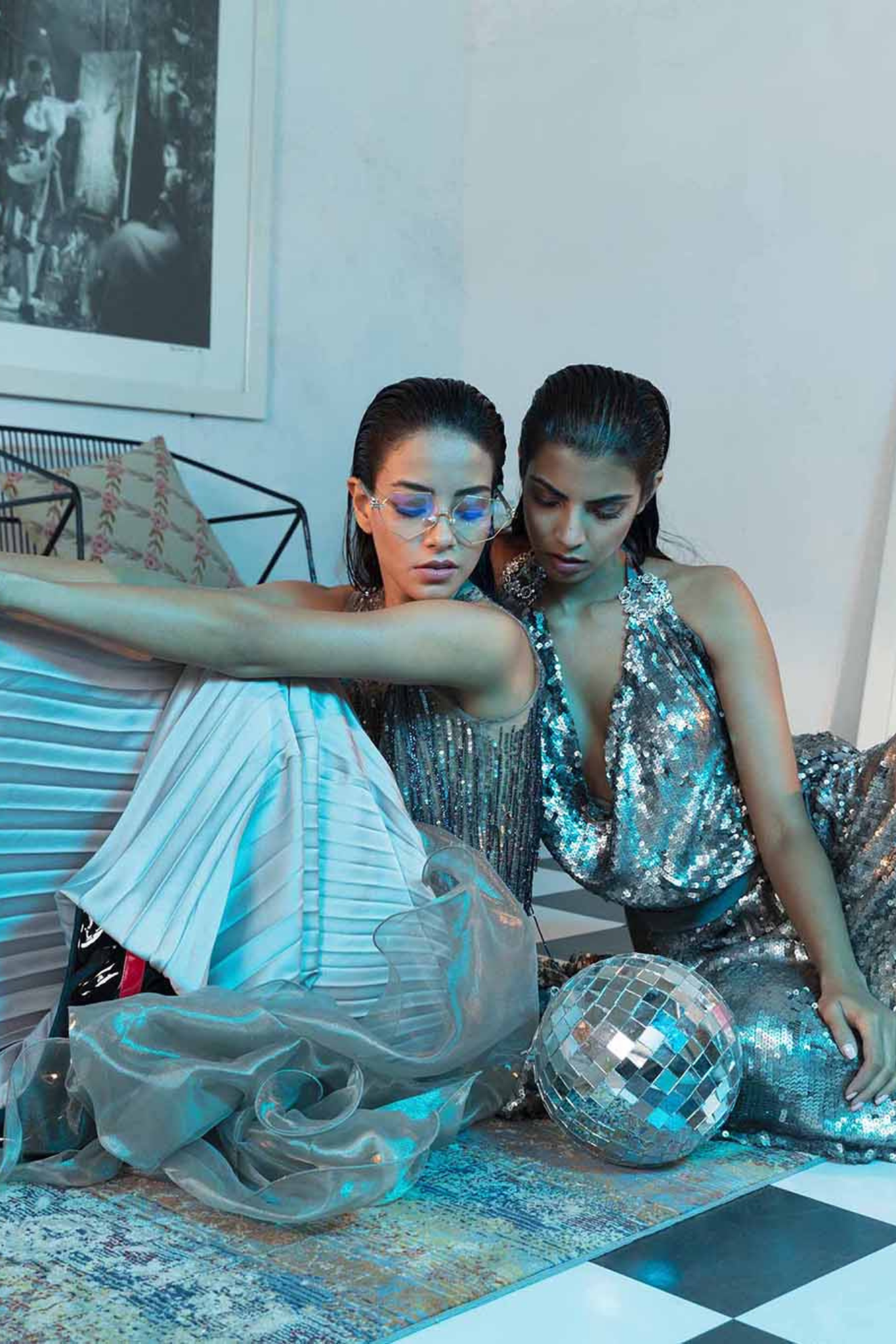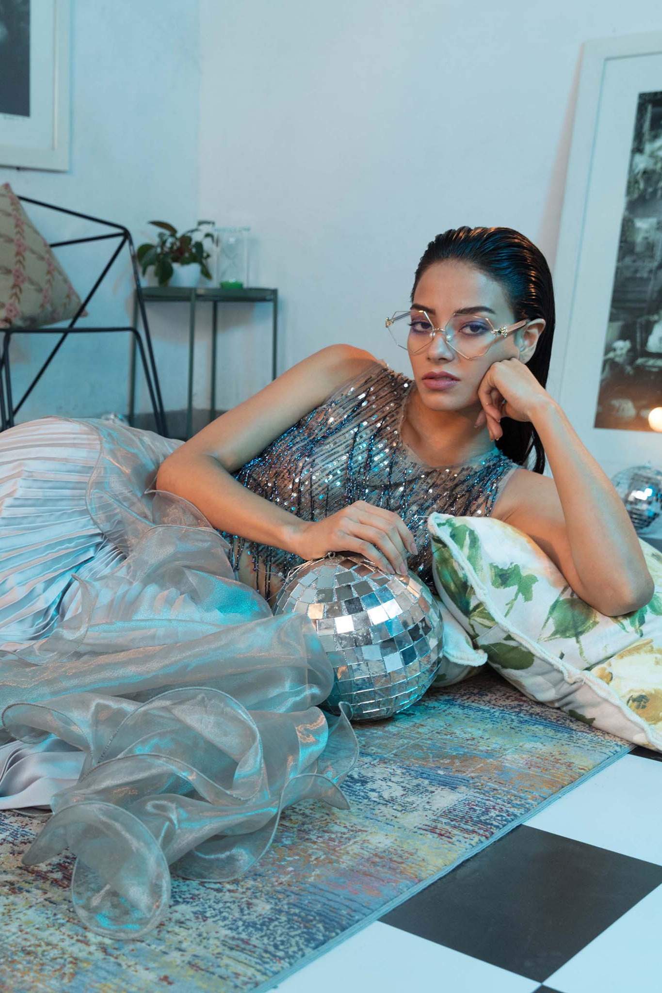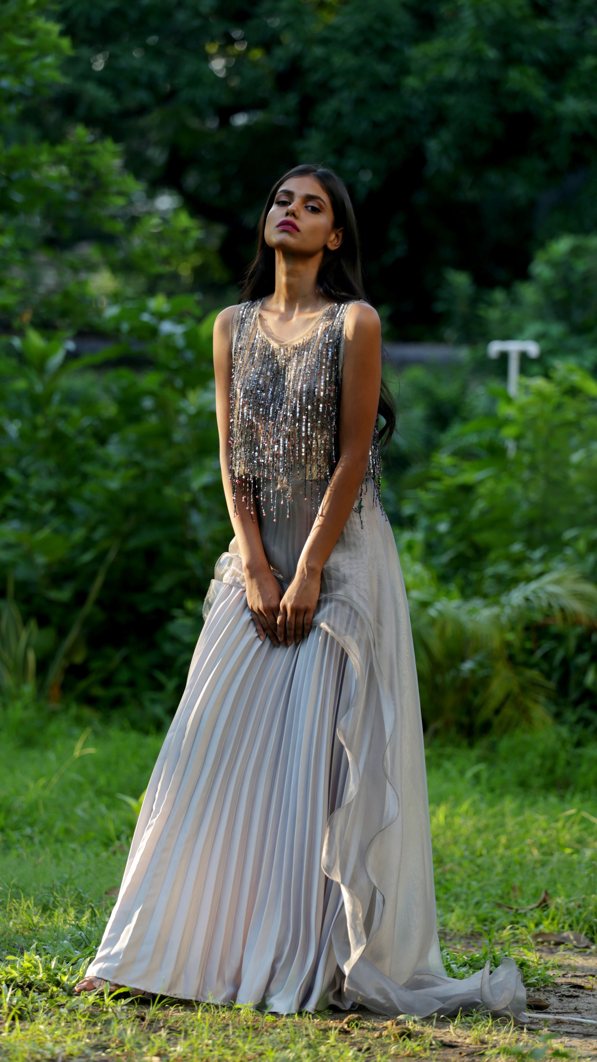 Tassel top in tulle paired with a pre-pleated silk skirt and a double layered detachable overlay in organza. Bring out the shine in you with this look for an engagement or cocktail party!