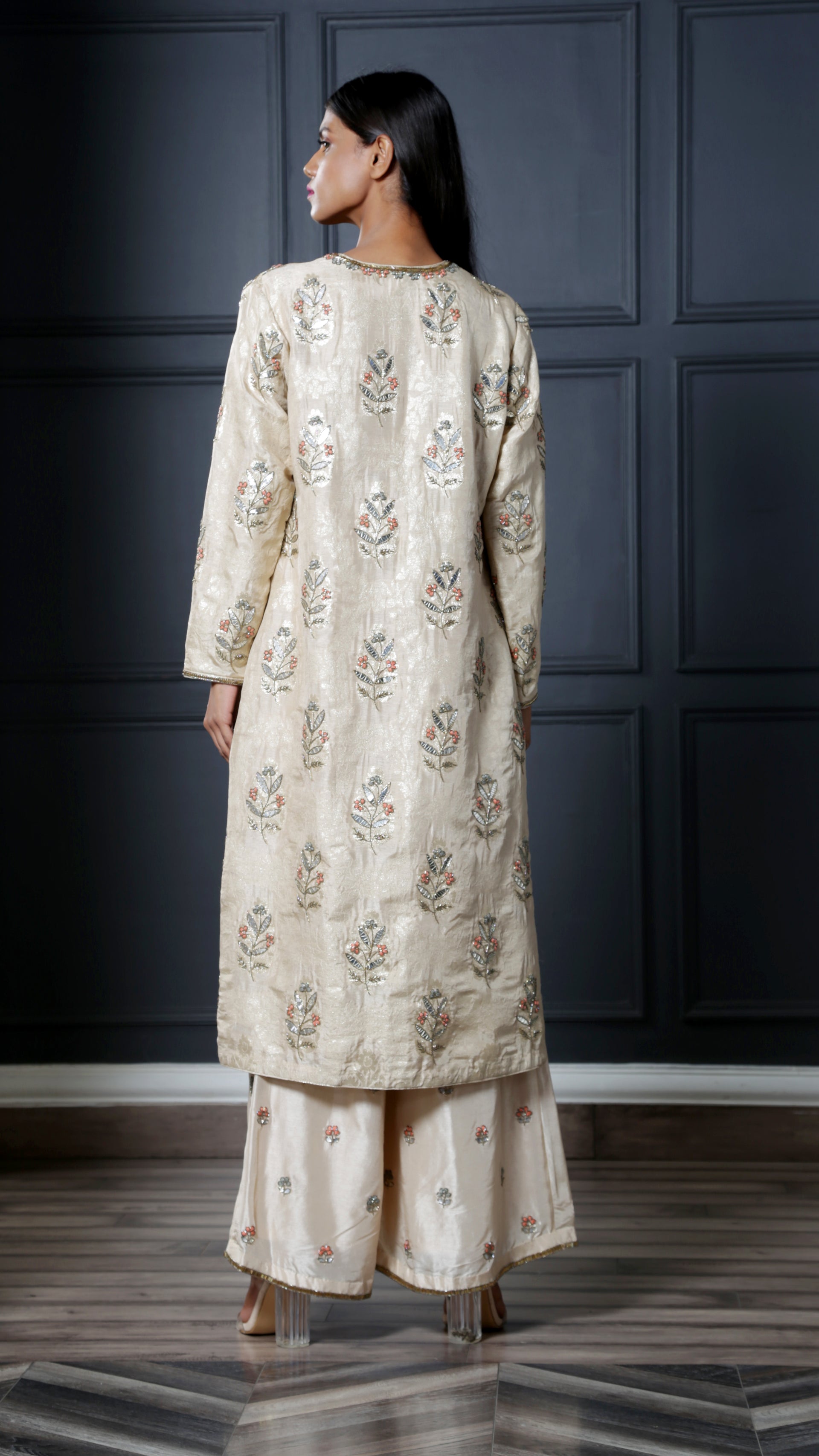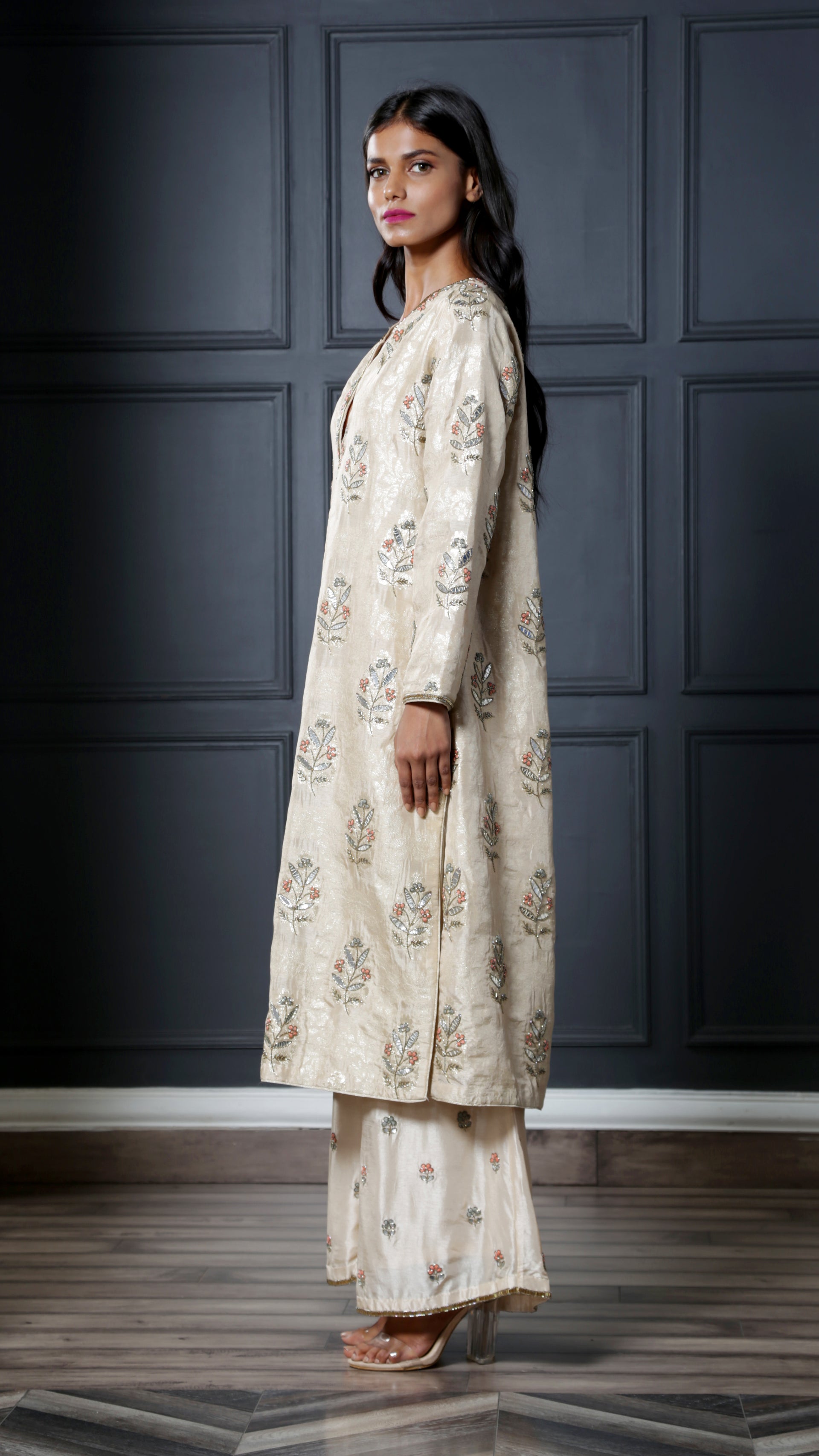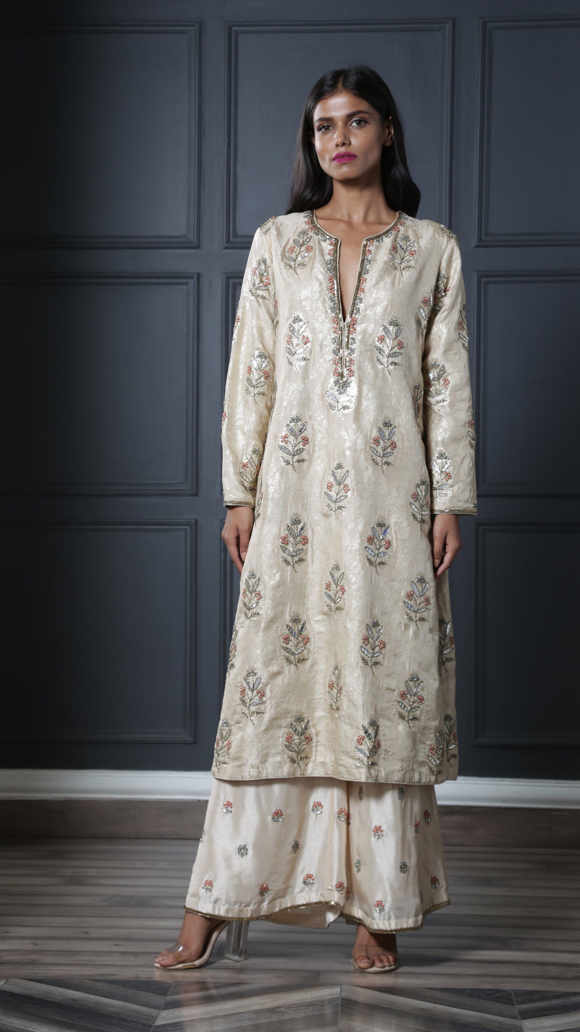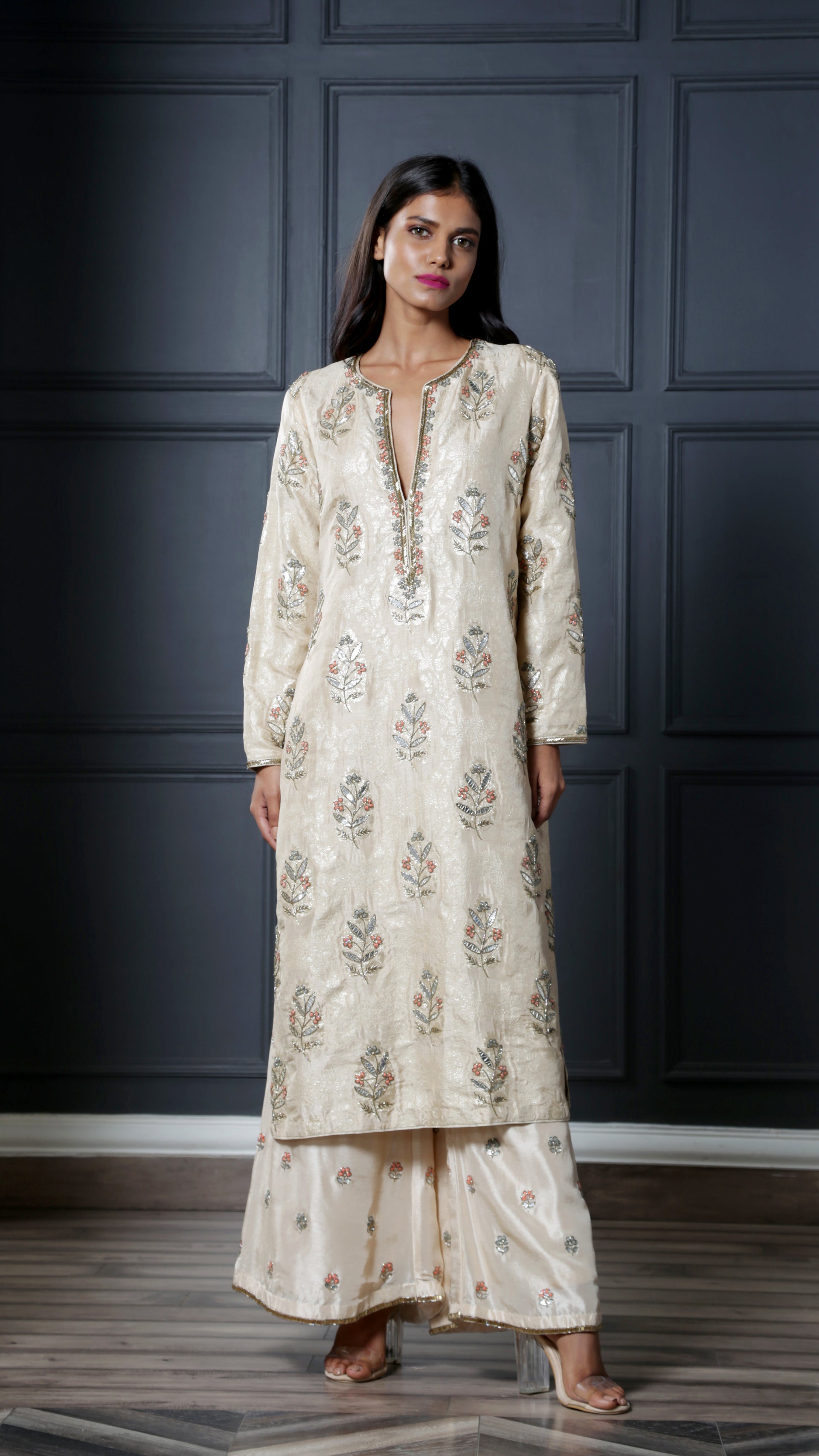 Ivory brocade classic kurta featuring a deep V neckline paired with embroidered palazzo pants. Understated and timeless, this look is a wardrobe staple!