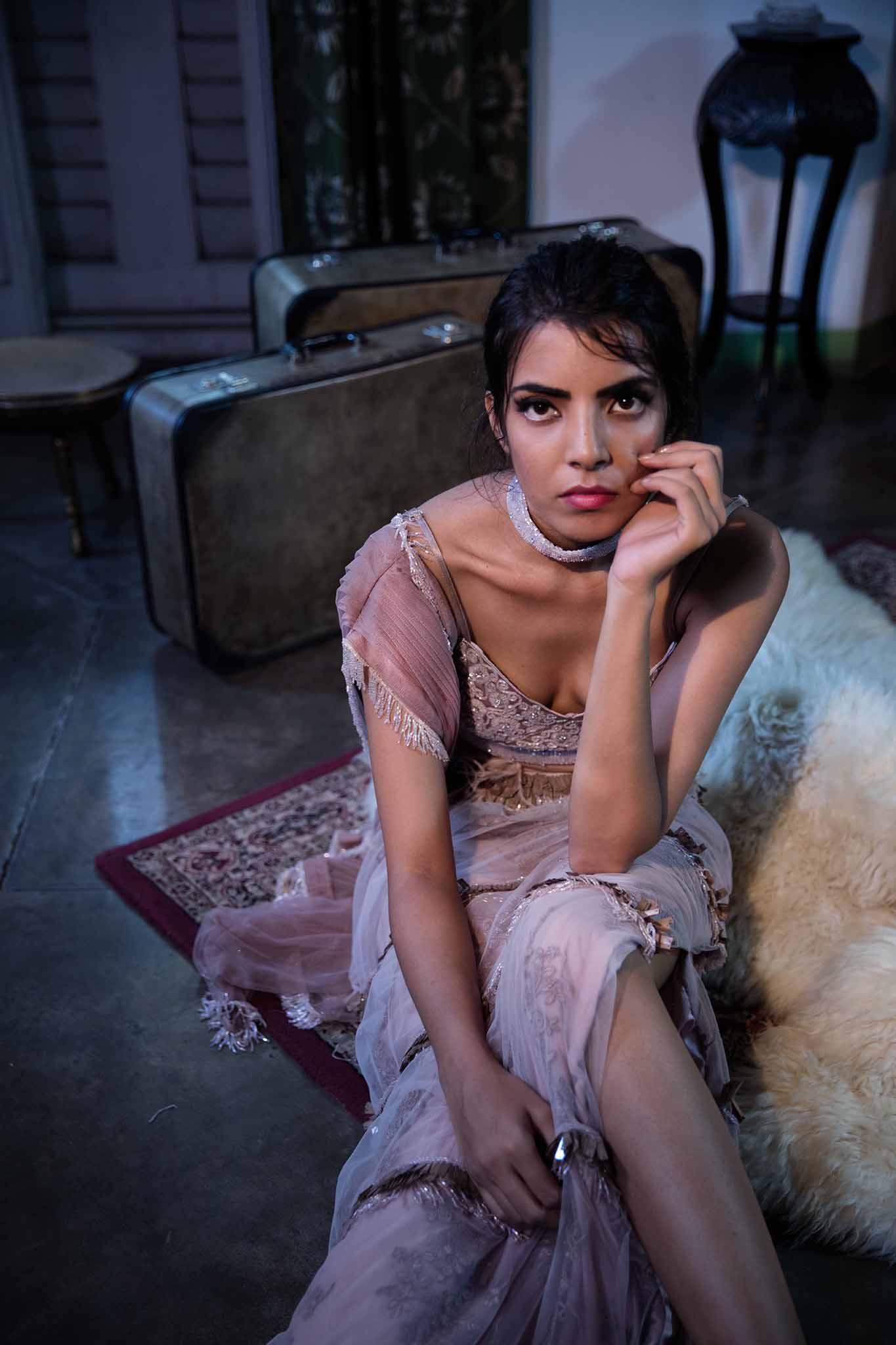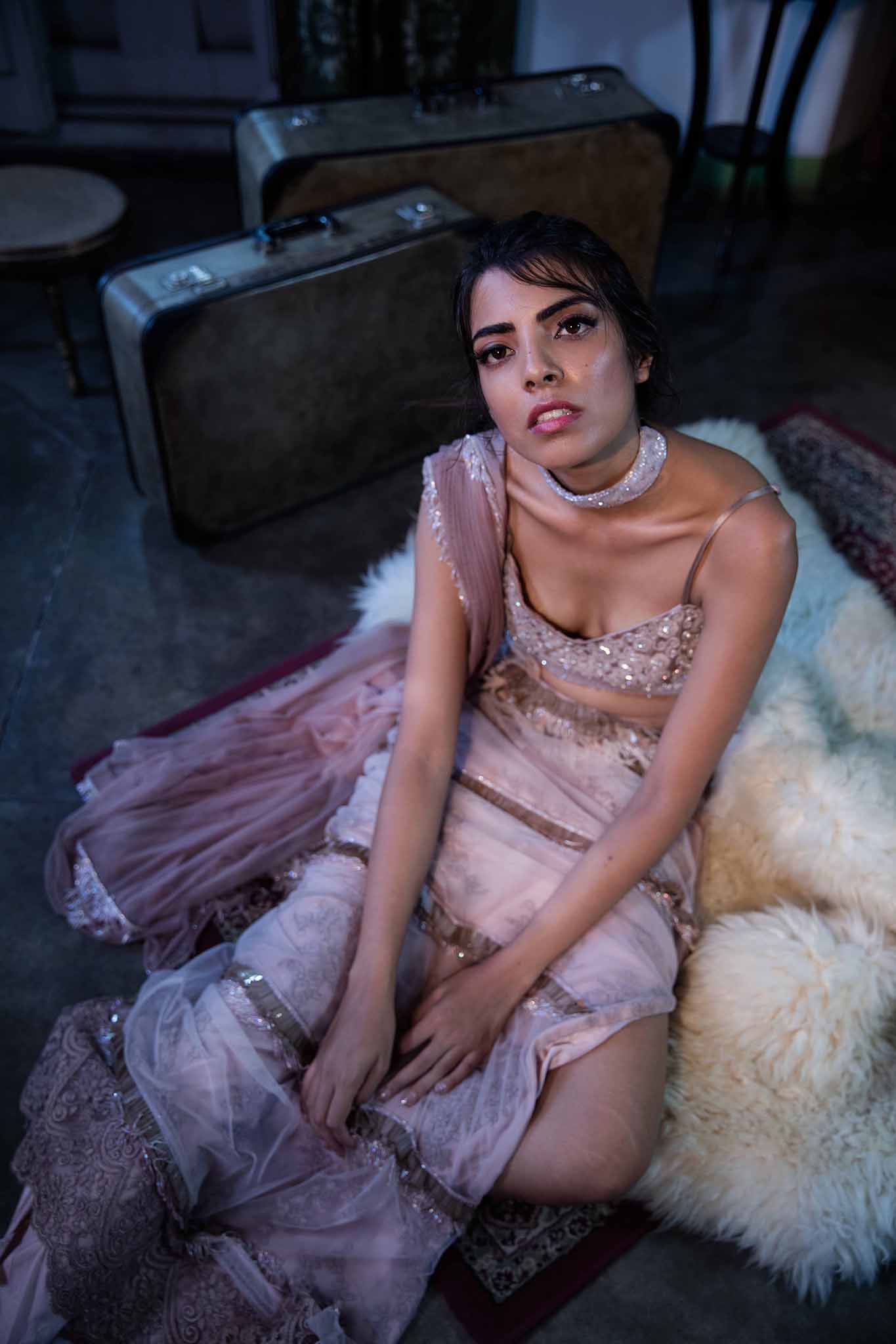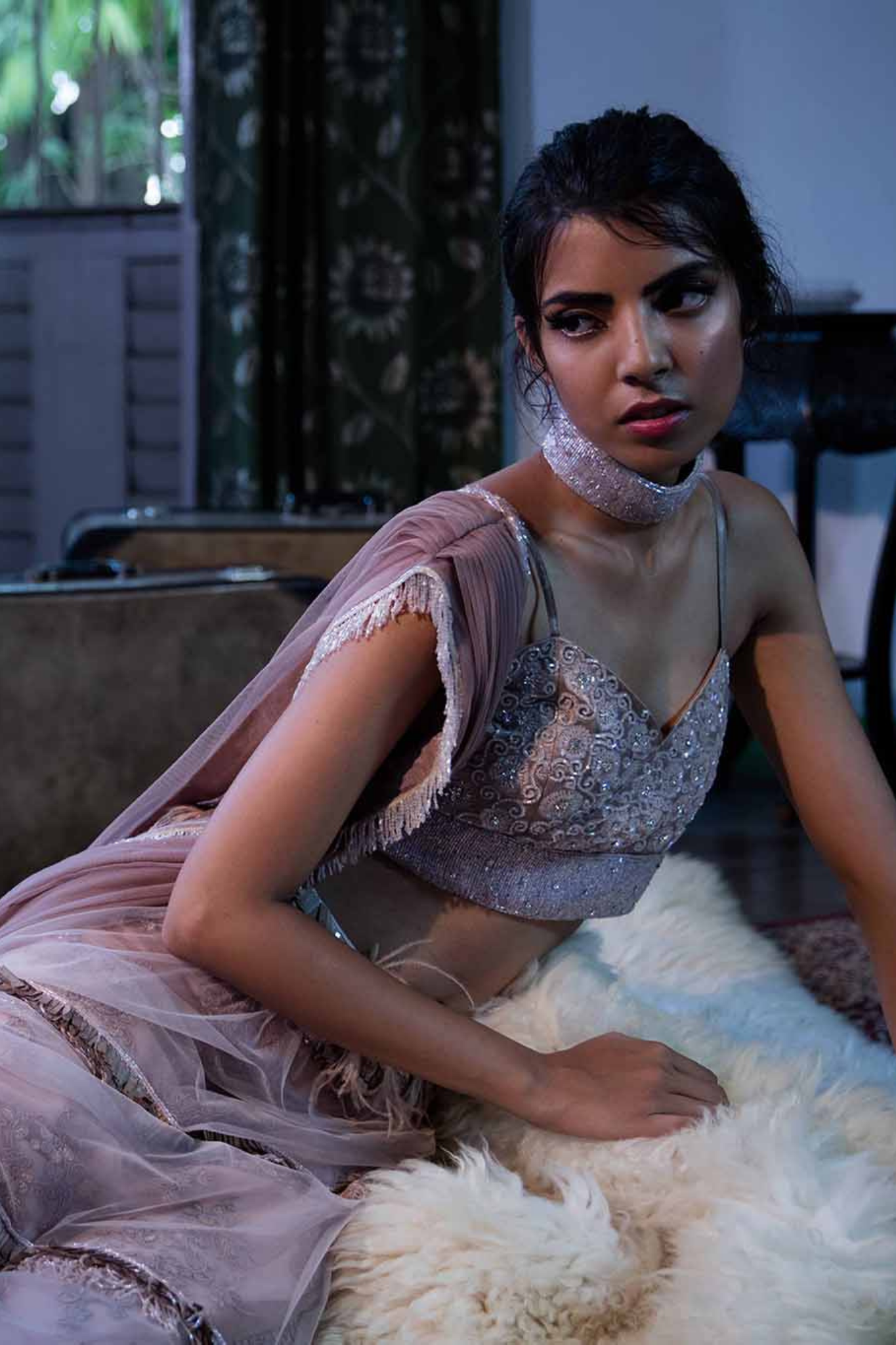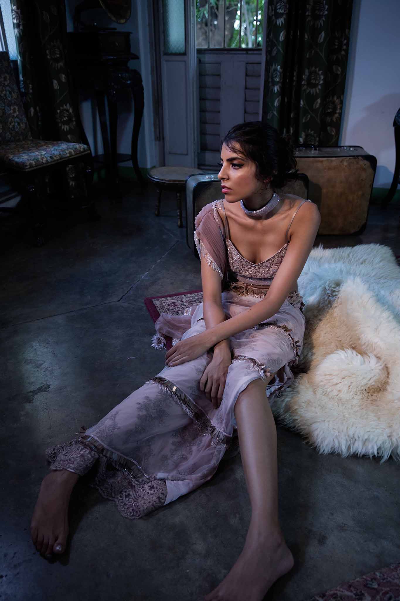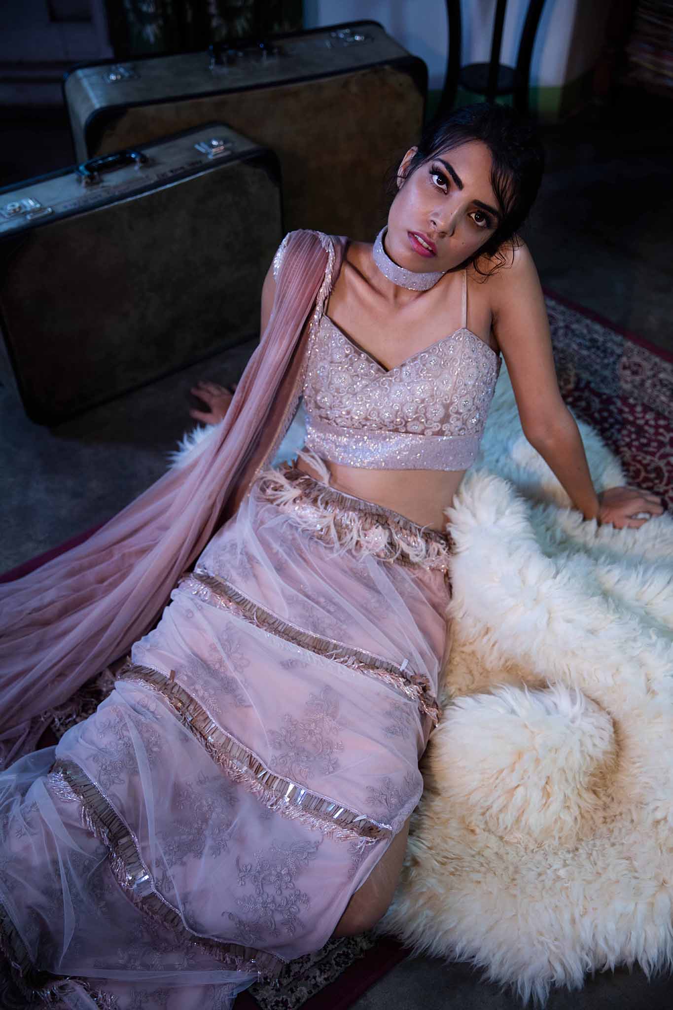 Dusty pink lace deconstructed 3 piece Mumtaz saree featuring a straight fit skirt, NT bralette and draped tulle dupatta. A look that's sure to transport you to another era except with an update!
