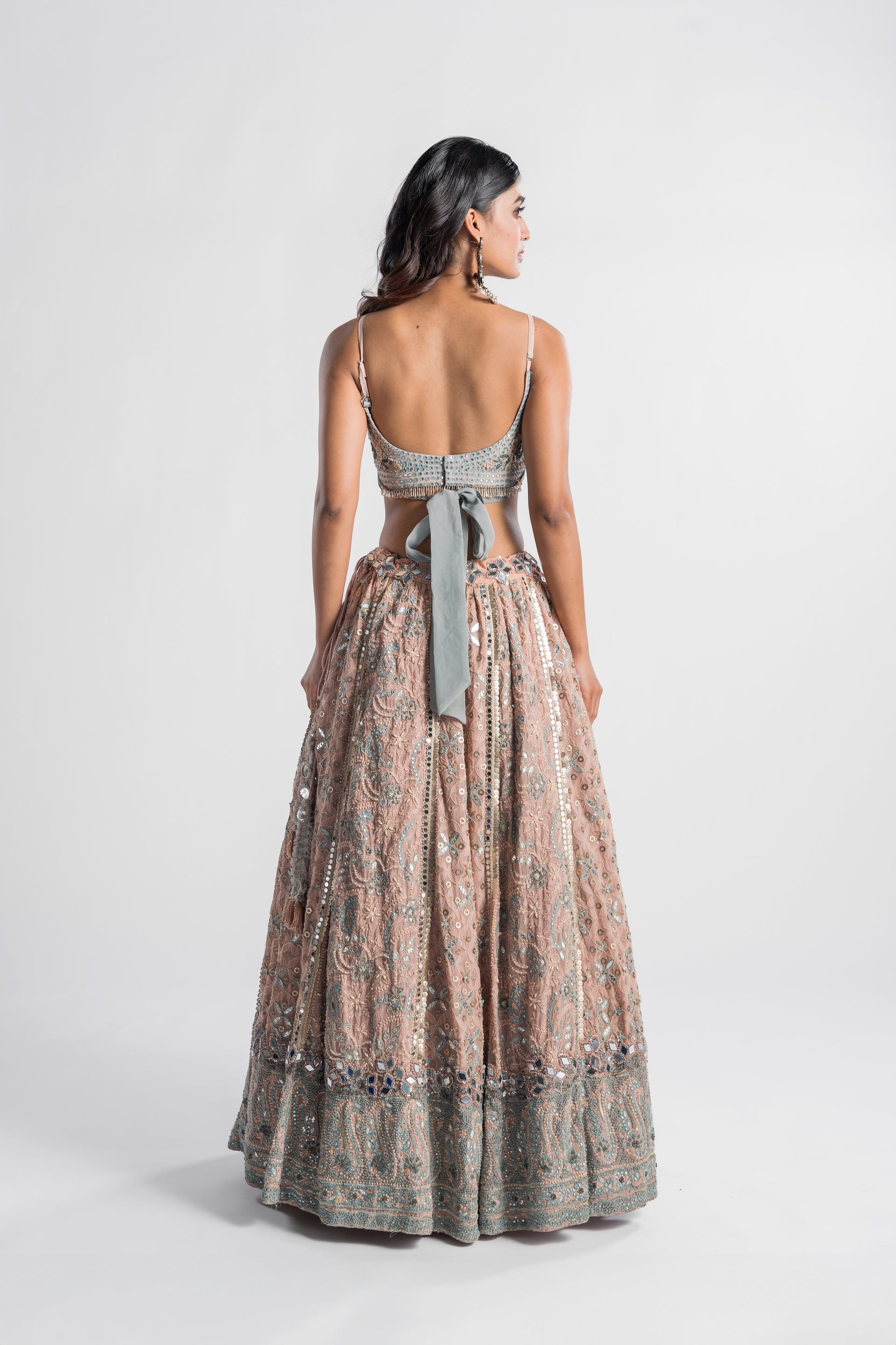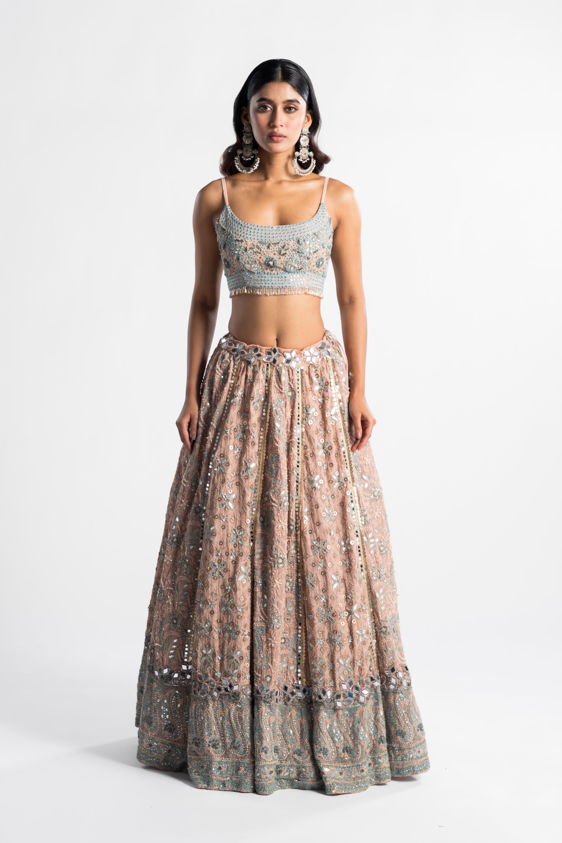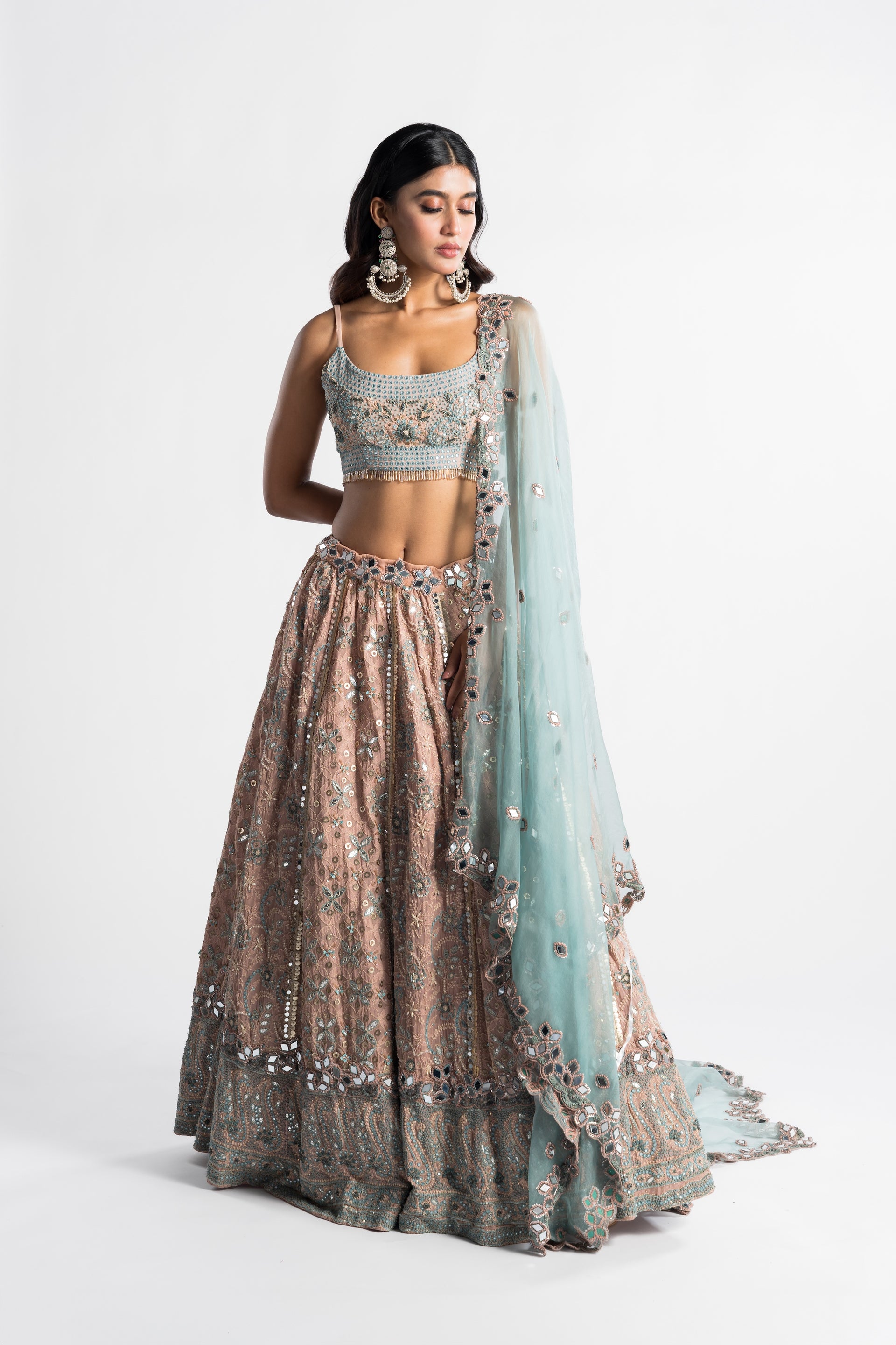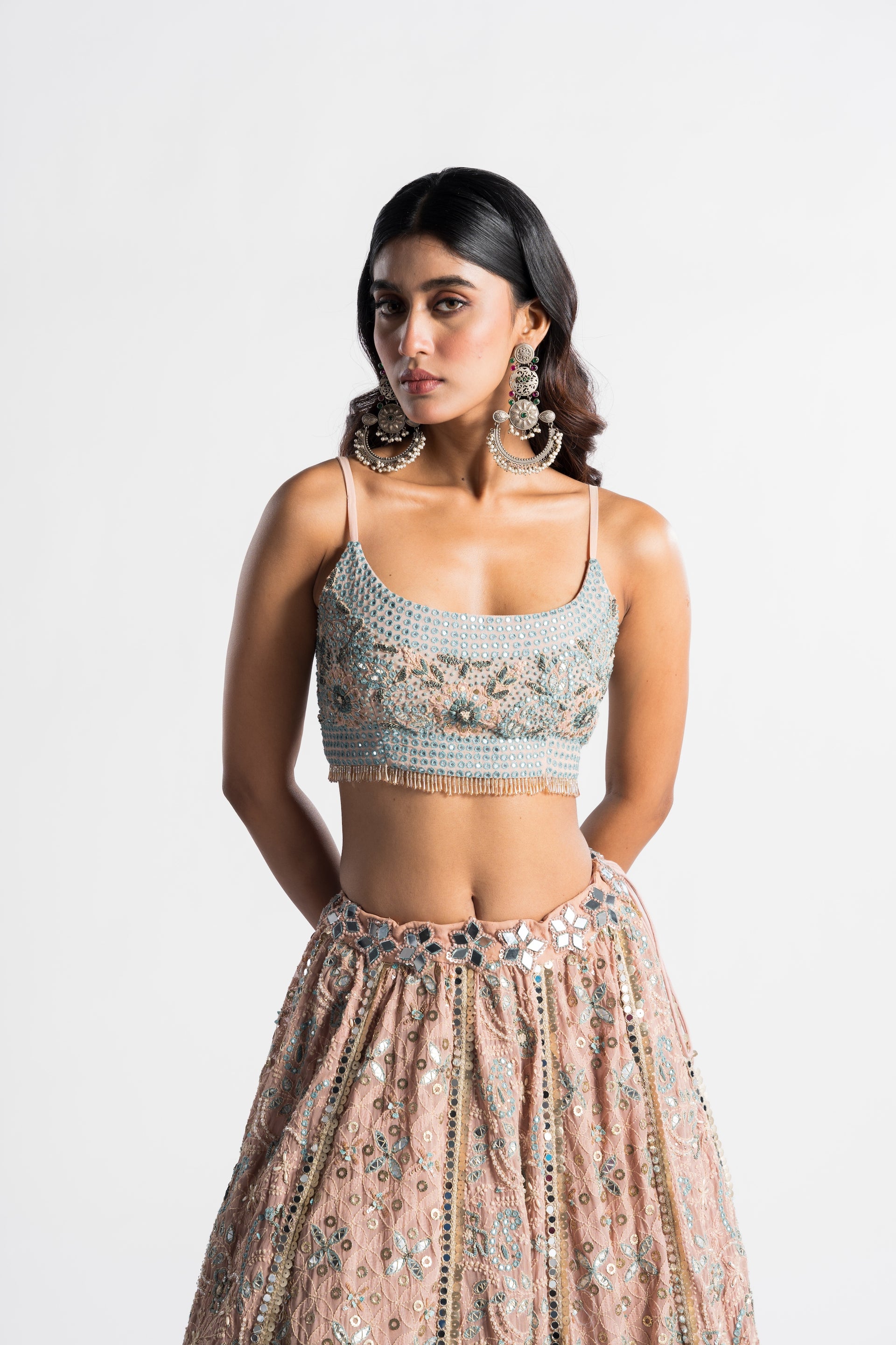 The Mirror Soiree Lehenga features intricate mirrorwork and chikankari embroidery in soft pastel pink and blue hues. The lightweight organza dupatta enhances its refined charm, embodying a Parisian bohemian aesthetic with timeless craftsmanship.
