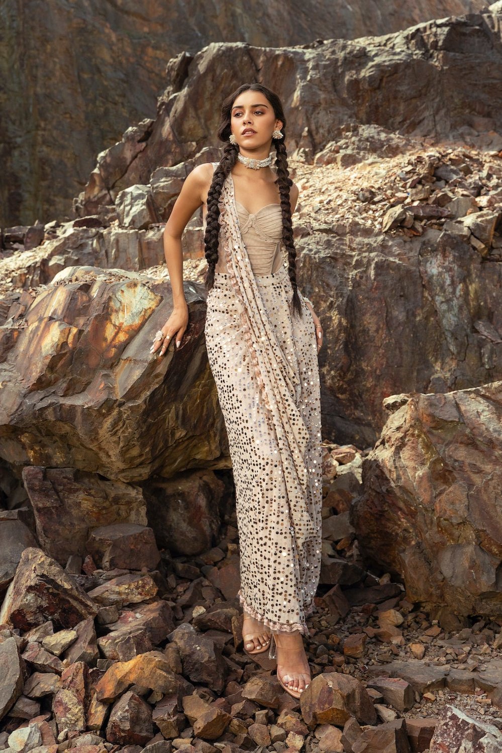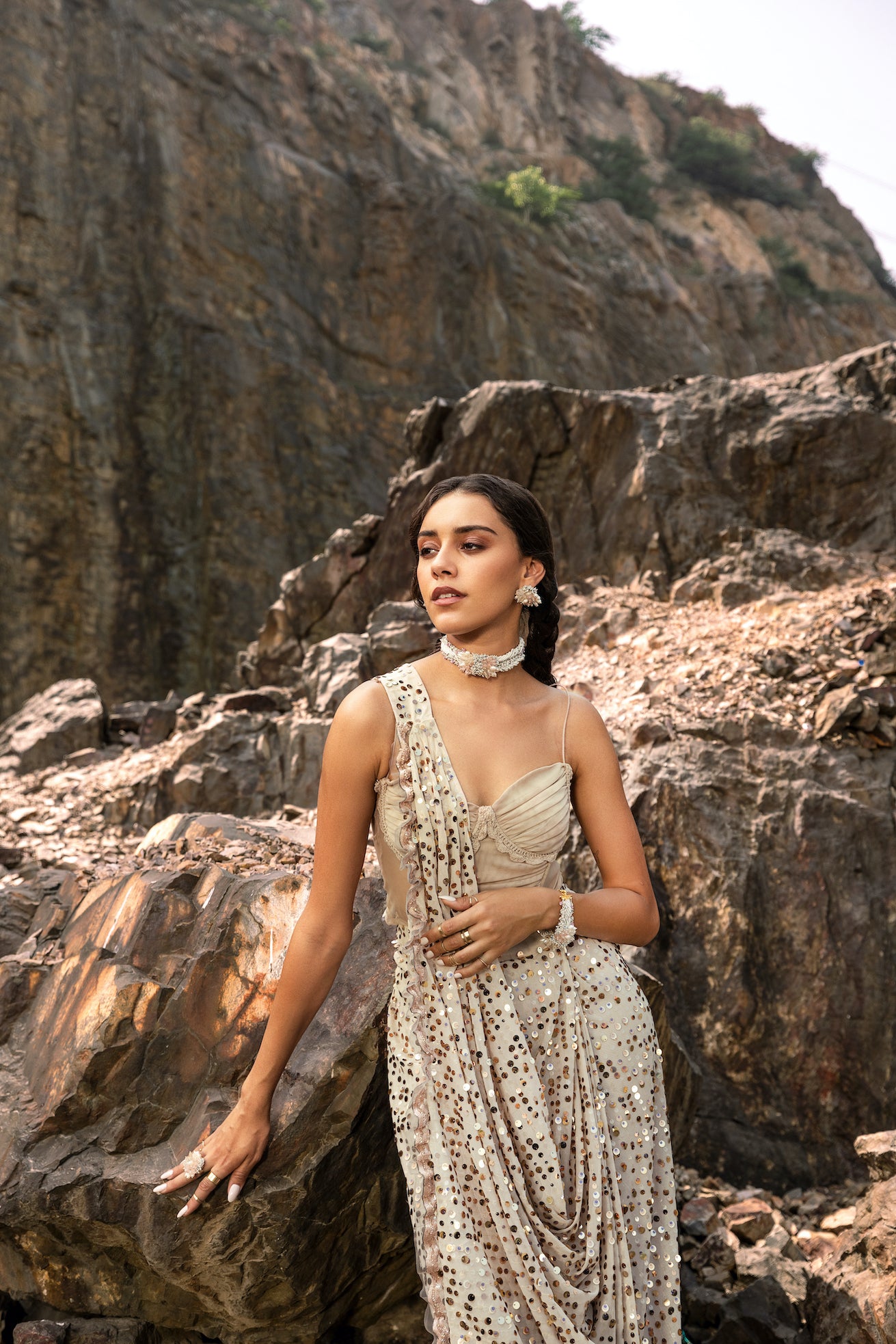 An outfit that shows your love for the old and new. This light weight sequins draped saree paired with corset blouse is crafted in lycra tulle. This retro look is sure to add a touch of dreamy romance to your evening wear.