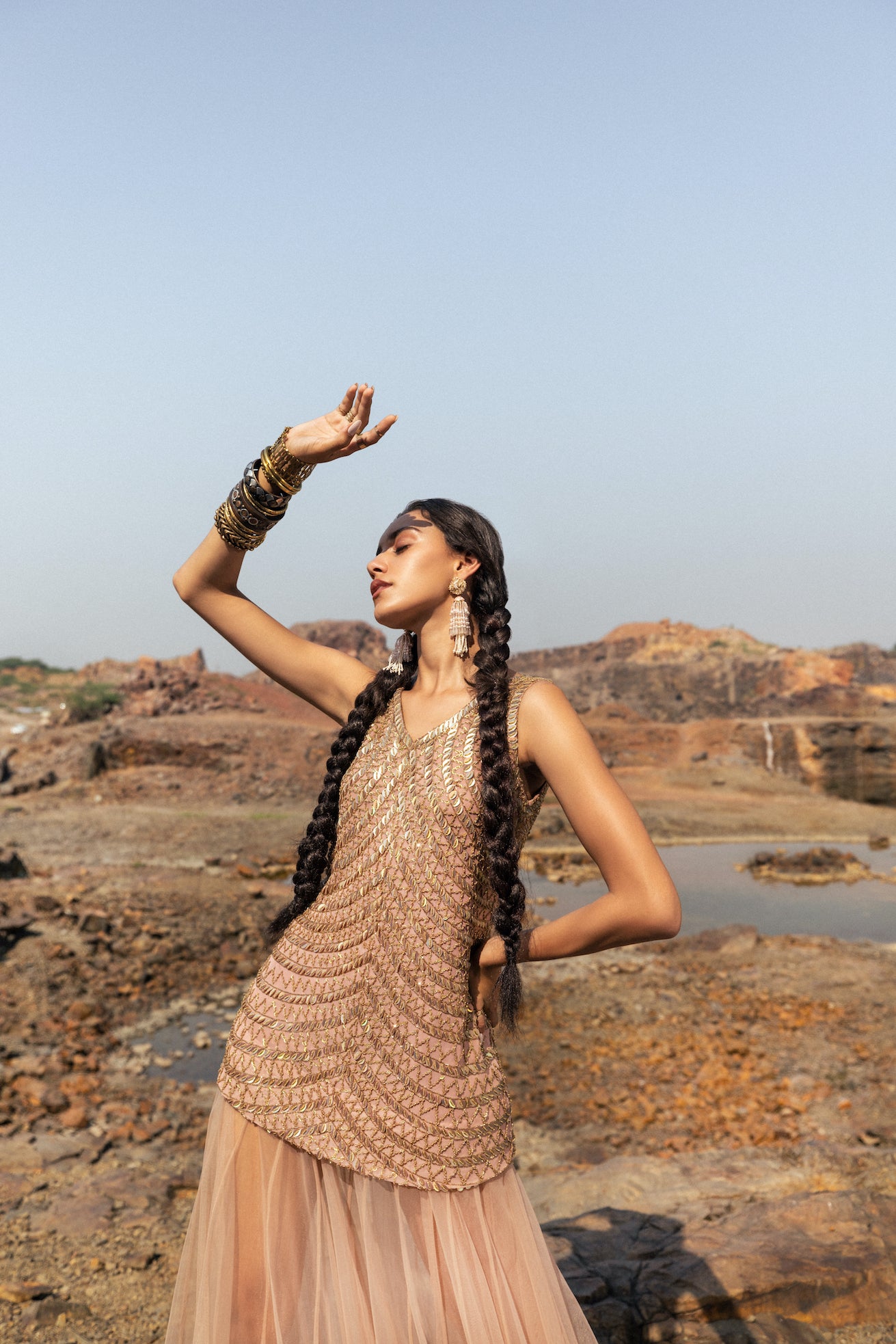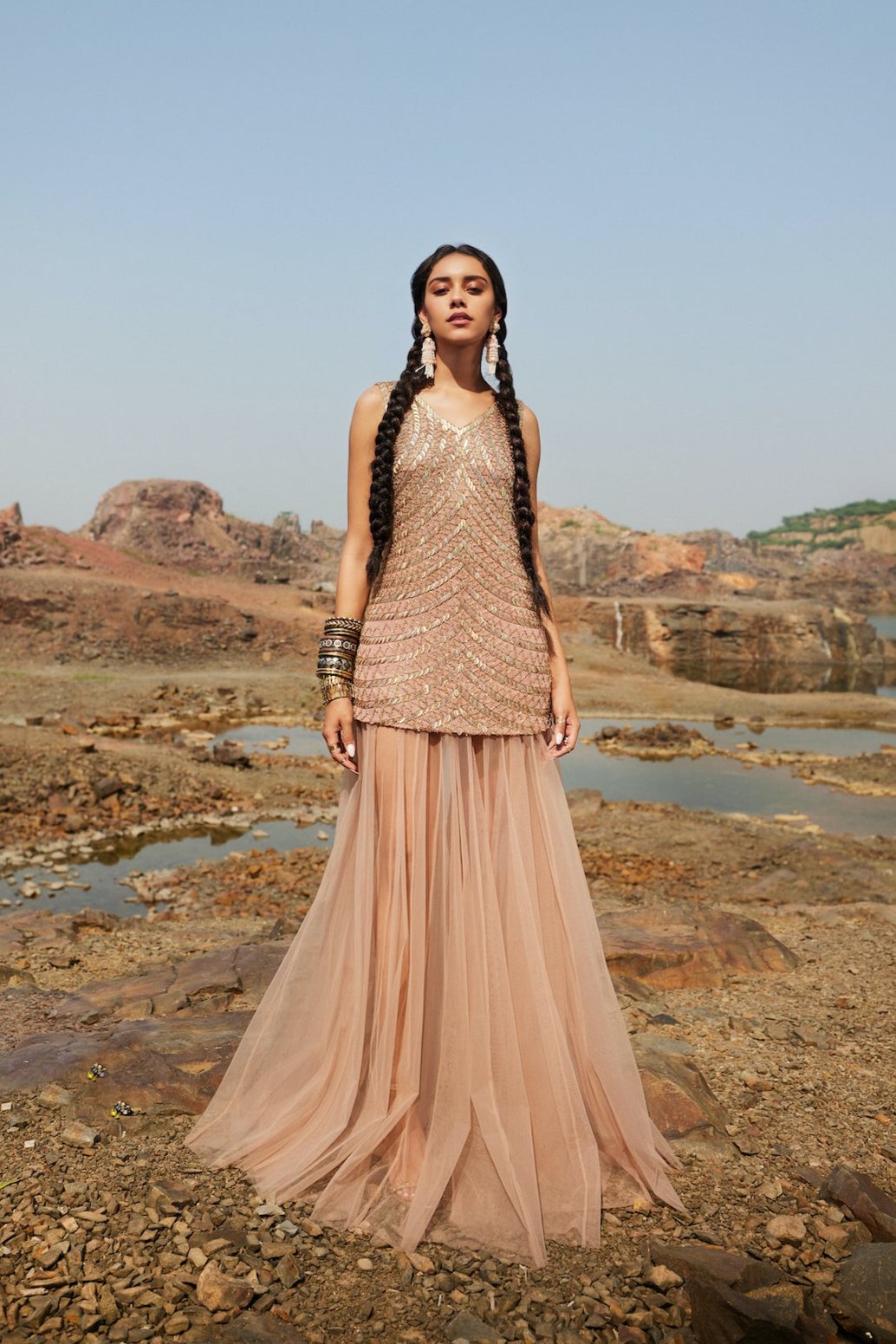 Floaty tulle fabric meets the magnificence of handcrafted sequins and katdana work in this ethereal ensemble. It features a sequins tunic paired with floor length tulle under skirt that is detachable.