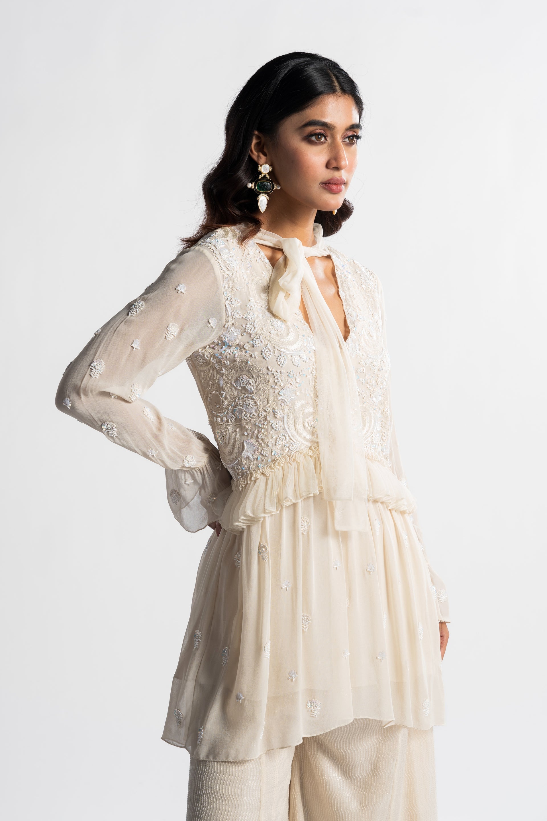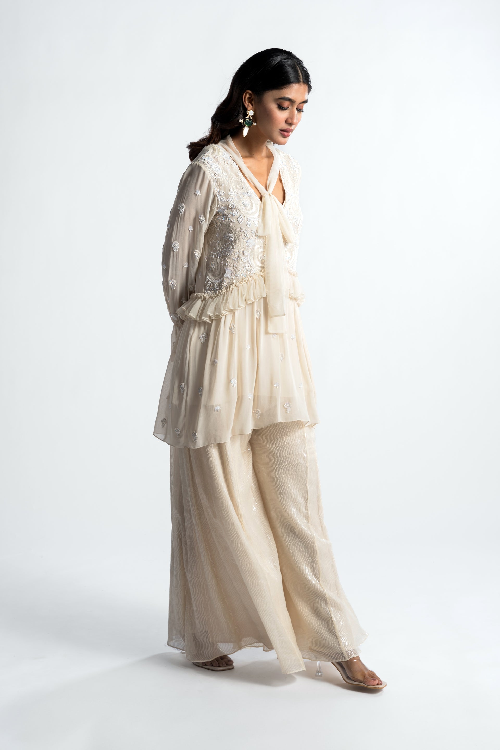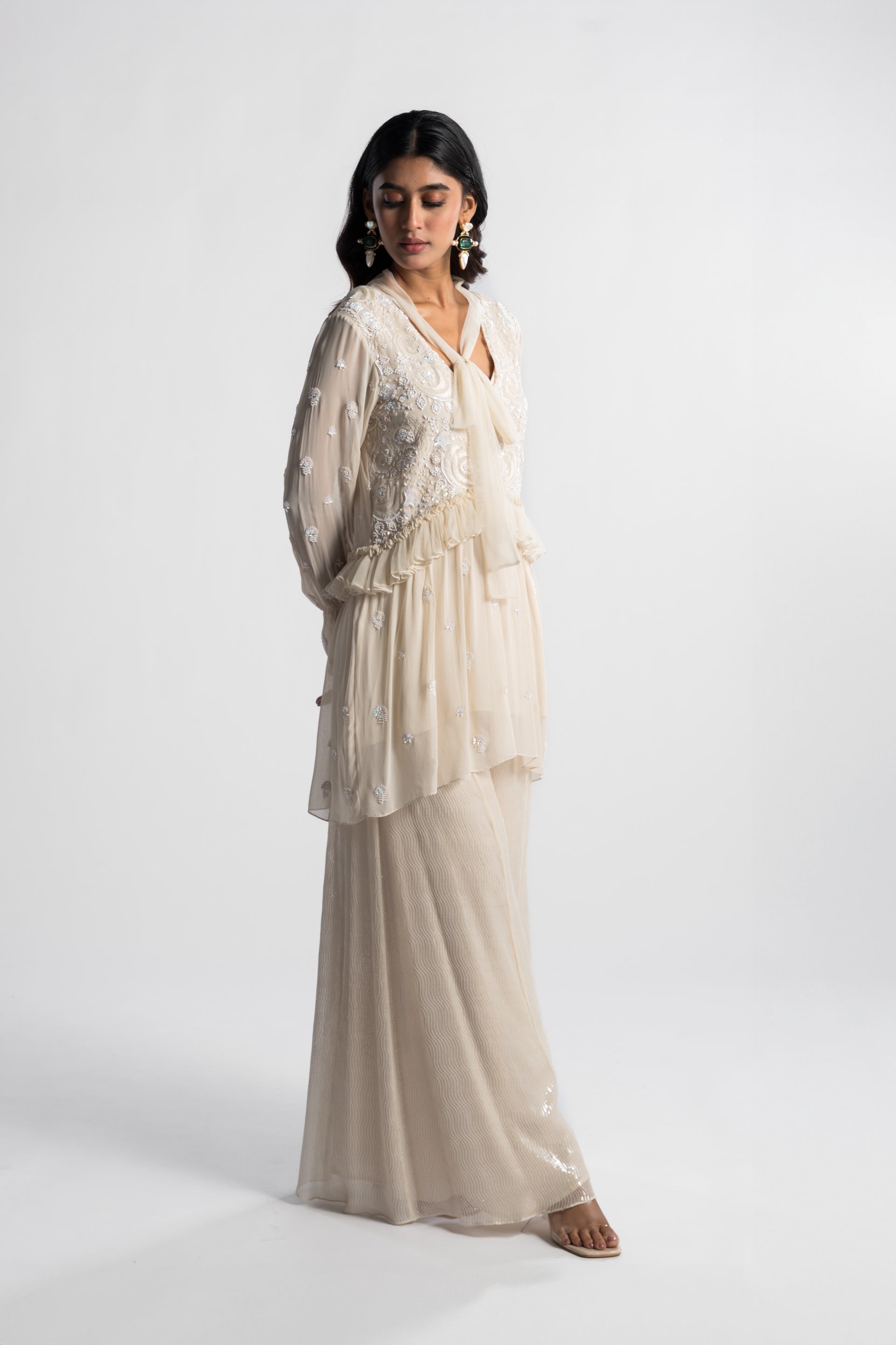 The Morado Ruffle Short Kurta Set is crafted from luxurious georgette, featuring a pearl white kurta with playful ruffle detailing and a stylish tie knot at the neck, paired with georgette pants. This ensemble offers a refined yet playful look for various occasions.