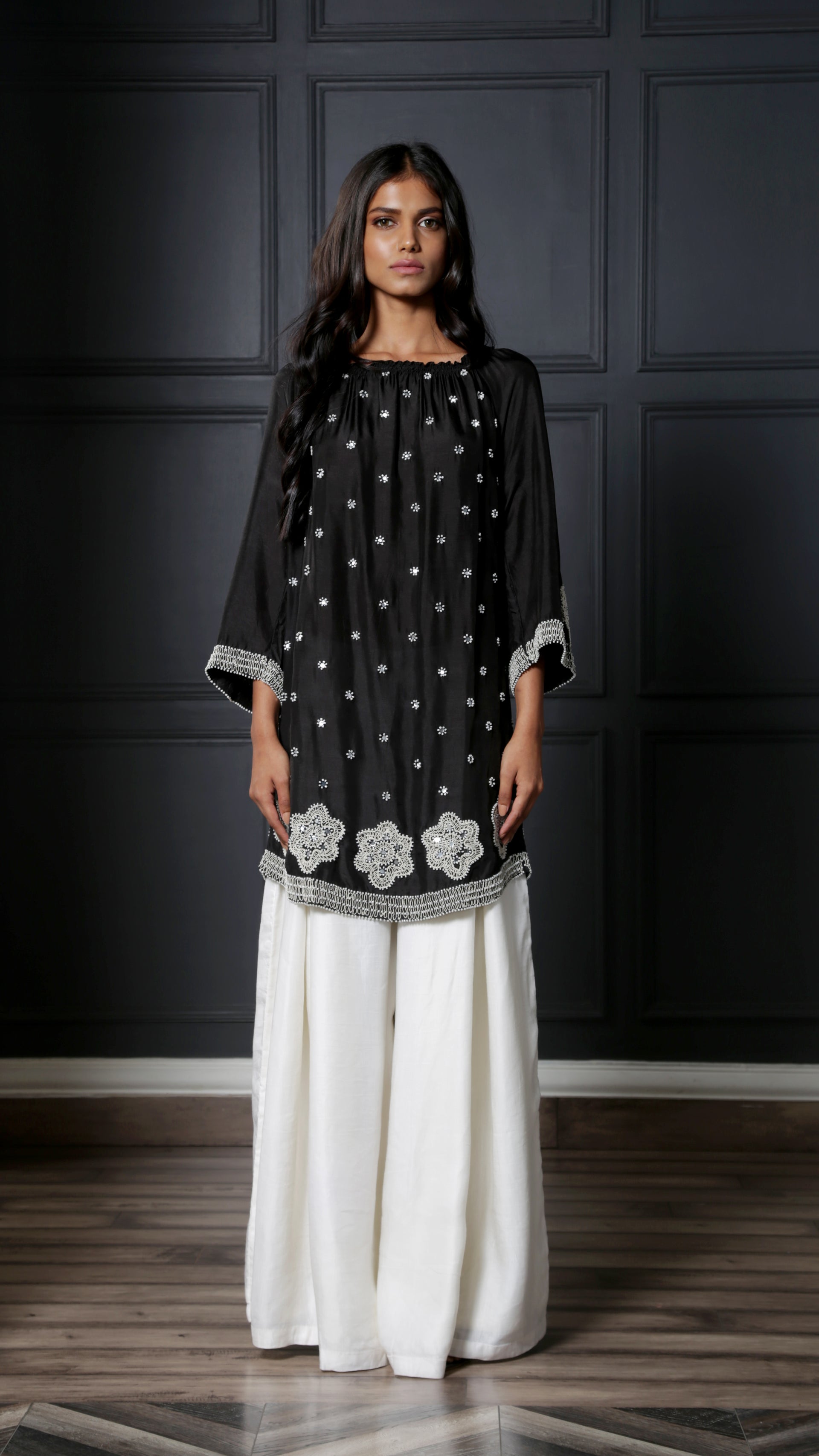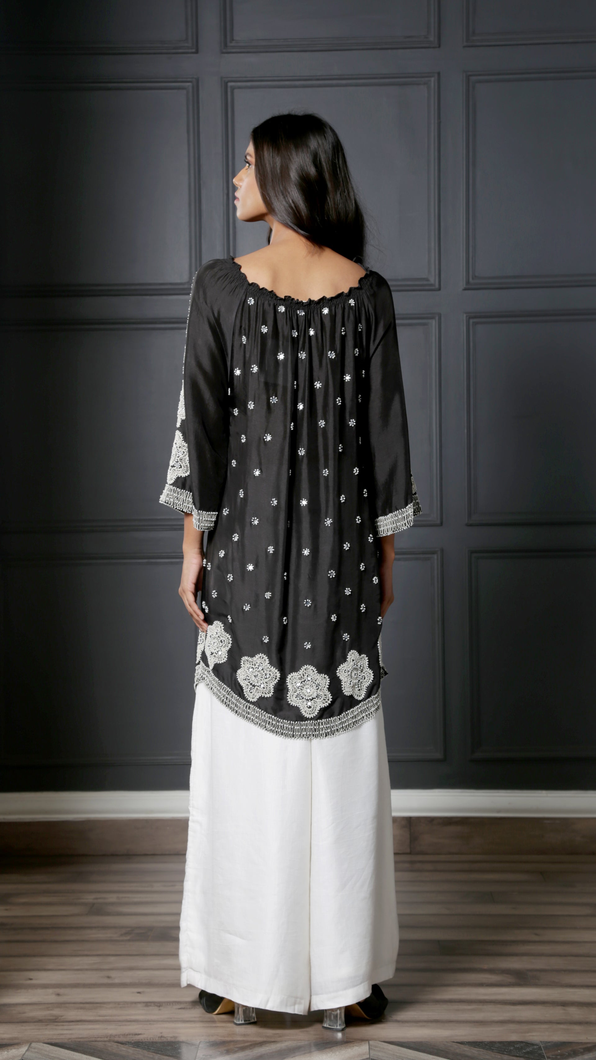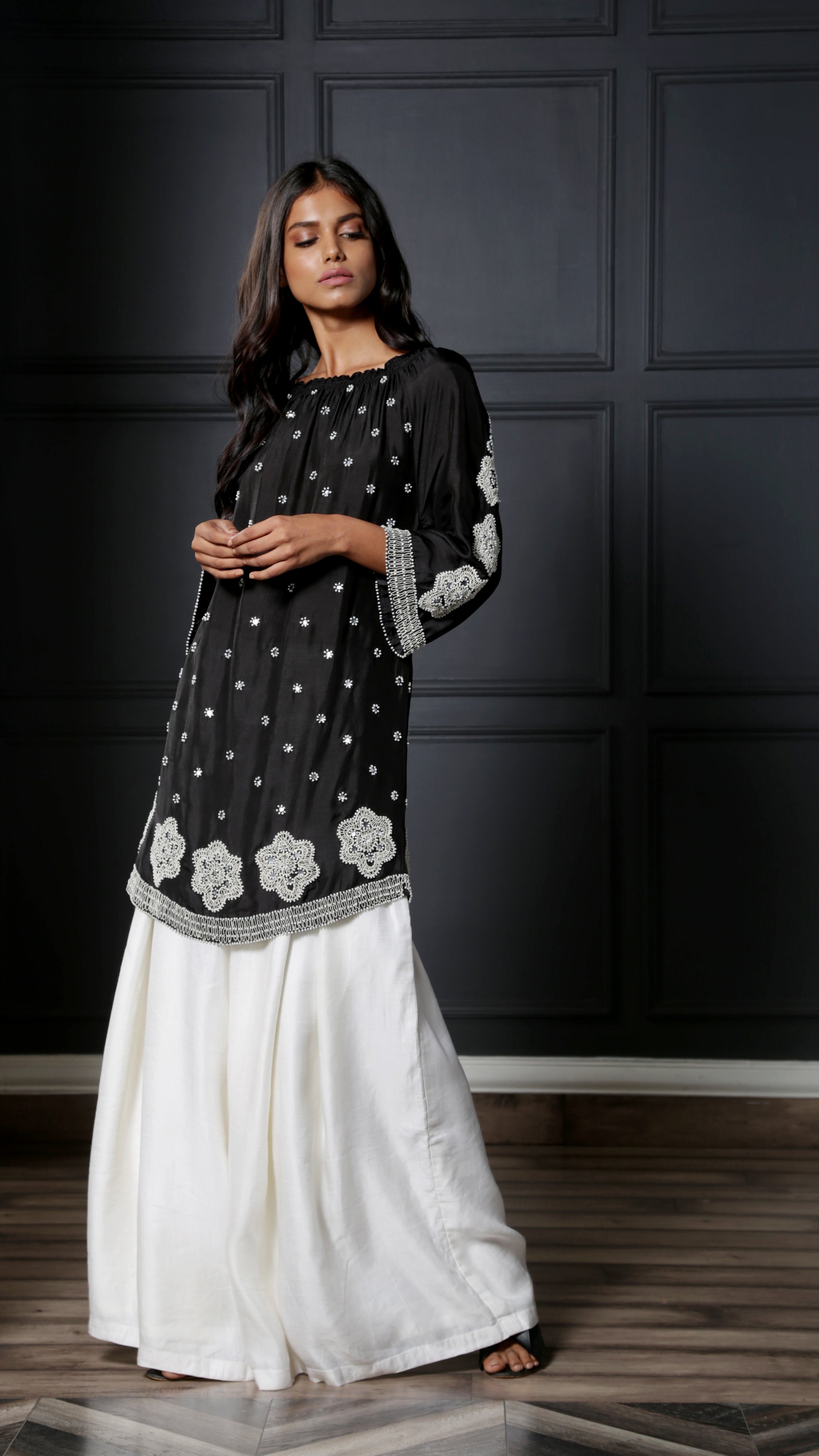 Black off-shoulder dress with cream crochet and mirror work embroidery. A beautiful Muslin dress that gives you romantic 60s look paired with palazzo pants and is a must have outfit, this festive season.