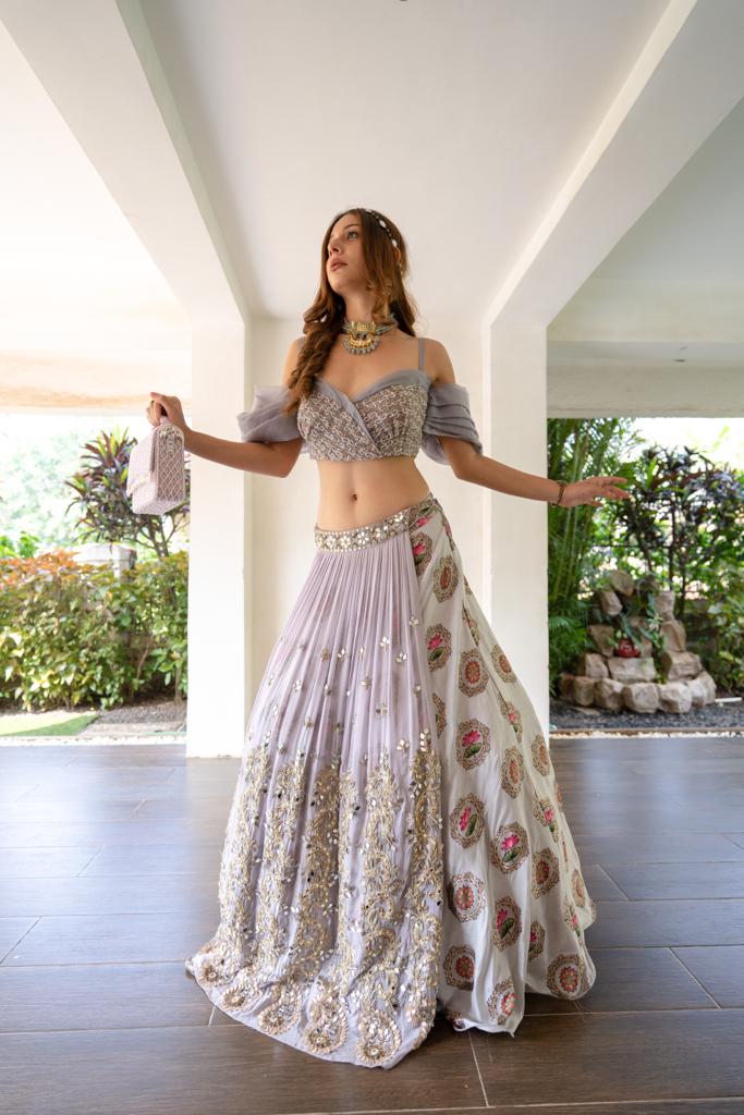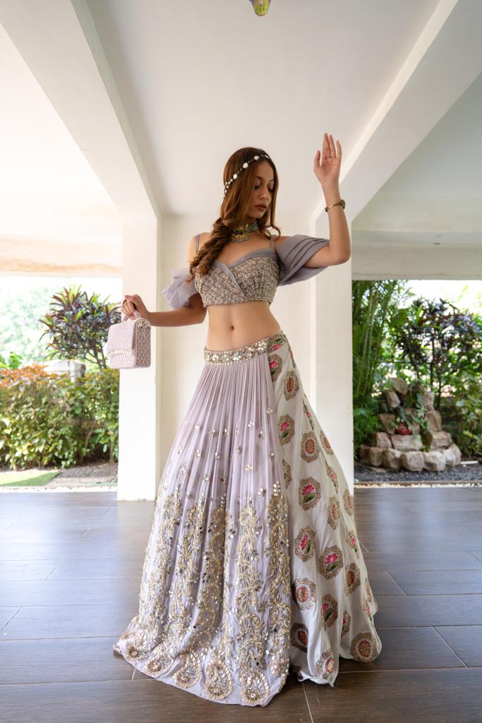 Lilac cold shoulder hand embellished bustier and lehenga in brocade paired with mirror work overlay skirt and tulle dupatta, this is one of those outfits that will turn heads wherever you go! To add a touch of glamour the dupatta is hand embellished with katdana work and has scallop border.