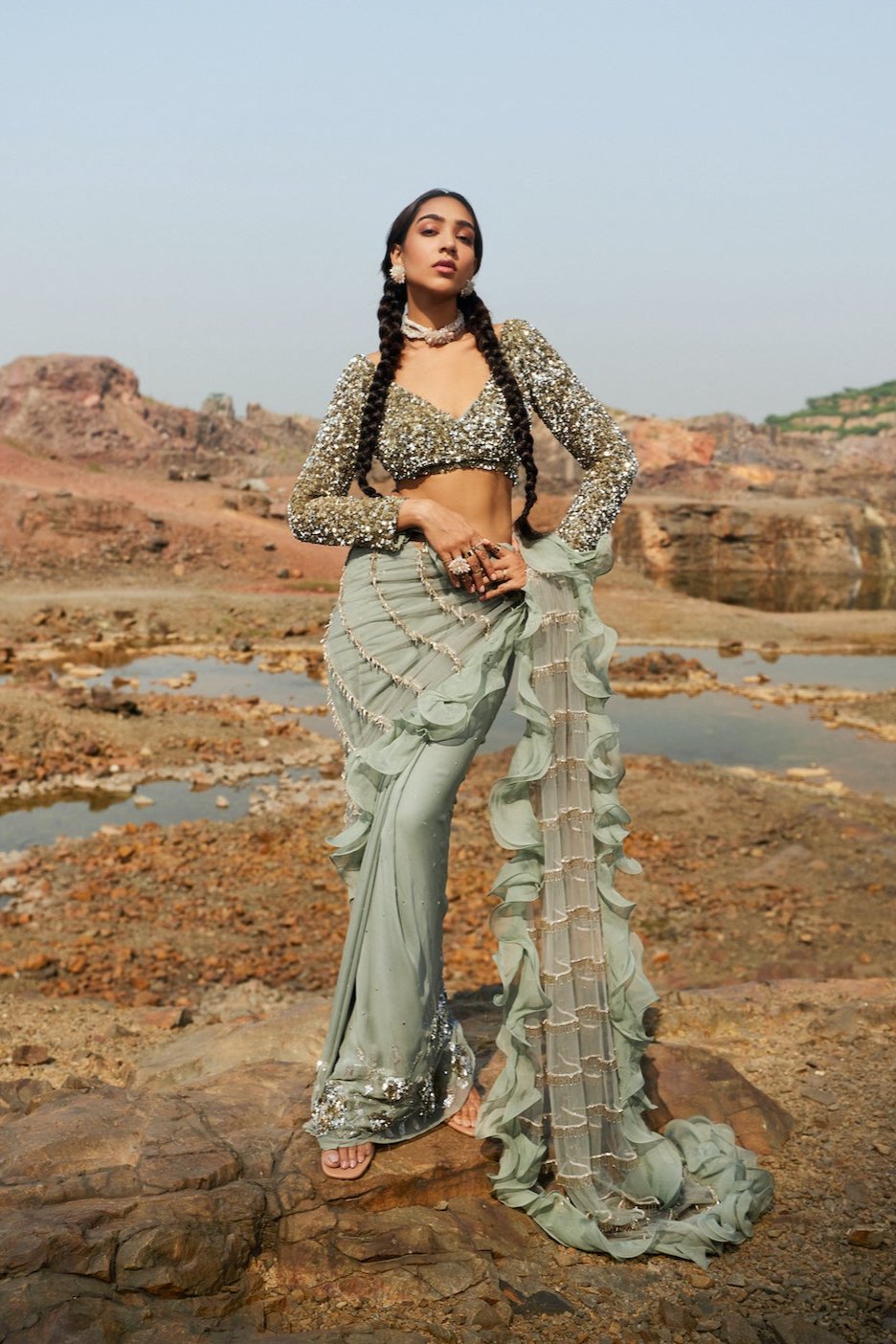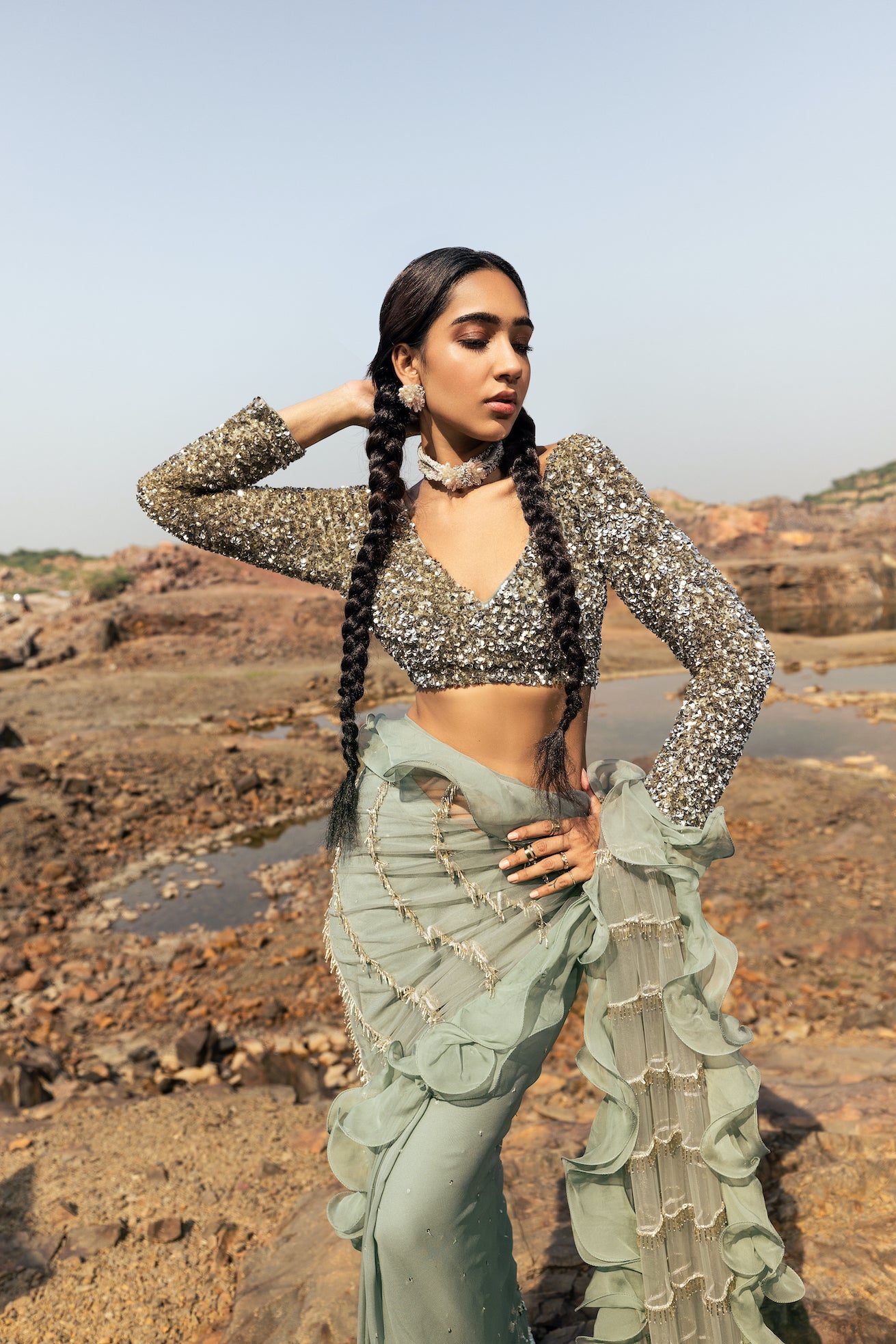 Make a head turning statement by wearing this stunning saree in your upcoming festivities. The saree has frills embroidered delicately to give it a 3D effect and is paired with a full sleeves sequin blouse.