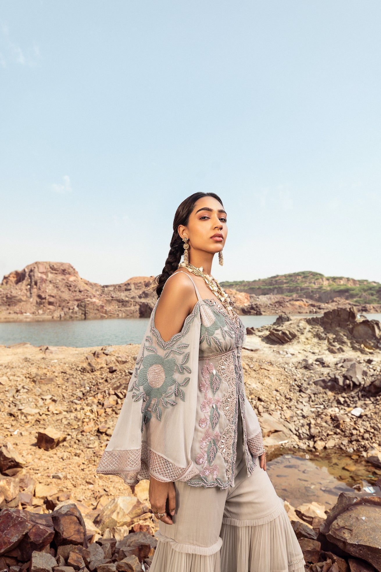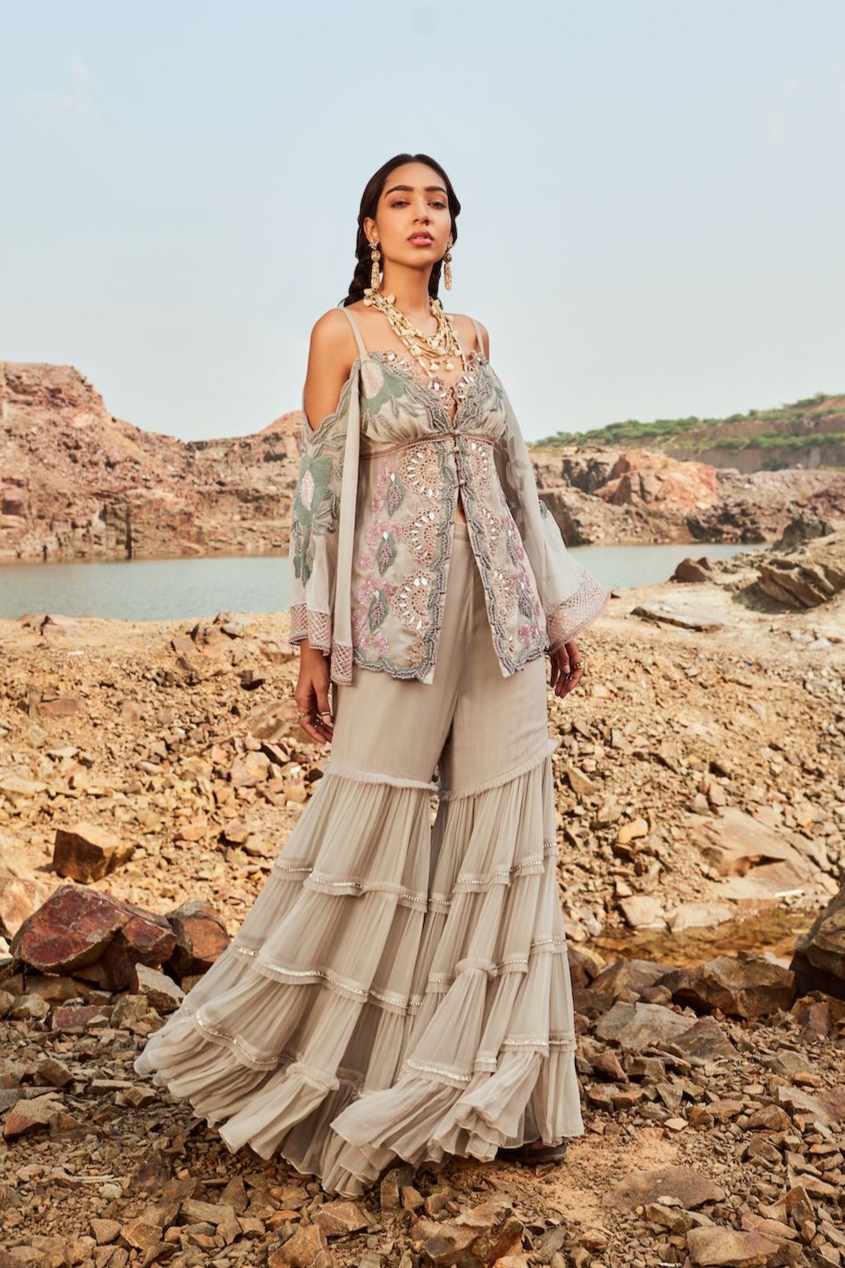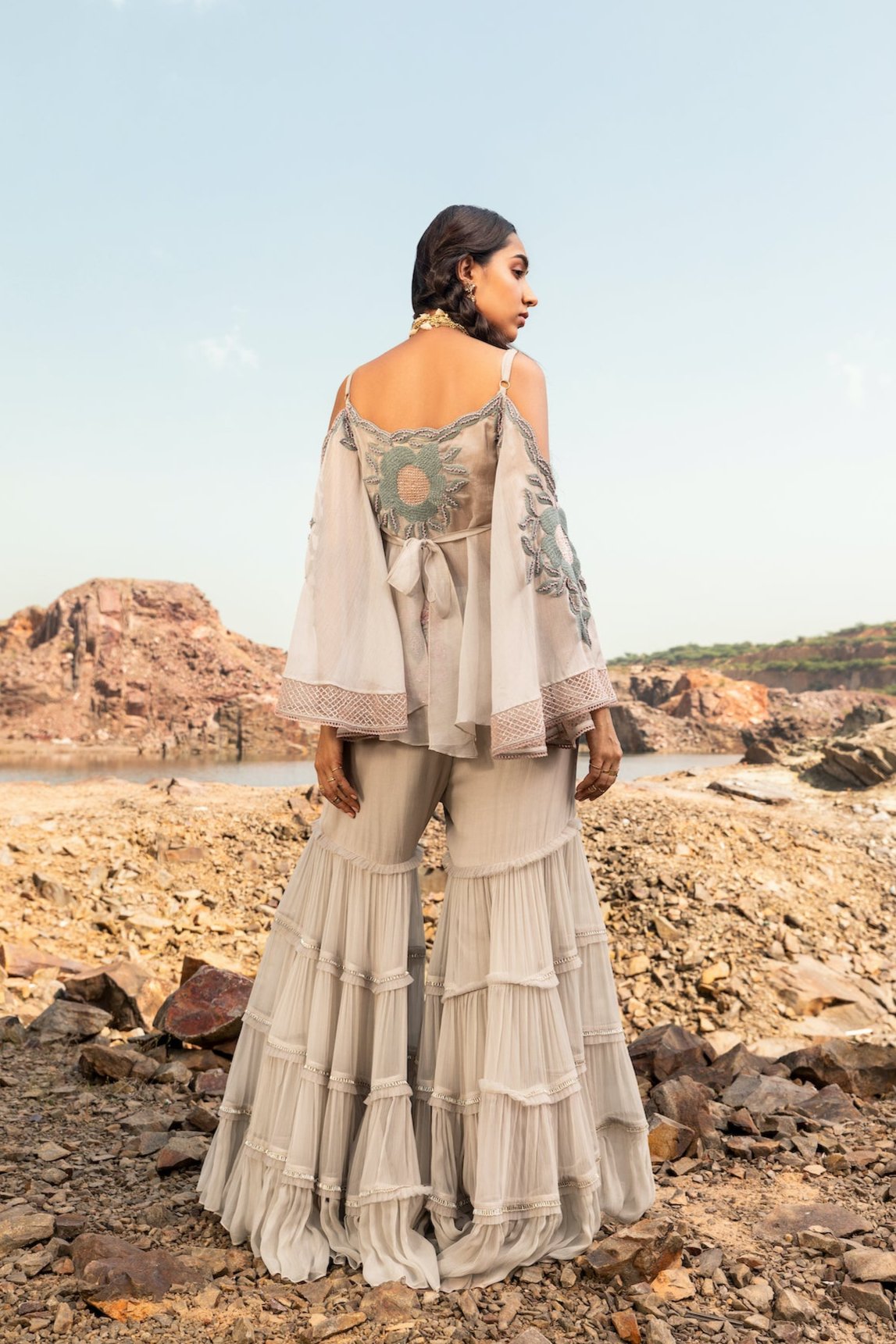 Rekindle your inner style quotient by wearing this sharara set. Tailored for comfort, this powder blue kurta set, assures a soft and soothing touch against the skin. This set features a cold shoulder peasant tunic paired with four tiered chiffon sharara.