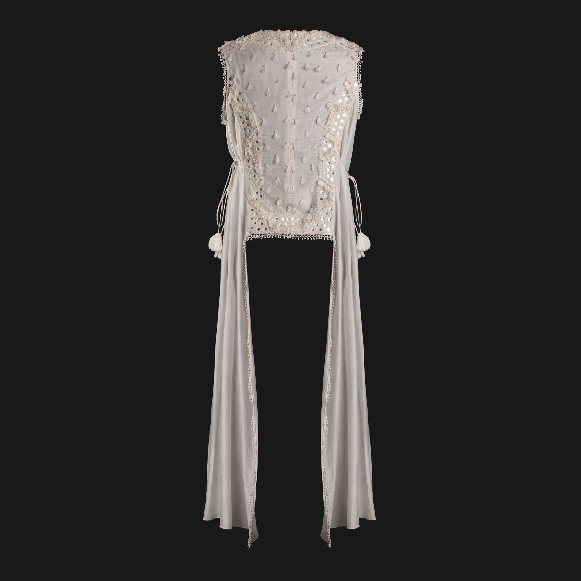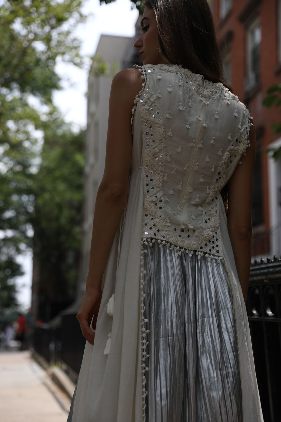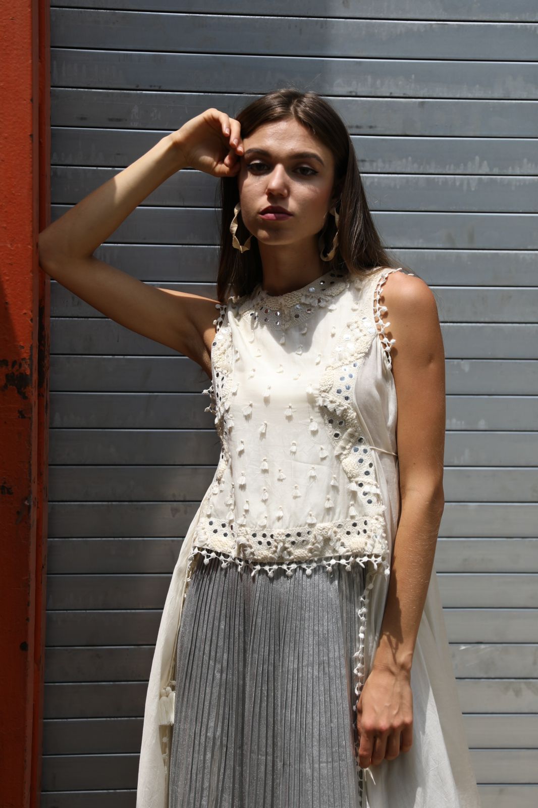A-Line ivory coloured top, hand embellished with thread and mirror work and drawstrings on both sides sides for a better fit. A casual look for a casual gathering!