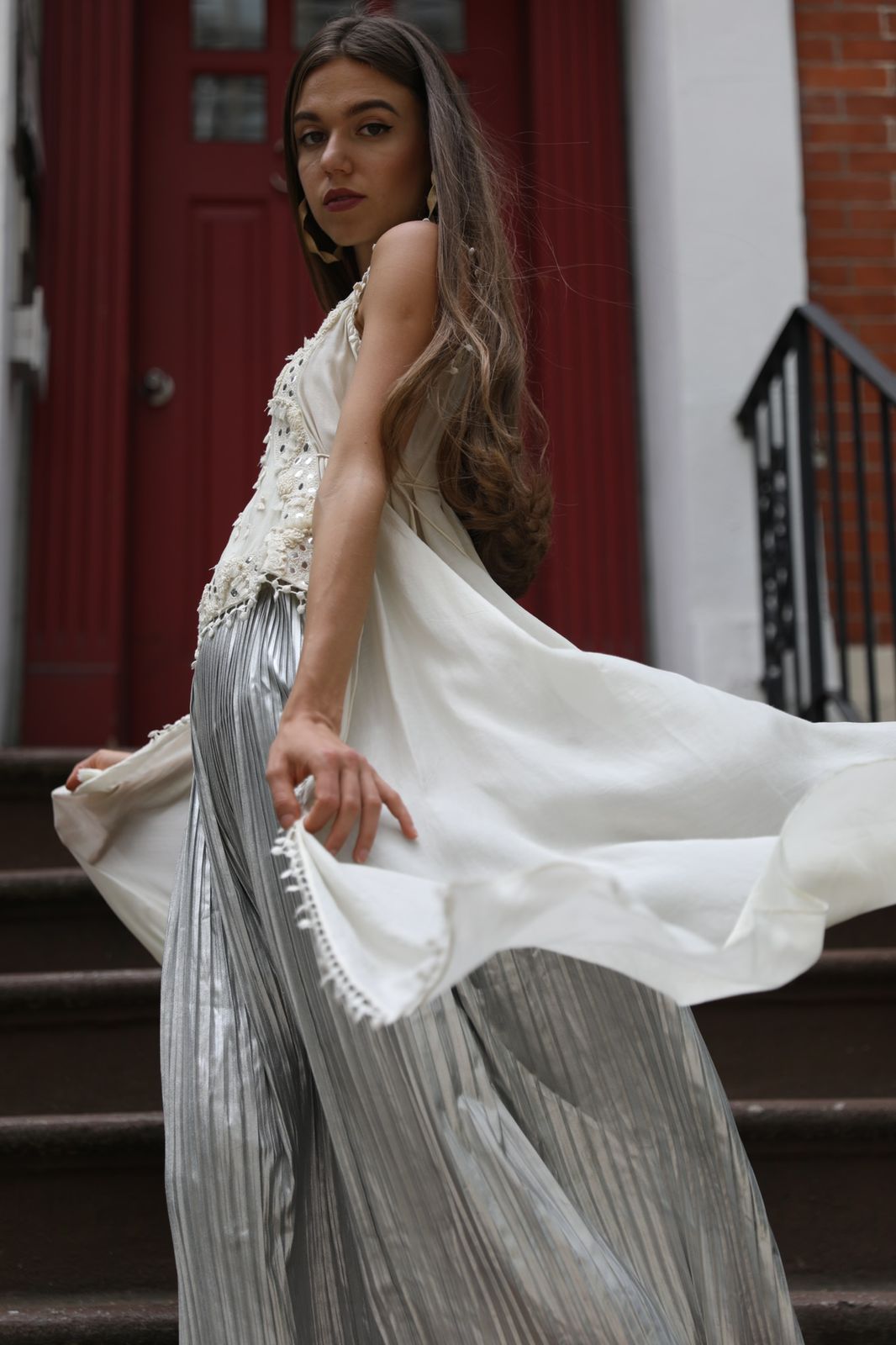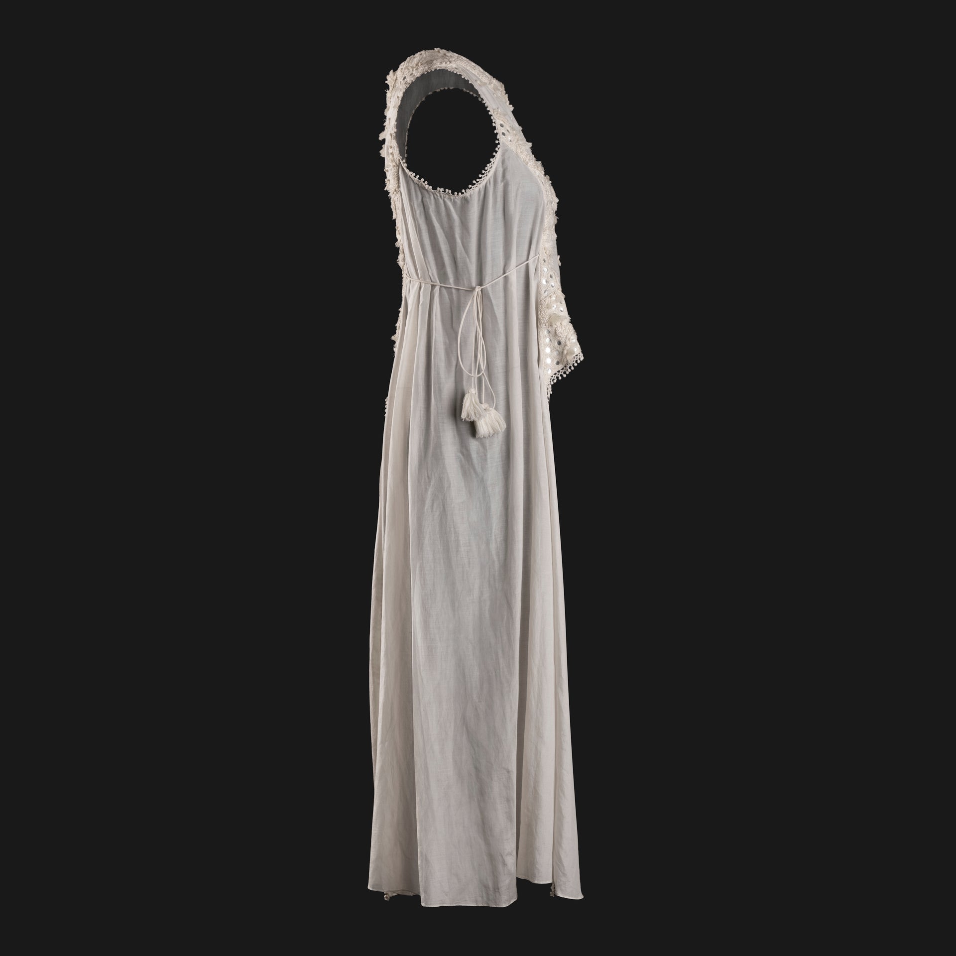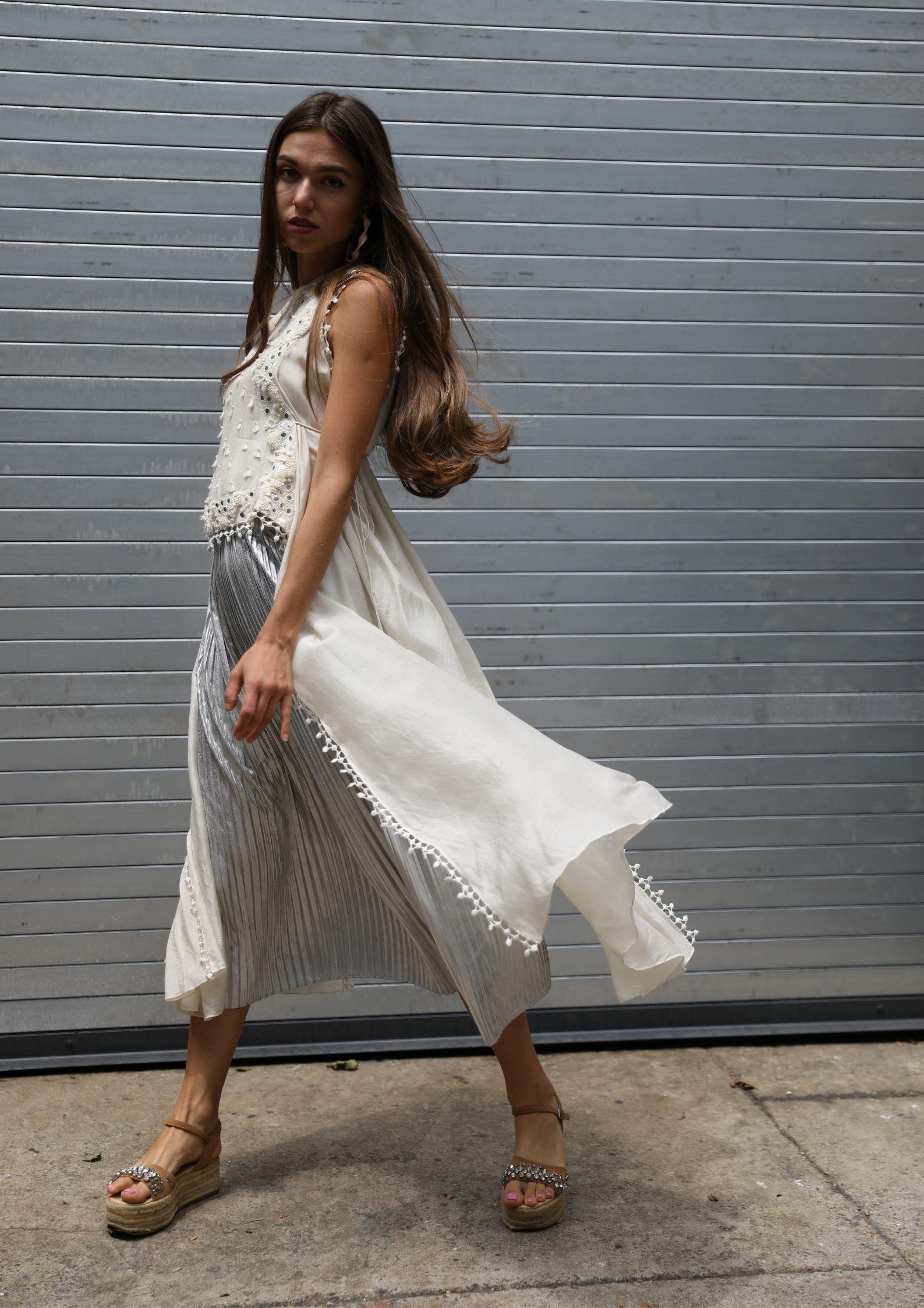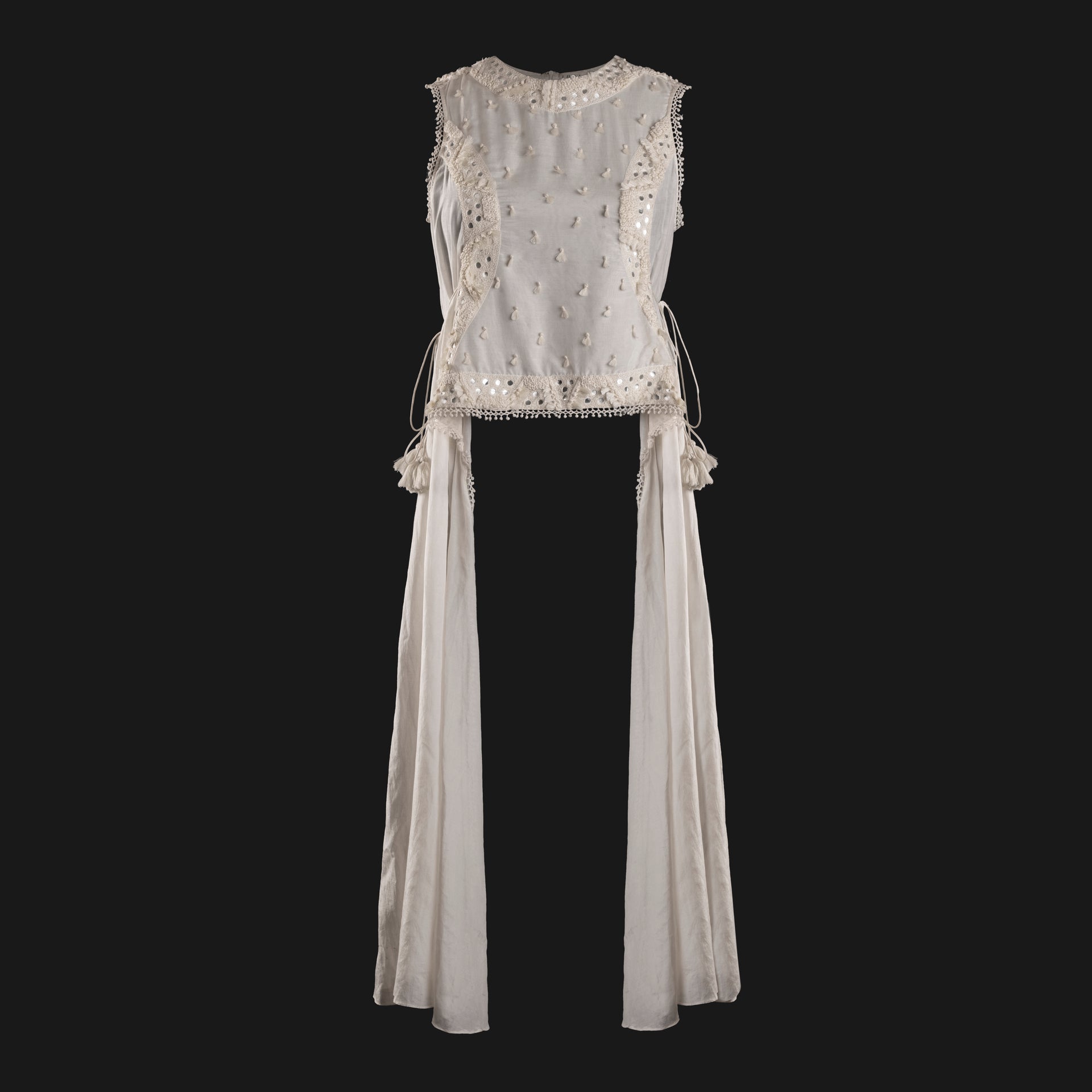 A-Line ivory coloured top, hand embellished with thread and mirror work and drawstrings on both sides sides for a better fit. A casual look for a casual gathering!