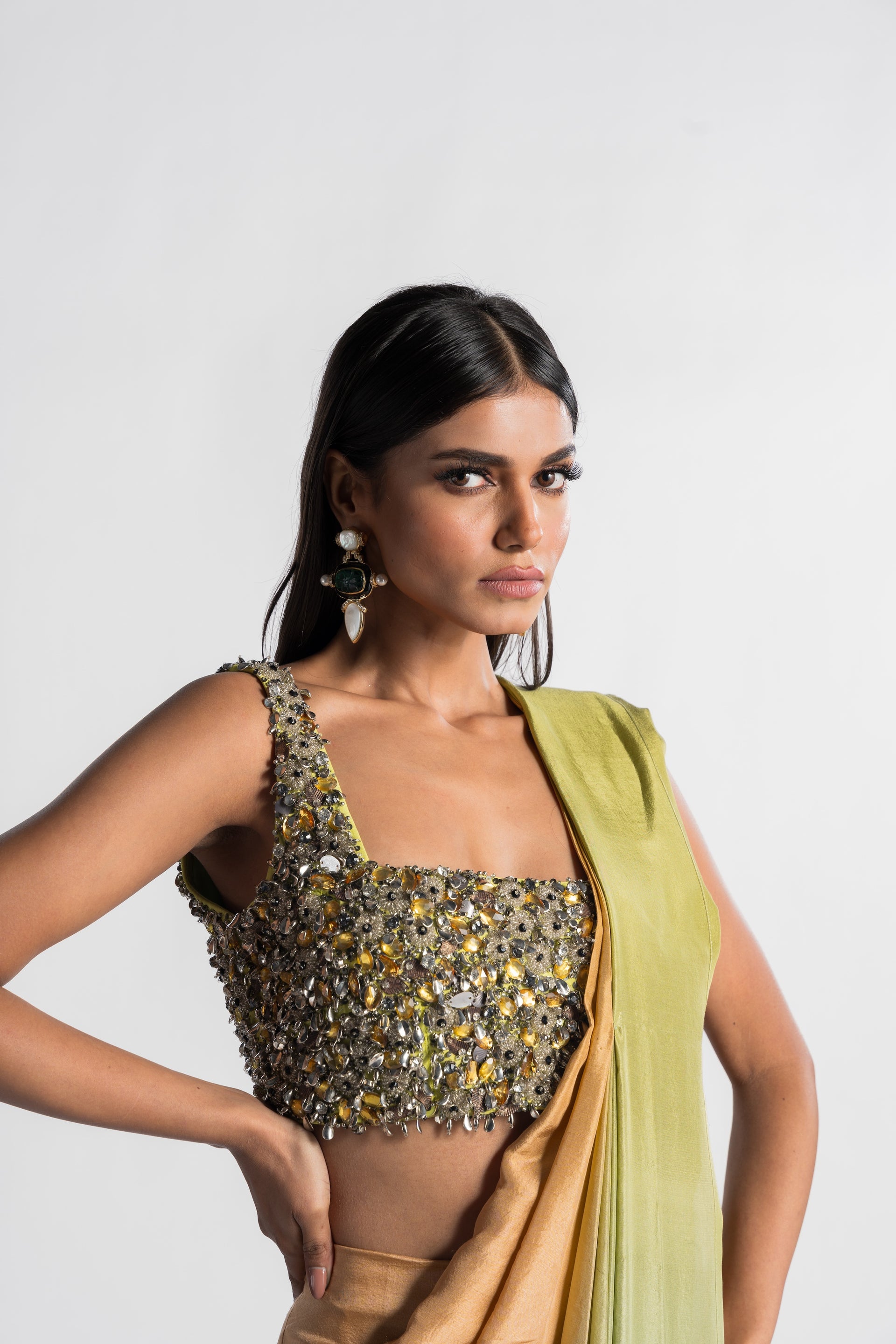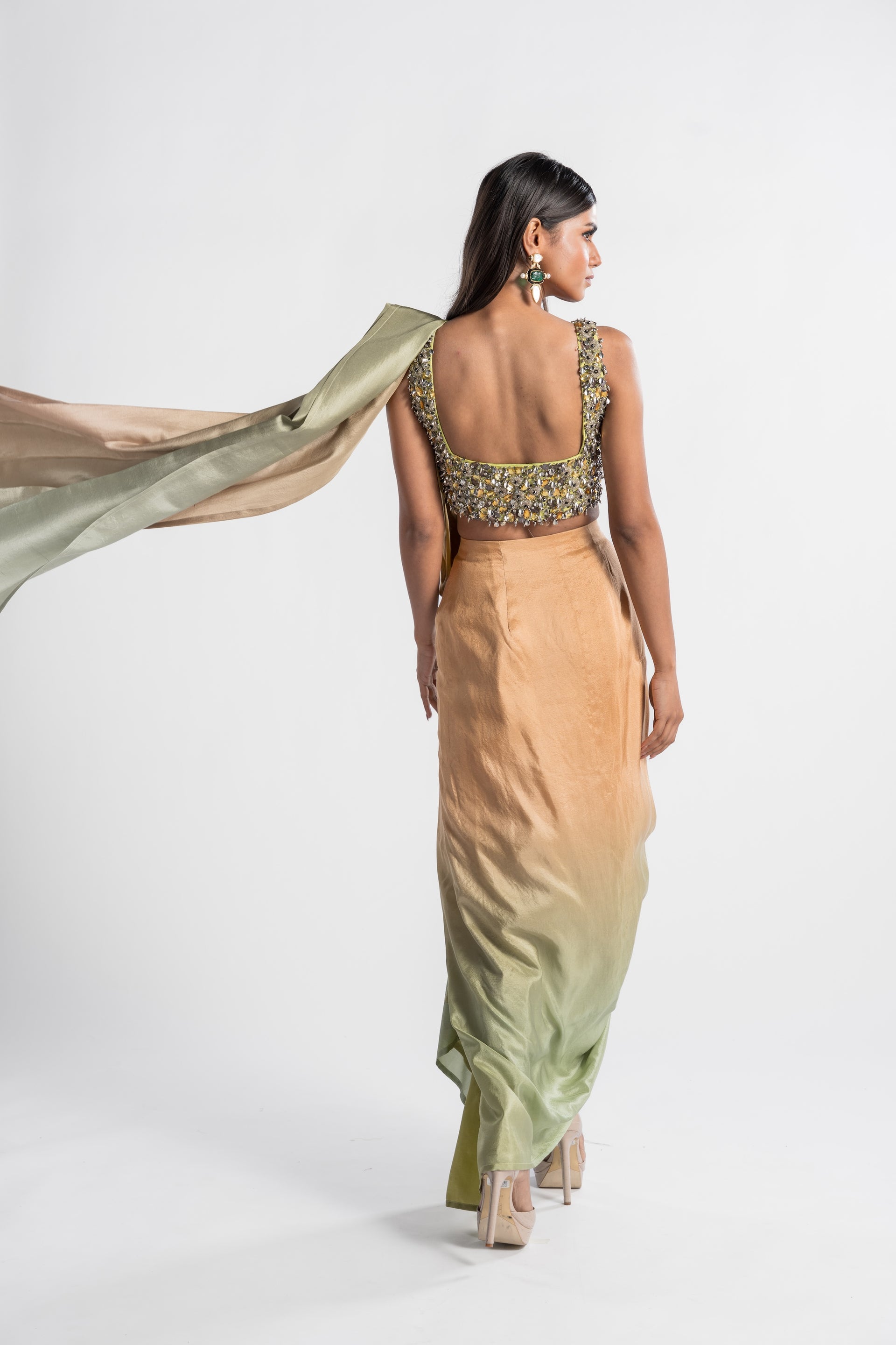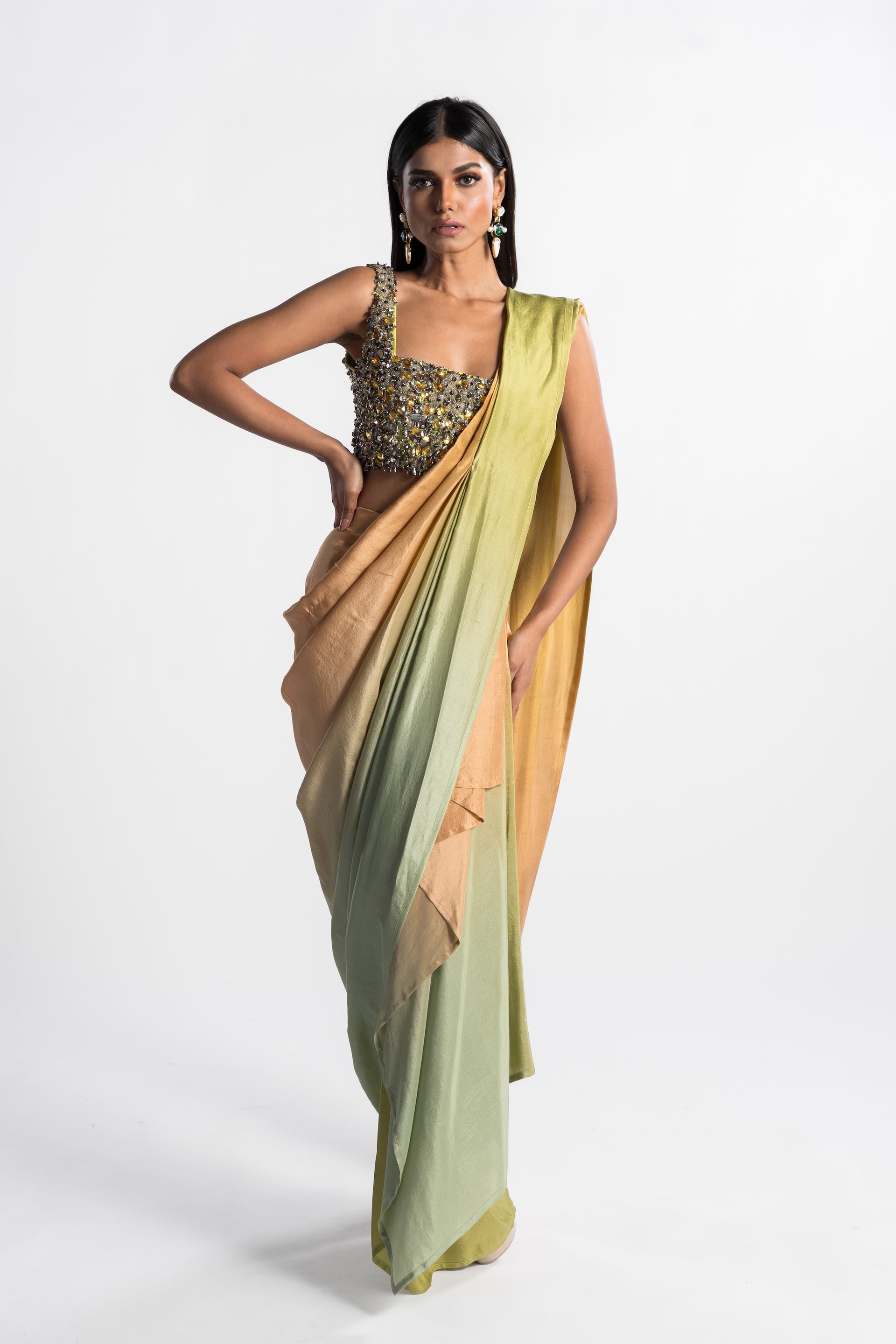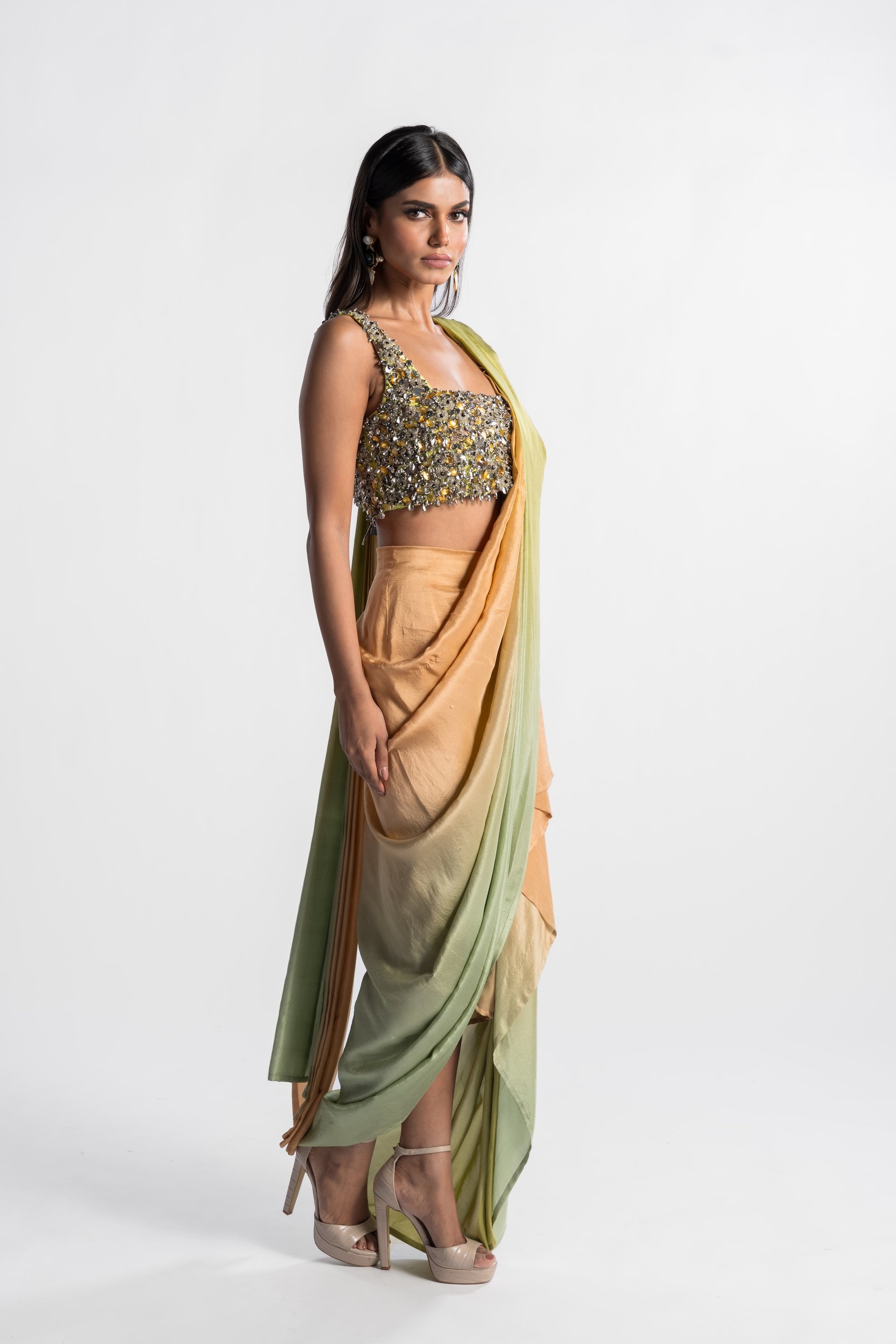 The Sunset Draped Saree features a luxurious ombre silk that captures the essence of a sunset, complemented by a satin blouse with disco-inspired sequins and beading. This ensemble combines elegance with a playful flair, creating a captivating look perfect for any festive occasion.