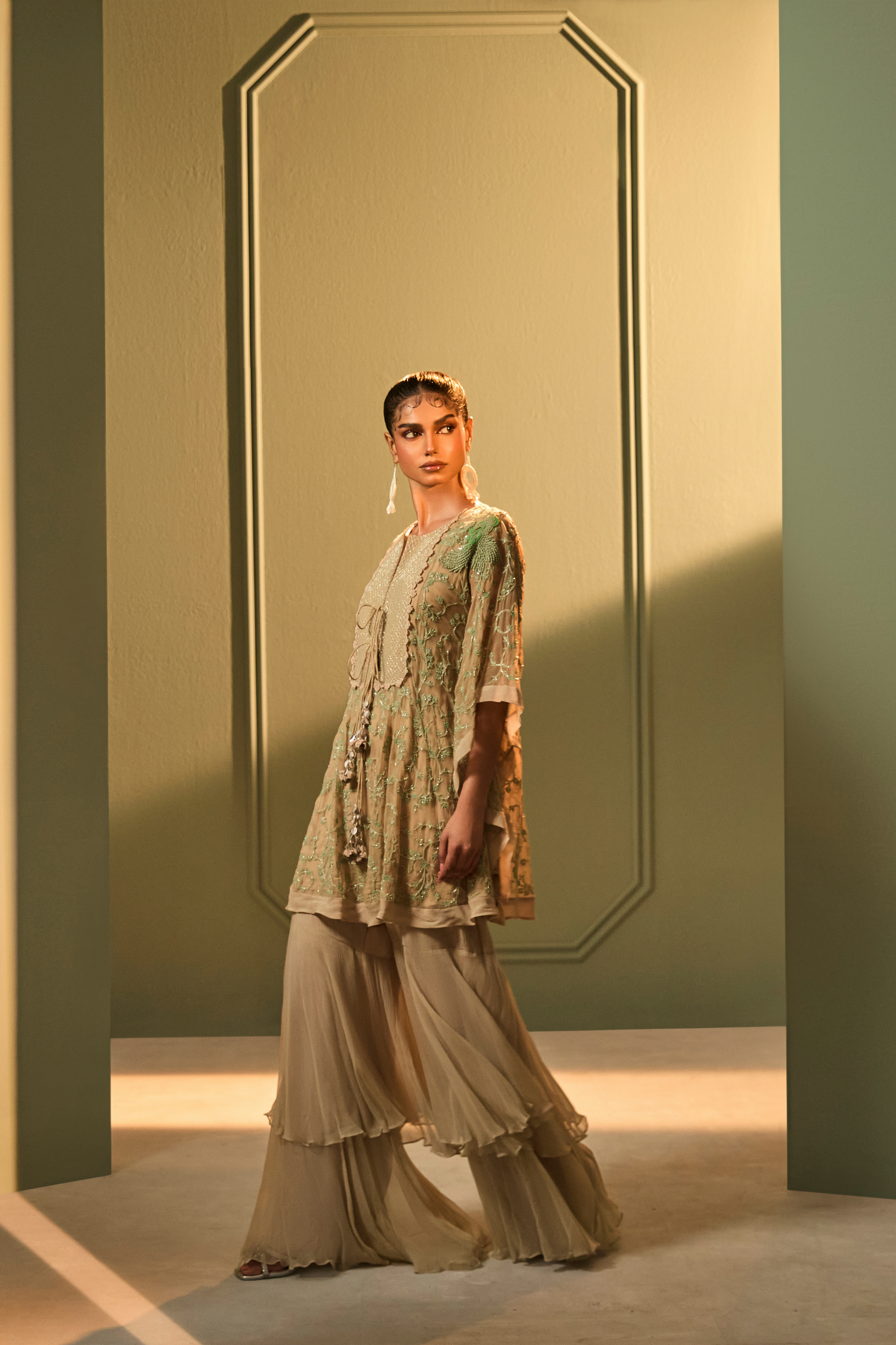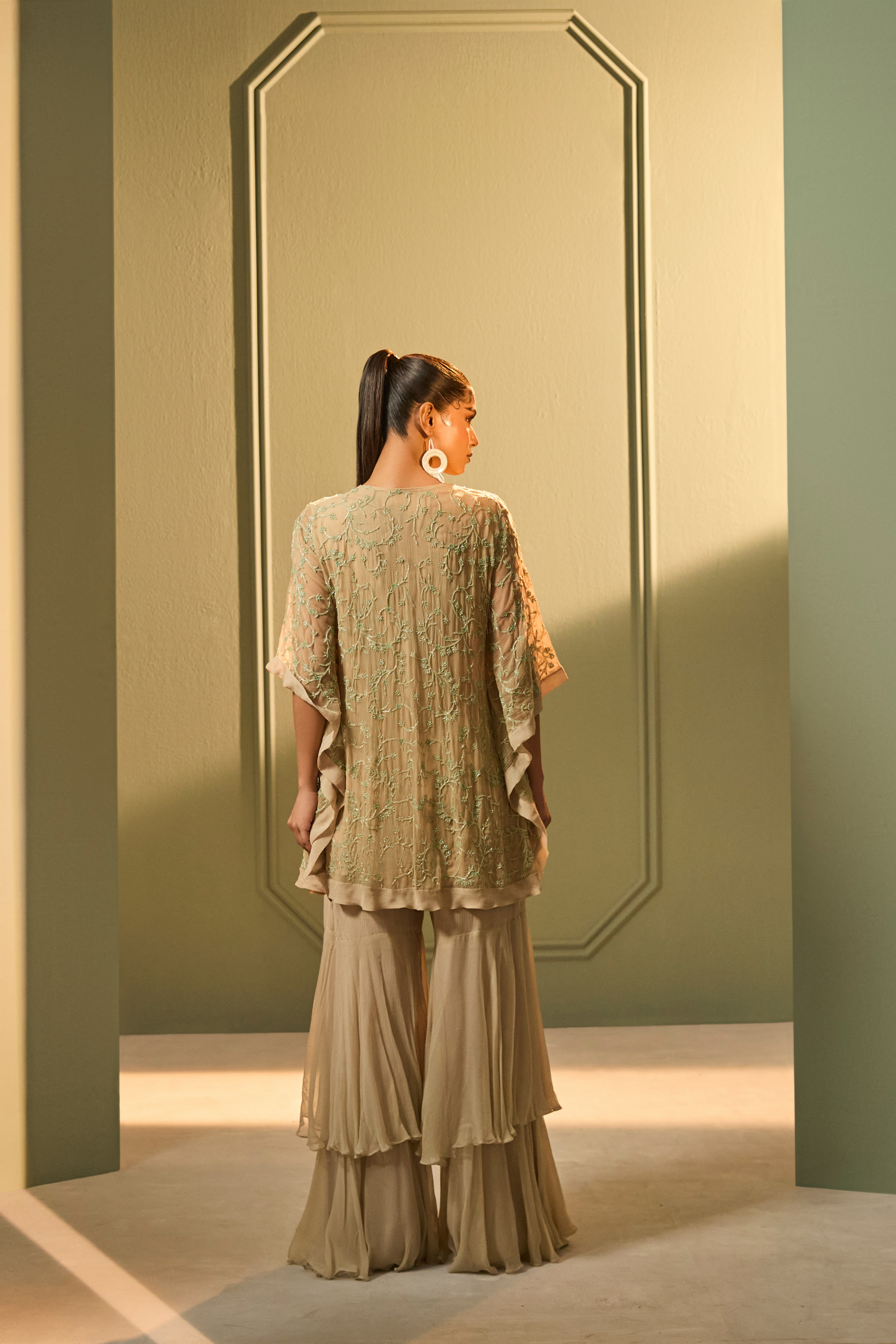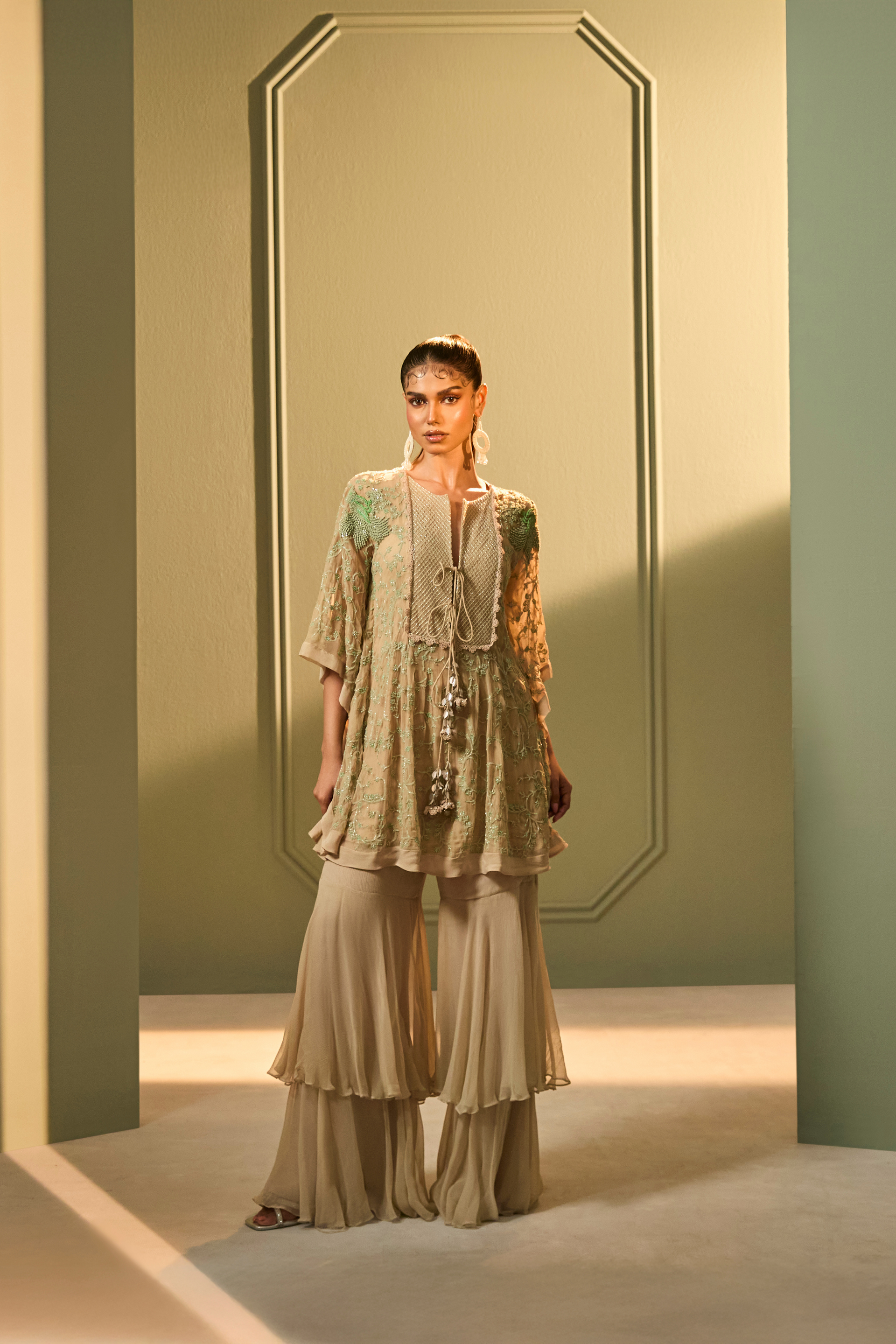 A fluid mint green kaftan in soft chiffon, featuring delicate bead, katdana, and intricate thread embroidery. Paired with layered chiffon sharara pants, this lightweight set moves effortlessly from day celebrations into evening gatherings.
