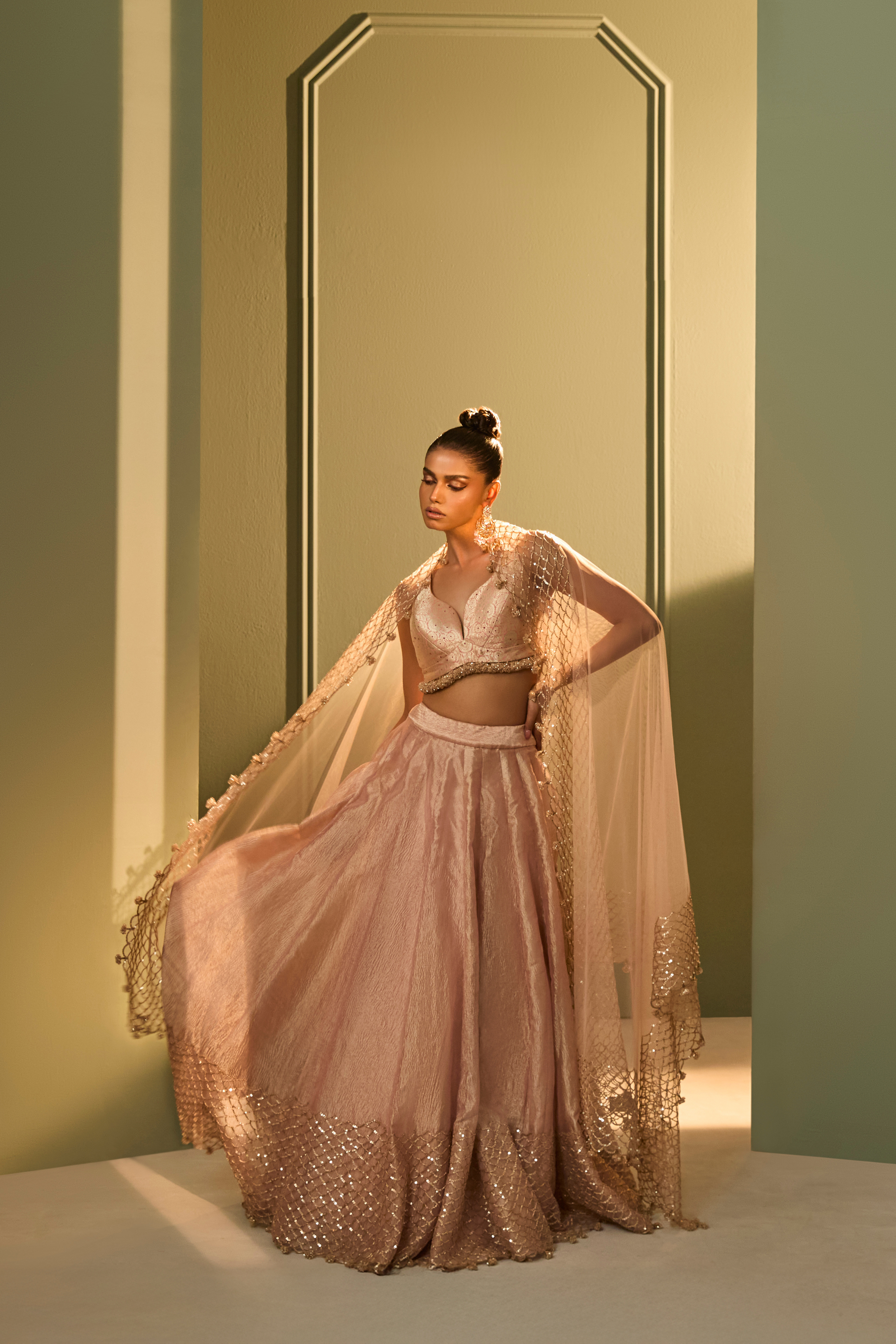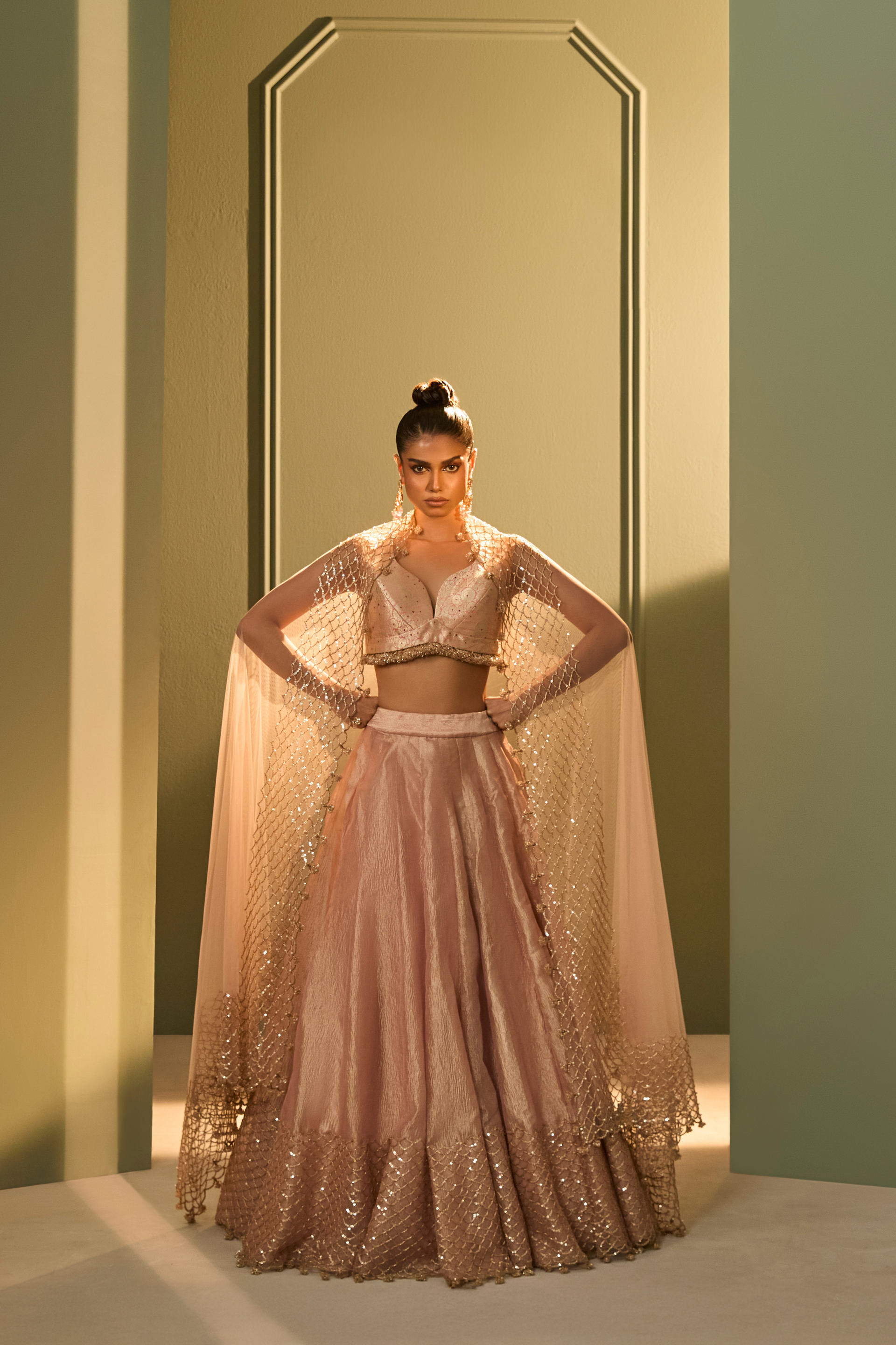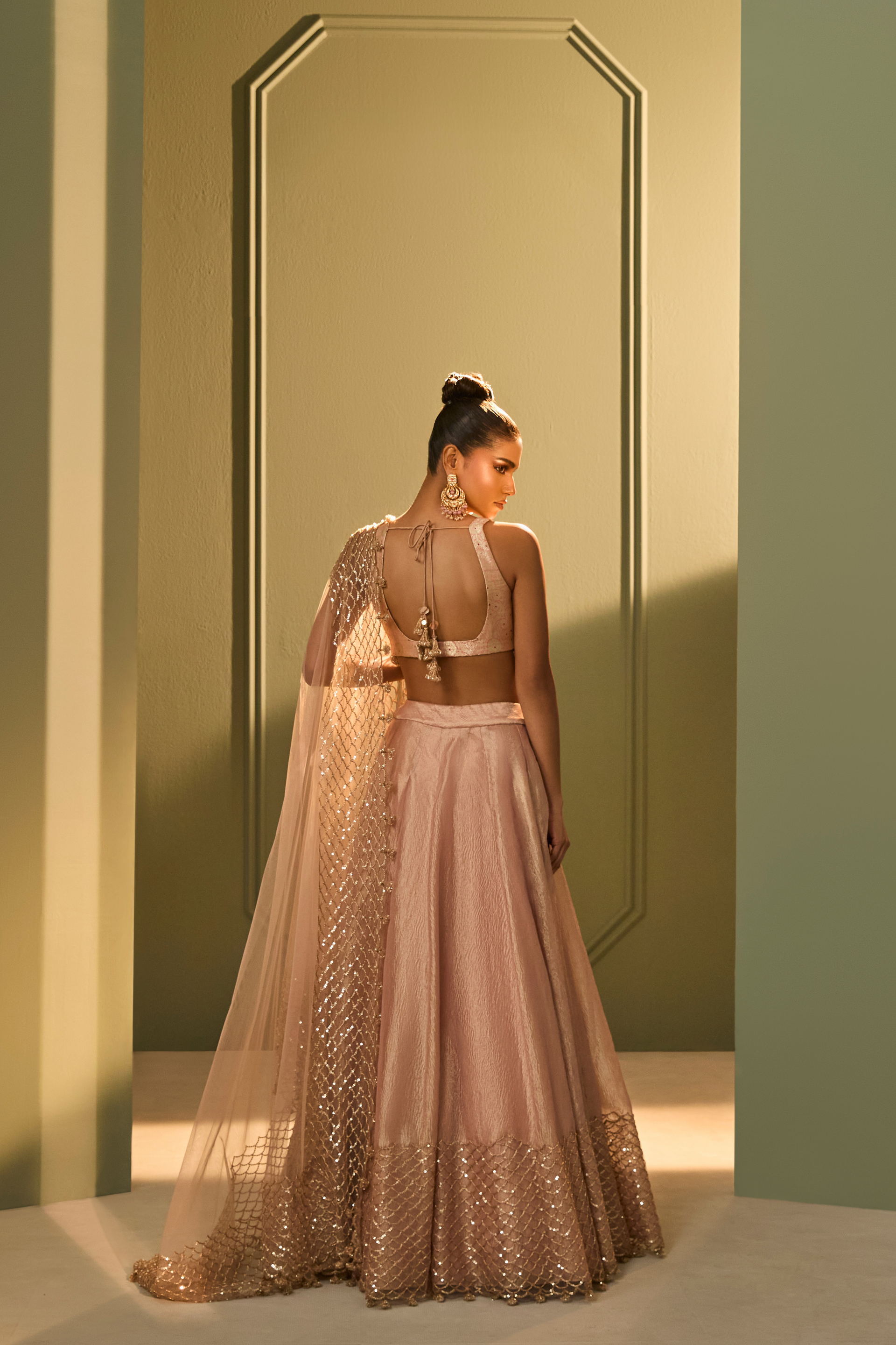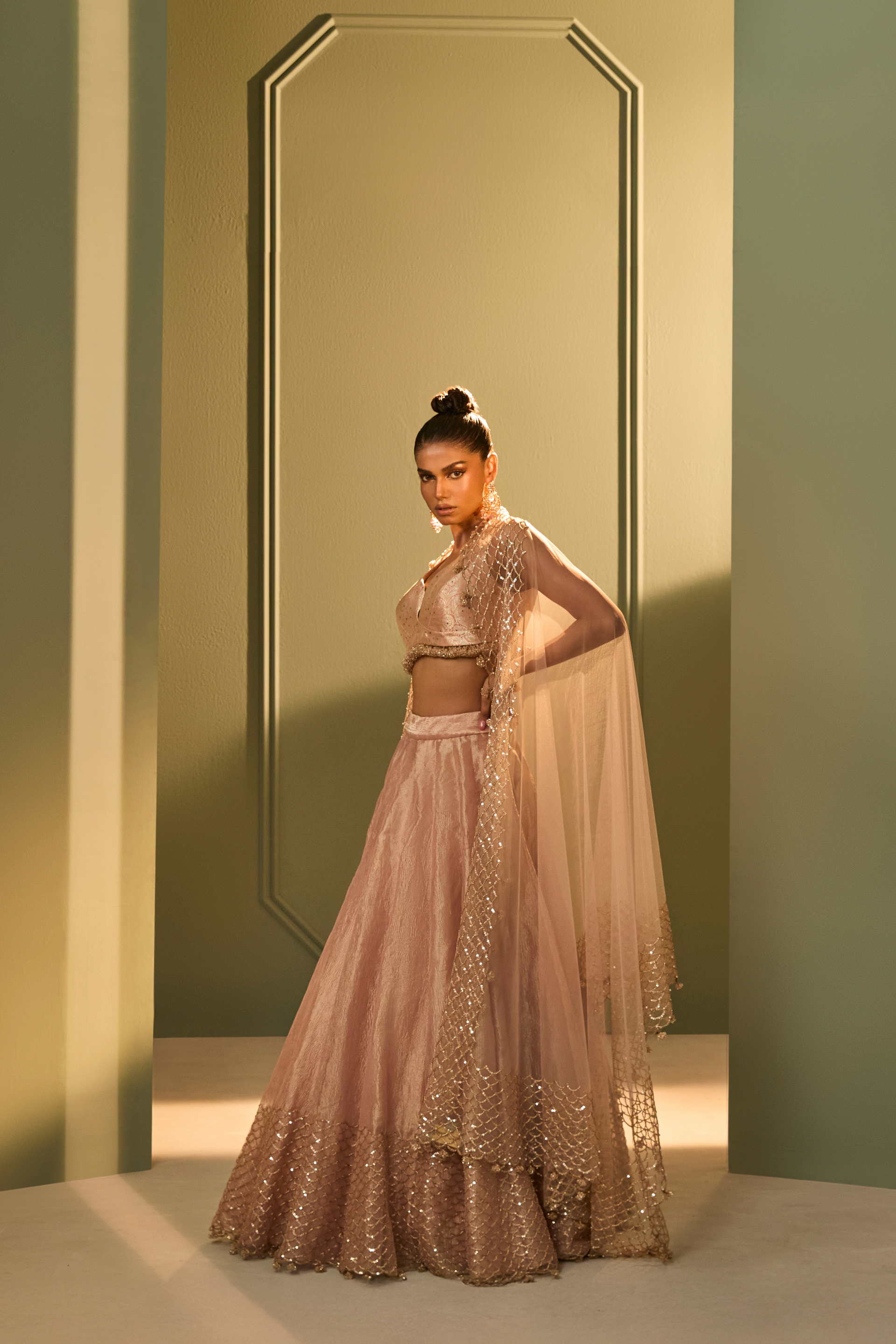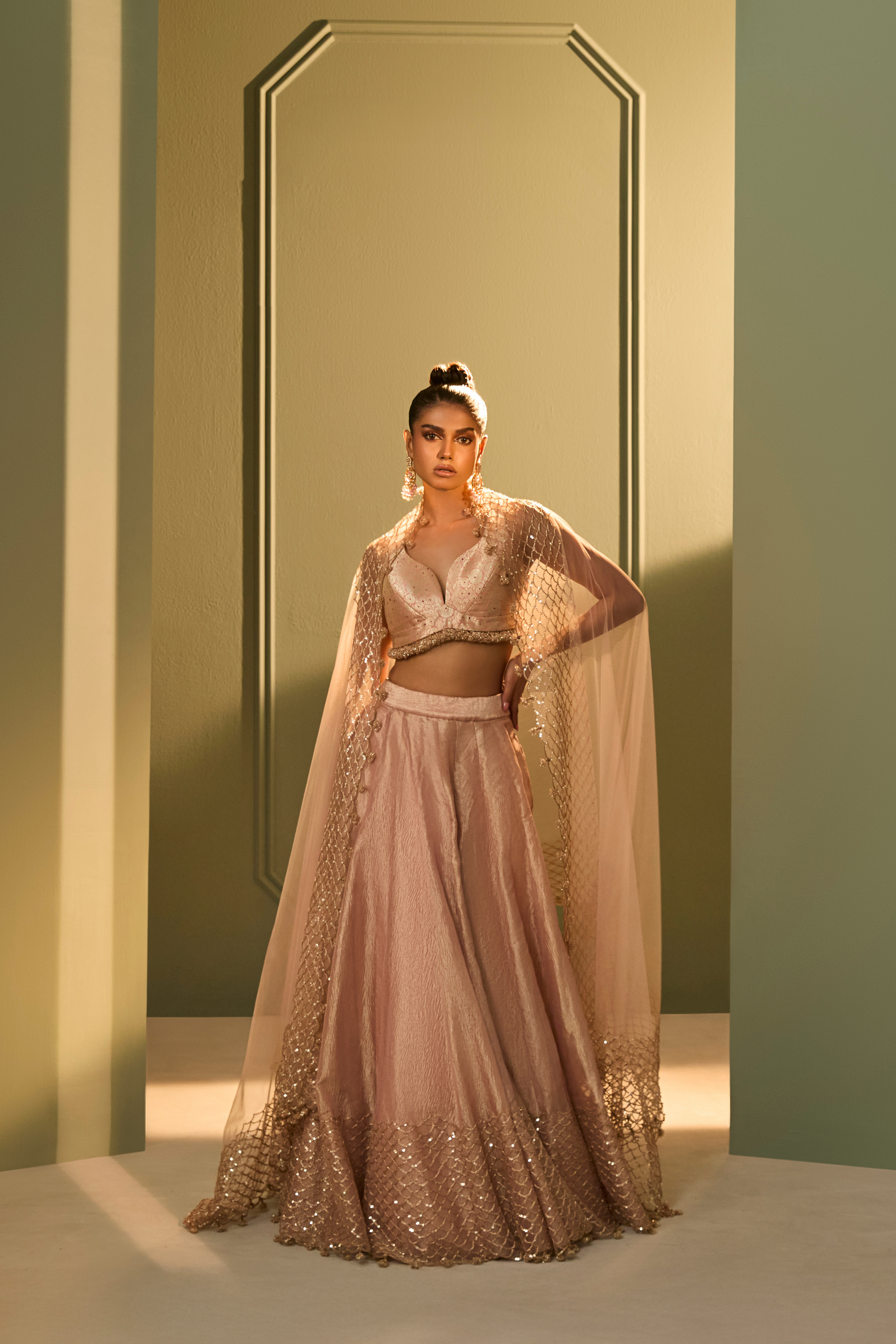 Features a structured brocade blouse with fringes detailing paired with a crushed tissue skirt, offering a balance of form and fluidity. Katdana and sequin embroidery trace delicate patterns across the skirt, mirrored in the sheer tulle dupatta with tonal handwork. A refined interpretation of festive dressing rooted in artisanal detailing.