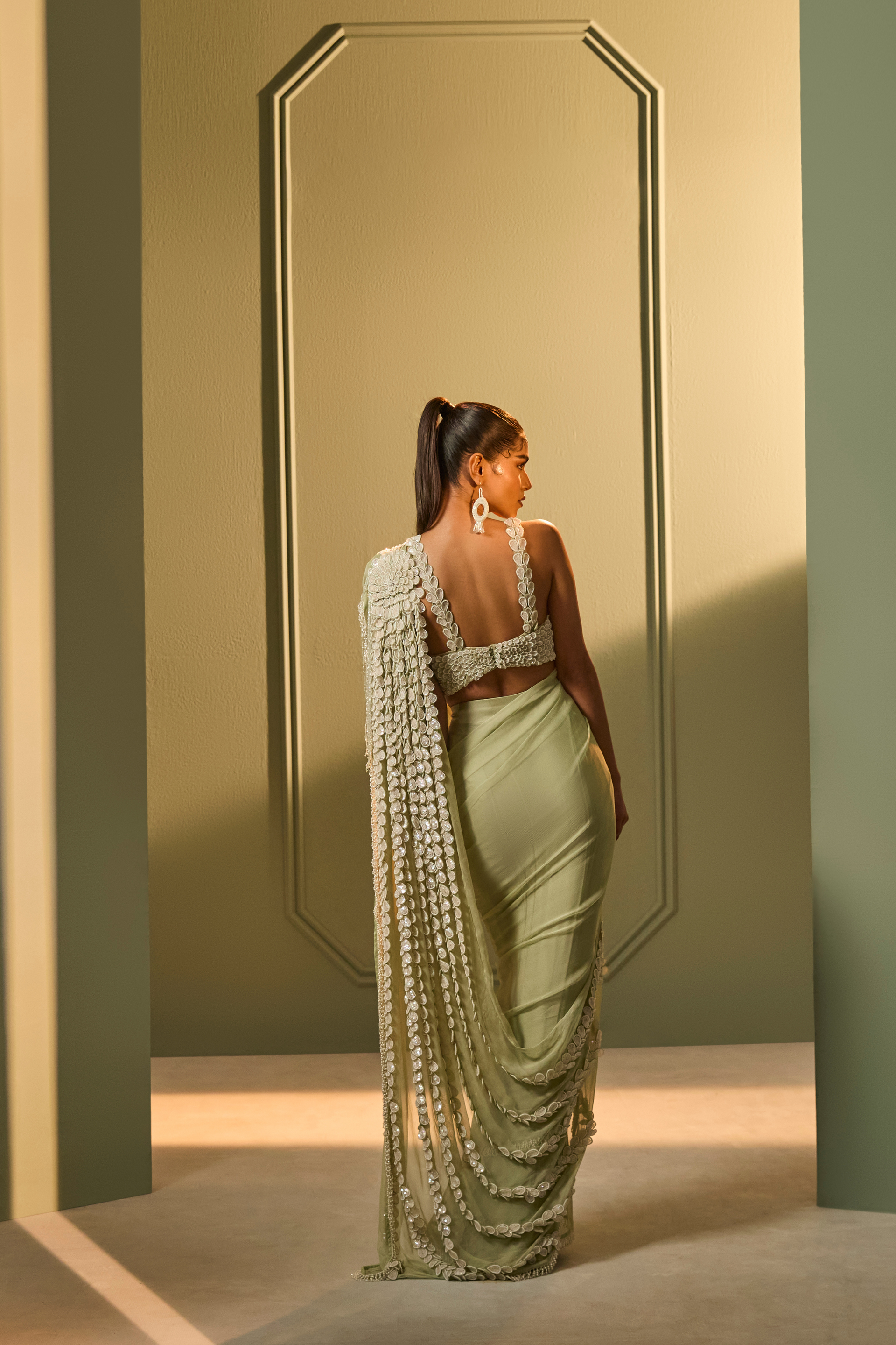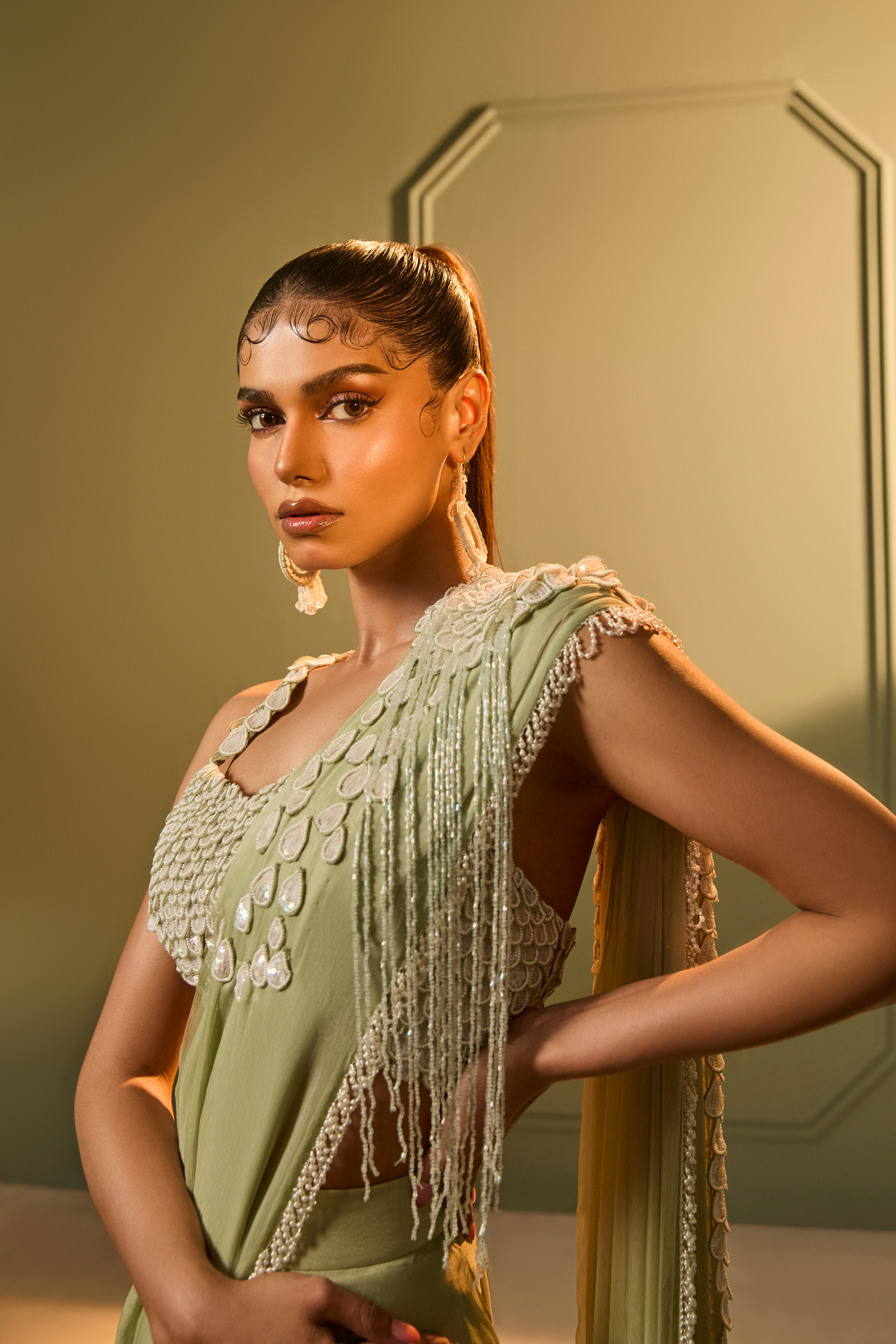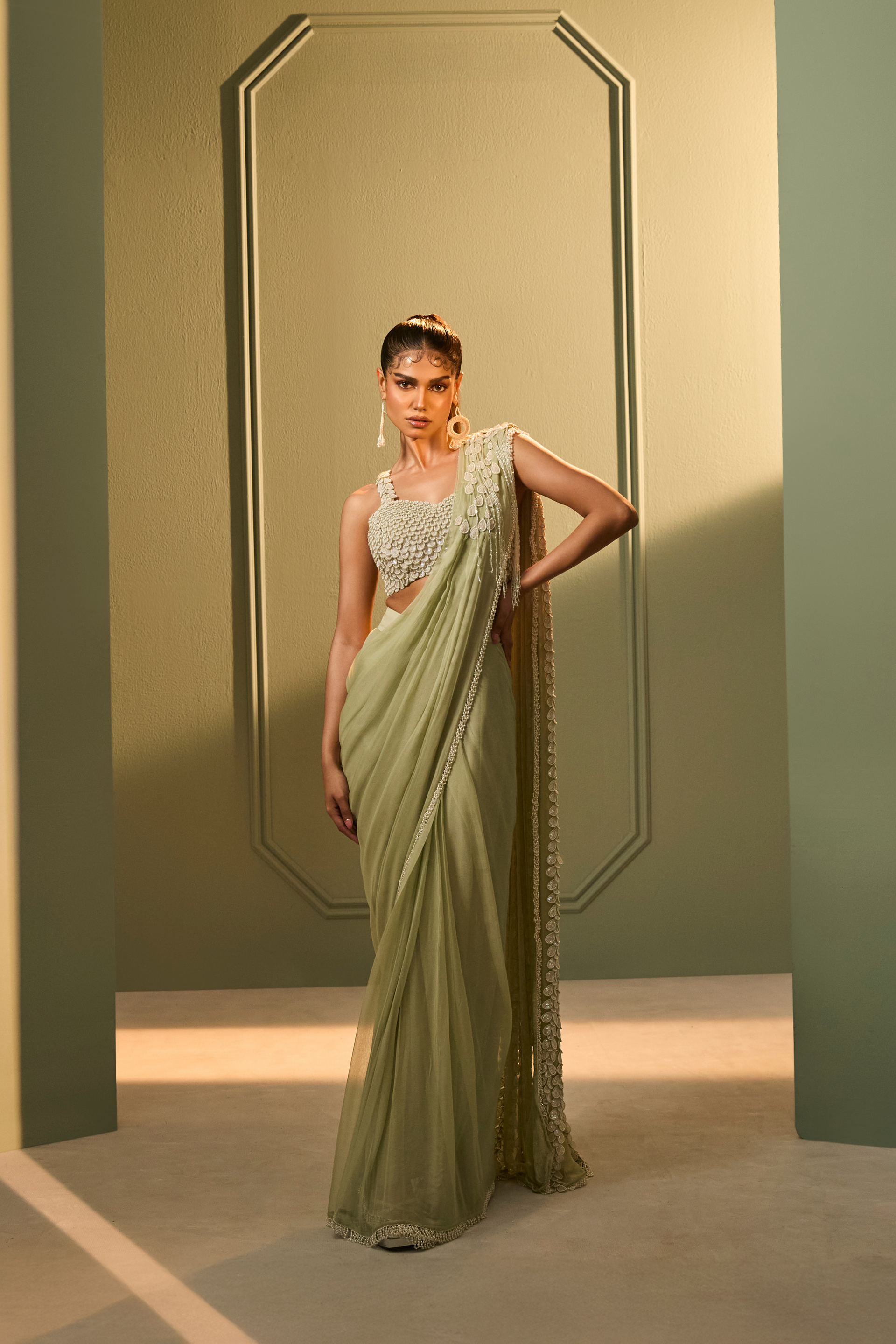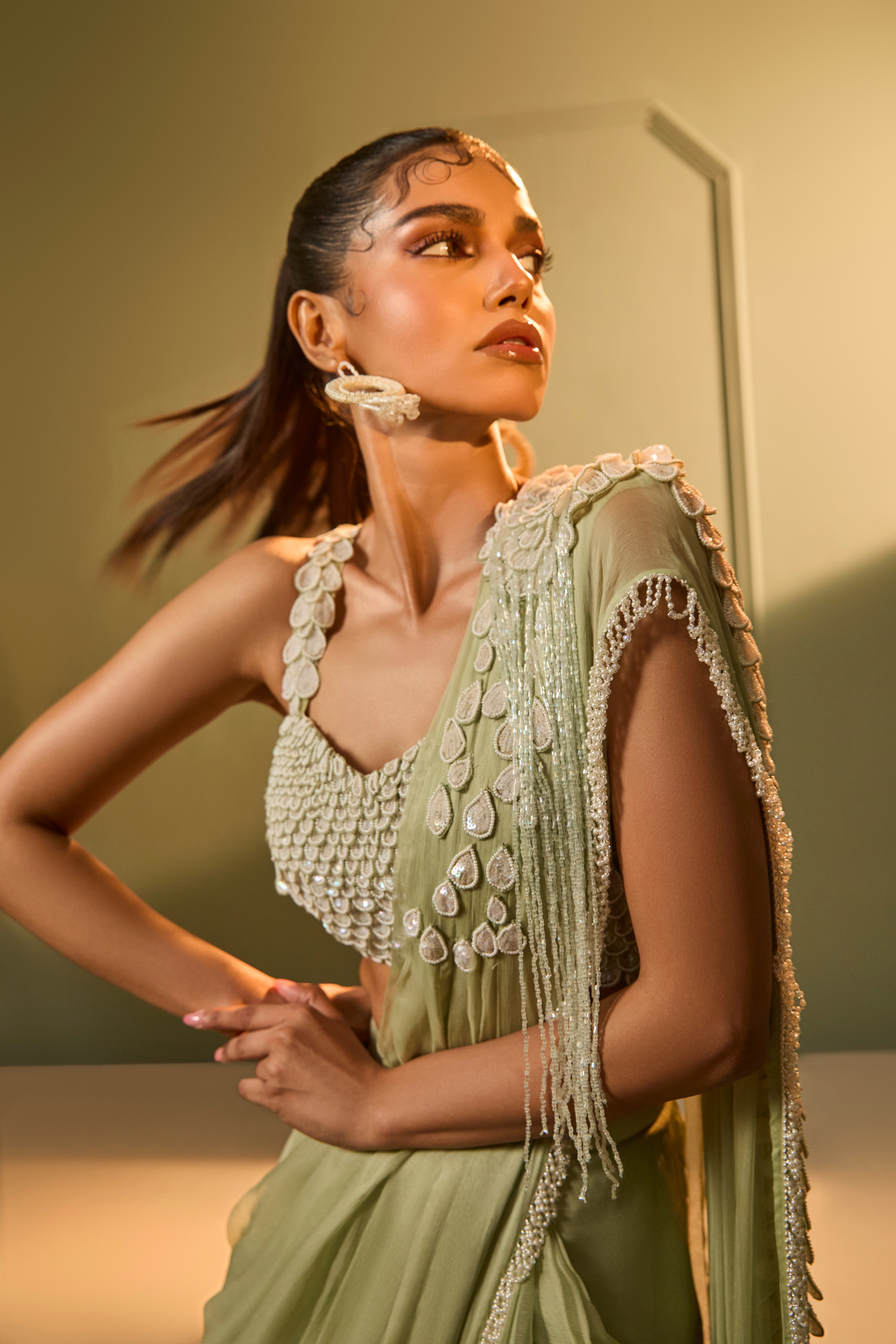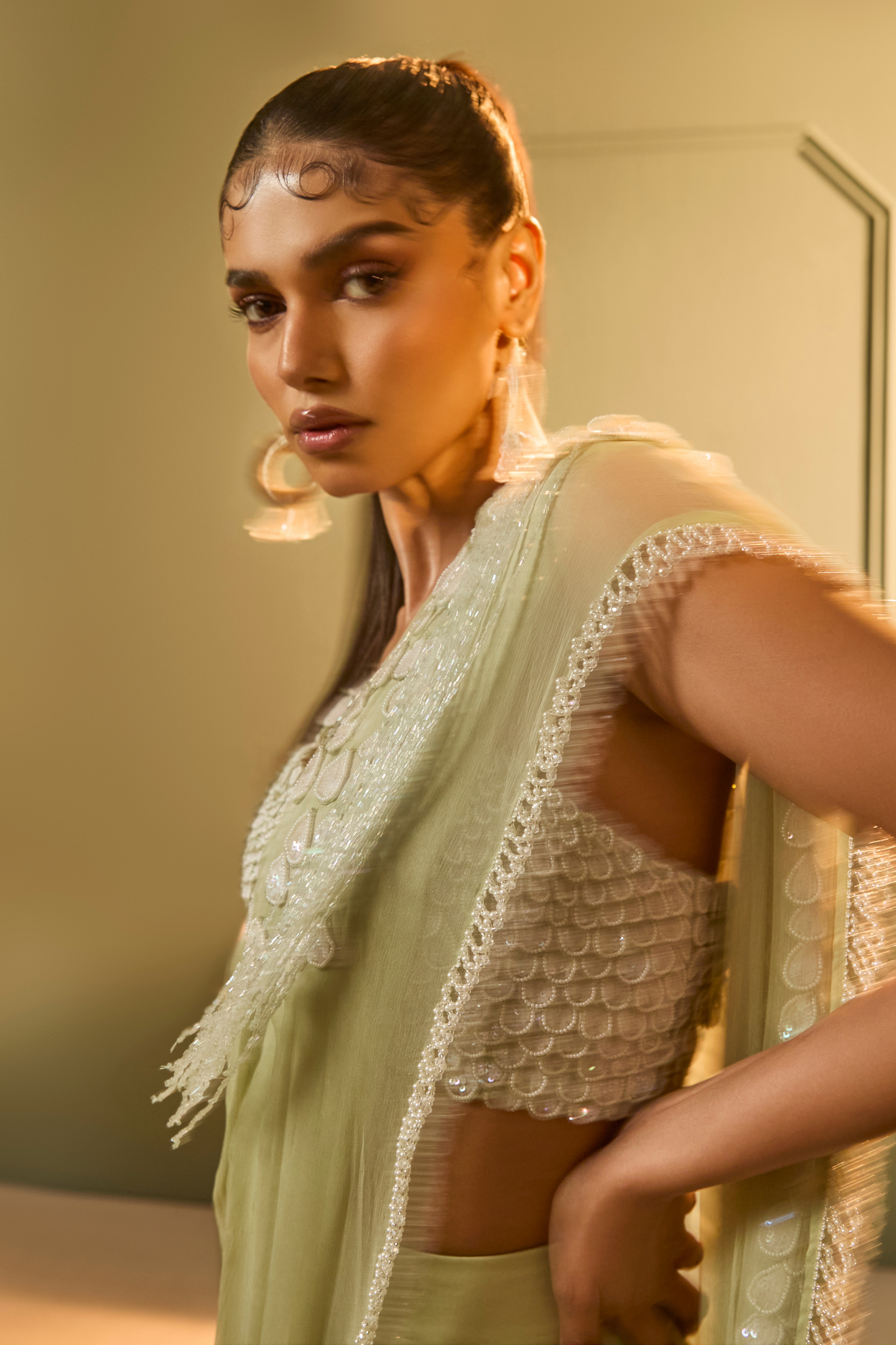 A pre-draped saree in soft mint chiffon, tailored for a fluid, effortless drape. Both pieces feature delicate pearl embroidery in a cascading drop style. The saree’s soft pleats and fluid construction offer ease, while the blouse anchors the look with quiet intricacy.
