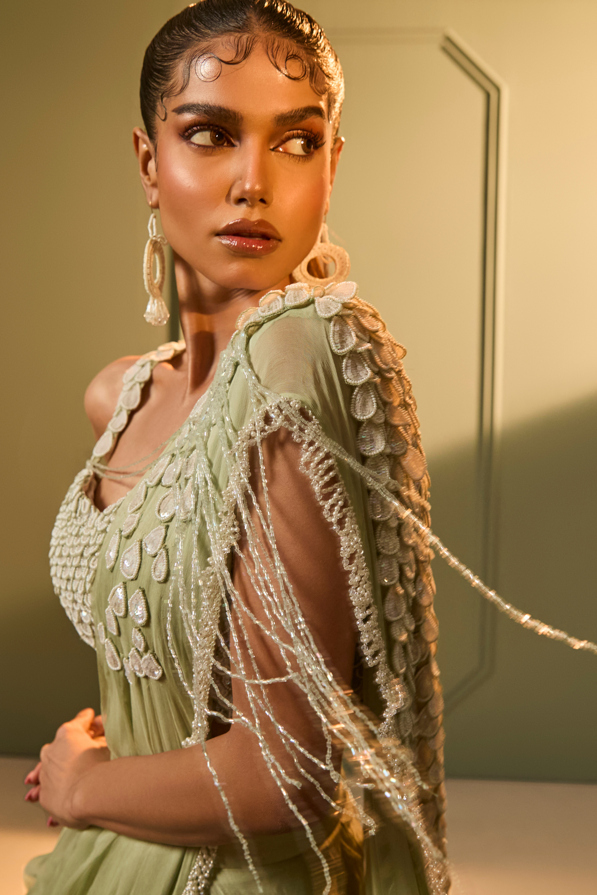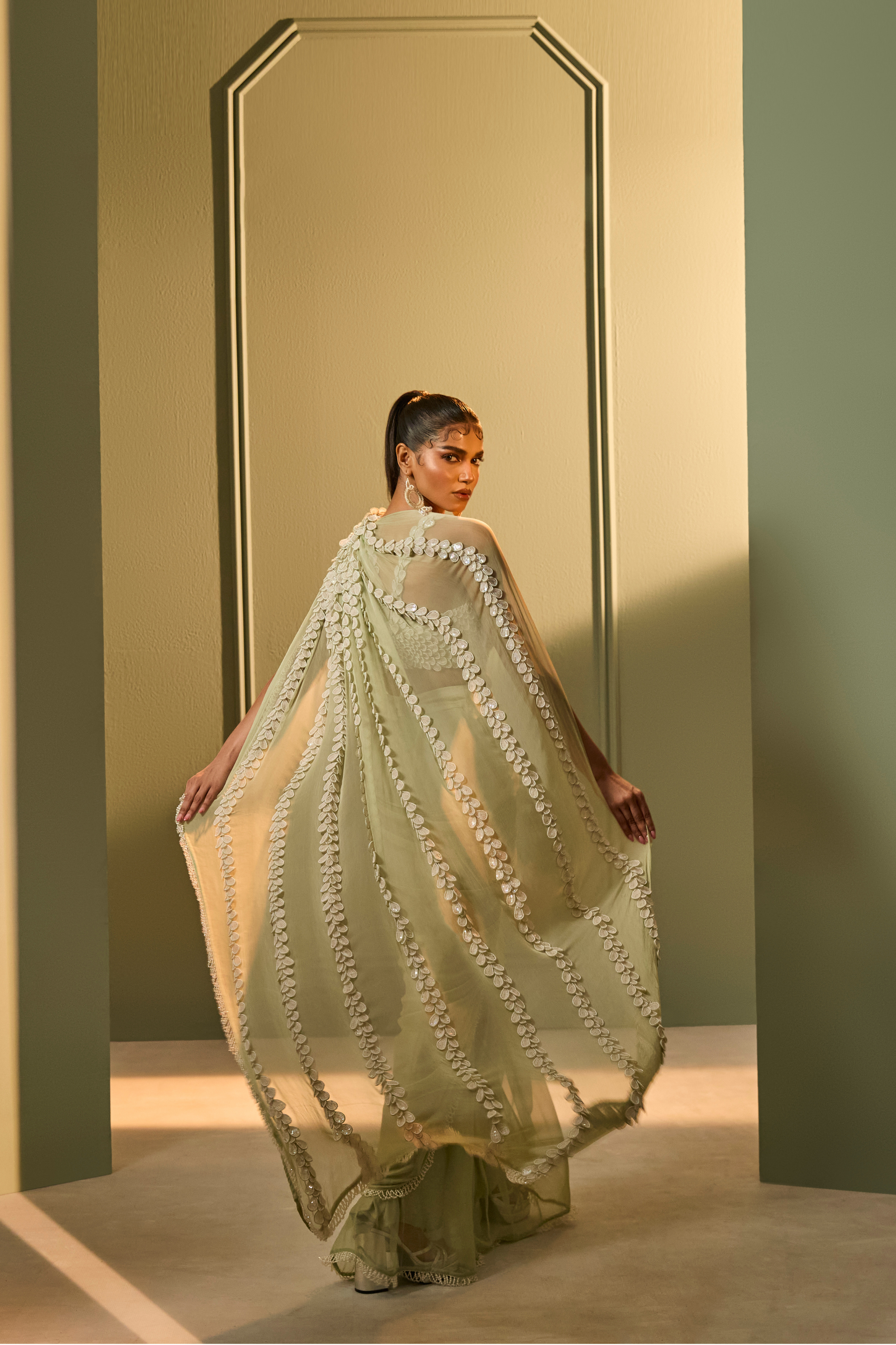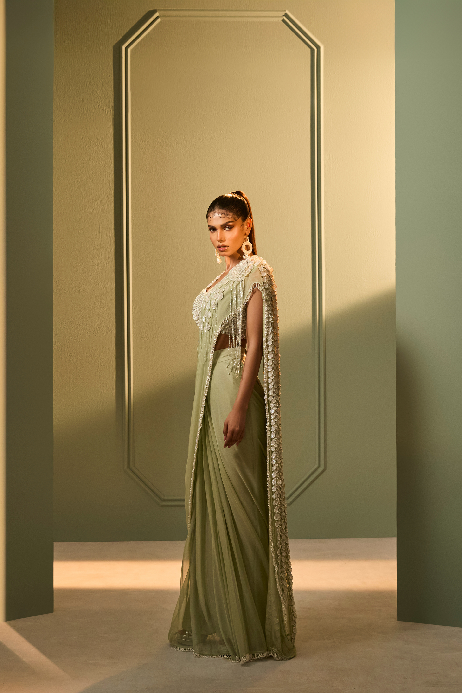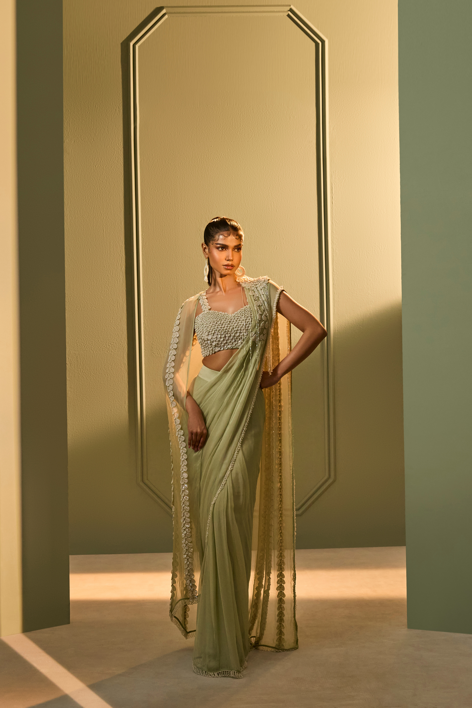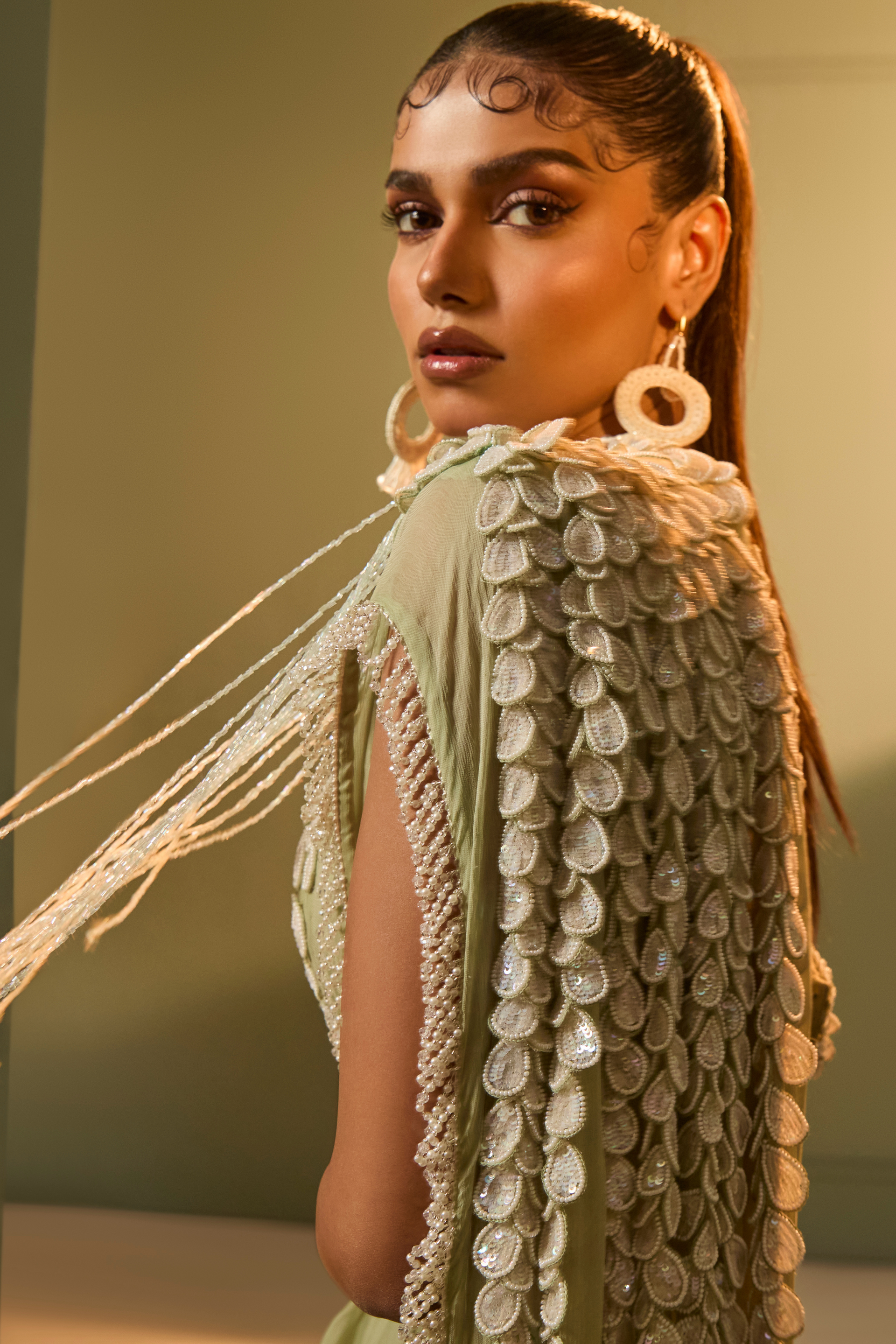 A pre-draped saree in soft mint chiffon, tailored for a fluid, effortless drape. Both pieces feature delicate pearl embroidery in a cascading drop style. The saree’s soft pleats and fluid construction offer ease, while the blouse anchors the look with quiet intricacy.