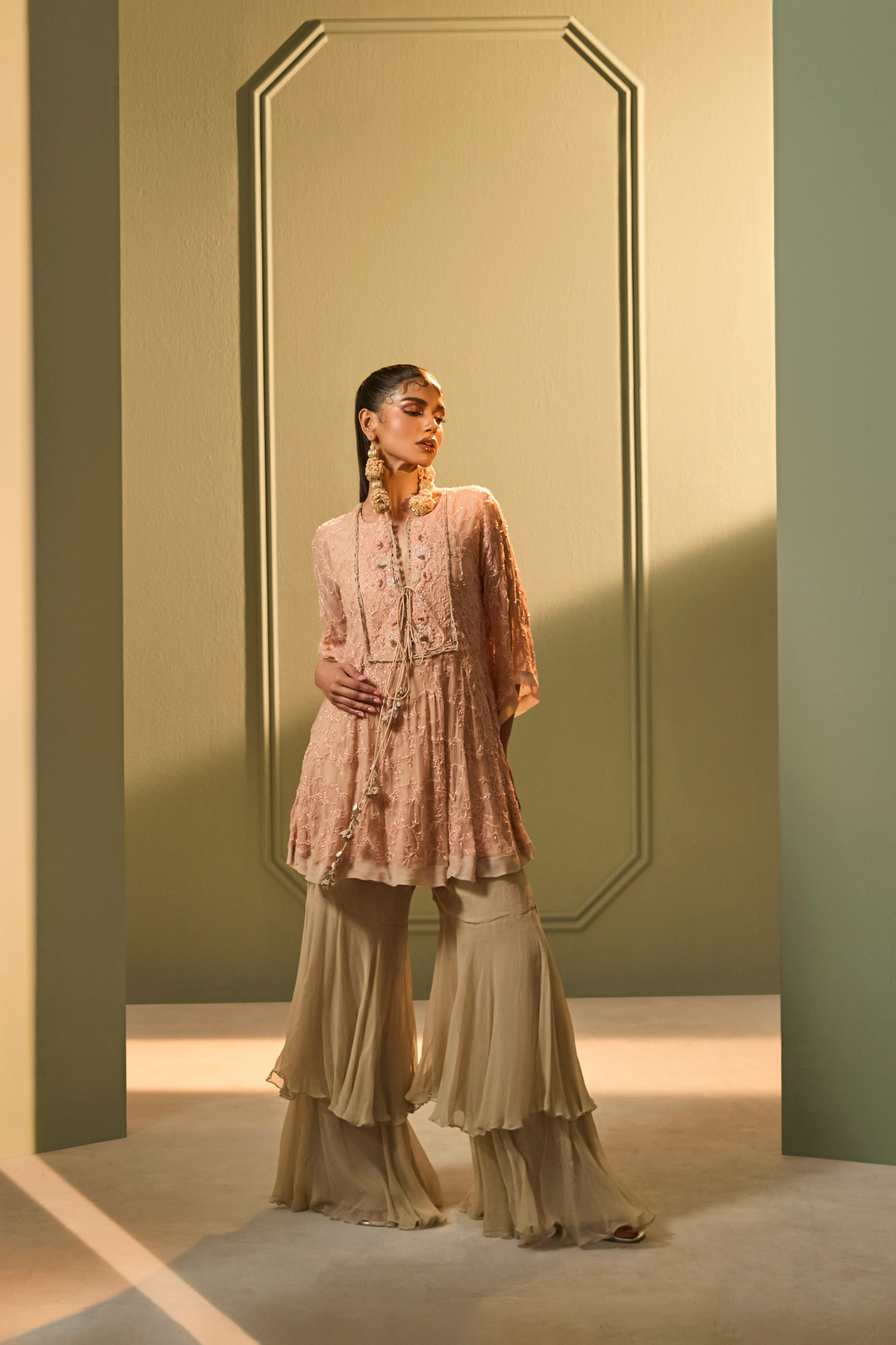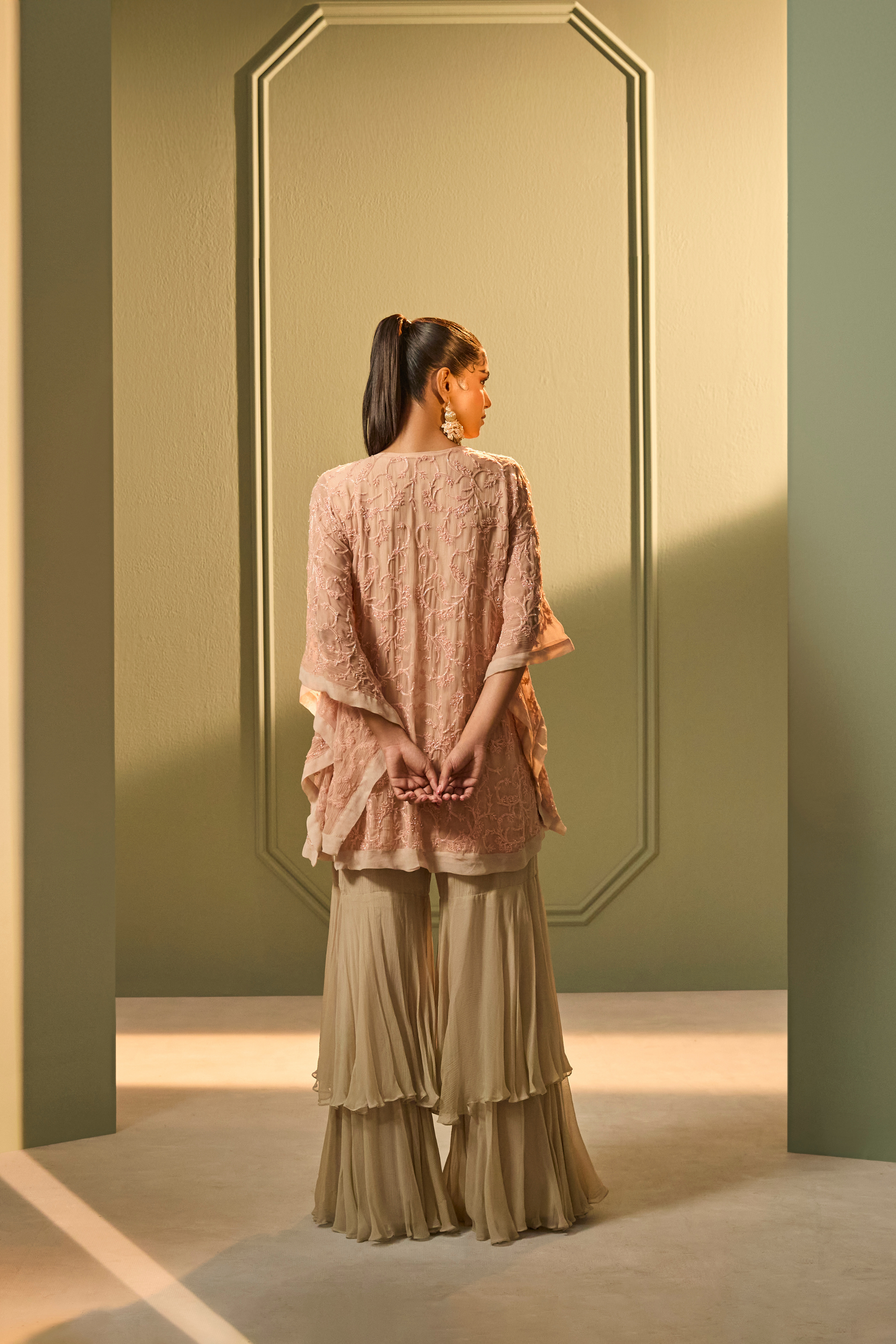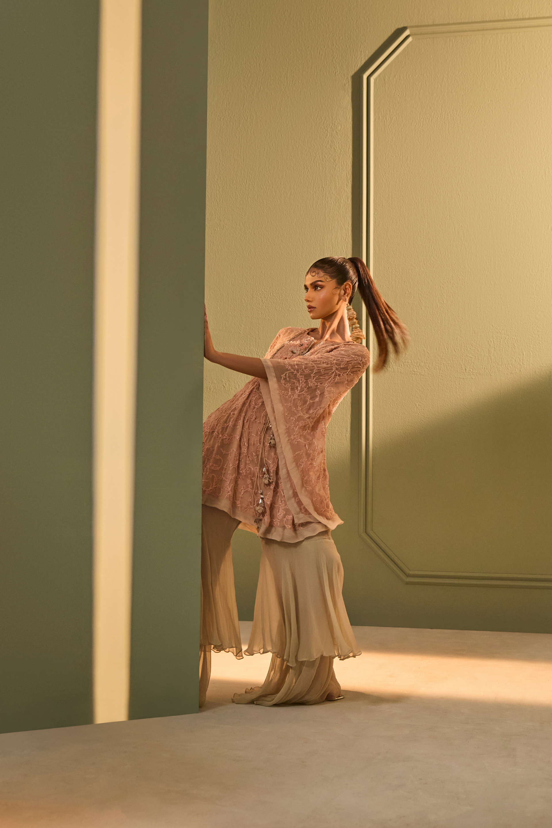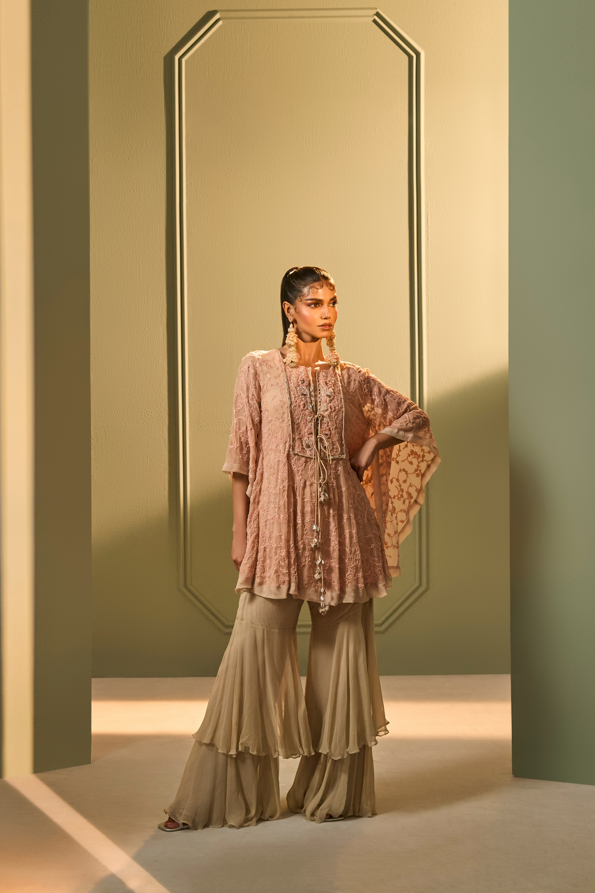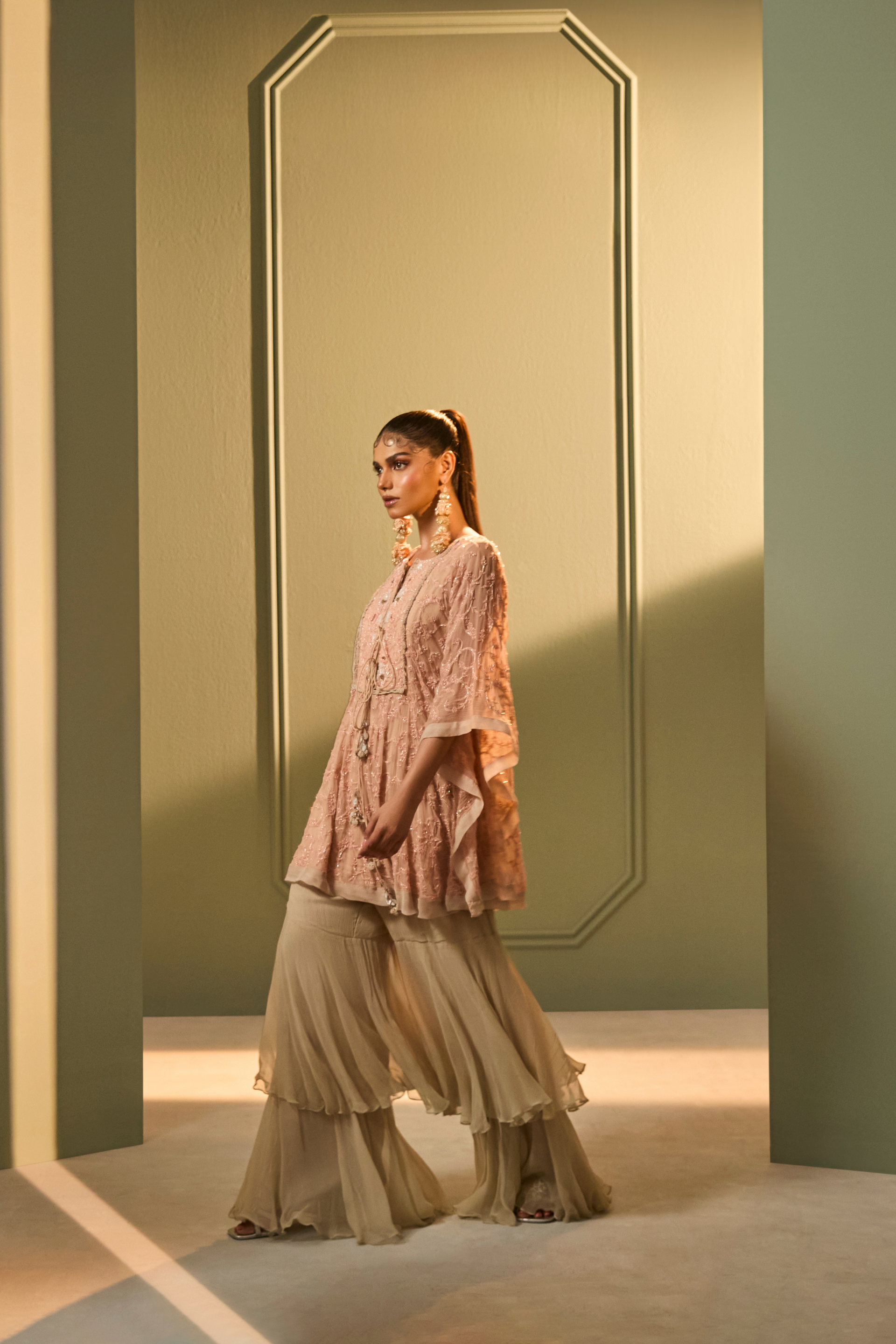 Features a relaxed kaftan silhouette in coral peach, embroidered with tonal threadwork, beads, and katdana for a layered, textural finish. Paired with tiered chiffon sharara pants that offer graceful movement, this set is designed for lightness, ease, and day-to-dusk celebrations.