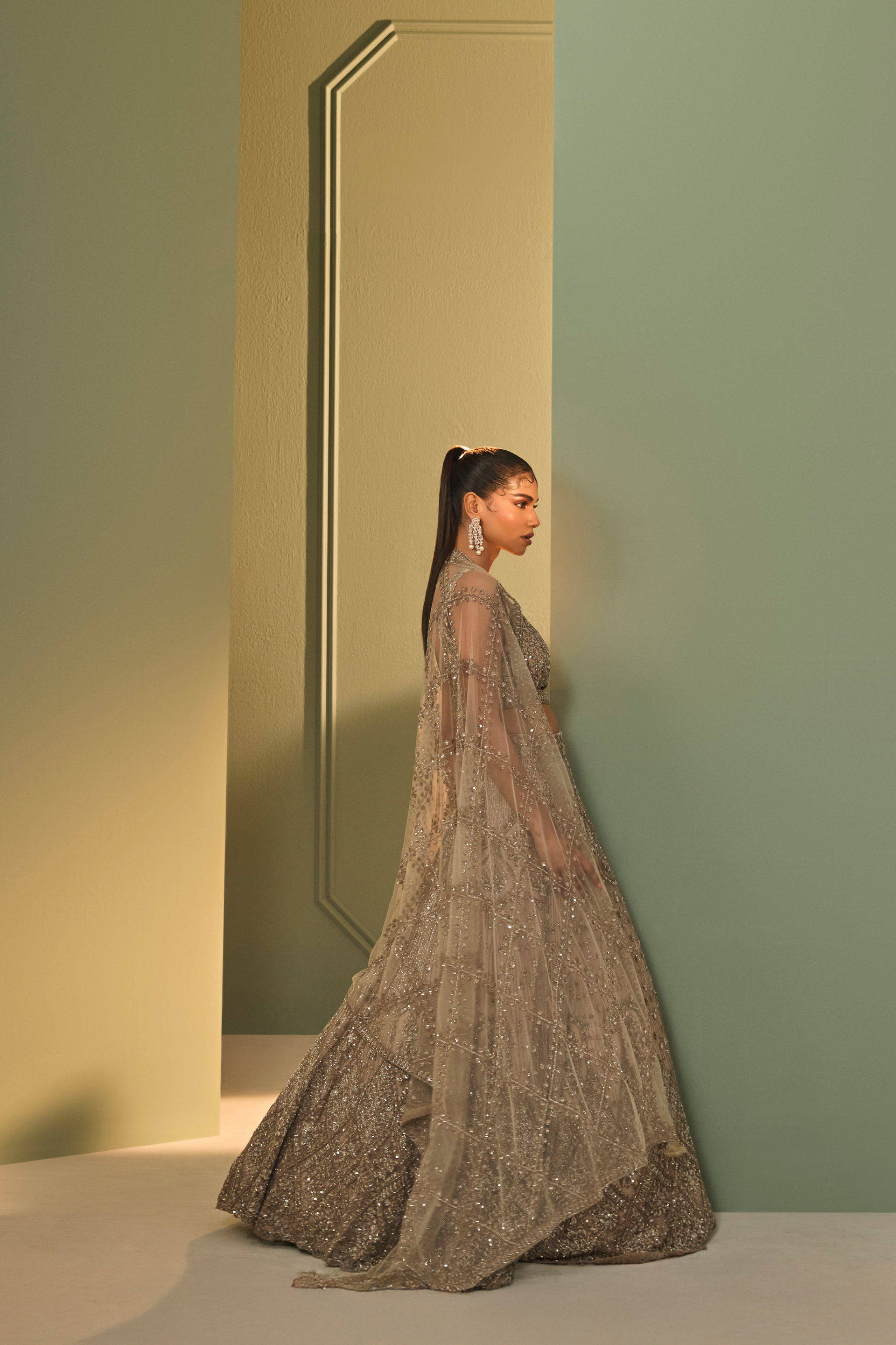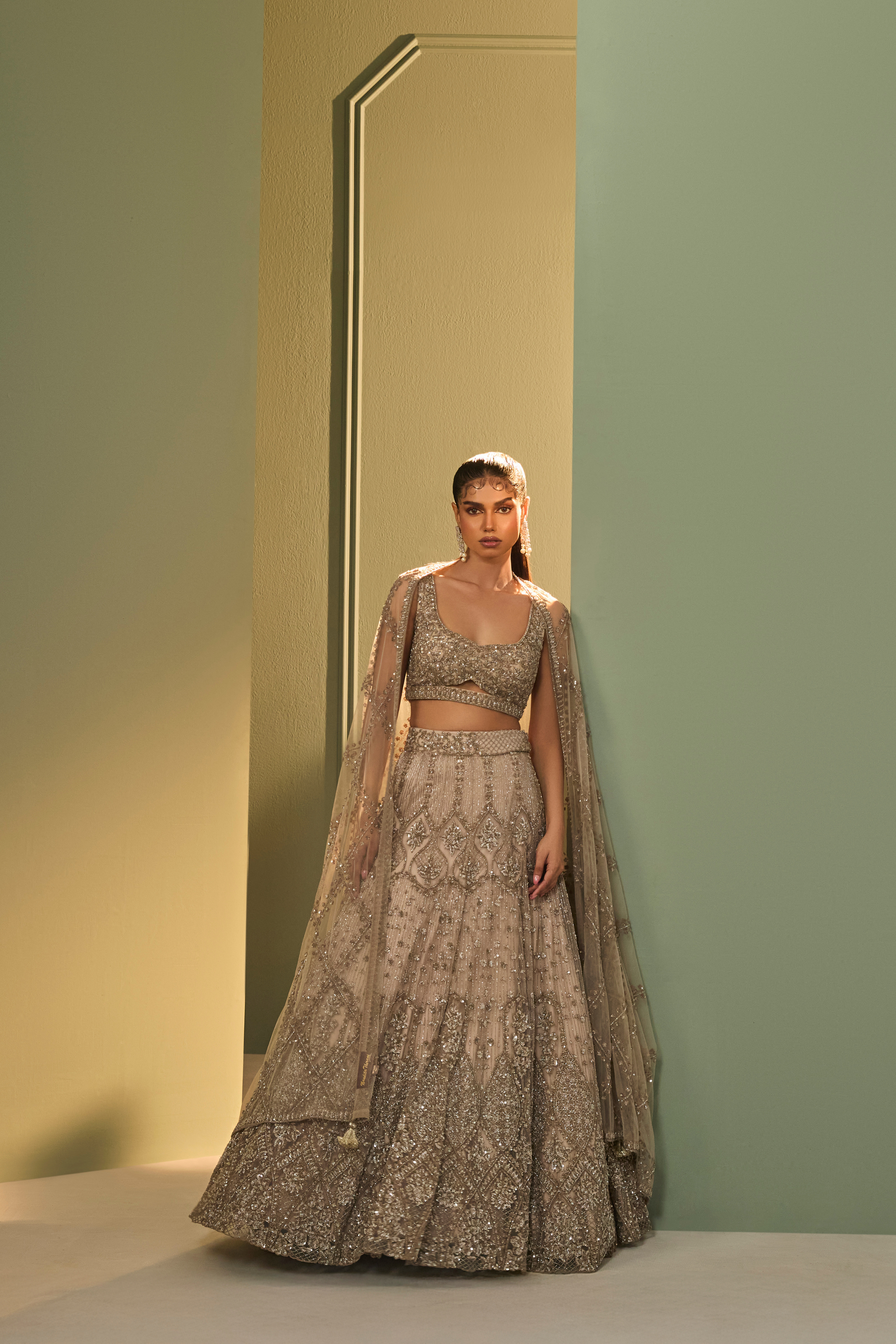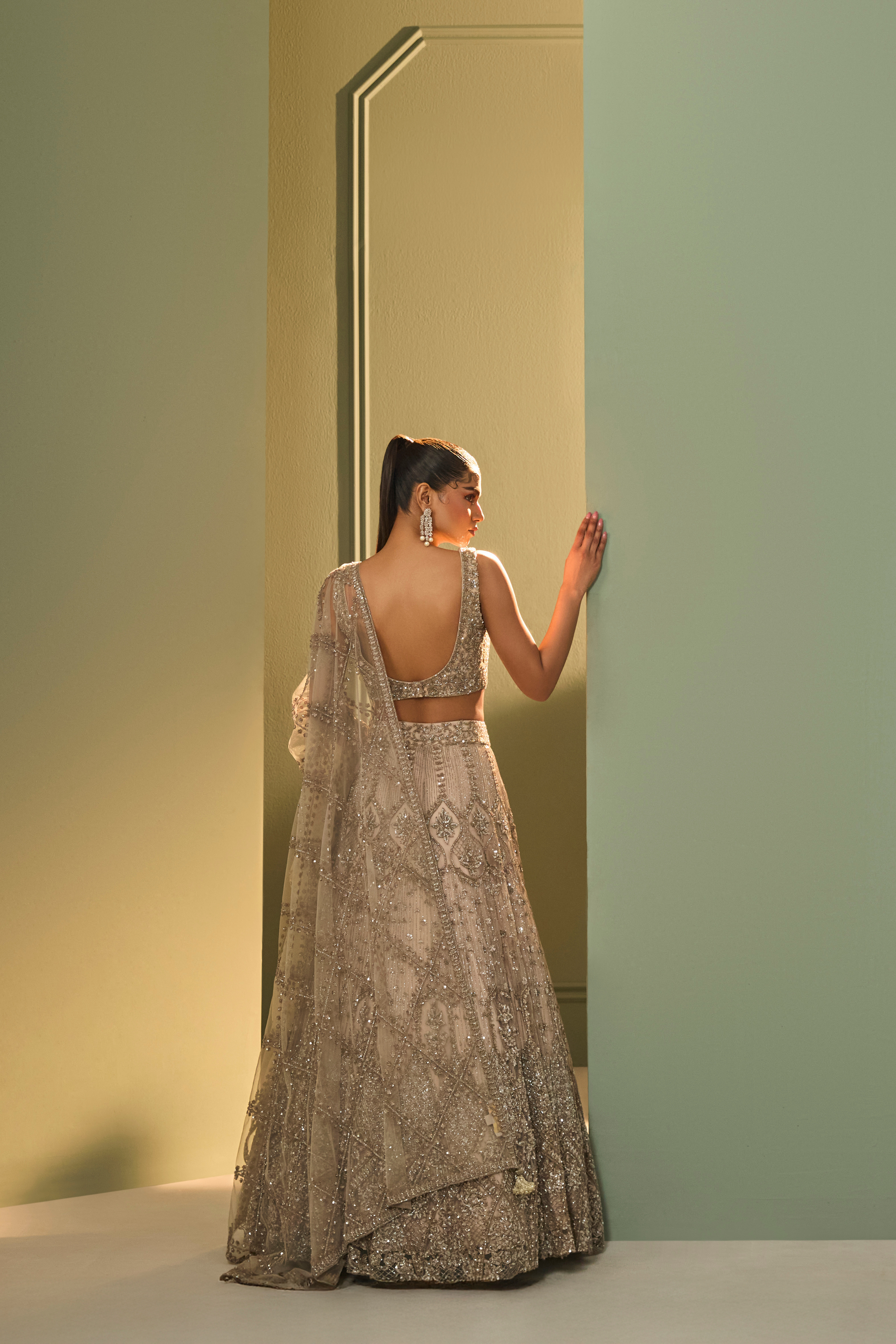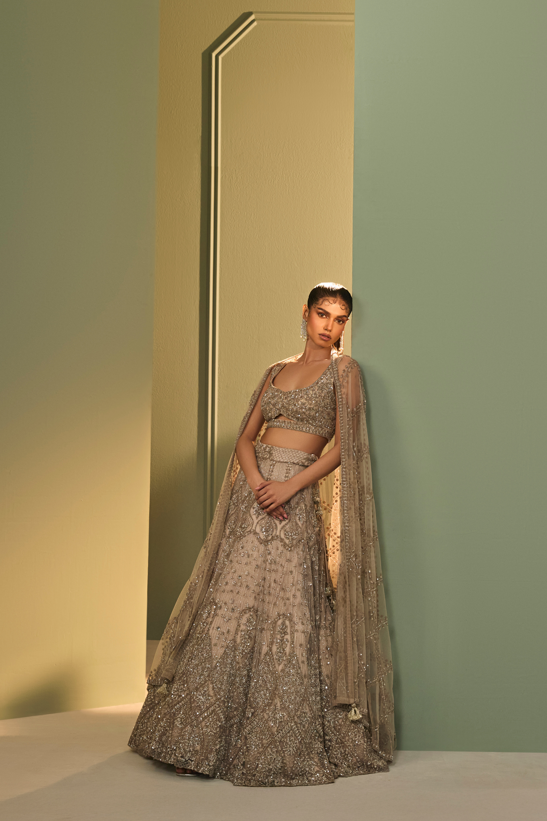 The Nayra Lehenga Set features a flowing lehenga in soft nude grey, embroidered with tonal sequins and katdana in intricate patterns. Paired with a matching cut out blouse and an embellished tulle dupatta, this ensemble balances glamour and softness with quiet elegance.