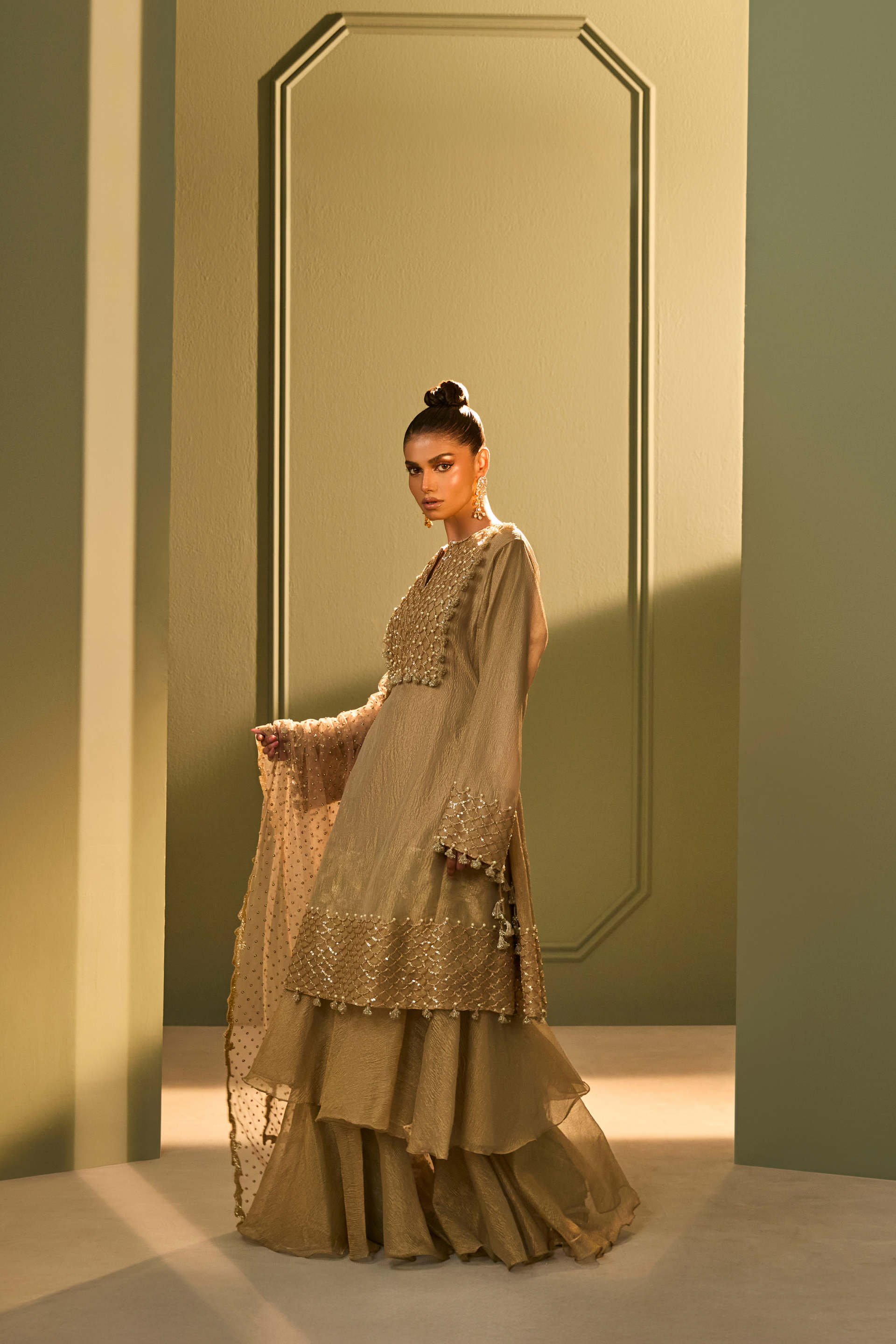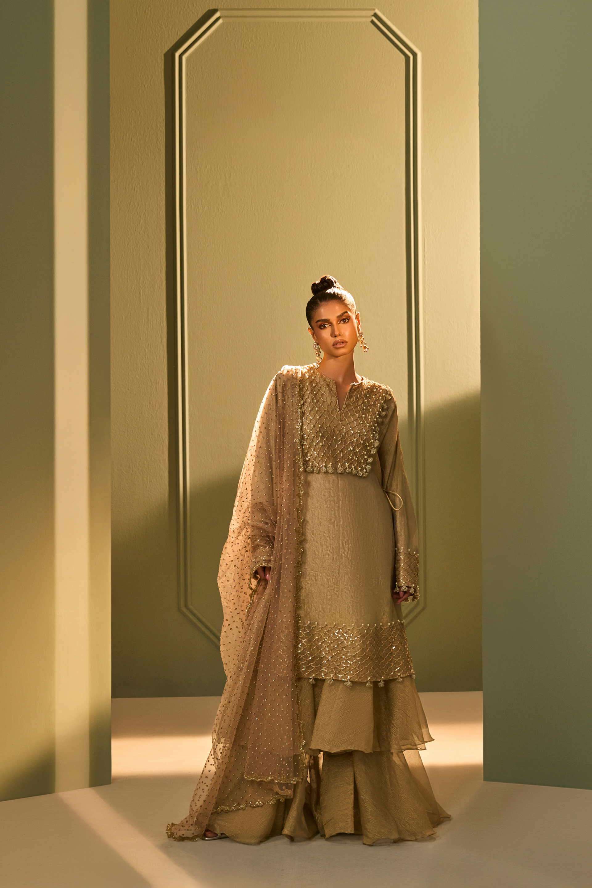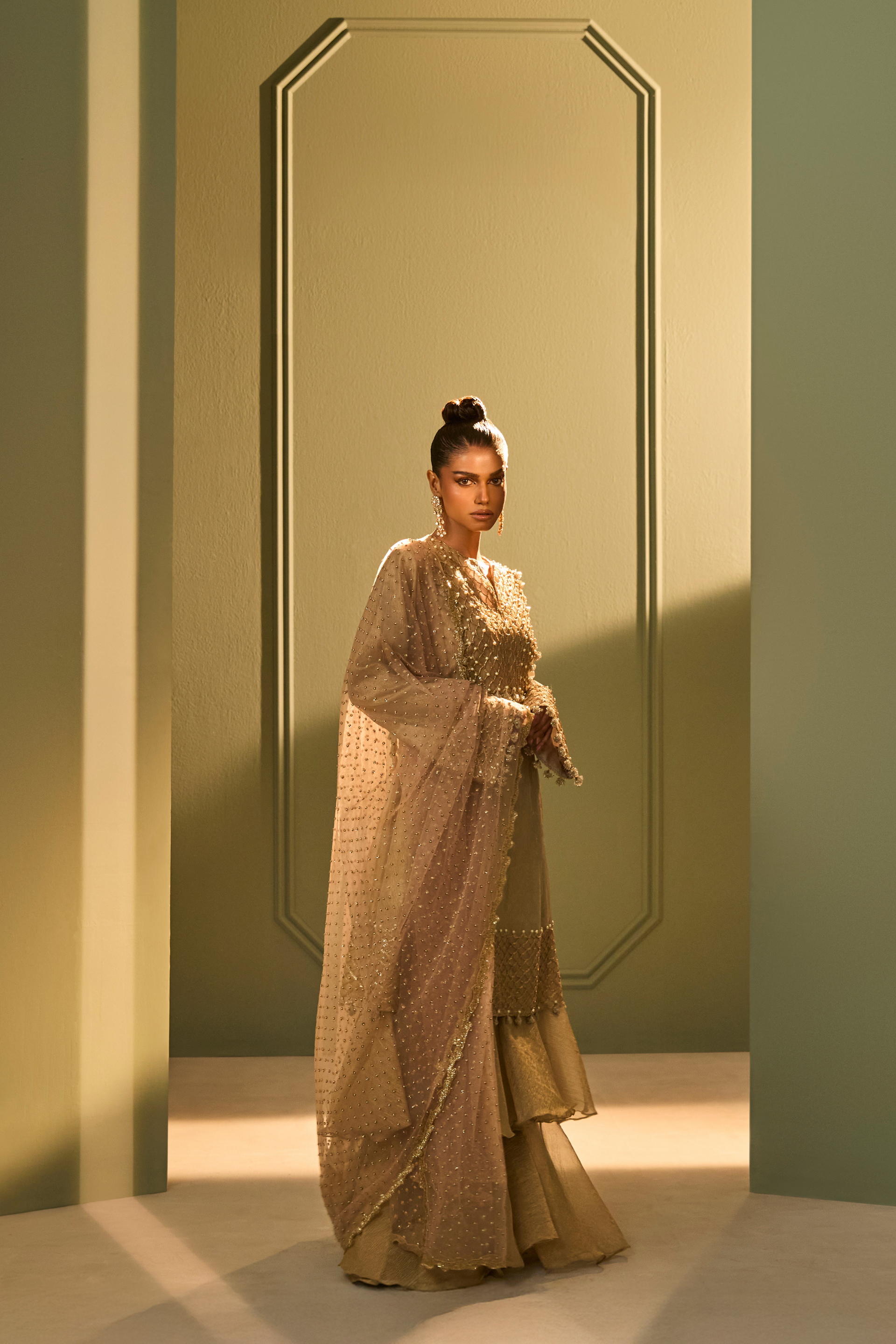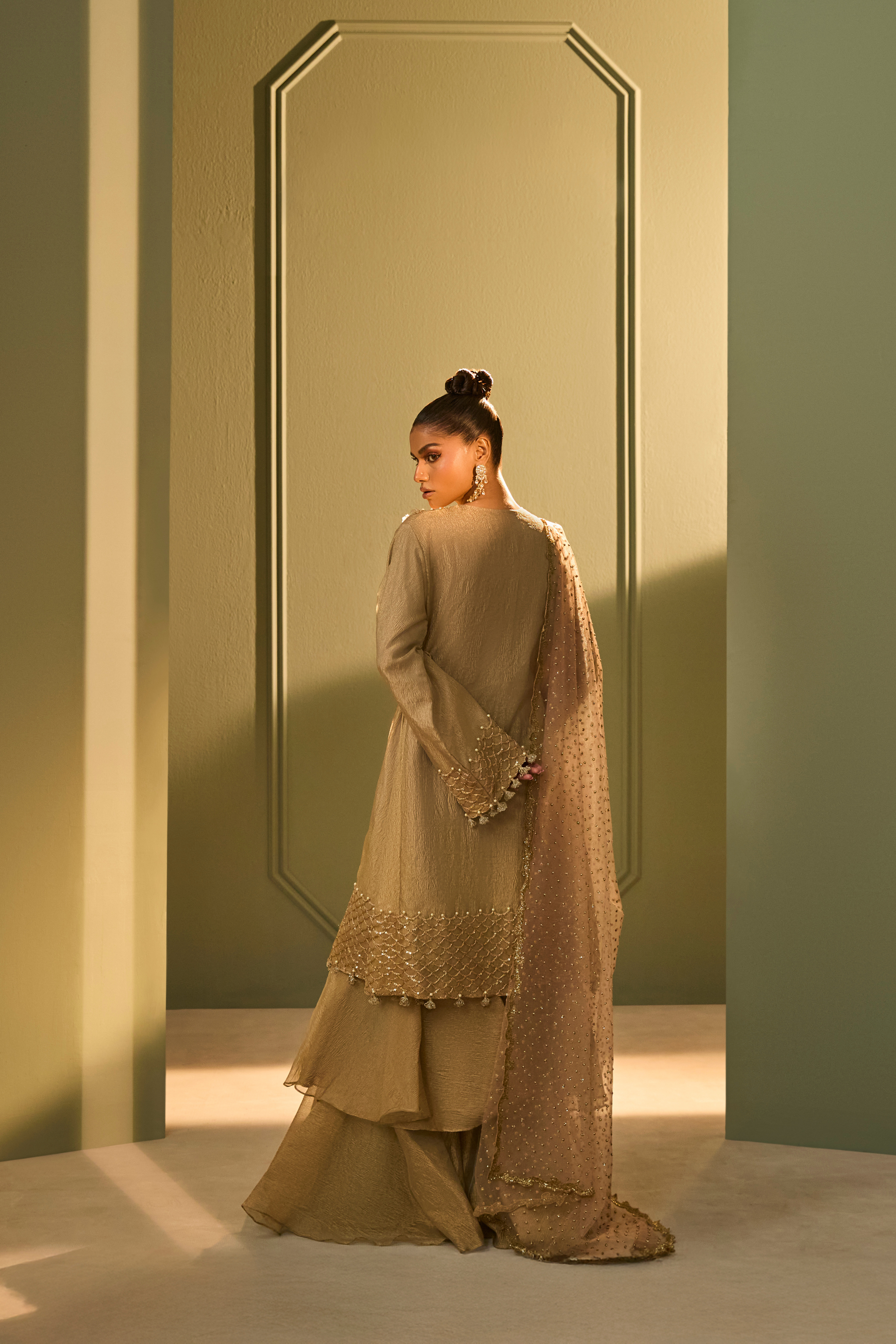 A relaxed-fit kurta in crushed tissue, structured yet fluid, with tonal sequin and katdana embroidery that offers a soft shimmer. Paired with a tiered sharara for graceful movement, and a heavily embellished tulle dupatta layered in intricate handwork. Rendered in a quiet gold palette, this set is crafted for intimate festivities with understated elegance.