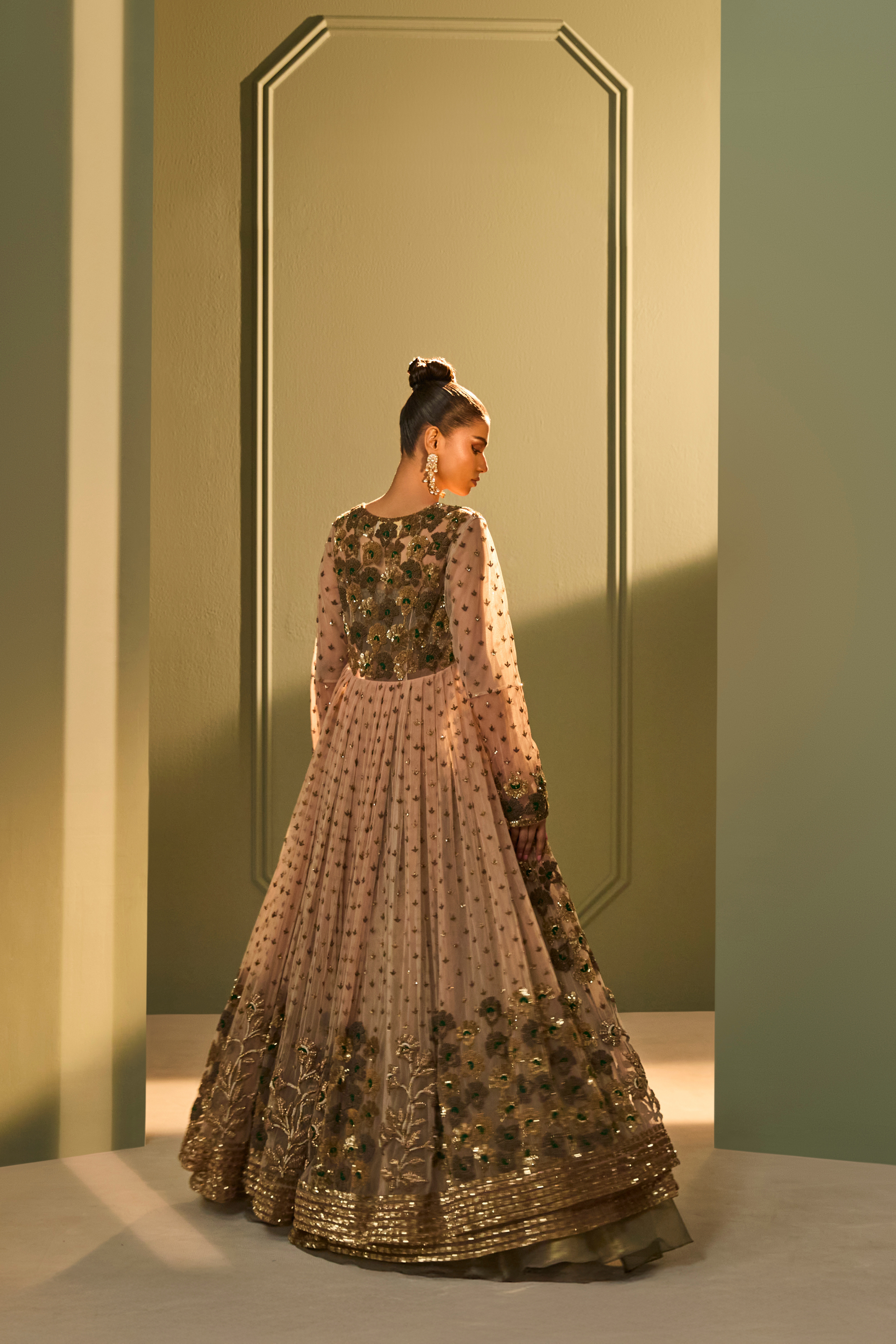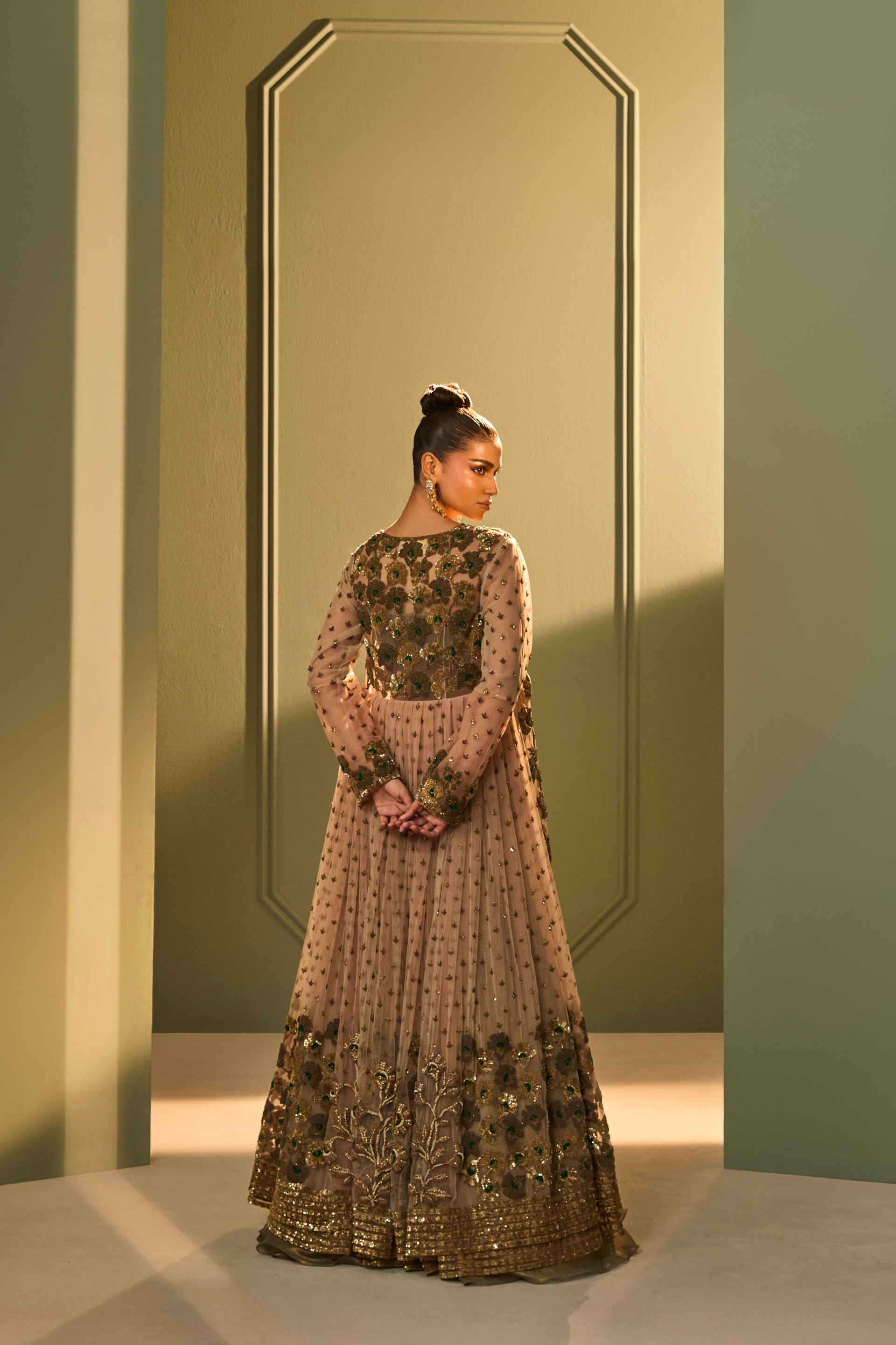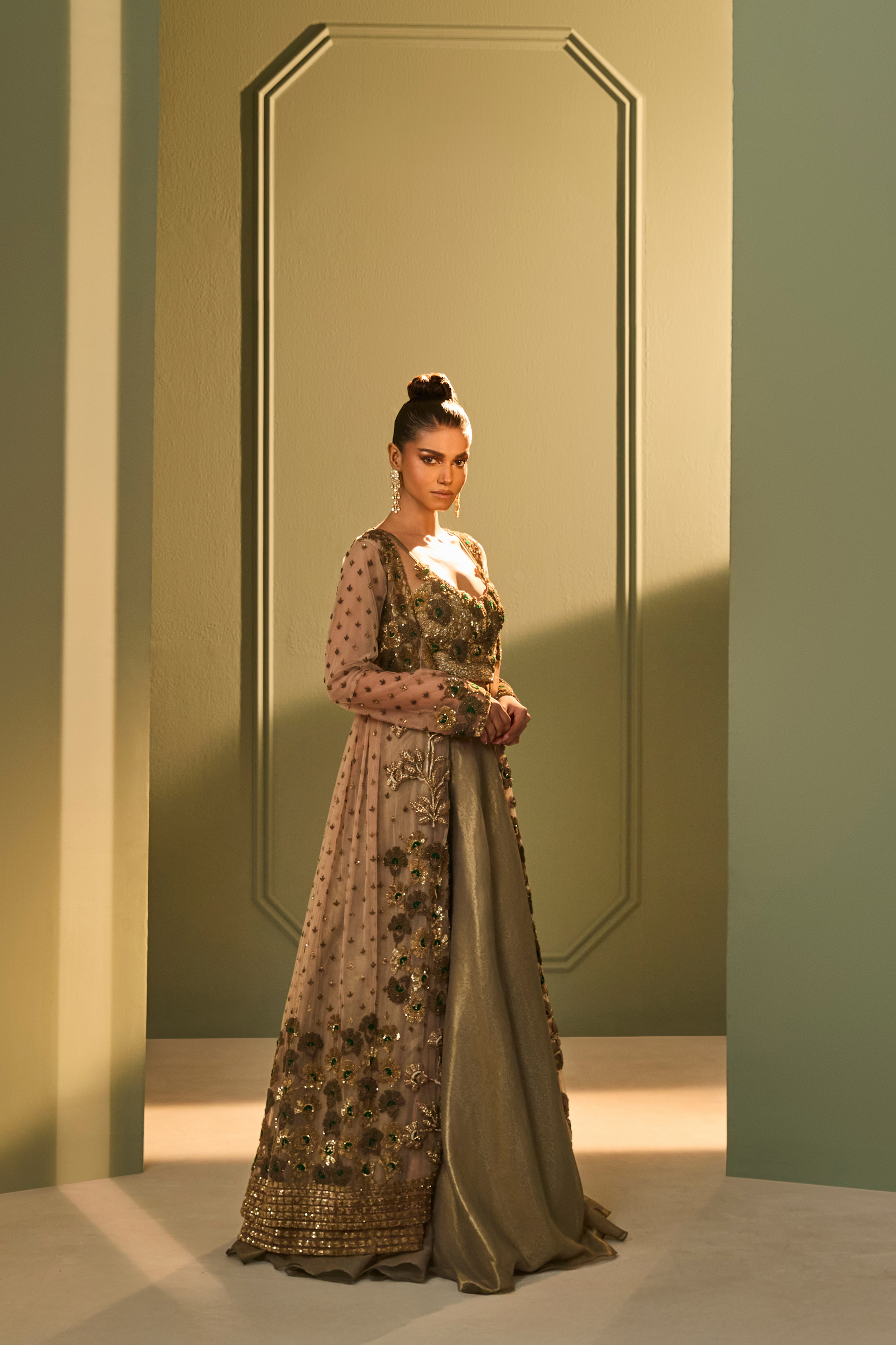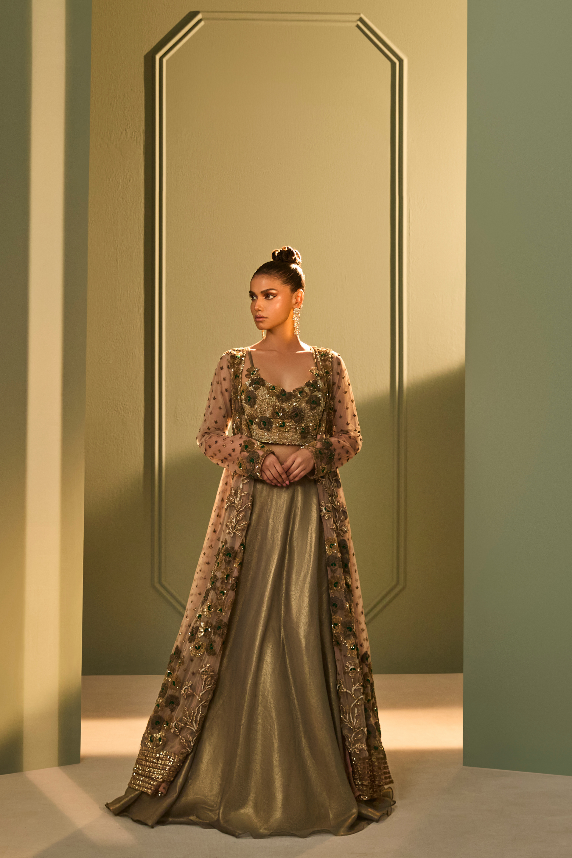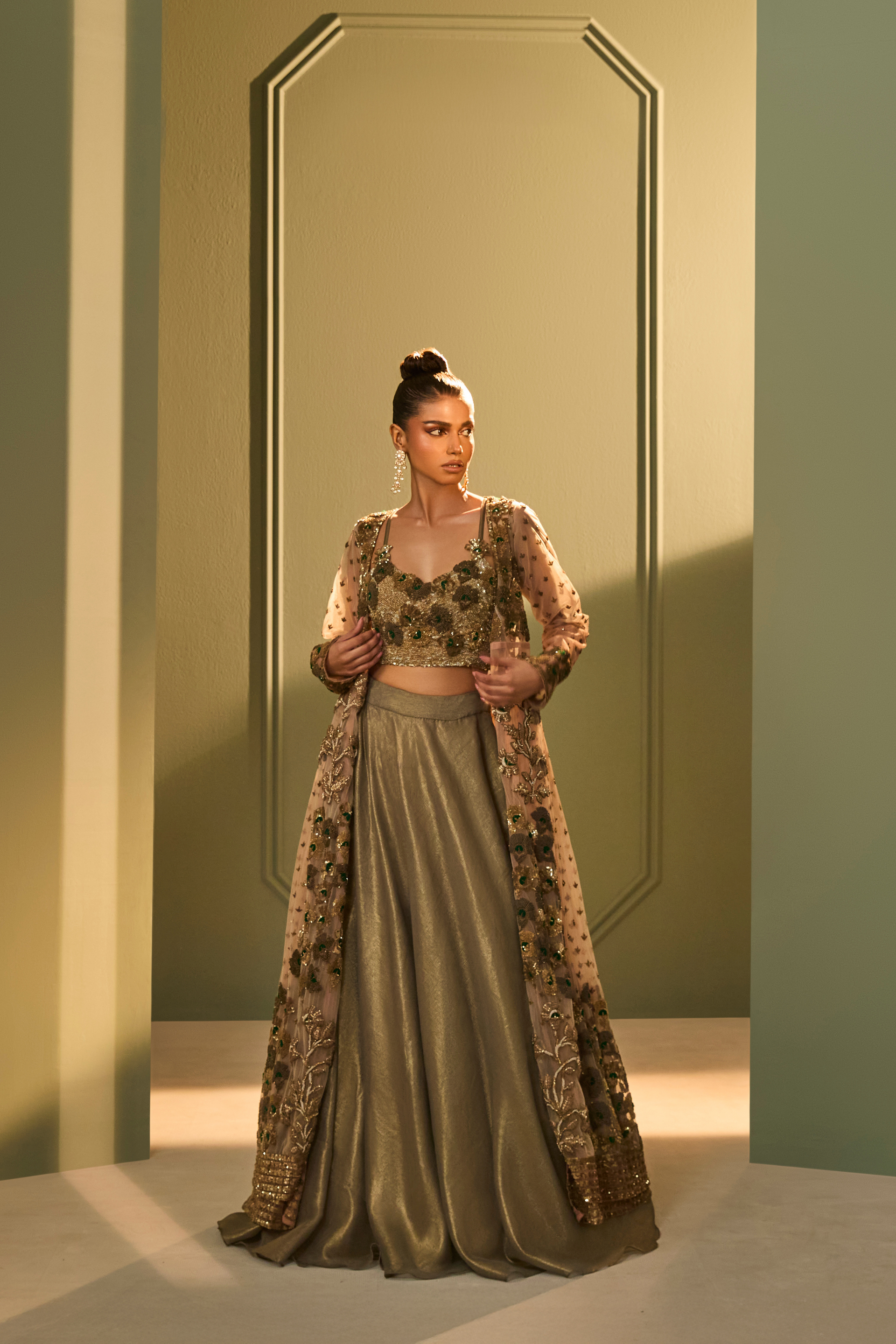 An embroidered nude jacket in sheer tulle with delicate floral motifs paired with a matching embroidered blouse and an antique gold metallic skirt. The interplay of shimmer and texture gives the set a refined richness, suited for evening occasions or festive gatherings.
