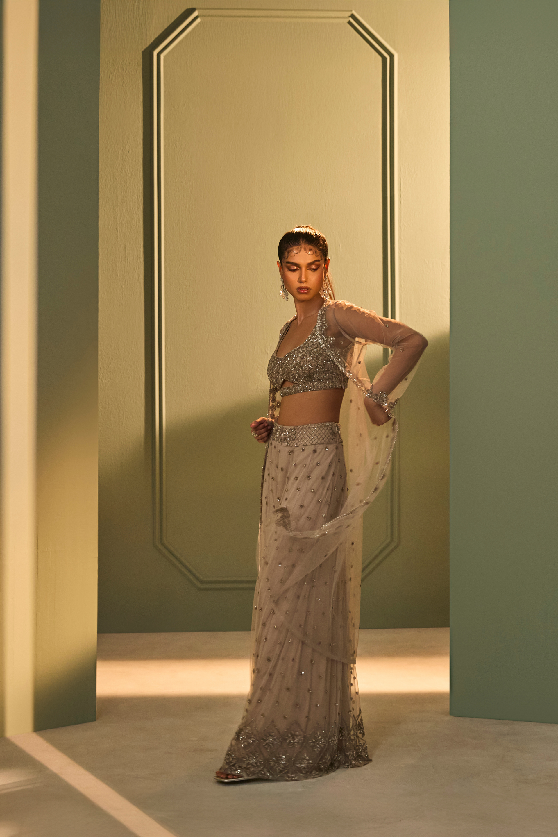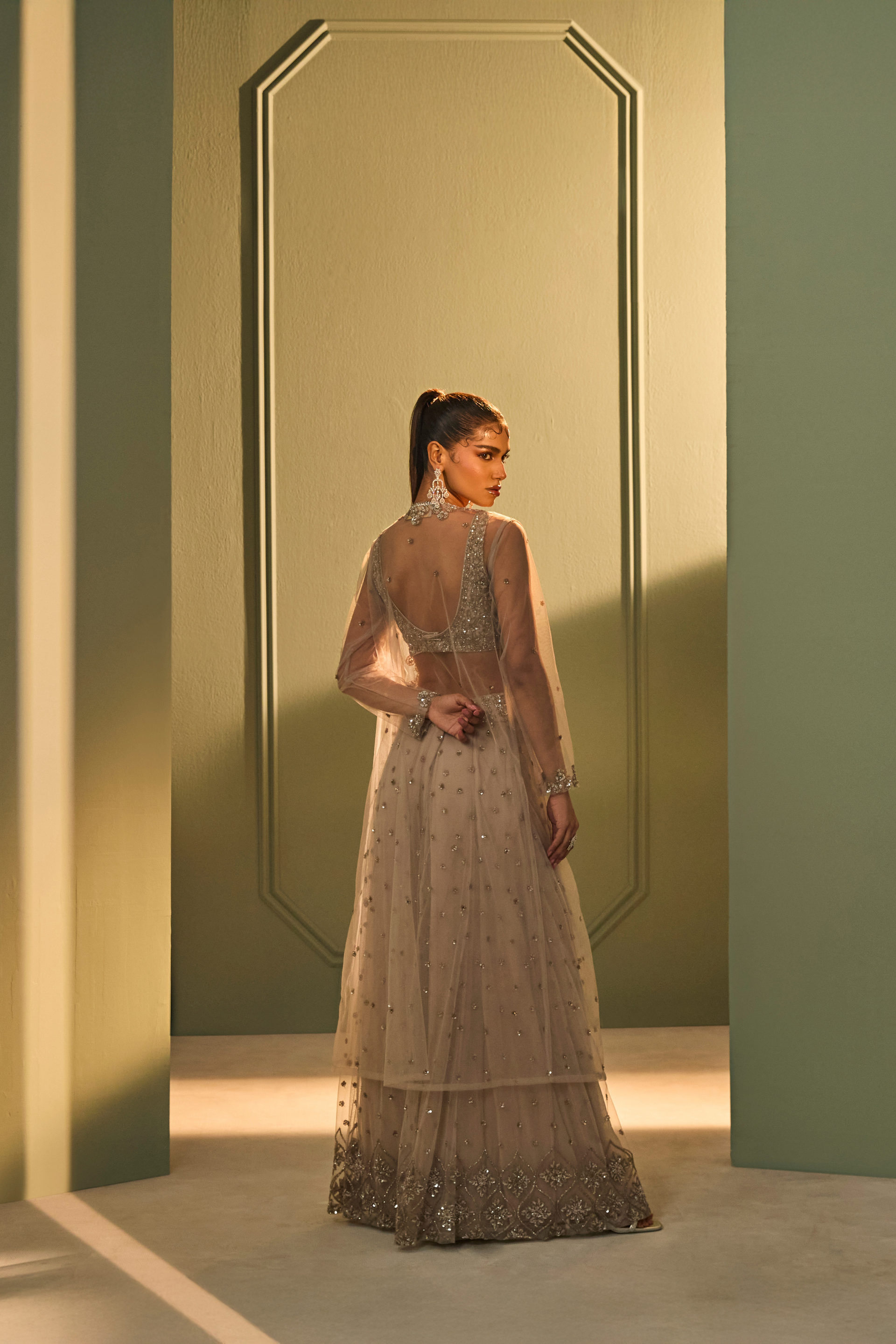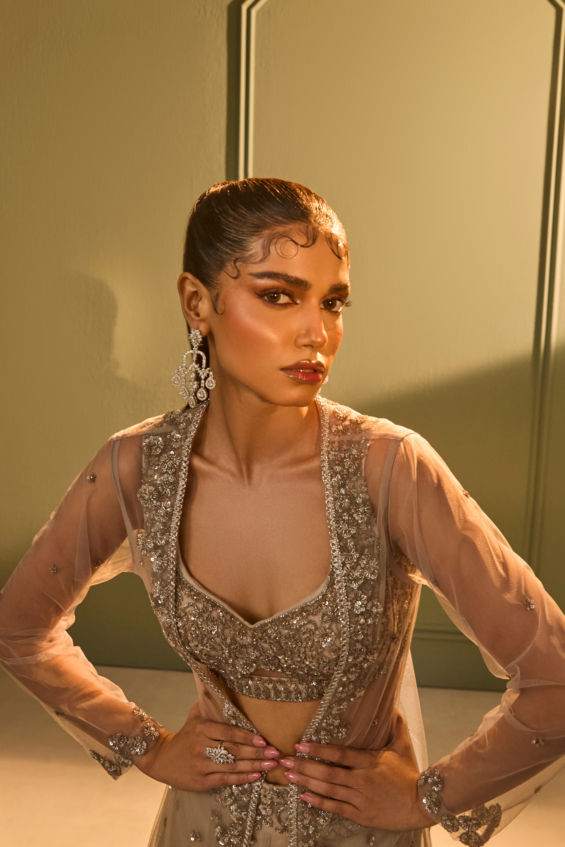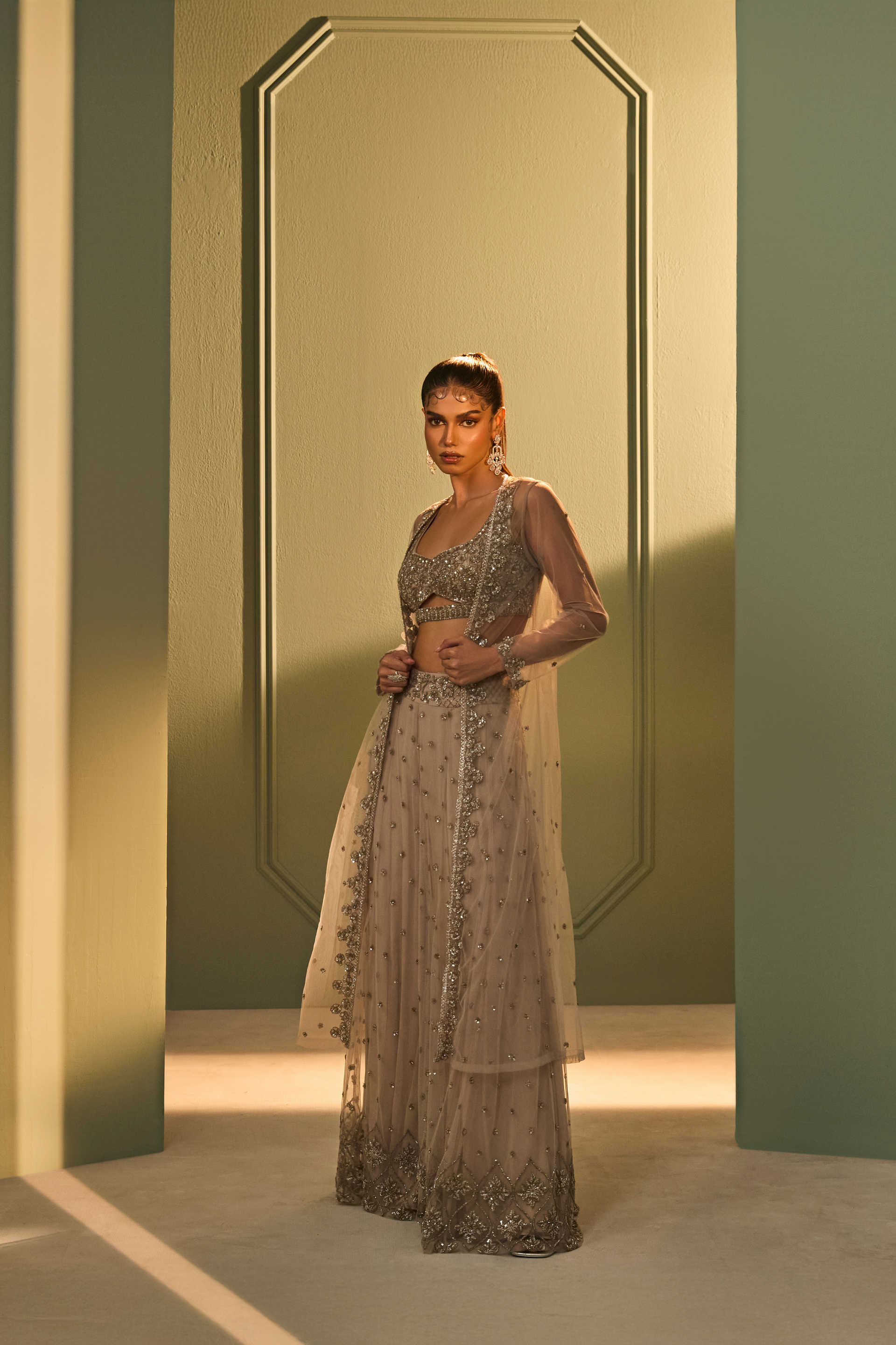 A greyish nude embroidered blouse with a front cut-out, paired with wide-leg sharara pants featuring matching silver embellishment. Layered with a full-length sheer jacket, delicately hand-embroidered and edged by hand. A fluid yet structured ensemble with quiet detailing and contemporary refinement.