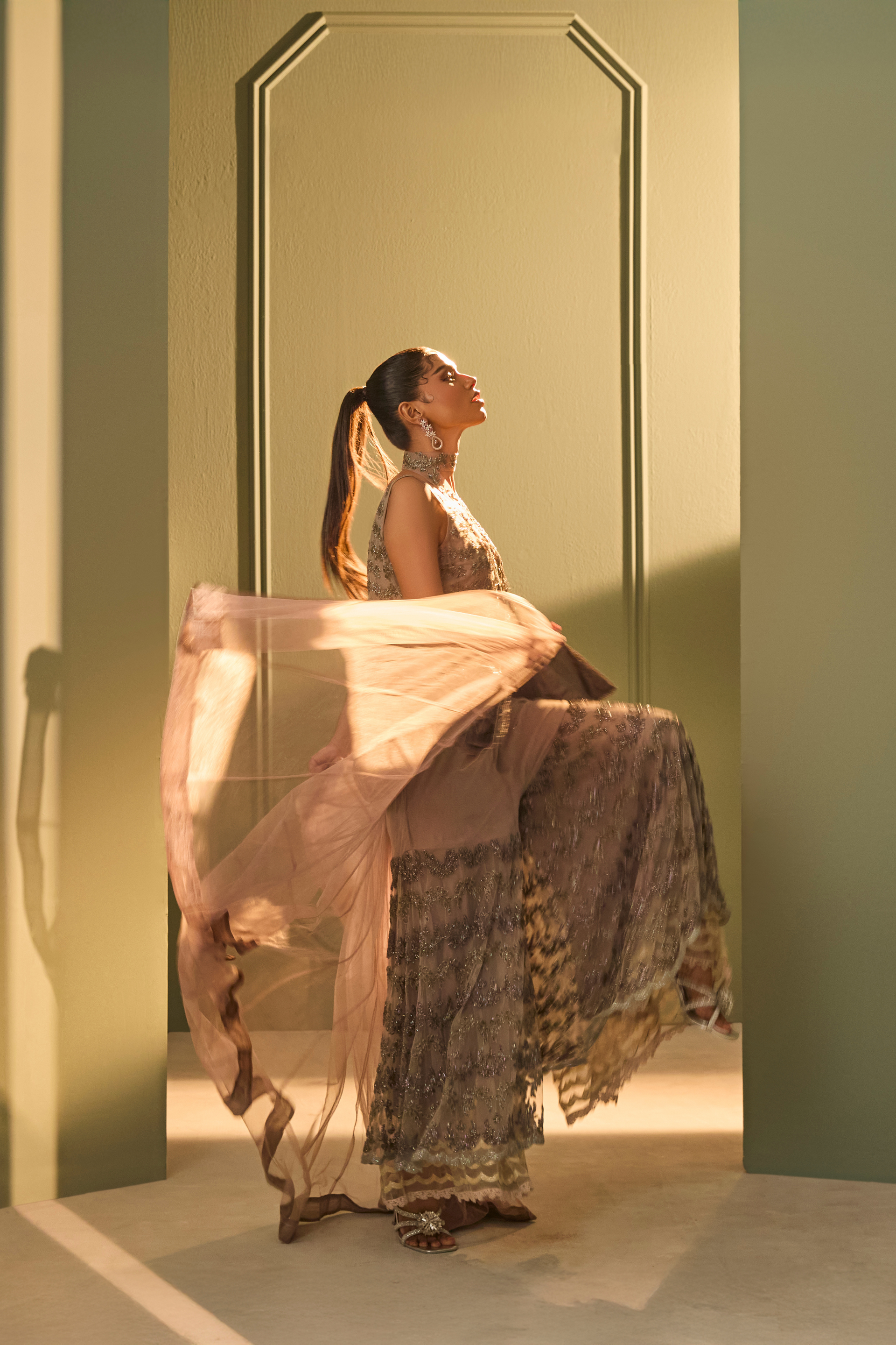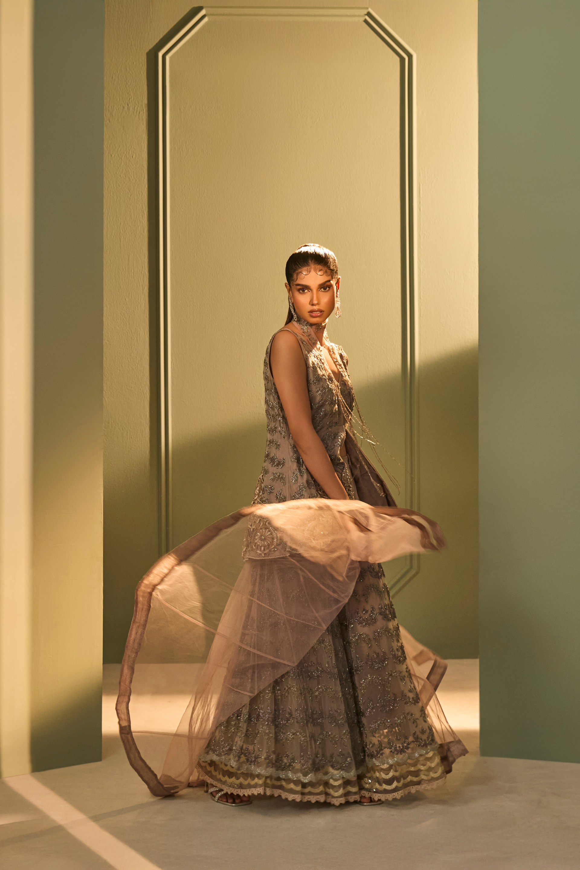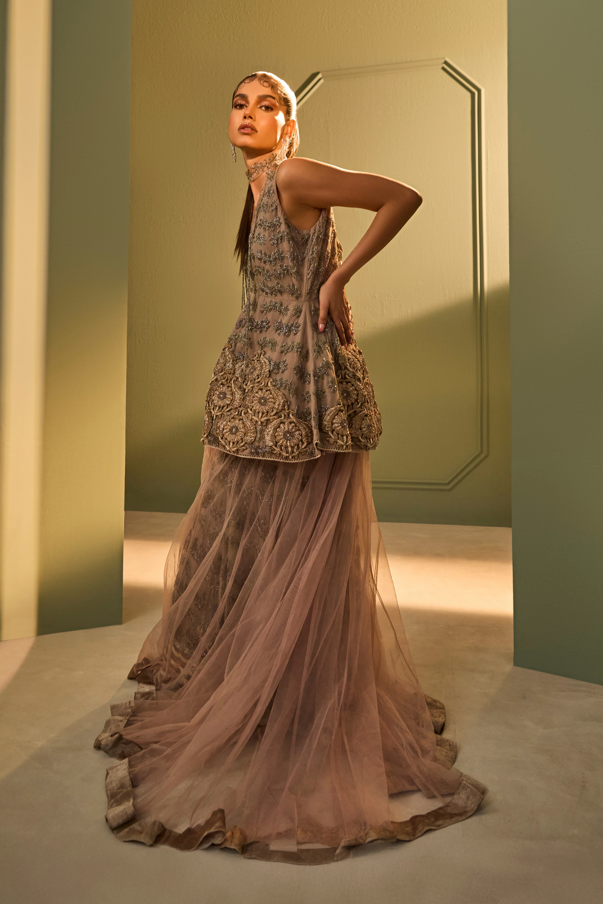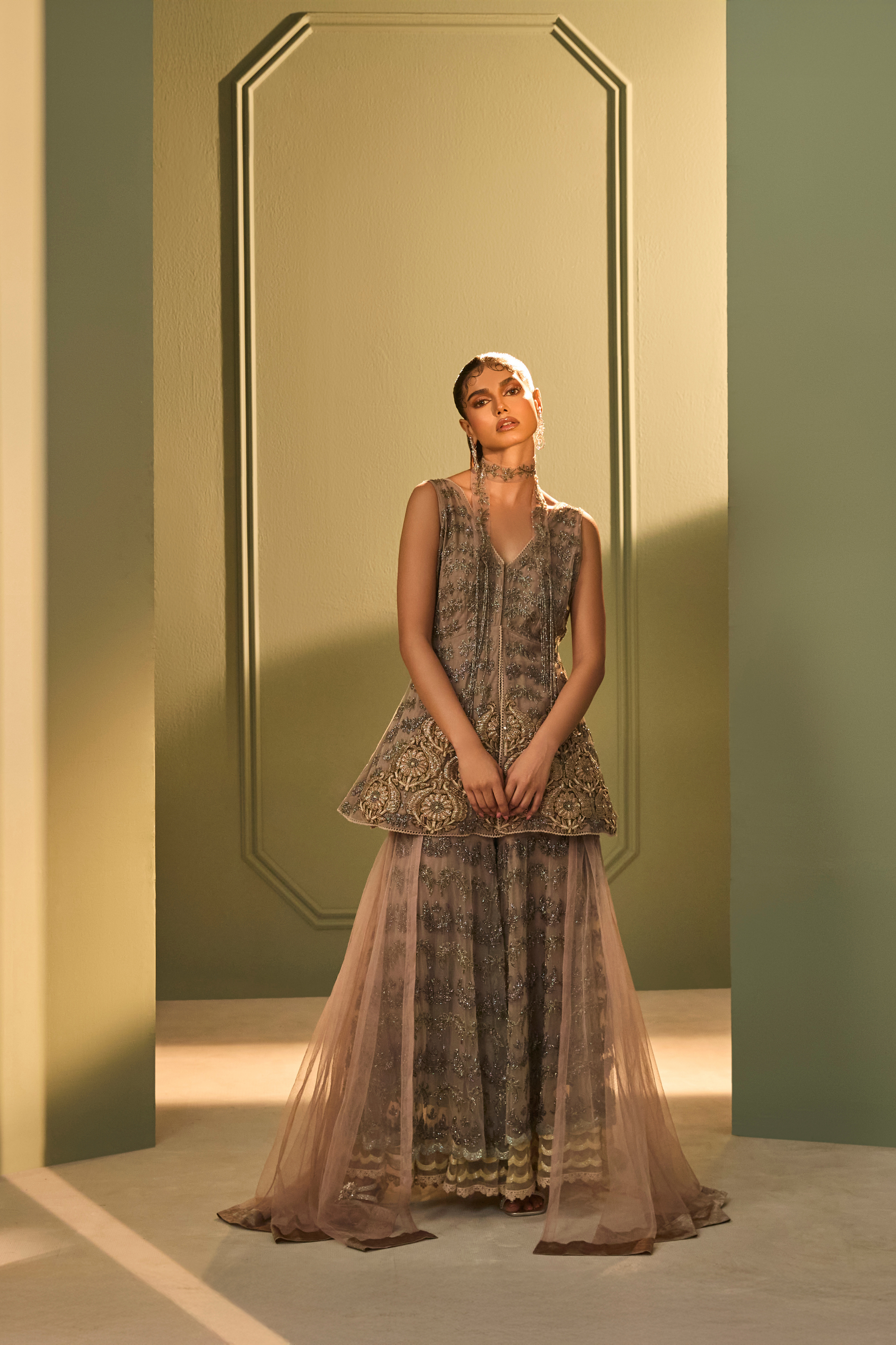 An intricately embroidered peplum and palazzo ensemble in layered tulle, finished with tonal zardosi and katdana work. The peplum flares gently, paired with an embellished sharara. A detachable sheer overlay and hand-embellished neck band lend subtle drama and depth. Designed for occasions that call for a bold statement.