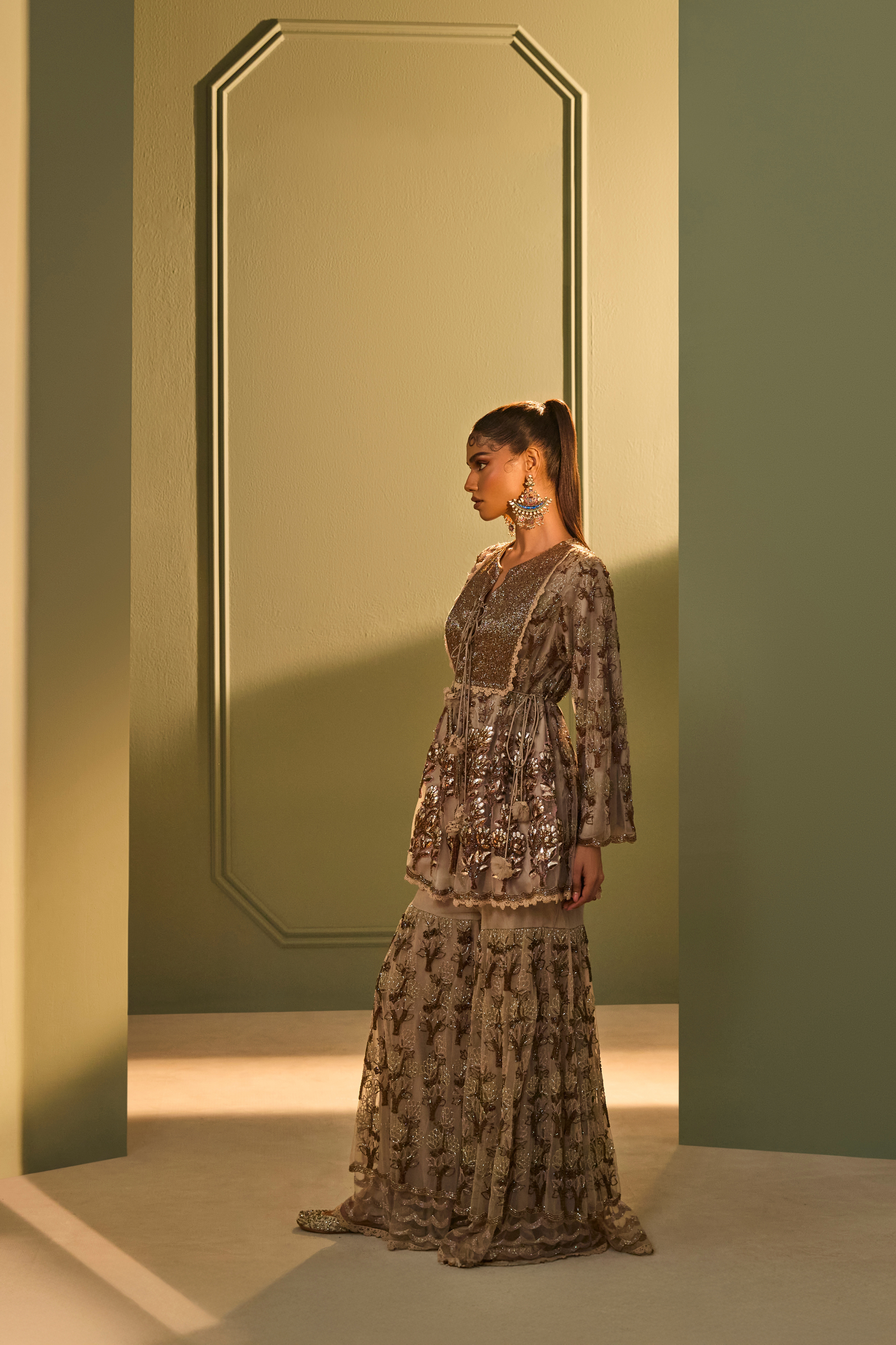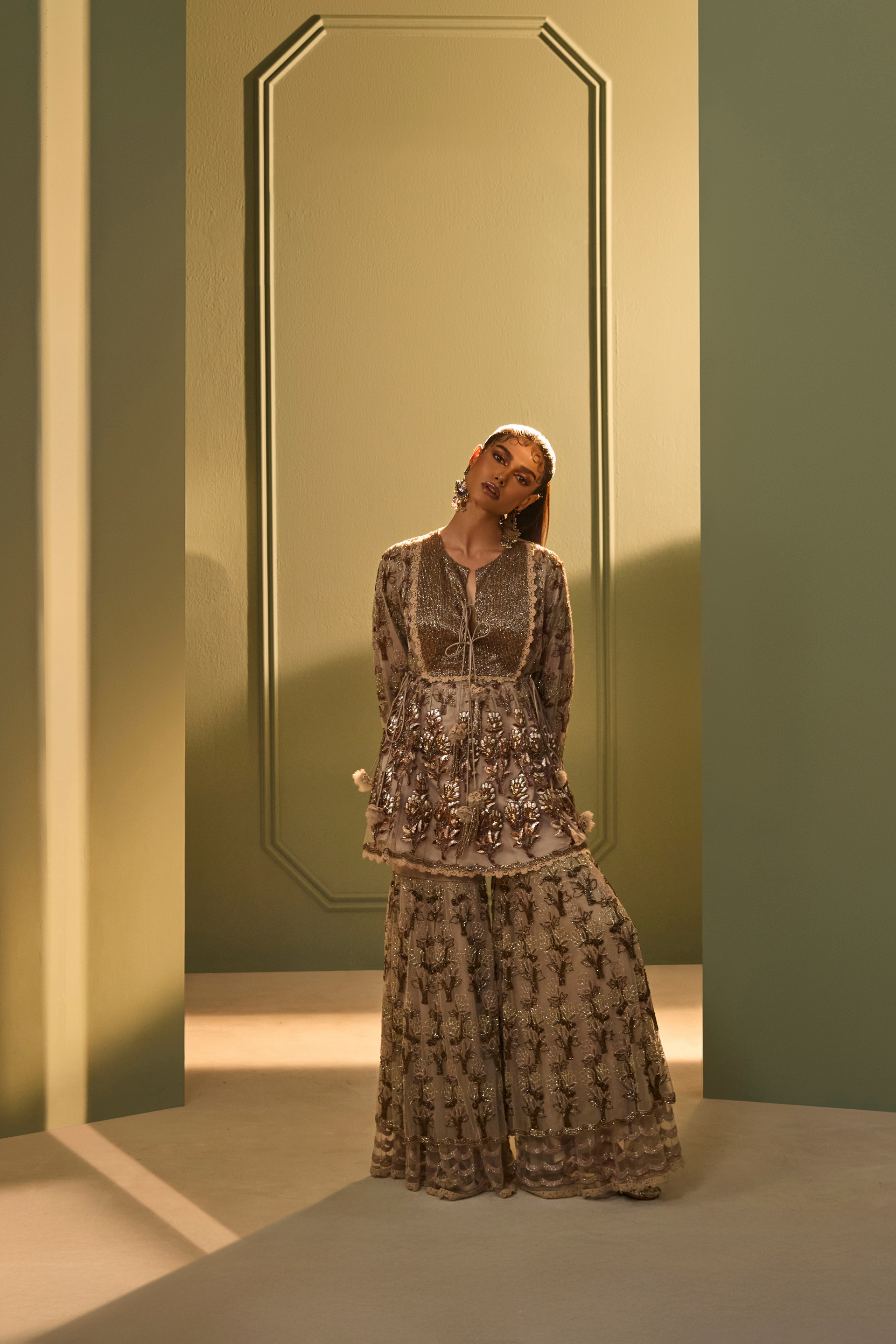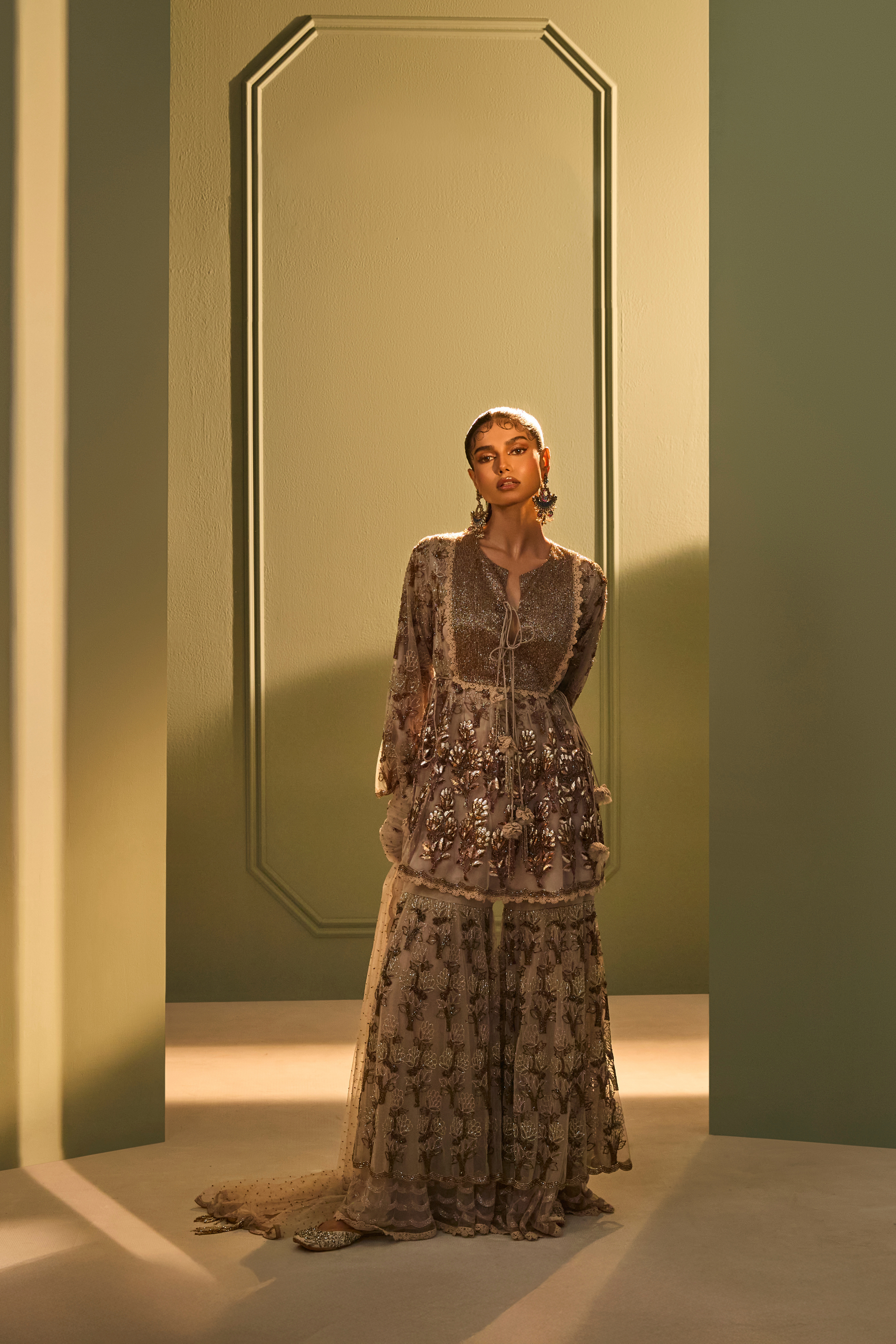 A peplum blouse and palazzo set crafted in sheer tulle, hand-embroidered with tonal zardosi and katdana. The blouse follows a softly cinched silhouette with fluid layers at the waist, while wide palazzo pants bring ease and volume. Embroidered motifs carry through the length, subtly echoing the blouse’s finish. A textural composition that’s both ornate and effortless.