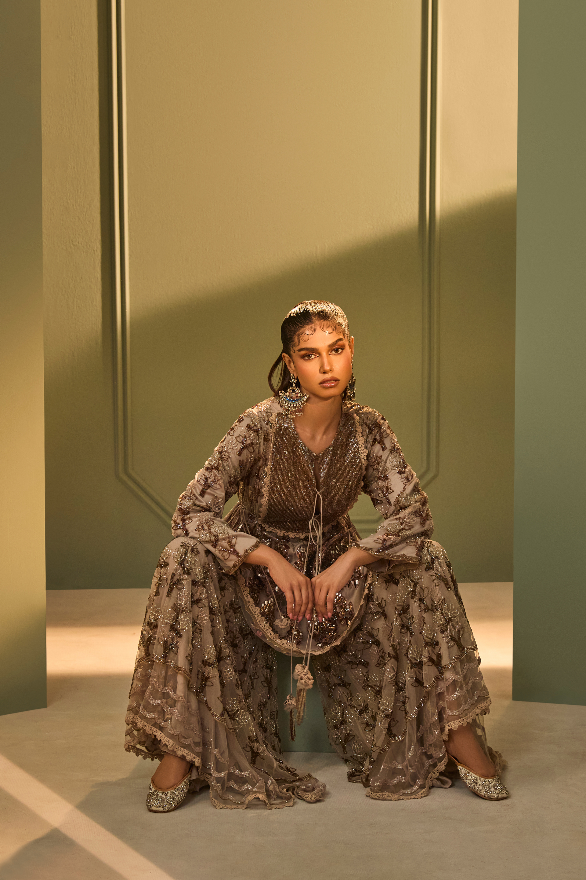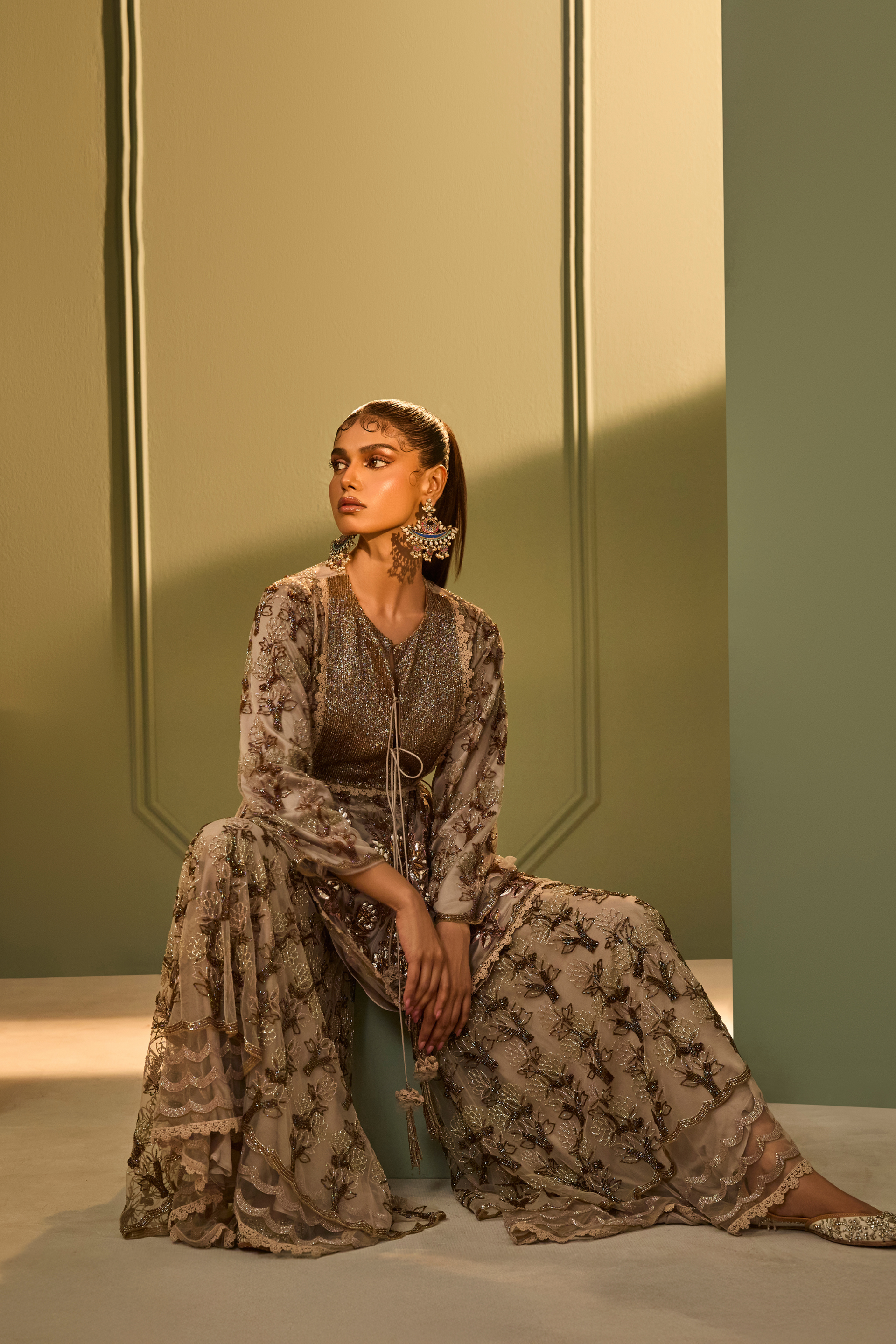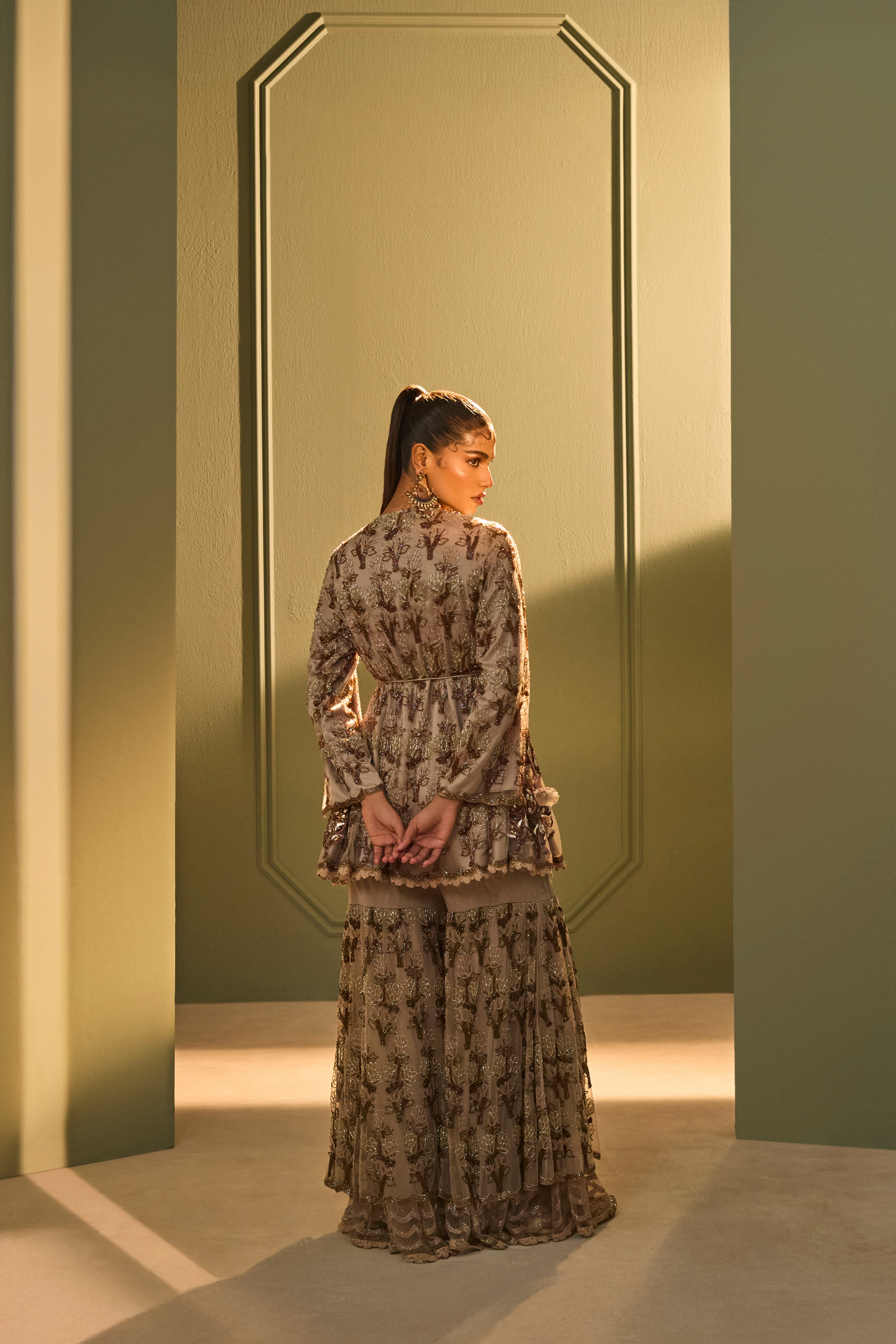 A peplum blouse and palazzo set crafted in sheer tulle, hand-embroidered with tonal zardosi and katdana. The blouse follows a softly cinched silhouette with fluid layers at the waist, while wide palazzo pants bring ease and volume. Embroidered motifs carry through the length, subtly echoing the blouse’s finish. A textural composition that’s both ornate and effortless.